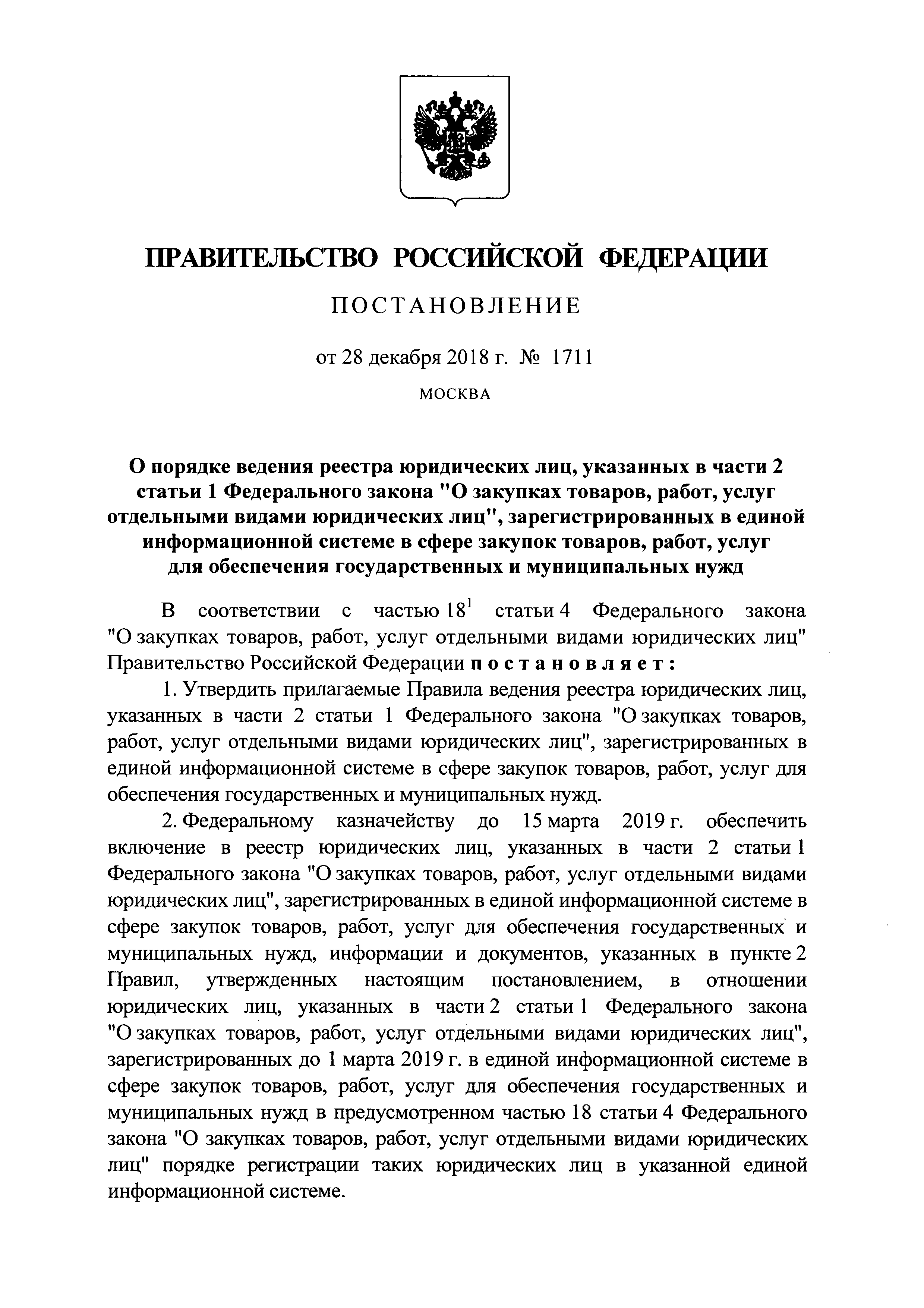 Правила ведения реестра юридических лиц, указанных в части 2 статьи 1 Федерального закона "О закупках товаров, работ, услуг отдельными видами юридических лиц", зарегистрированных в единой информационной системе в сфере закупок товаров, работ, услуг для обеспечения государственных и муниципальных нужд| Статус: | действует | | Название рус.: | Правила ведения реестра юридических лиц, указанных в части 2 статьи 1 Федерального закона "О закупках товаров, работ, услуг отдельными видами юридических лиц", зарегистрированных в единой информационной системе в сфере закупок товаров, работ, услуг для обеспечения государственных и муниципальных нужд | | Дата добавления в базу: | 01.02.2020 | | Дата актуализации: | 01.01.2021 | | Дата введения: | 01.03.2019 | | Область применения: | Правила устанавливают порядок ведения реестра юридических лиц, указанных в части 2 статьи 1 Федерального закона "О закупках товаров, работ, услуг отдельными видами юридических лиц", зарегистрированных в единой информационной системе в сфере закупок товаров, работ, услуг для обеспечения государственных и муниципальных нужд, в том числе перечень и сроки размещения информации и документов, которые включаются в реестр заказчиков | | Утверждён: | 28.12.2018 Правительство Российской Федерации (1711)