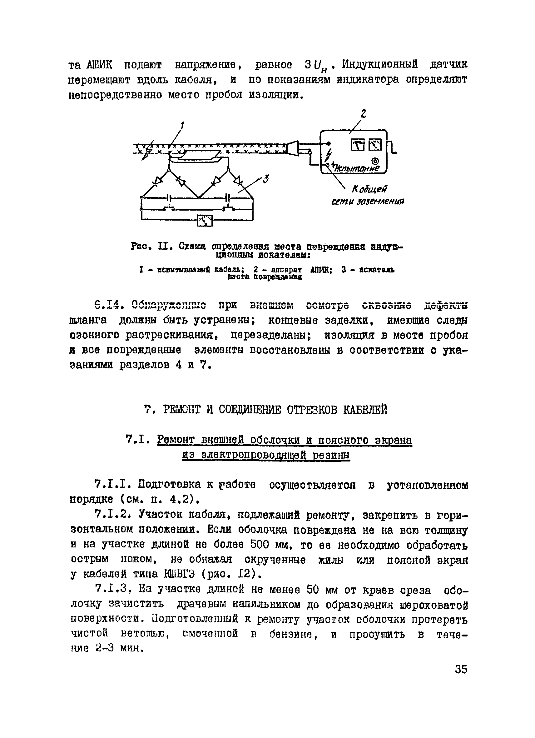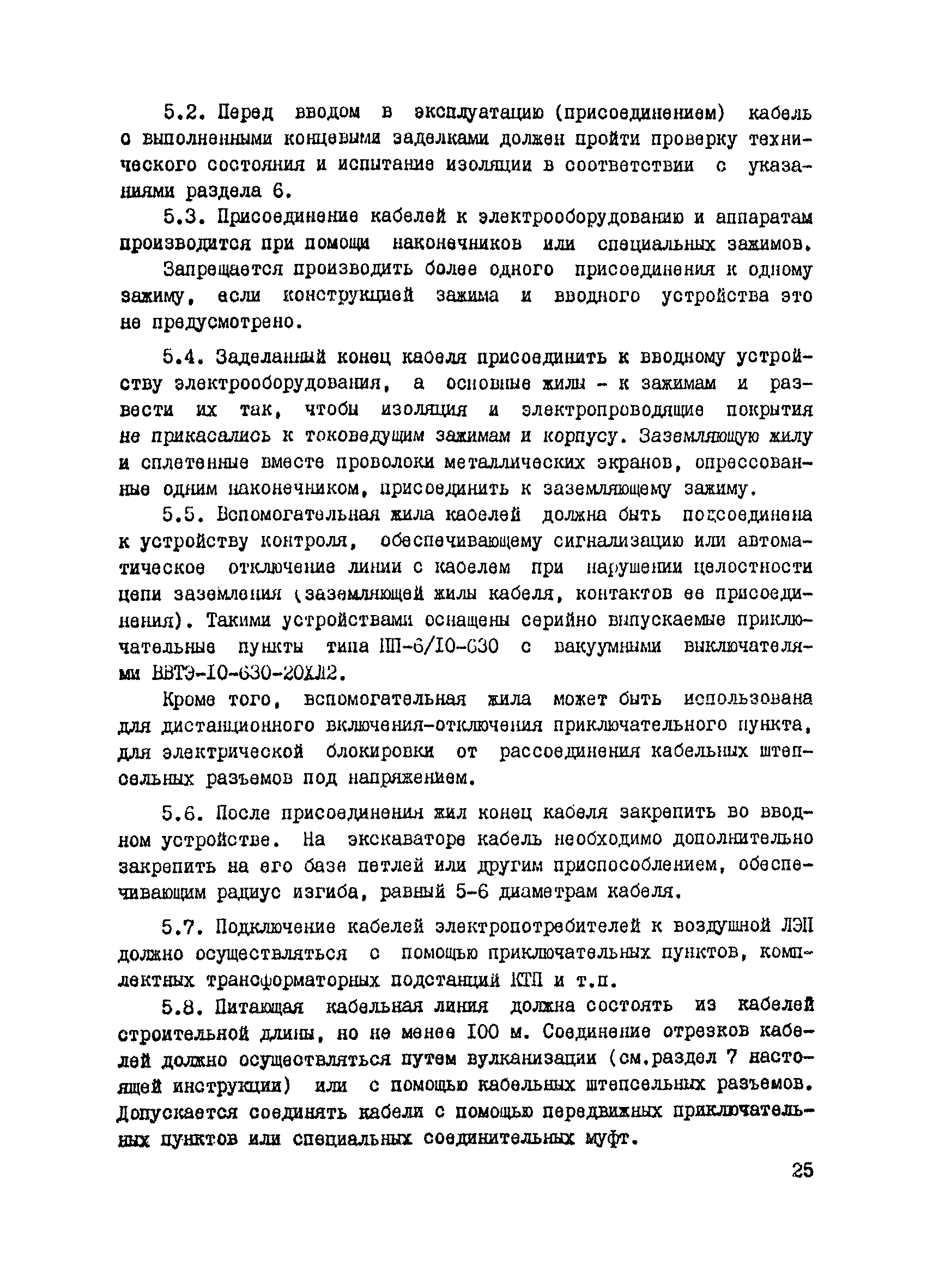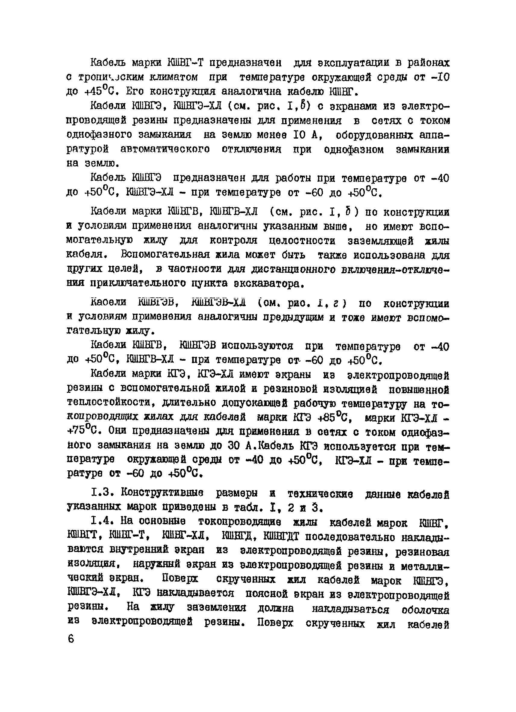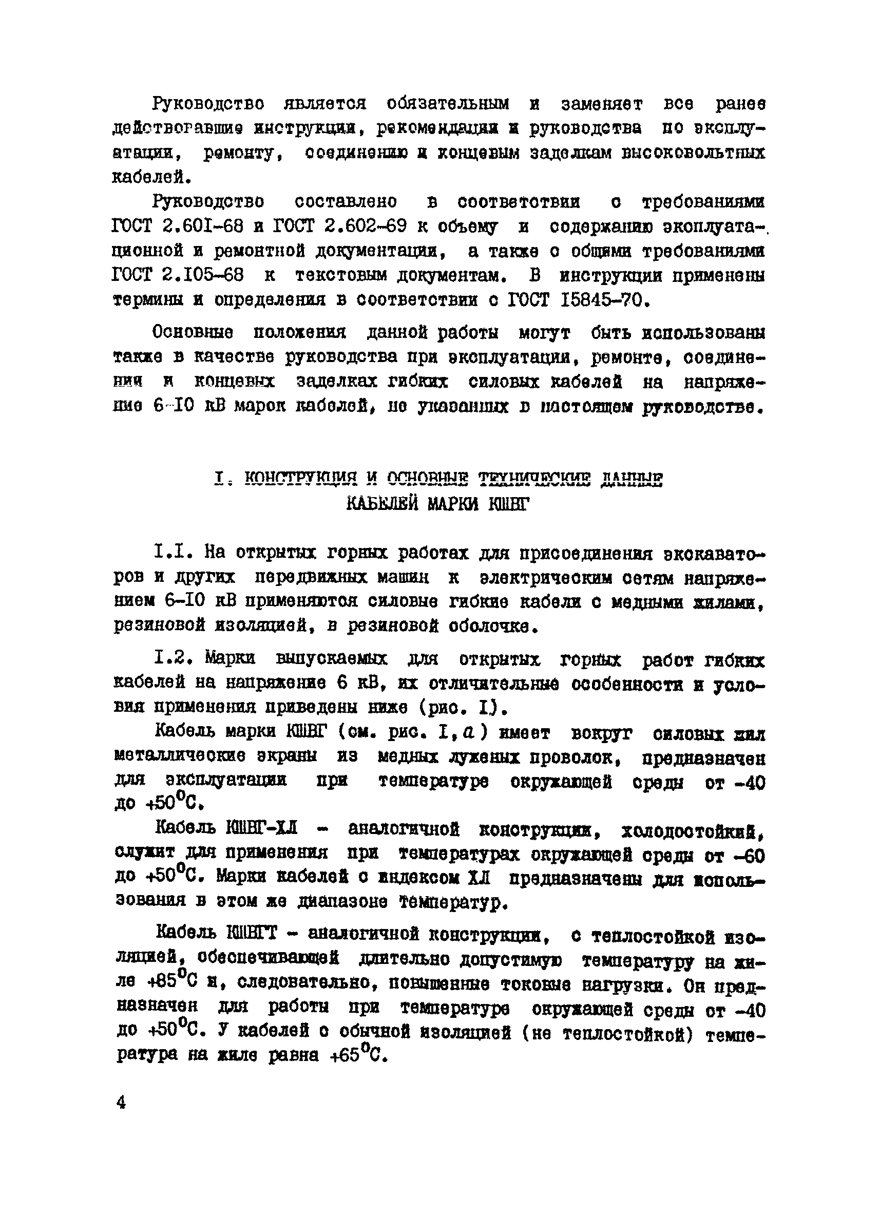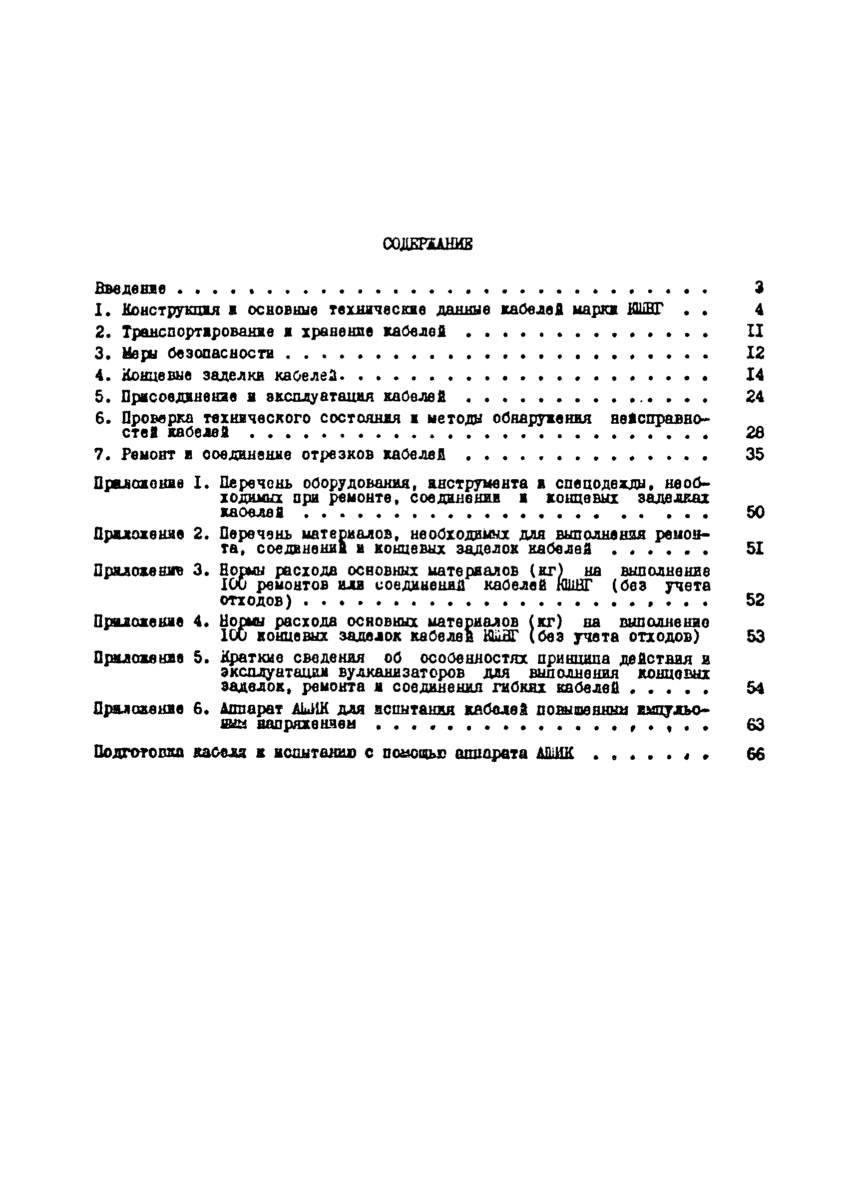 | Оглавление: | 1. Конструкция и основные технические данные кабелей марки КШНГ 2. Транспортирование и хранение кабелей 3. Меры безопасности 4. Концевые заделки кабелей 4.1. Общие требования и указания 4.2. Подготовка к работе 4.3. Порядок разделки кабеля 4.4. Порядок выполнения концевой заделки с помощью починочной резины 4.5. Порядок выполнения концевой заделки с помощью трубок из кремнийорганической резины 4.6. Порядок выполнения концевой заделки с помощью электроизоляционных гильз 4.7. Установка кабельных наконечников 5. Присоединение и эксплуатация кабелей 6. Проверка технического состояния и методы обнаружения неисправностей кабелей 7. Ремонт и соединение отрезков кабелей 7.1. Ремонт внешней оболочки и поясного экрана из электропроводящей резины 7.2. Ремонт металлического экрана основных жил кабелей типа КШНГ (на длине не более 260 мм) 7.3. Ремонт изоляции жилы 7.4. Соединение токопроводящих жил в помощью медных гильз 7.5. Соединение токопроводящих жил кабелей, наматываемых на кабельный барабан 7.6. Восстановление изоляции жил, экранов и оболочки при соединении отрезков кабеля Приложение 1 Перечень оборудования, инструмента и спецодежды, необходимых при ремонте, соединении и концевых заделках кабелей Приложение 2 Перечень материалов, необходимых для выполнения ремонта, соединений и концевых заделов кабелей Приложение 3 Нормы расхода основных материалов на выполнение 100 ремонтов для соединений кабелей КШНГ Приложение 4 Нормы расхода основных материалов на выполнение 100 концевых заделок кабелей КШНГ Приложение 5 Краткие сведения об особенностях принципа действия и эксплуатации вулканизаторов для выполнения концевых заделок ремонта и соединения гибких кабелей Приложение 6 Аппарат АШИК для испытания кабелей повышенным импульсным напряжением Подготовка кабеля к испытанию с помощью аппарата АШИК |