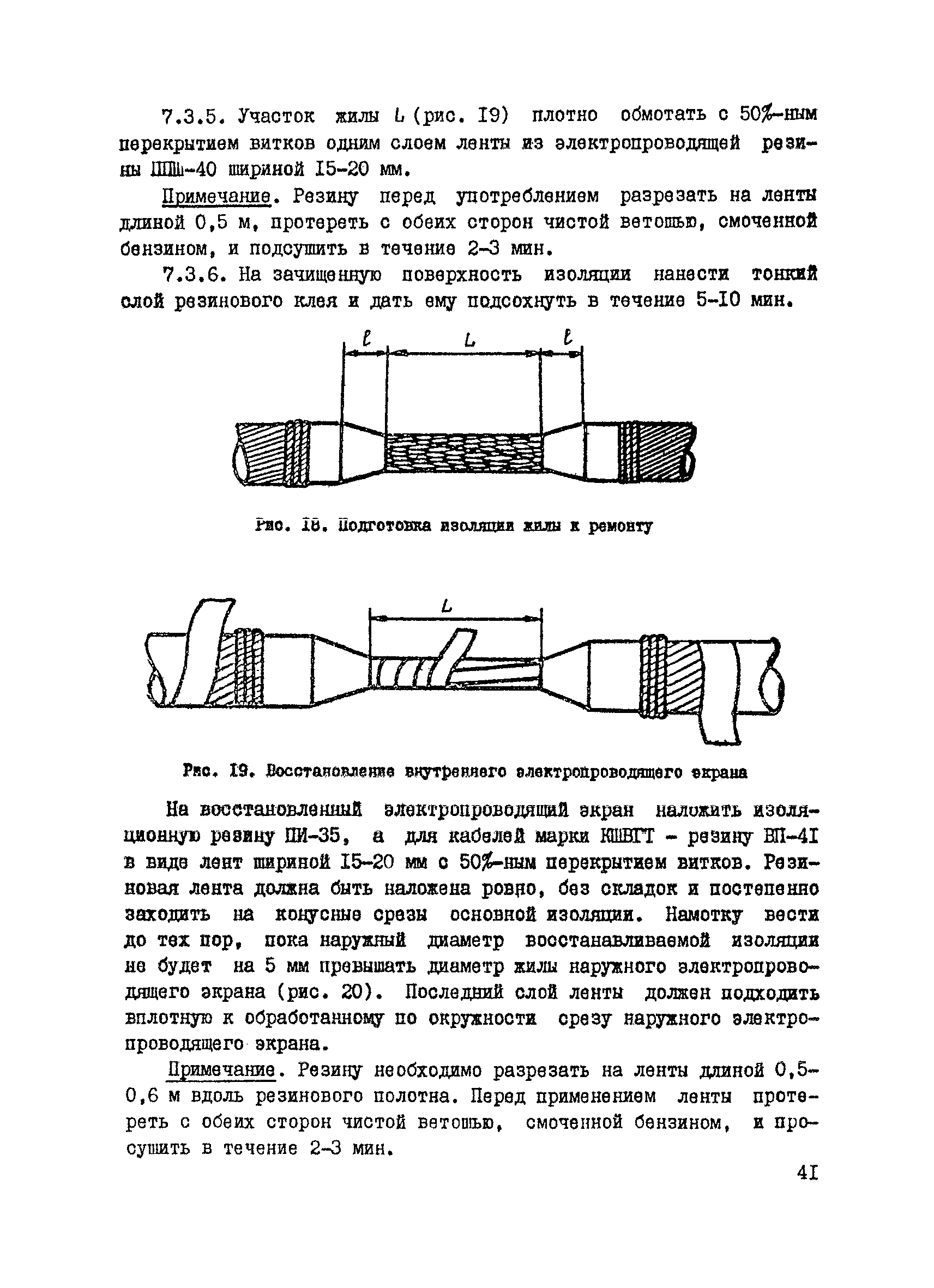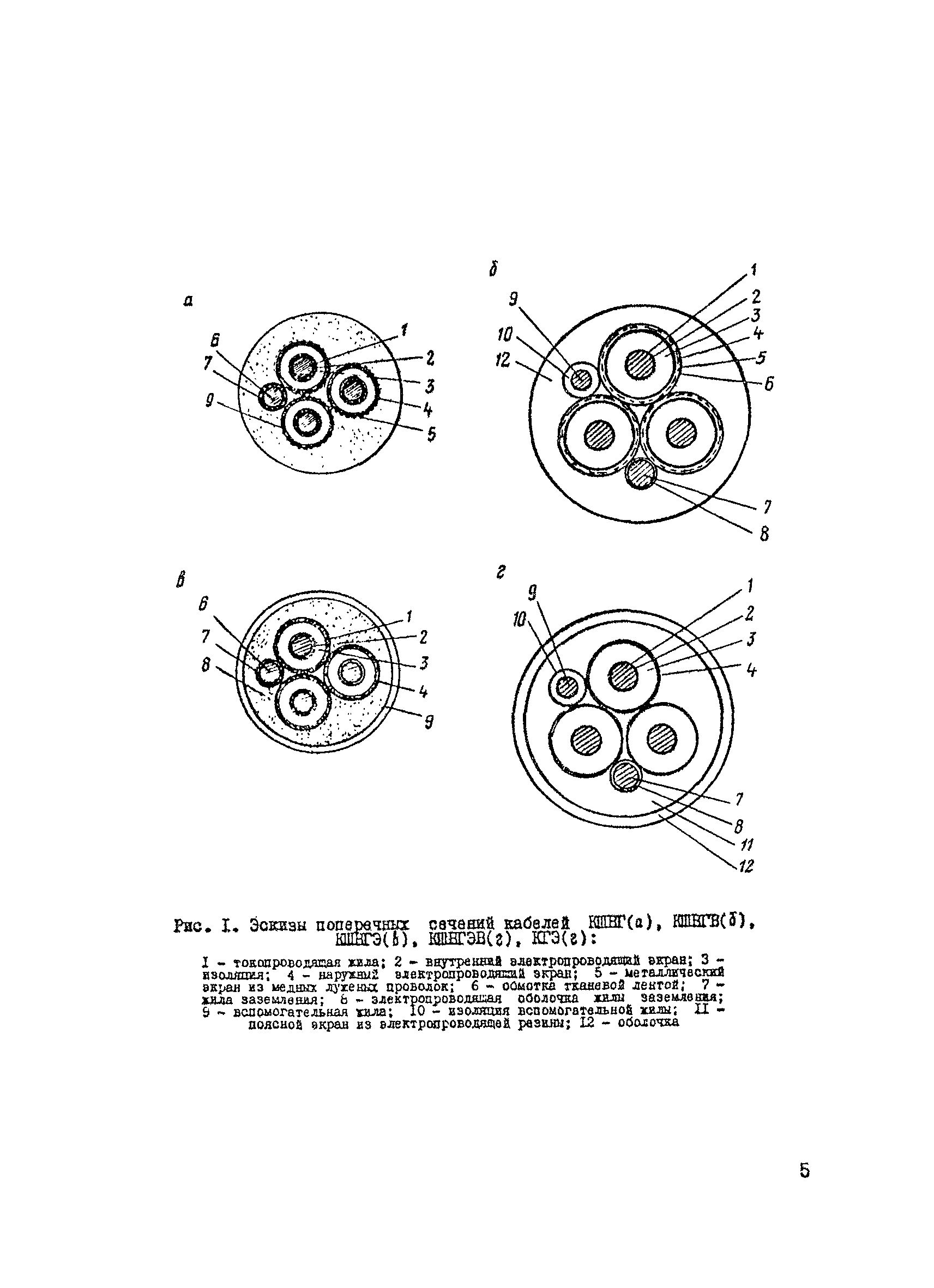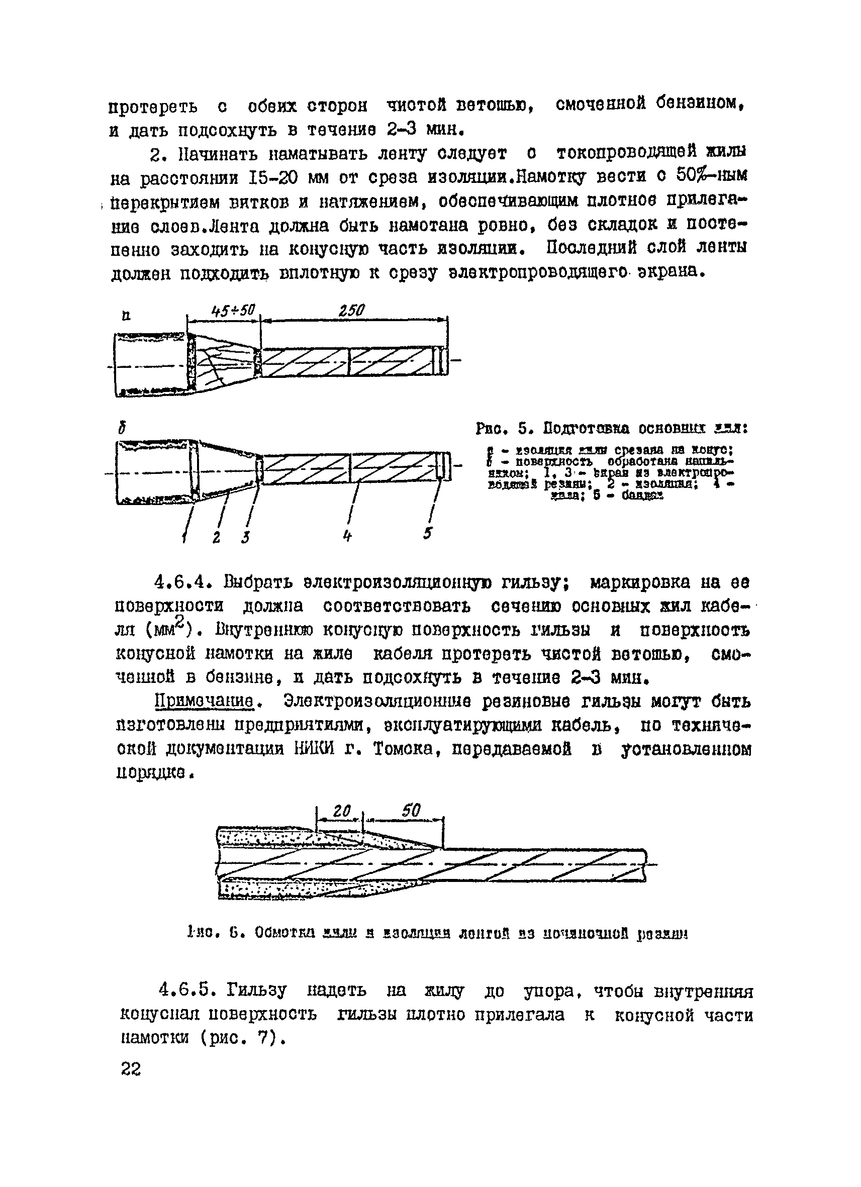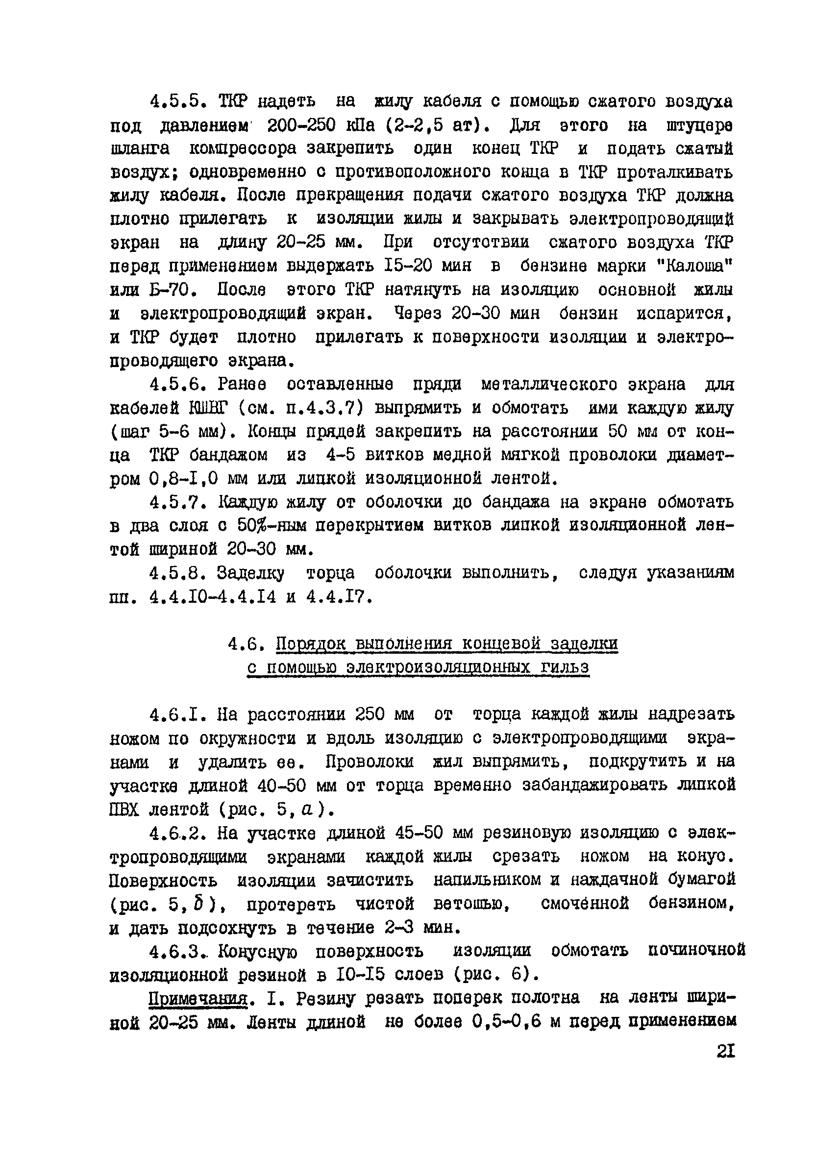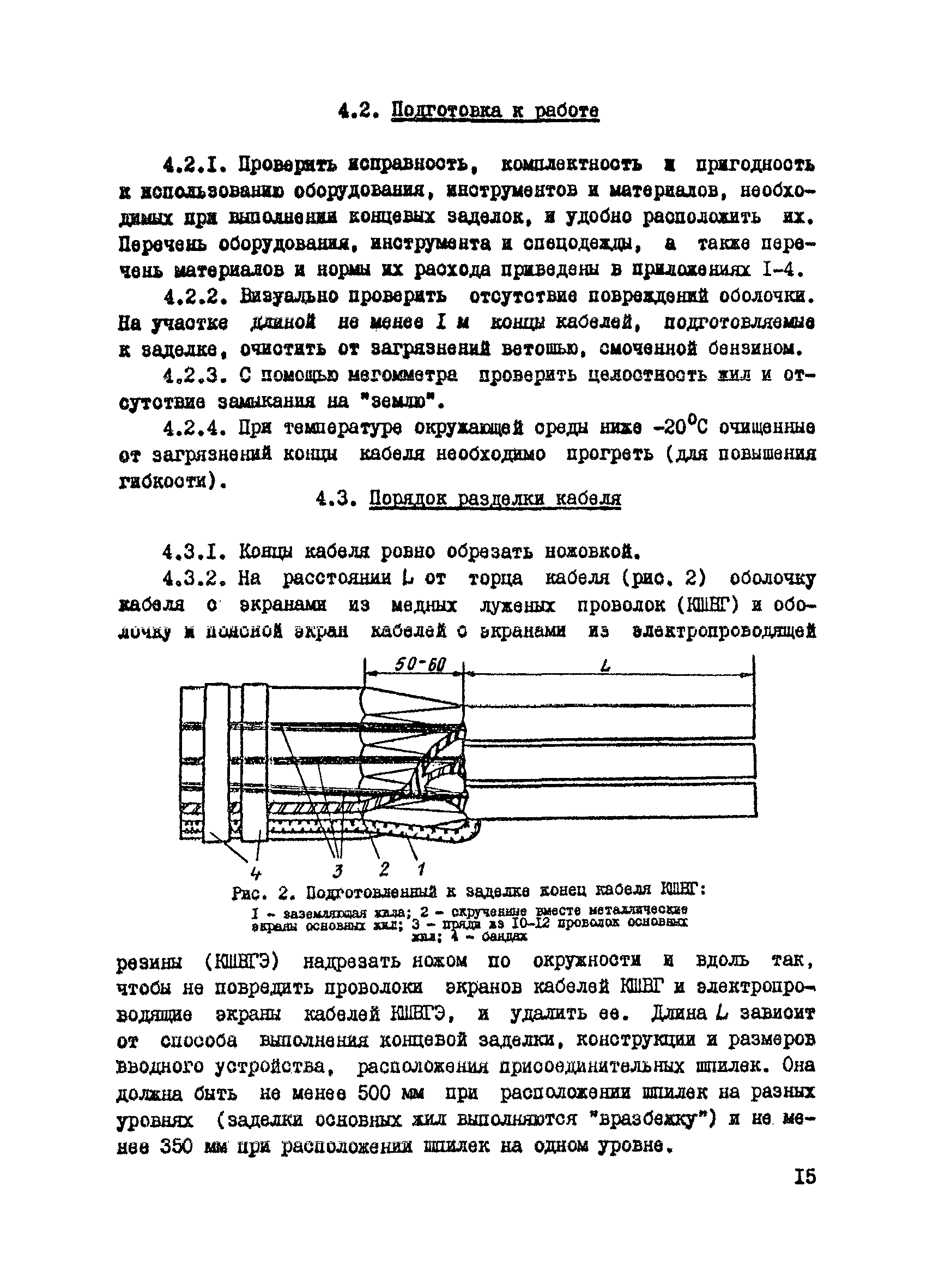 | Оглавление: | 1. Конструкция и основные технические данные кабелей марки КШНГ 2. Транспортирование и хранение кабелей 3. Меры безопасности 4. Концевые заделки кабелей 4.1. Общие требования и указания 4.2. Подготовка к работе 4.3. Порядок разделки кабеля 4.4. Порядок выполнения концевой заделки с помощью починочной резины 4.5. Порядок выполнения концевой заделки с помощью трубок из кремнийорганической резины 4.6. Порядок выполнения концевой заделки с помощью электроизоляционных гильз 4.7. Установка кабельных наконечников 5. Присоединение и эксплуатация кабелей 6. Проверка технического состояния и методы обнаружения неисправностей кабелей 7. Ремонт и соединение отрезков кабелей 7.1. Ремонт внешней оболочки и поясного экрана из электропроводящей резины 7.2. Ремонт металлического экрана основных жил кабелей типа КШНГ (на длине не более 260 мм) 7.3. Ремонт изоляции жилы 7.4. Соединение токопроводящих жил в помощью медных гильз 7.5. Соединение токопроводящих жил кабелей, наматываемых на кабельный барабан 7.6. Восстановление изоляции жил, экранов и оболочки при соединении отрезков кабеля Приложение 1 Перечень оборудования, инструмента и спецодежды, необходимых при ремонте, соединении и концевых заделках кабелей Приложение 2 Перечень материалов, необходимых для выполнения ремонта, соединений и концевых заделов кабелей Приложение 3 Нормы расхода основных материалов на выполнение 100 ремонтов для соединений кабелей КШНГ Приложение 4 Нормы расхода основных материалов на выполнение 100 концевых заделок кабелей КШНГ Приложение 5 Краткие сведения об особенностях принципа действия и эксплуатации вулканизаторов для выполнения концевых заделок ремонта и соединения гибких кабелей Приложение 6 Аппарат АШИК для испытания кабелей повышенным импульсным напряжением Подготовка кабеля к испытанию с помощью аппарата АШИК |