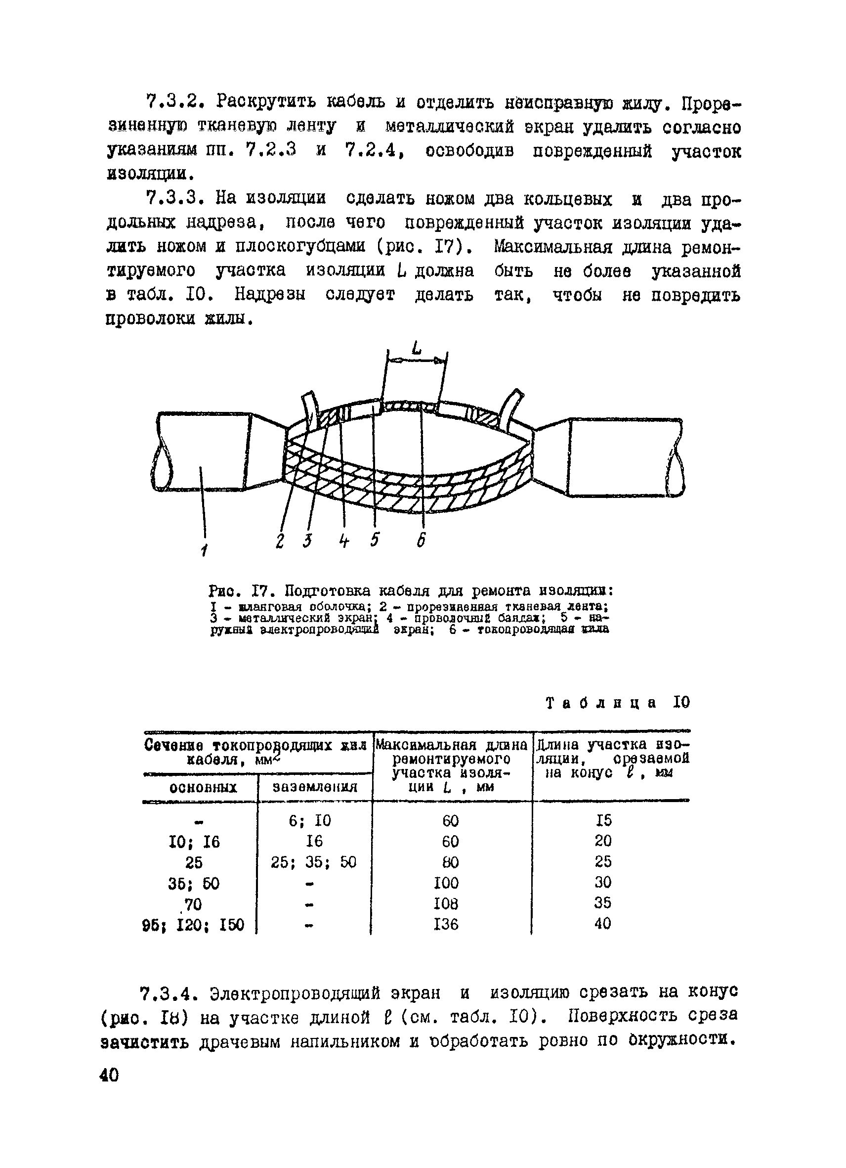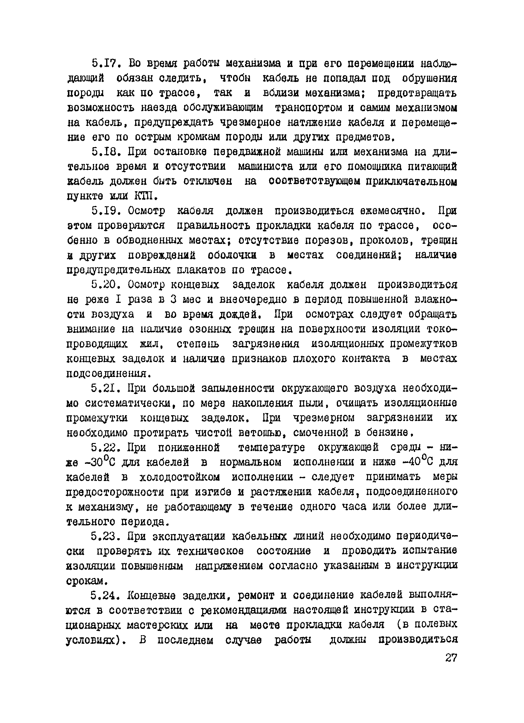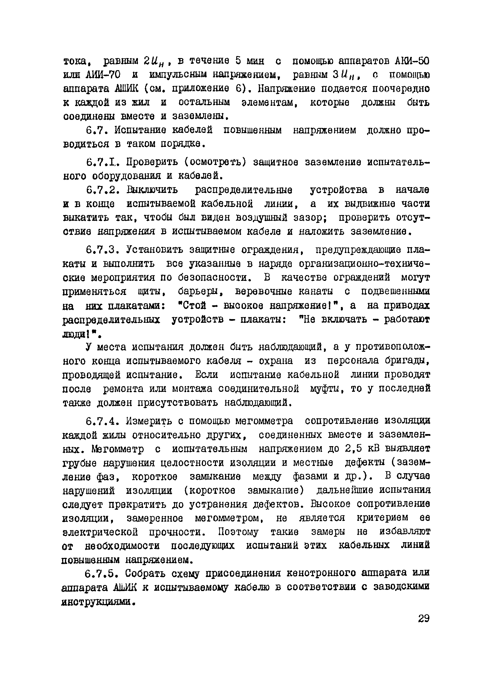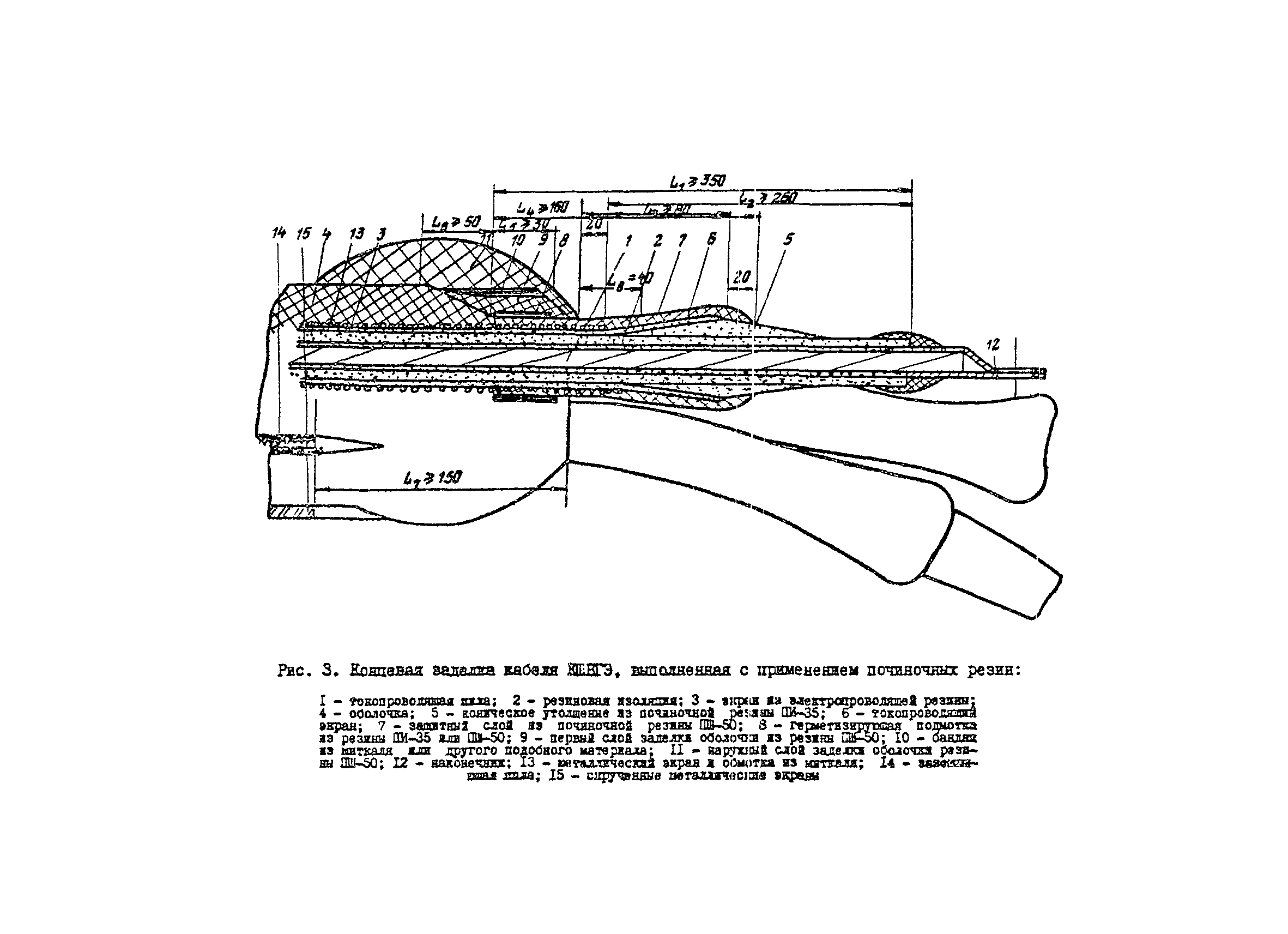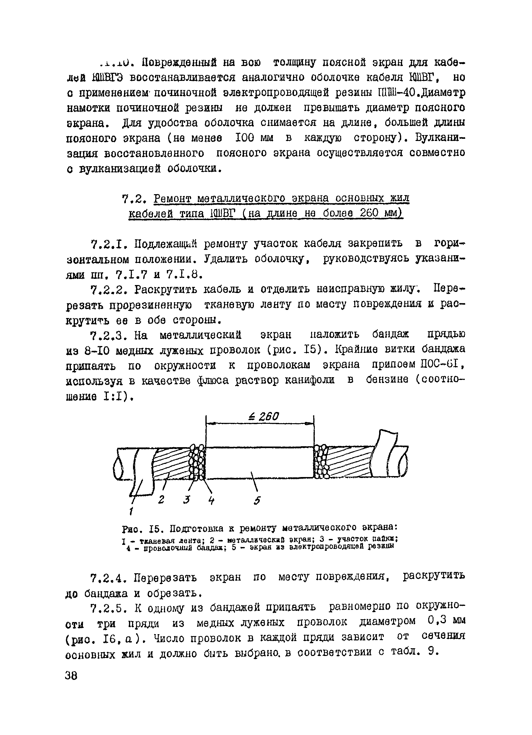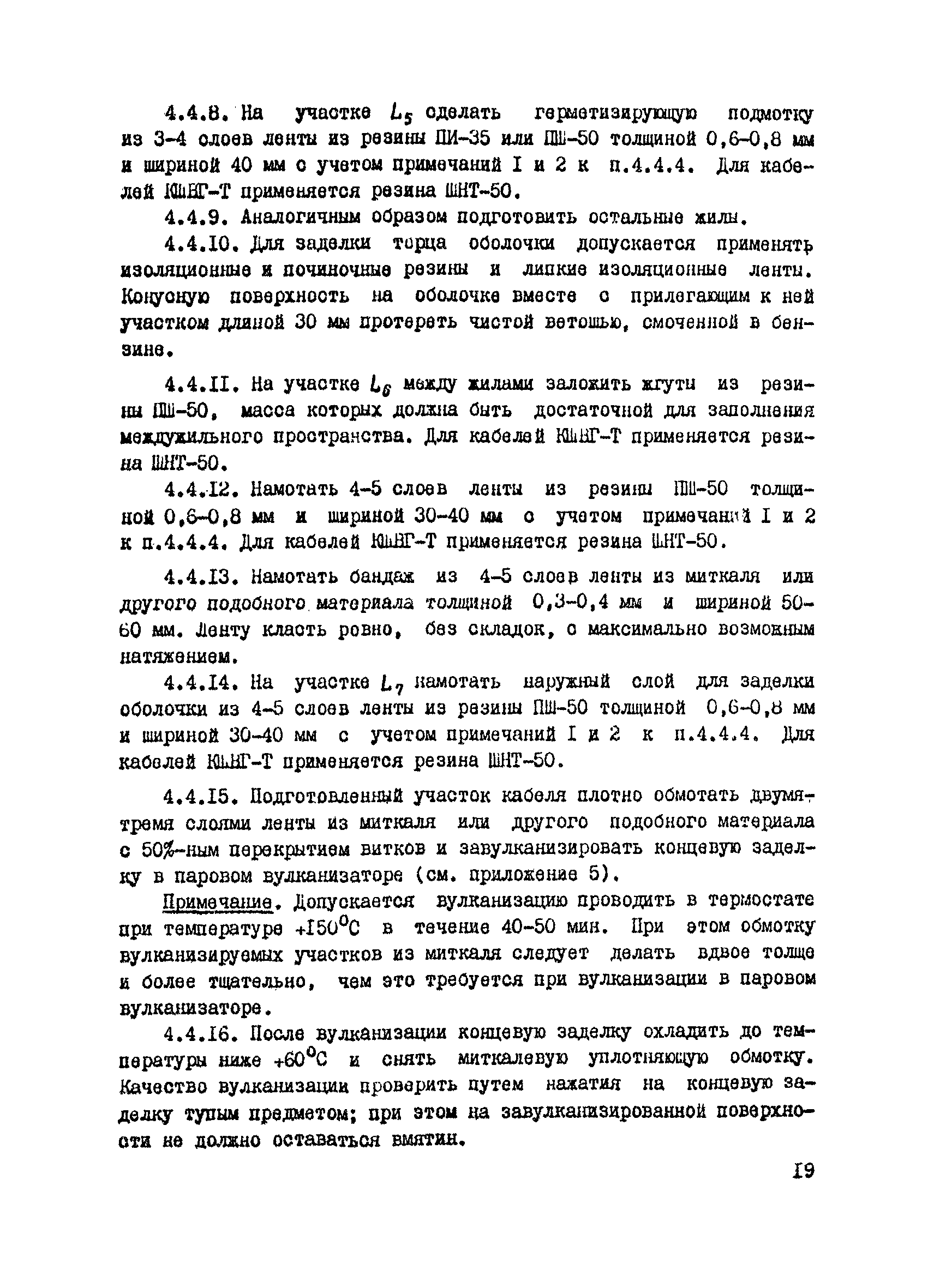 | Оглавление: | 1. Конструкция и основные технические данные кабелей марки КШНГ 2. Транспортирование и хранение кабелей 3. Меры безопасности 4. Концевые заделки кабелей 4.1. Общие требования и указания 4.2. Подготовка к работе 4.3. Порядок разделки кабеля 4.4. Порядок выполнения концевой заделки с помощью починочной резины 4.5. Порядок выполнения концевой заделки с помощью трубок из кремнийорганической резины 4.6. Порядок выполнения концевой заделки с помощью электроизоляционных гильз 4.7. Установка кабельных наконечников 5. Присоединение и эксплуатация кабелей 6. Проверка технического состояния и методы обнаружения неисправностей кабелей 7. Ремонт и соединение отрезков кабелей 7.1. Ремонт внешней оболочки и поясного экрана из электропроводящей резины 7.2. Ремонт металлического экрана основных жил кабелей типа КШНГ (на длине не более 260 мм) 7.3. Ремонт изоляции жилы 7.4. Соединение токопроводящих жил в помощью медных гильз 7.5. Соединение токопроводящих жил кабелей, наматываемых на кабельный барабан 7.6. Восстановление изоляции жил, экранов и оболочки при соединении отрезков кабеля Приложение 1 Перечень оборудования, инструмента и спецодежды, необходимых при ремонте, соединении и концевых заделках кабелей Приложение 2 Перечень материалов, необходимых для выполнения ремонта, соединений и концевых заделов кабелей Приложение 3 Нормы расхода основных материалов на выполнение 100 ремонтов для соединений кабелей КШНГ Приложение 4 Нормы расхода основных материалов на выполнение 100 концевых заделок кабелей КШНГ Приложение 5 Краткие сведения об особенностях принципа действия и эксплуатации вулканизаторов для выполнения концевых заделок ремонта и соединения гибких кабелей Приложение 6 Аппарат АШИК для испытания кабелей повышенным импульсным напряжением Подготовка кабеля к испытанию с помощью аппарата АШИК |