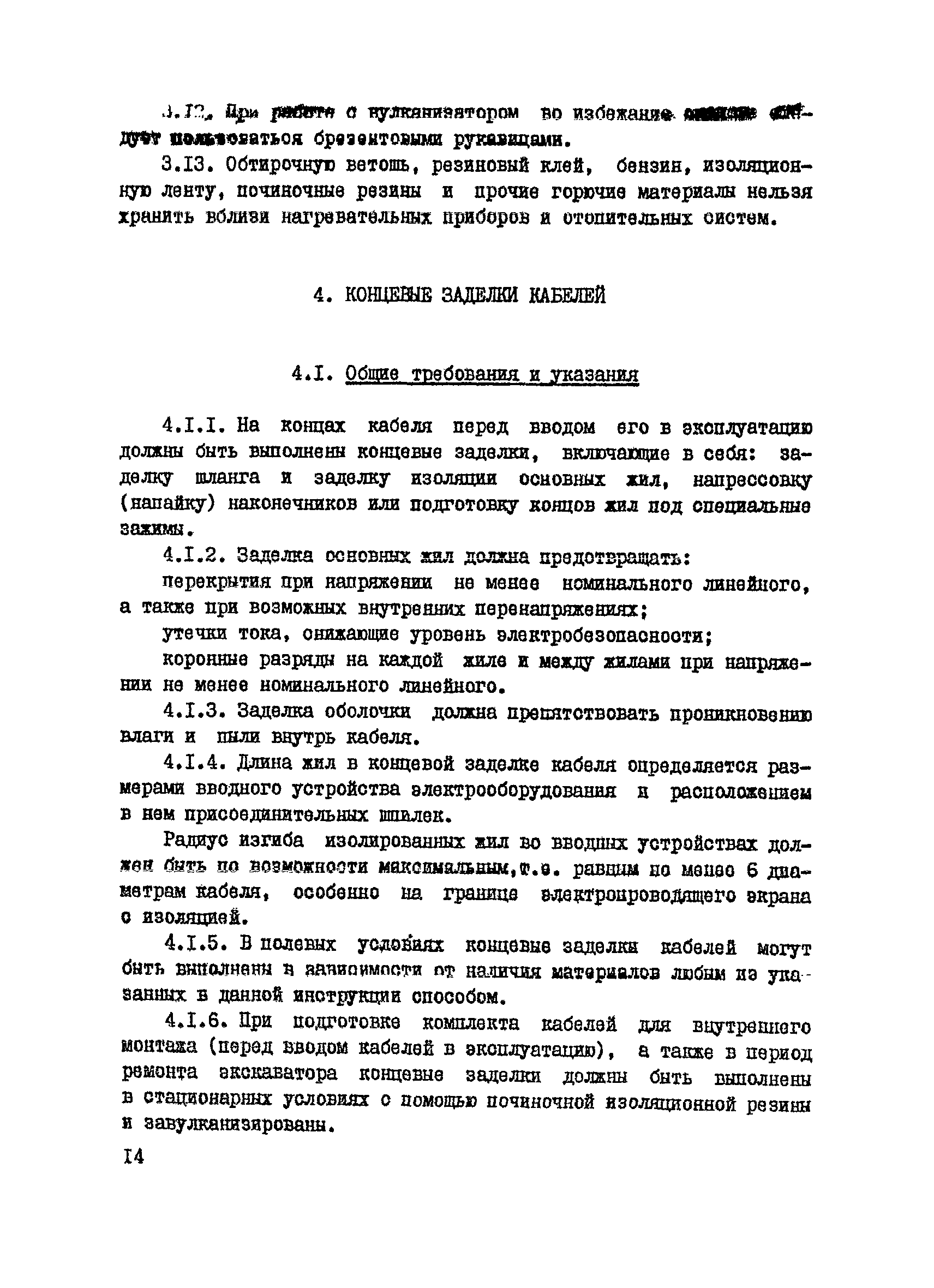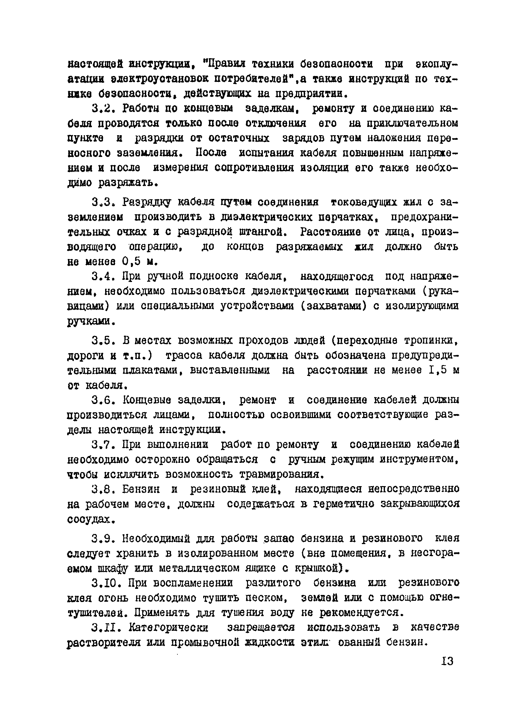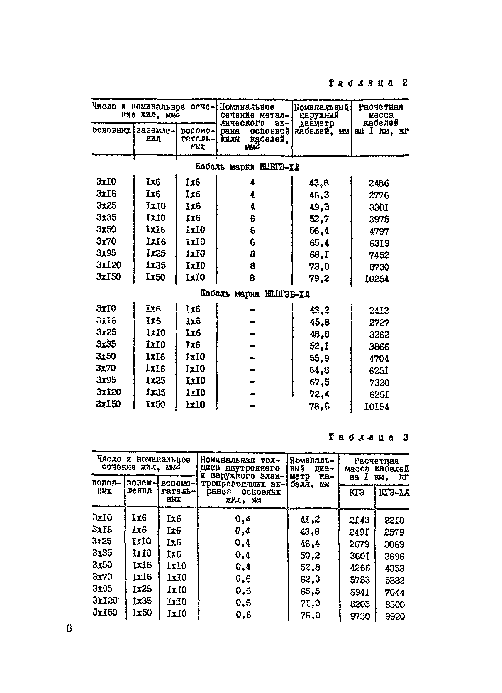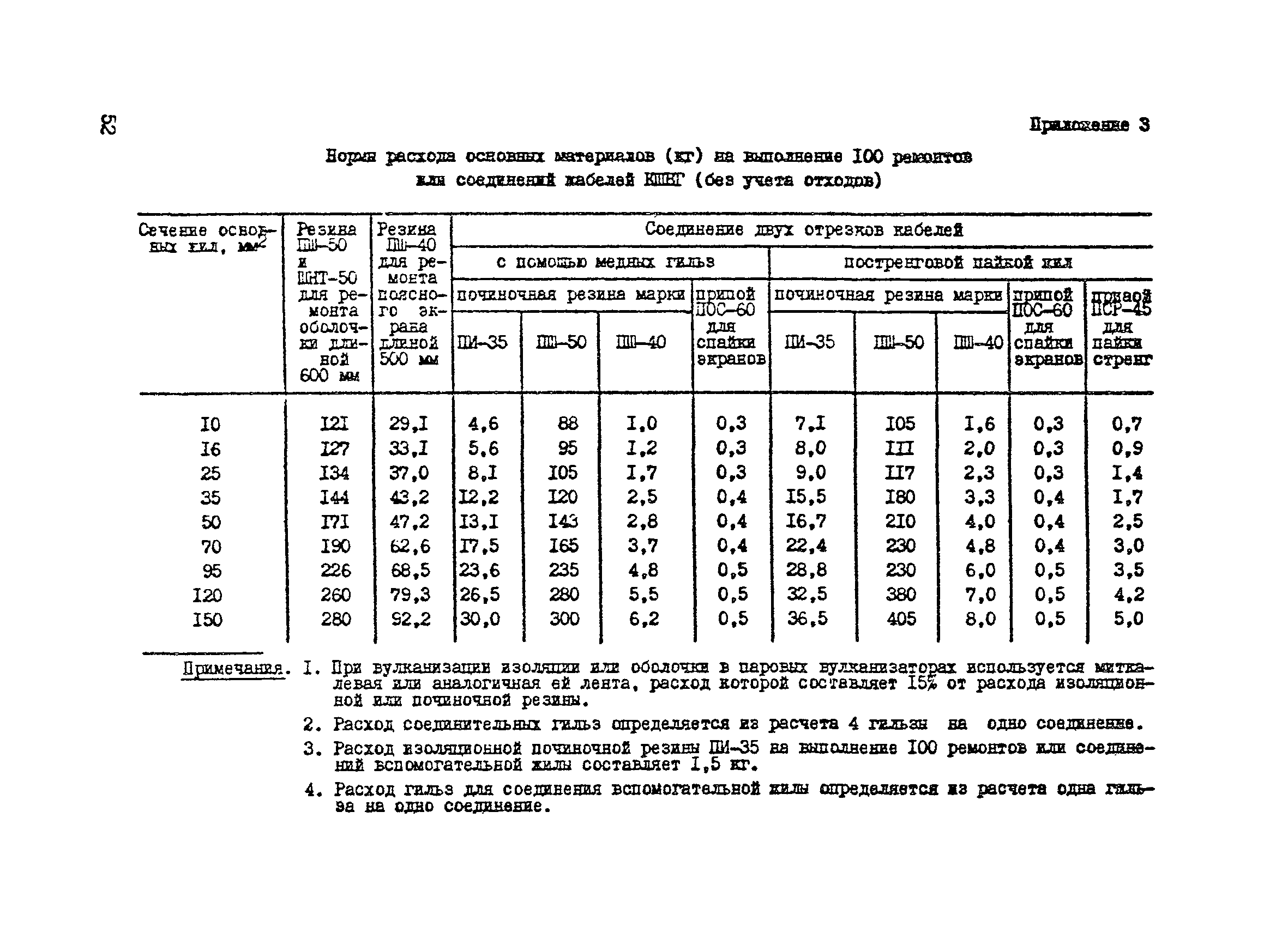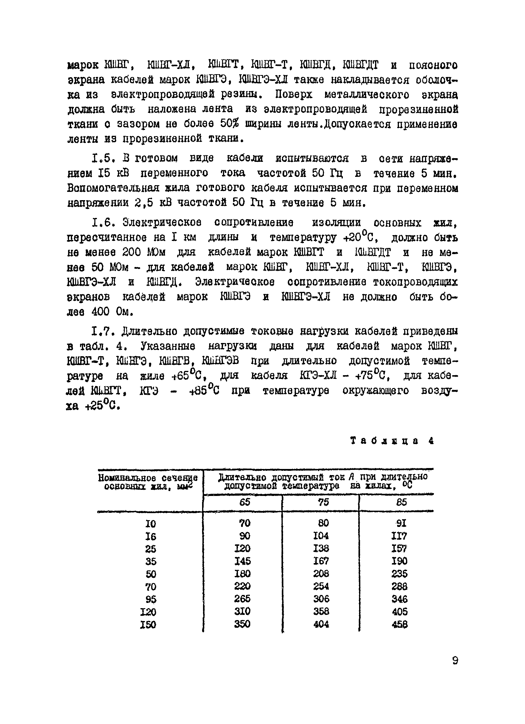 | Оглавление: | 1. Конструкция и основные технические данные кабелей марки КШНГ 2. Транспортирование и хранение кабелей 3. Меры безопасности 4. Концевые заделки кабелей 4.1. Общие требования и указания 4.2. Подготовка к работе 4.3. Порядок разделки кабеля 4.4. Порядок выполнения концевой заделки с помощью починочной резины 4.5. Порядок выполнения концевой заделки с помощью трубок из кремнийорганической резины 4.6. Порядок выполнения концевой заделки с помощью электроизоляционных гильз 4.7. Установка кабельных наконечников 5. Присоединение и эксплуатация кабелей 6. Проверка технического состояния и методы обнаружения неисправностей кабелей 7. Ремонт и соединение отрезков кабелей 7.1. Ремонт внешней оболочки и поясного экрана из электропроводящей резины 7.2. Ремонт металлического экрана основных жил кабелей типа КШНГ (на длине не более 260 мм) 7.3. Ремонт изоляции жилы 7.4. Соединение токопроводящих жил в помощью медных гильз 7.5. Соединение токопроводящих жил кабелей, наматываемых на кабельный барабан 7.6. Восстановление изоляции жил, экранов и оболочки при соединении отрезков кабеля Приложение 1 Перечень оборудования, инструмента и спецодежды, необходимых при ремонте, соединении и концевых заделках кабелей Приложение 2 Перечень материалов, необходимых для выполнения ремонта, соединений и концевых заделов кабелей Приложение 3 Нормы расхода основных материалов на выполнение 100 ремонтов для соединений кабелей КШНГ Приложение 4 Нормы расхода основных материалов на выполнение 100 концевых заделок кабелей КШНГ Приложение 5 Краткие сведения об особенностях принципа действия и эксплуатации вулканизаторов для выполнения концевых заделок ремонта и соединения гибких кабелей Приложение 6 Аппарат АШИК для испытания кабелей повышенным импульсным напряжением Подготовка кабеля к испытанию с помощью аппарата АШИК |
