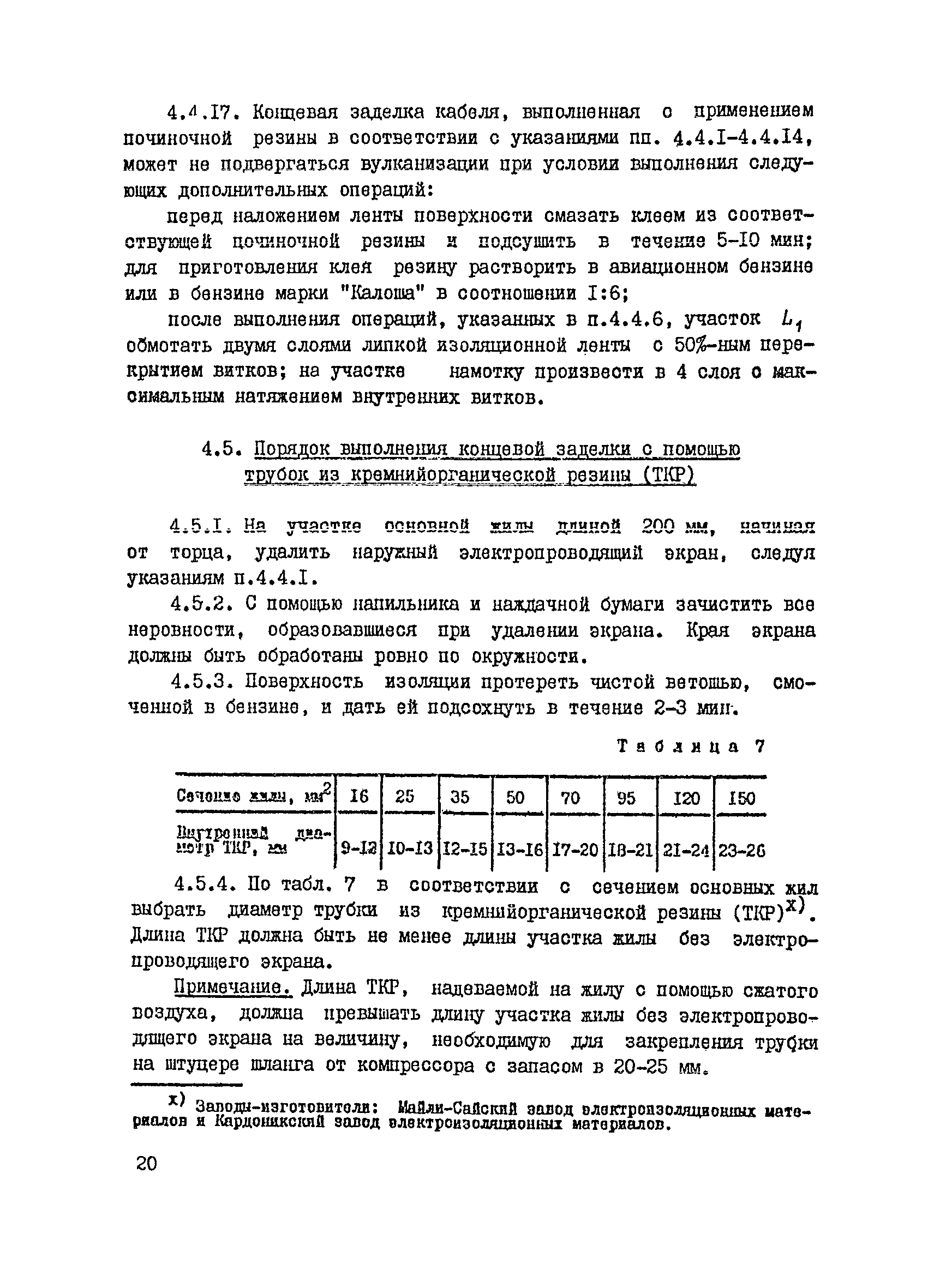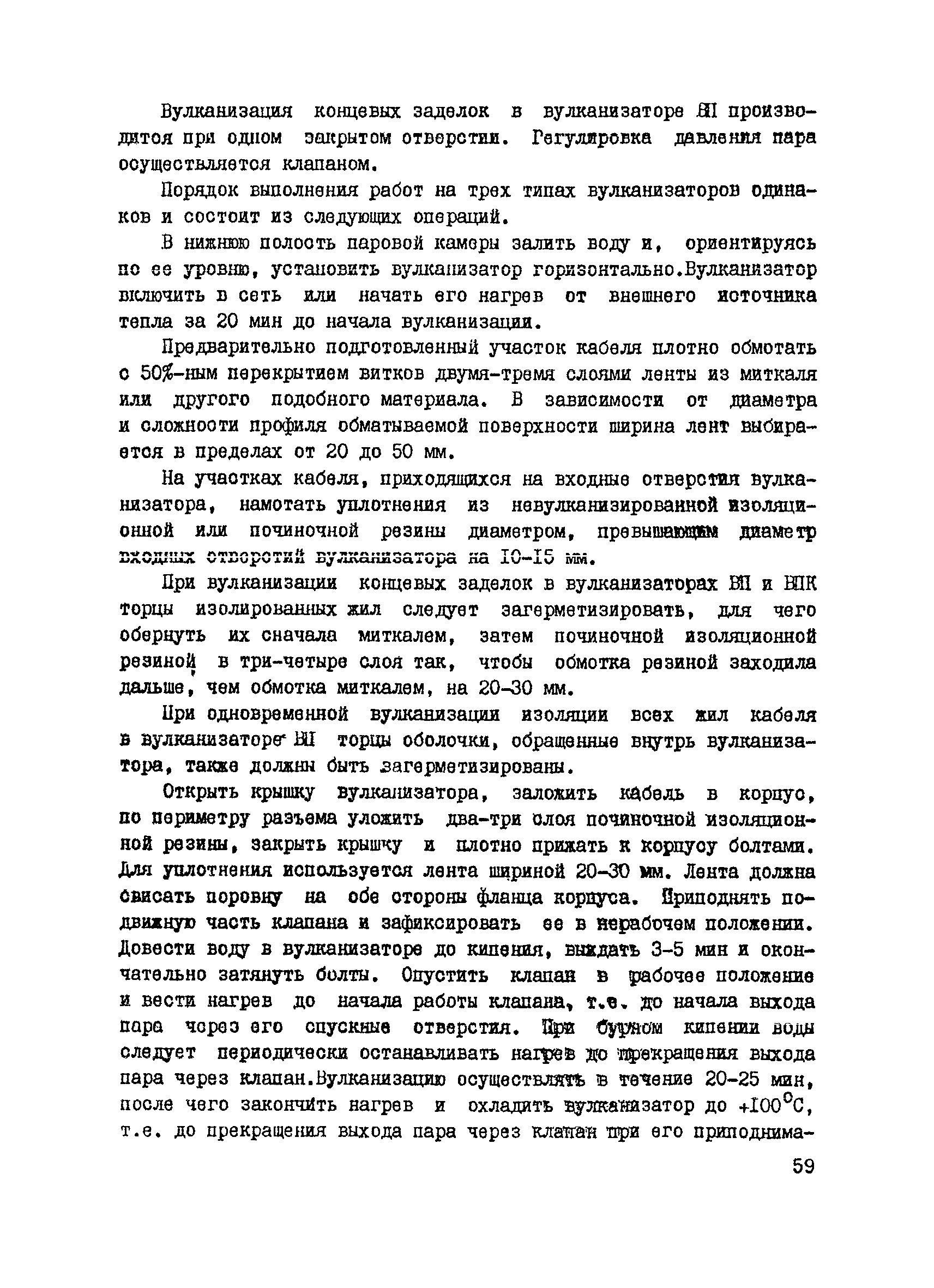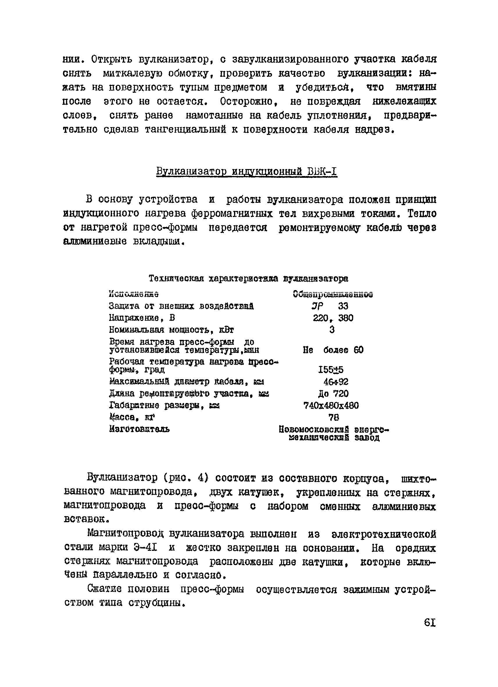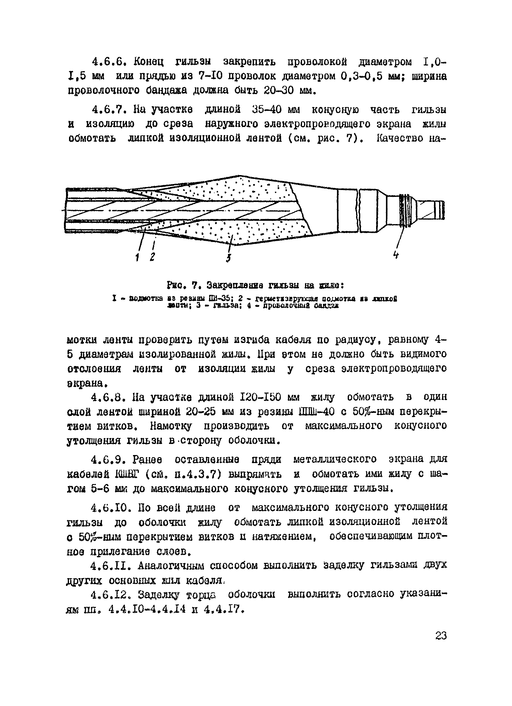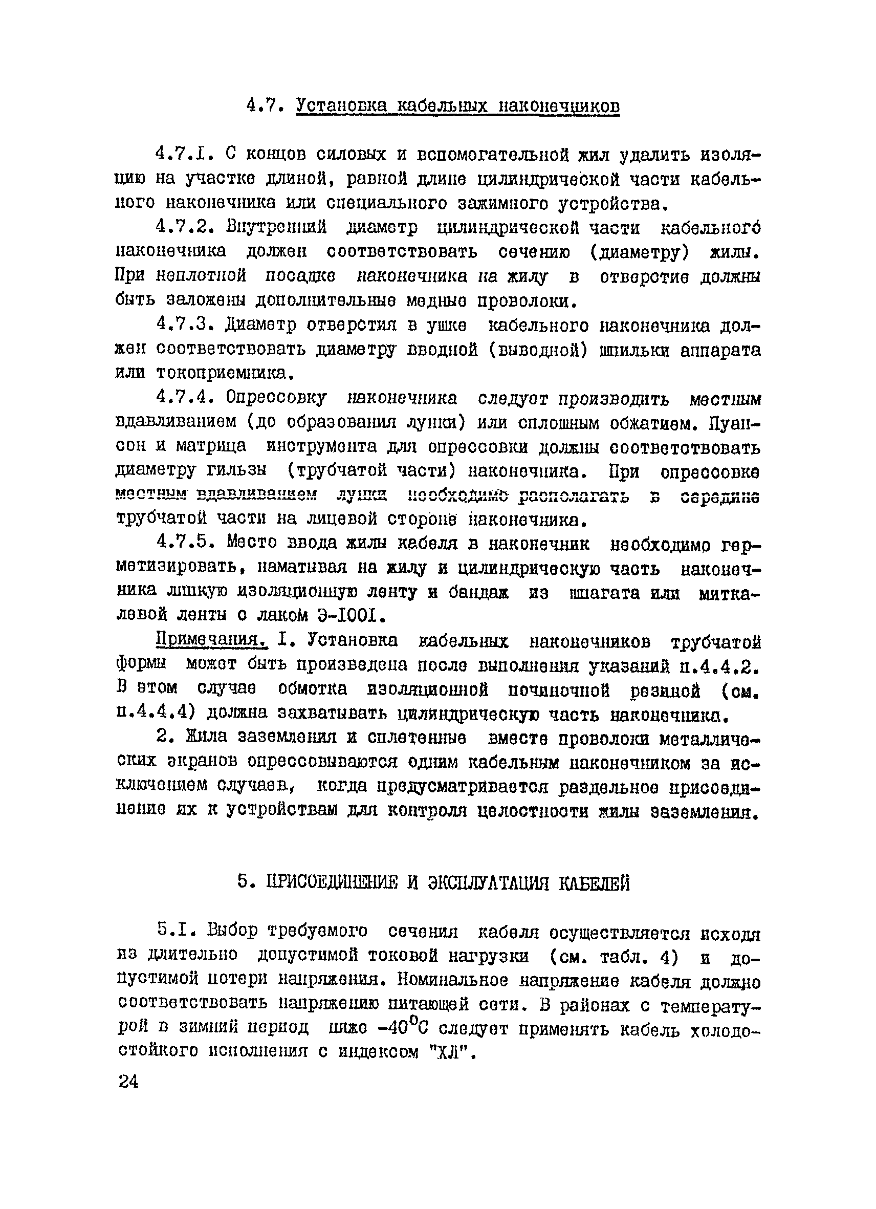 | Оглавление: | 1. Конструкция и основные технические данные кабелей марки КШНГ 2. Транспортирование и хранение кабелей 3. Меры безопасности 4. Концевые заделки кабелей 4.1. Общие требования и указания 4.2. Подготовка к работе 4.3. Порядок разделки кабеля 4.4. Порядок выполнения концевой заделки с помощью починочной резины 4.5. Порядок выполнения концевой заделки с помощью трубок из кремнийорганической резины 4.6. Порядок выполнения концевой заделки с помощью электроизоляционных гильз 4.7. Установка кабельных наконечников 5. Присоединение и эксплуатация кабелей 6. Проверка технического состояния и методы обнаружения неисправностей кабелей 7. Ремонт и соединение отрезков кабелей 7.1. Ремонт внешней оболочки и поясного экрана из электропроводящей резины 7.2. Ремонт металлического экрана основных жил кабелей типа КШНГ (на длине не более 260 мм) 7.3. Ремонт изоляции жилы 7.4. Соединение токопроводящих жил в помощью медных гильз 7.5. Соединение токопроводящих жил кабелей, наматываемых на кабельный барабан 7.6. Восстановление изоляции жил, экранов и оболочки при соединении отрезков кабеля Приложение 1 Перечень оборудования, инструмента и спецодежды, необходимых при ремонте, соединении и концевых заделках кабелей Приложение 2 Перечень материалов, необходимых для выполнения ремонта, соединений и концевых заделов кабелей Приложение 3 Нормы расхода основных материалов на выполнение 100 ремонтов для соединений кабелей КШНГ Приложение 4 Нормы расхода основных материалов на выполнение 100 концевых заделок кабелей КШНГ Приложение 5 Краткие сведения об особенностях принципа действия и эксплуатации вулканизаторов для выполнения концевых заделок ремонта и соединения гибких кабелей Приложение 6 Аппарат АШИК для испытания кабелей повышенным импульсным напряжением Подготовка кабеля к испытанию с помощью аппарата АШИК |
