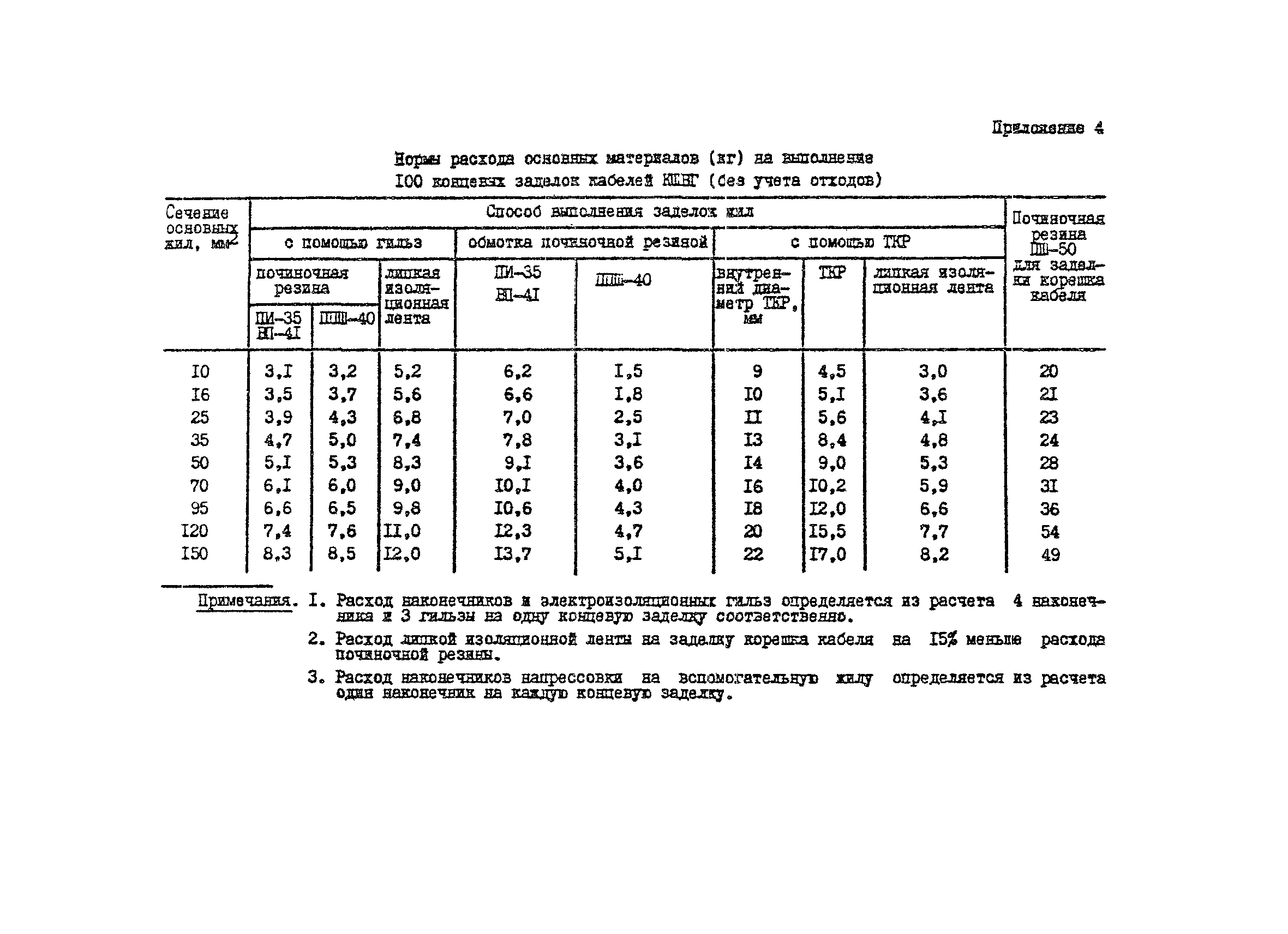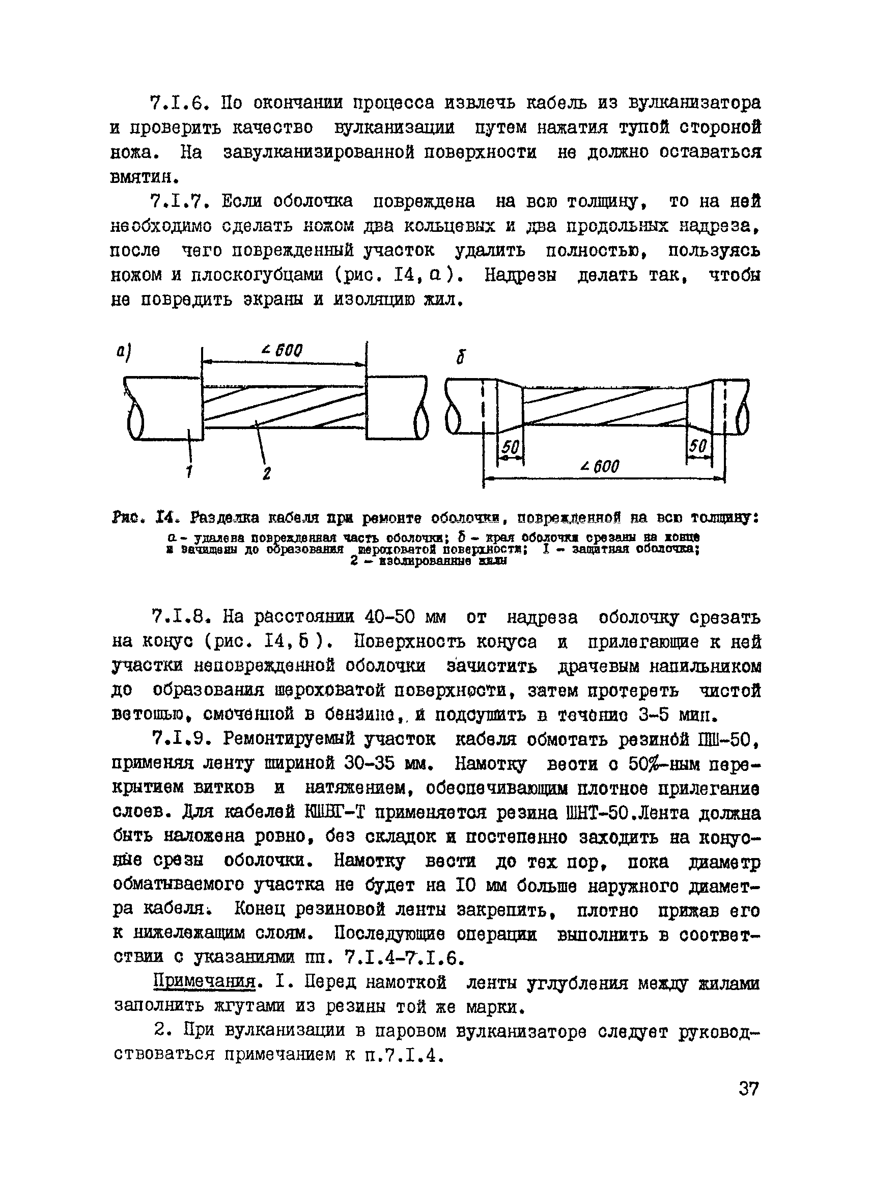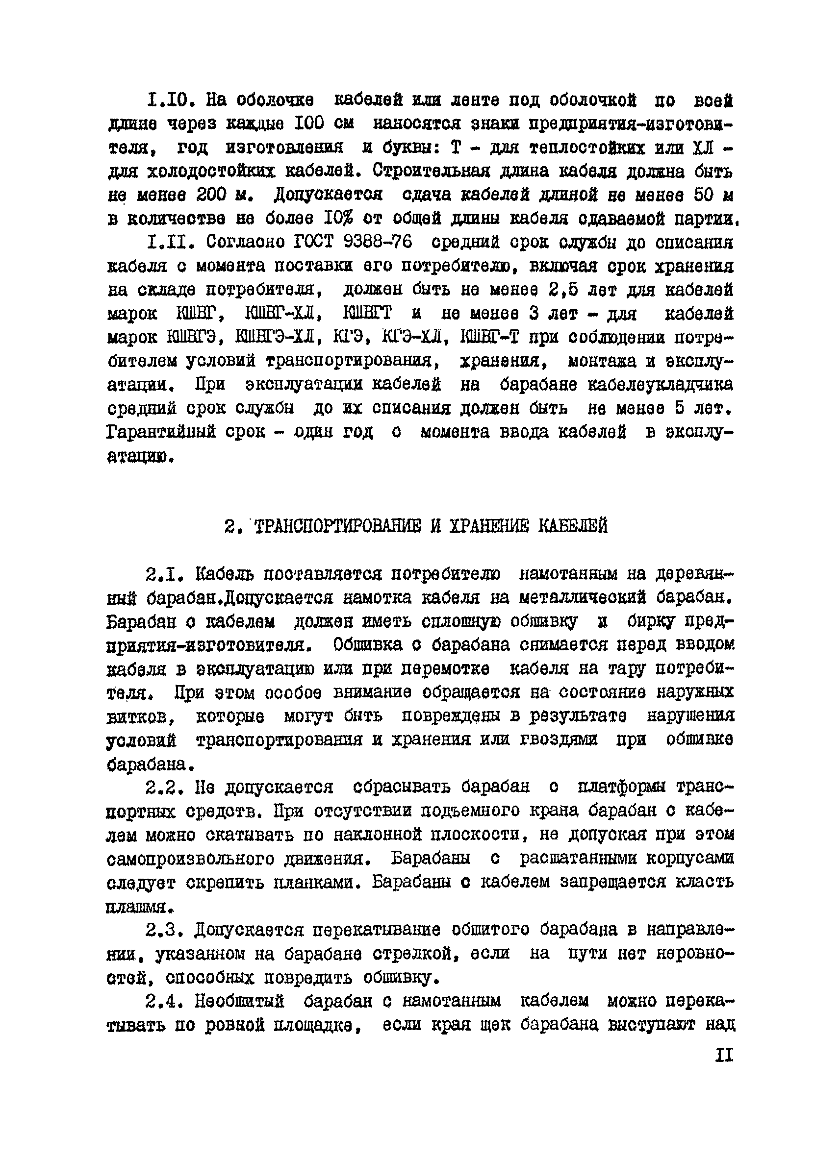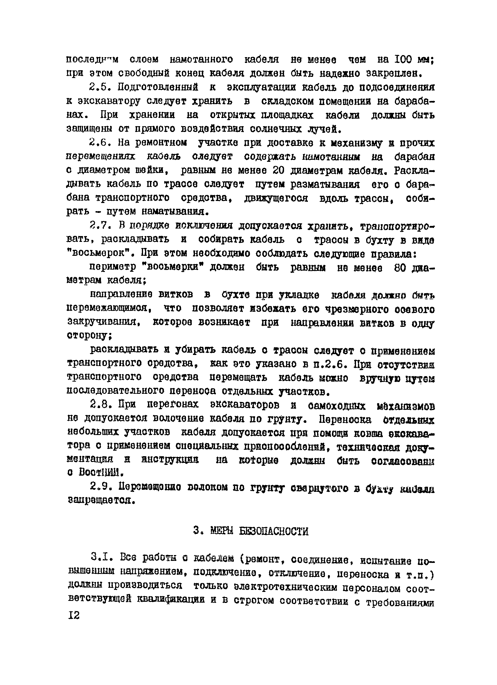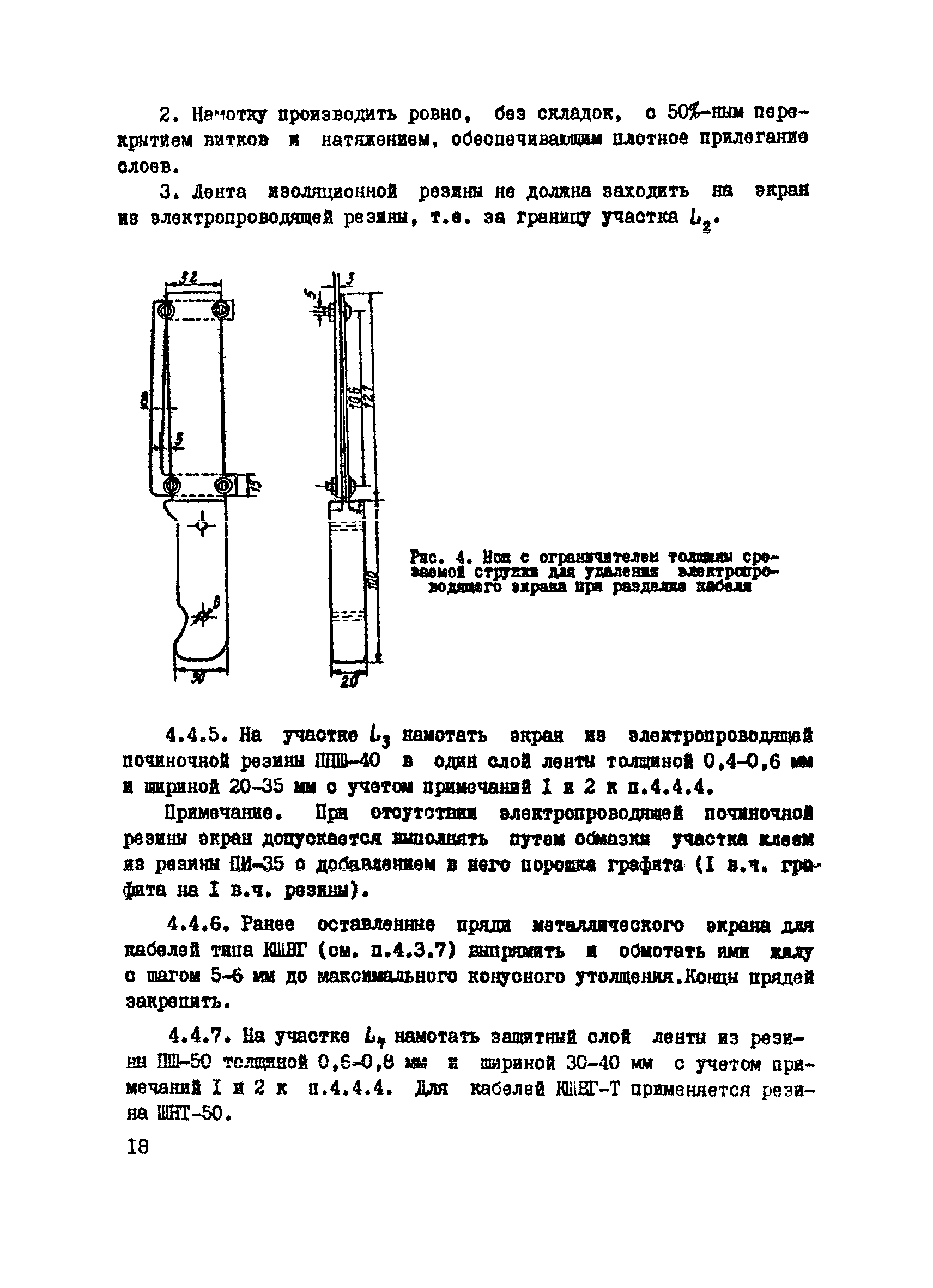| Оглавление: | 1. Конструкция и основные технические данные кабелей марки КШНГ 2. Транспортирование и хранение кабелей 3. Меры безопасности 4. Концевые заделки кабелей 4.1. Общие требования и указания 4.2. Подготовка к работе 4.3. Порядок разделки кабеля 4.4. Порядок выполнения концевой заделки с помощью починочной резины 4.5. Порядок выполнения концевой заделки с помощью трубок из кремнийорганической резины 4.6. Порядок выполнения концевой заделки с помощью электроизоляционных гильз 4.7. Установка кабельных наконечников 5. Присоединение и эксплуатация кабелей 6. Проверка технического состояния и методы обнаружения неисправностей кабелей 7. Ремонт и соединение отрезков кабелей 7.1. Ремонт внешней оболочки и поясного экрана из электропроводящей резины 7.2. Ремонт металлического экрана основных жил кабелей типа КШНГ (на длине не более 260 мм) 7.3. Ремонт изоляции жилы 7.4. Соединение токопроводящих жил в помощью медных гильз 7.5. Соединение токопроводящих жил кабелей, наматываемых на кабельный барабан 7.6. Восстановление изоляции жил, экранов и оболочки при соединении отрезков кабеля Приложение 1 Перечень оборудования, инструмента и спецодежды, необходимых при ремонте, соединении и концевых заделках кабелей Приложение 2 Перечень материалов, необходимых для выполнения ремонта, соединений и концевых заделов кабелей Приложение 3 Нормы расхода основных материалов на выполнение 100 ремонтов для соединений кабелей КШНГ Приложение 4 Нормы расхода основных материалов на выполнение 100 концевых заделок кабелей КШНГ Приложение 5 Краткие сведения об особенностях принципа действия и эксплуатации вулканизаторов для выполнения концевых заделок ремонта и соединения гибких кабелей Приложение 6 Аппарат АШИК для испытания кабелей повышенным импульсным напряжением Подготовка кабеля к испытанию с помощью аппарата АШИК |