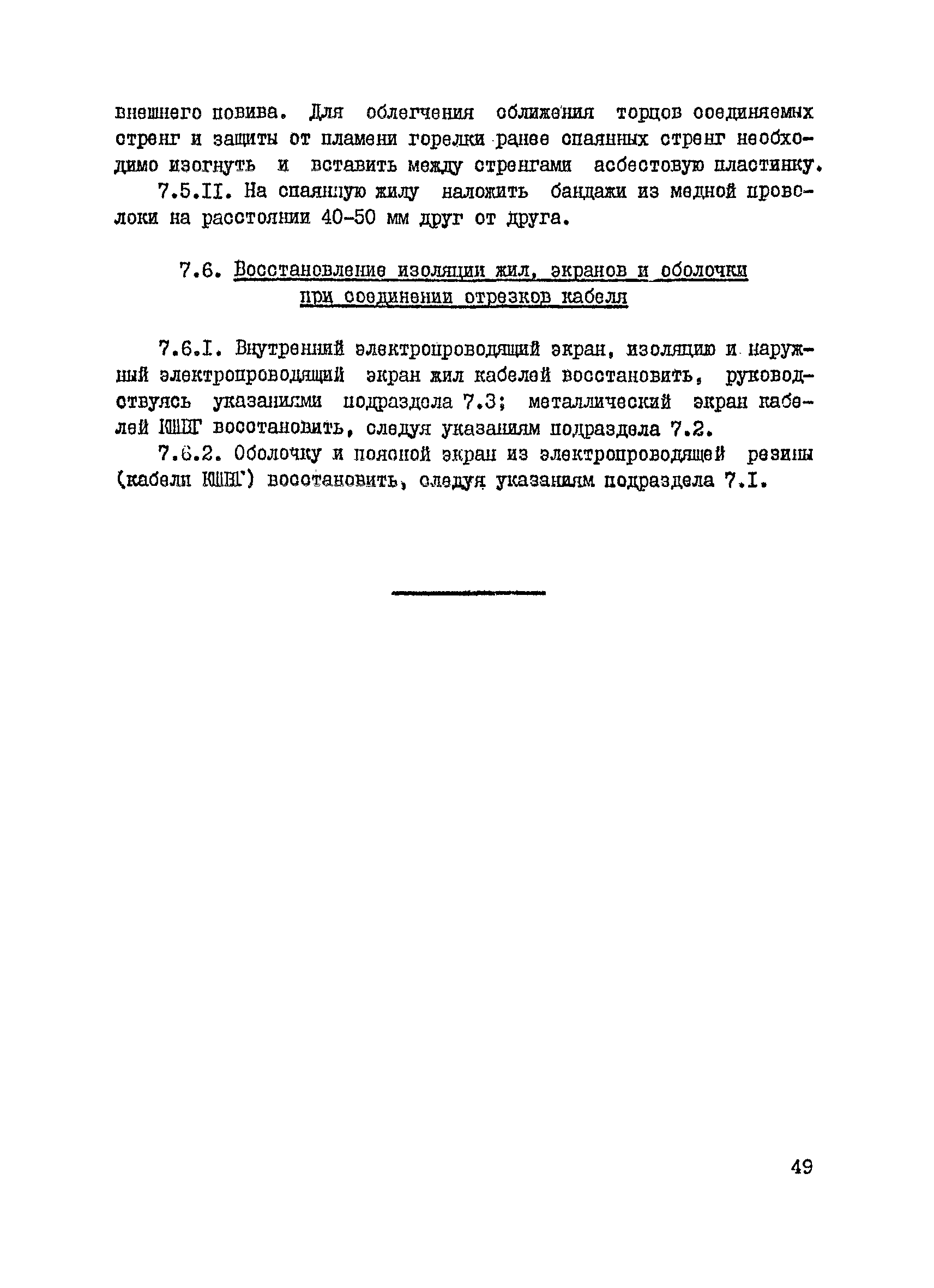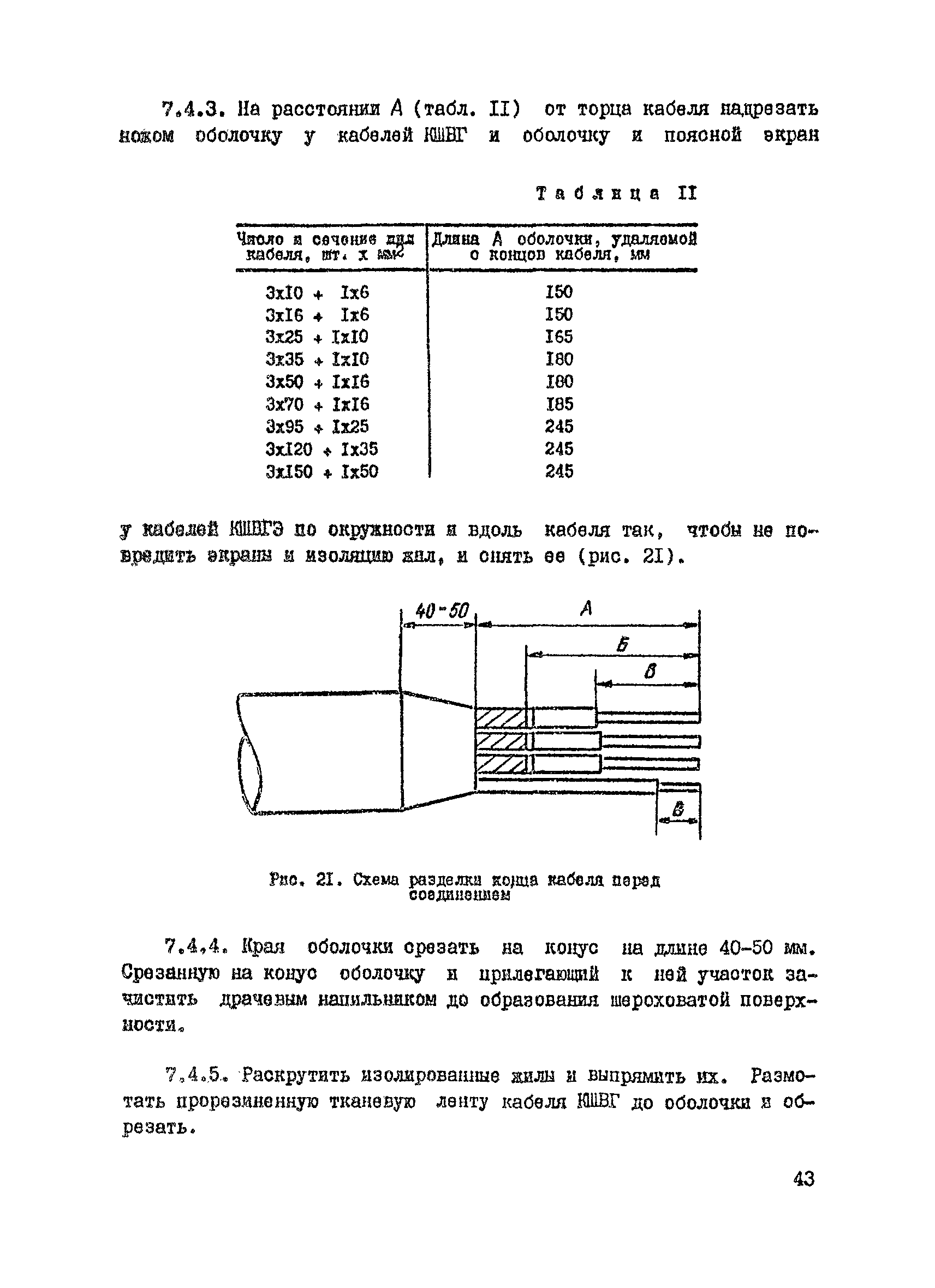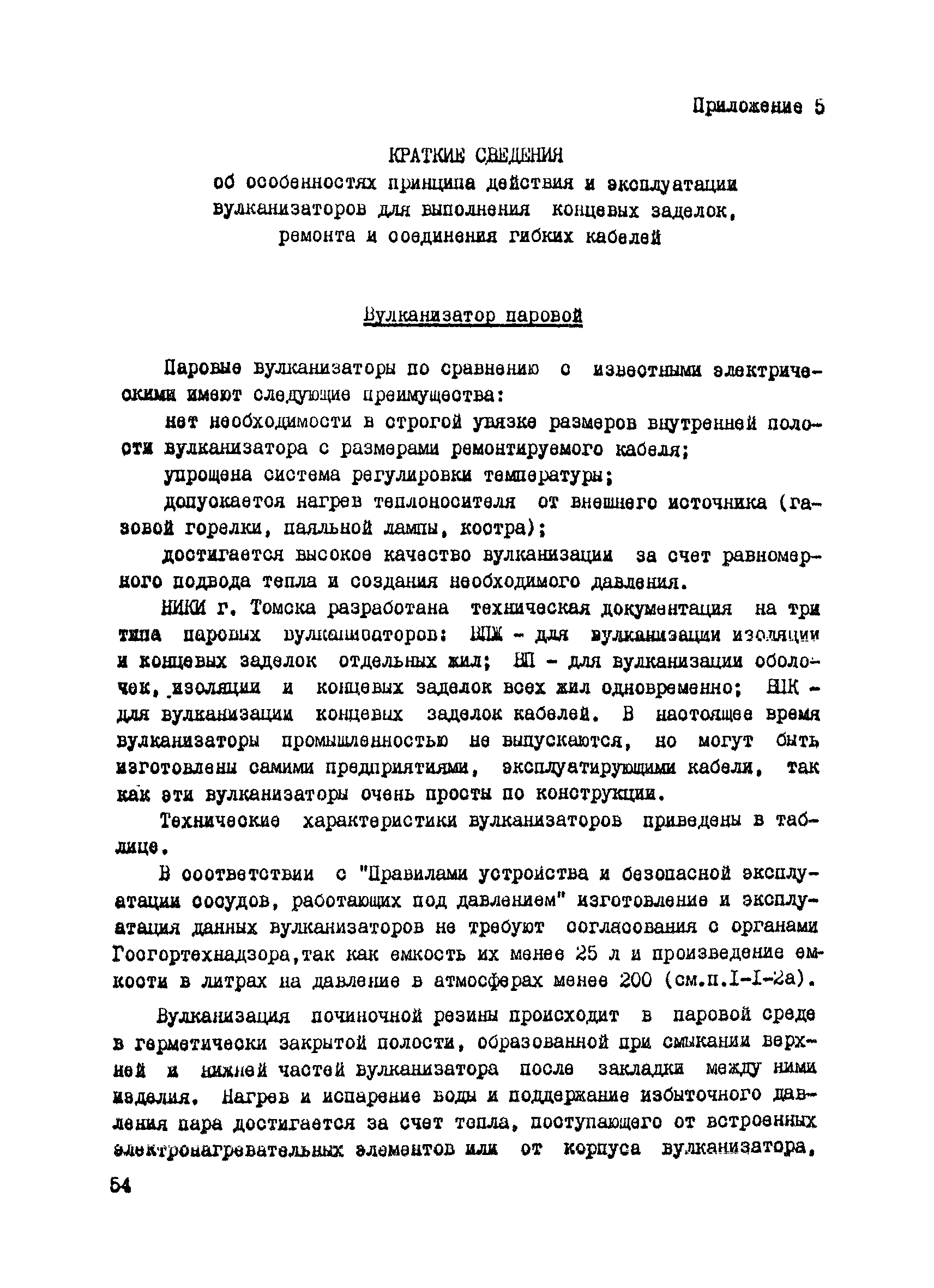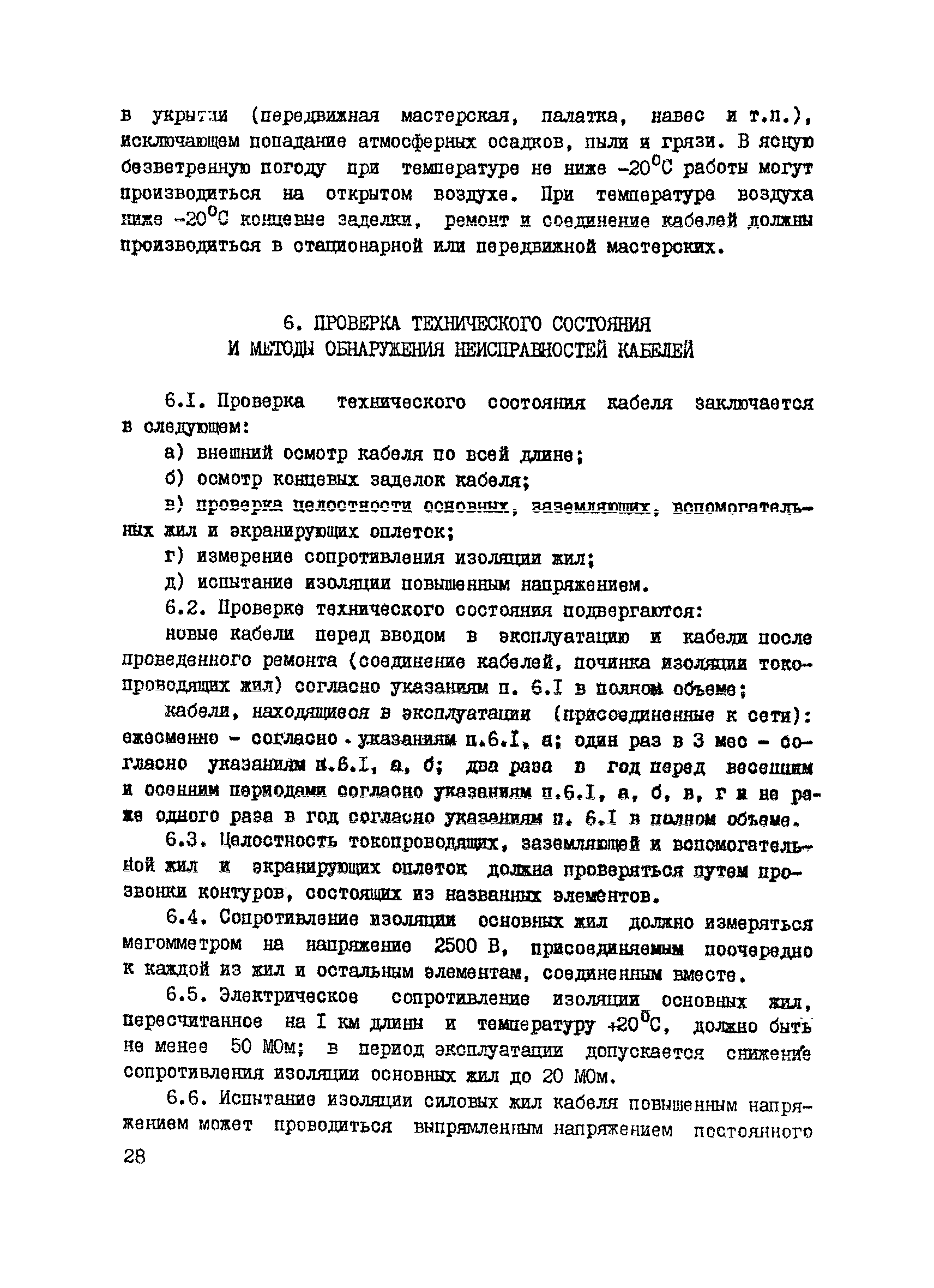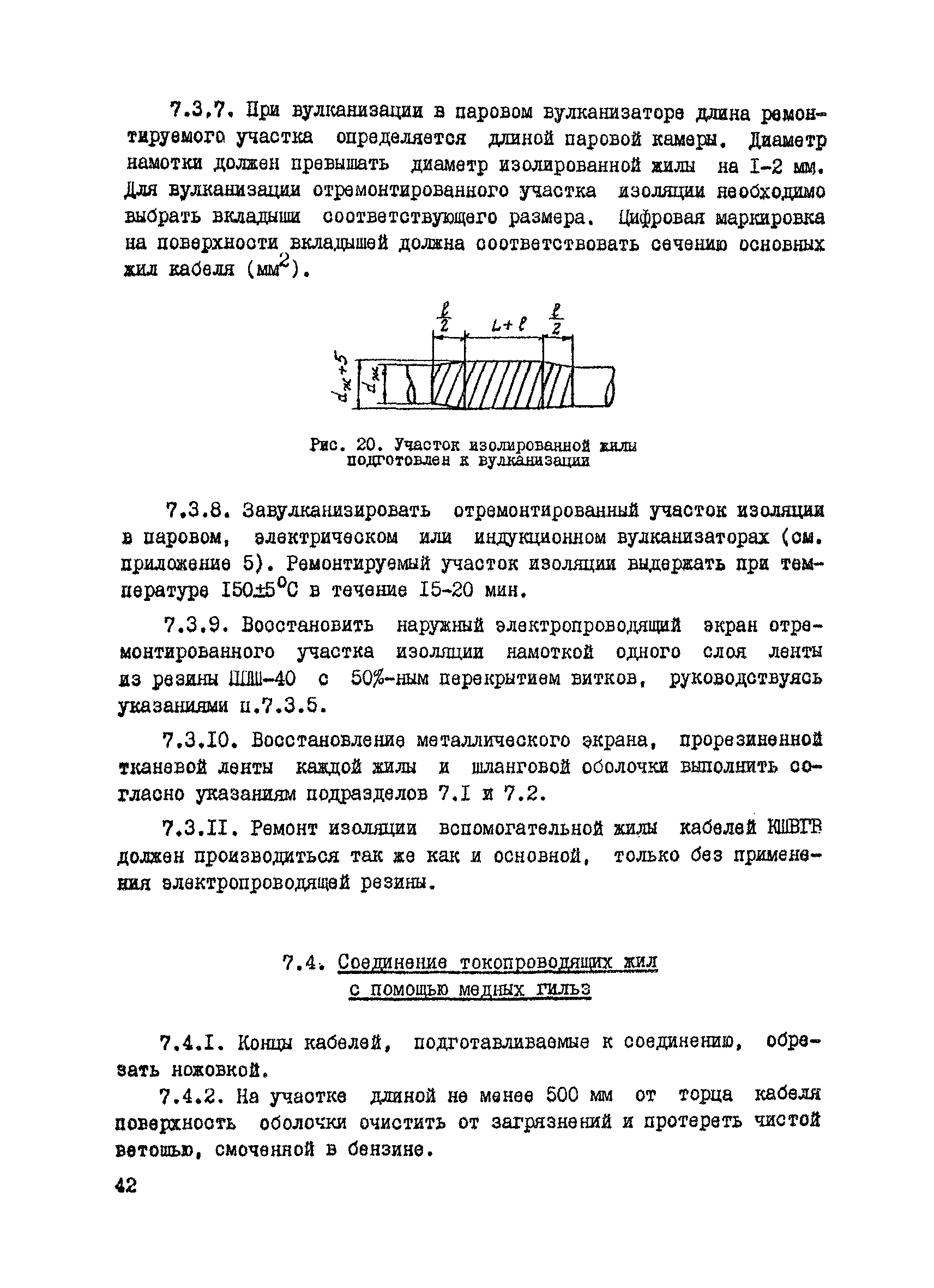 | Оглавление: | 1. Конструкция и основные технические данные кабелей марки КШНГ 2. Транспортирование и хранение кабелей 3. Меры безопасности 4. Концевые заделки кабелей 4.1. Общие требования и указания 4.2. Подготовка к работе 4.3. Порядок разделки кабеля 4.4. Порядок выполнения концевой заделки с помощью починочной резины 4.5. Порядок выполнения концевой заделки с помощью трубок из кремнийорганической резины 4.6. Порядок выполнения концевой заделки с помощью электроизоляционных гильз 4.7. Установка кабельных наконечников 5. Присоединение и эксплуатация кабелей 6. Проверка технического состояния и методы обнаружения неисправностей кабелей 7. Ремонт и соединение отрезков кабелей 7.1. Ремонт внешней оболочки и поясного экрана из электропроводящей резины 7.2. Ремонт металлического экрана основных жил кабелей типа КШНГ (на длине не более 260 мм) 7.3. Ремонт изоляции жилы 7.4. Соединение токопроводящих жил в помощью медных гильз 7.5. Соединение токопроводящих жил кабелей, наматываемых на кабельный барабан 7.6. Восстановление изоляции жил, экранов и оболочки при соединении отрезков кабеля Приложение 1 Перечень оборудования, инструмента и спецодежды, необходимых при ремонте, соединении и концевых заделках кабелей Приложение 2 Перечень материалов, необходимых для выполнения ремонта, соединений и концевых заделов кабелей Приложение 3 Нормы расхода основных материалов на выполнение 100 ремонтов для соединений кабелей КШНГ Приложение 4 Нормы расхода основных материалов на выполнение 100 концевых заделок кабелей КШНГ Приложение 5 Краткие сведения об особенностях принципа действия и эксплуатации вулканизаторов для выполнения концевых заделок ремонта и соединения гибких кабелей Приложение 6 Аппарат АШИК для испытания кабелей повышенным импульсным напряжением Подготовка кабеля к испытанию с помощью аппарата АШИК |