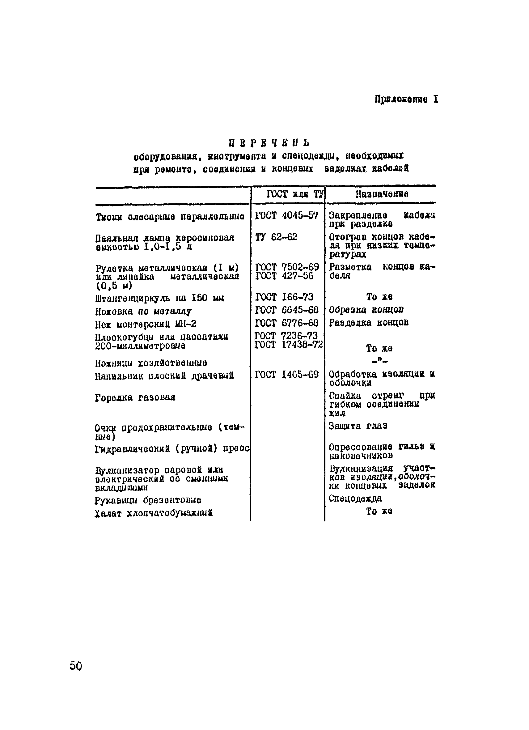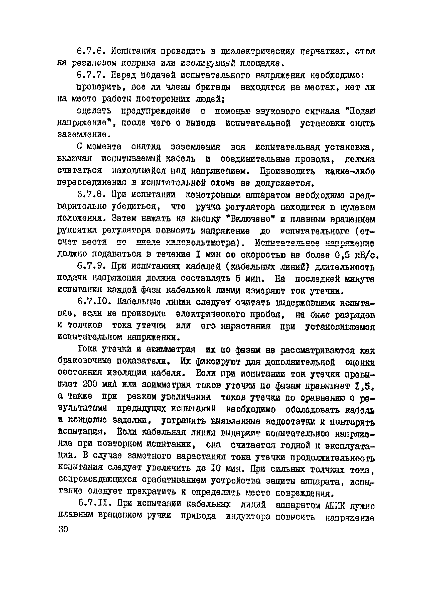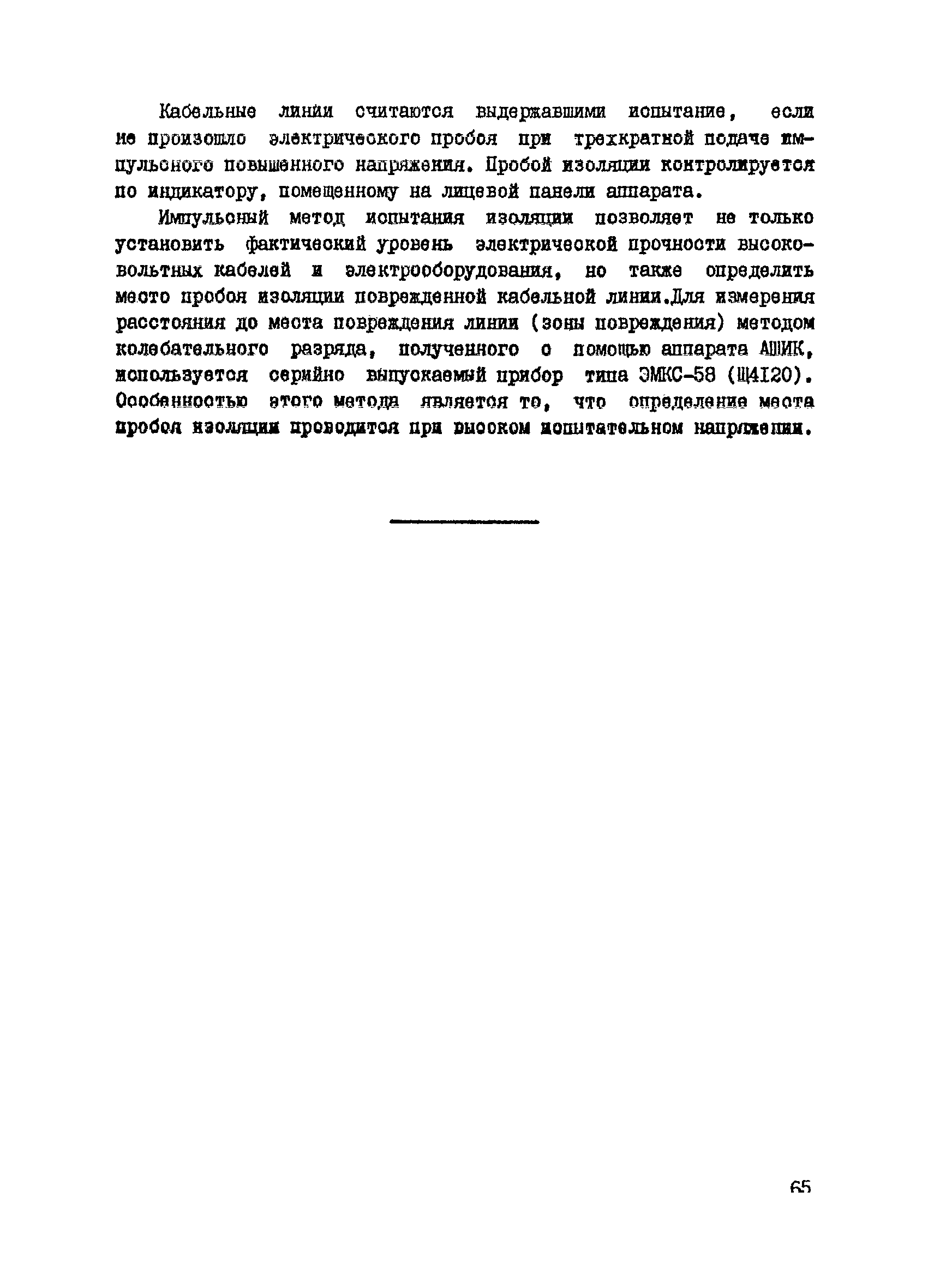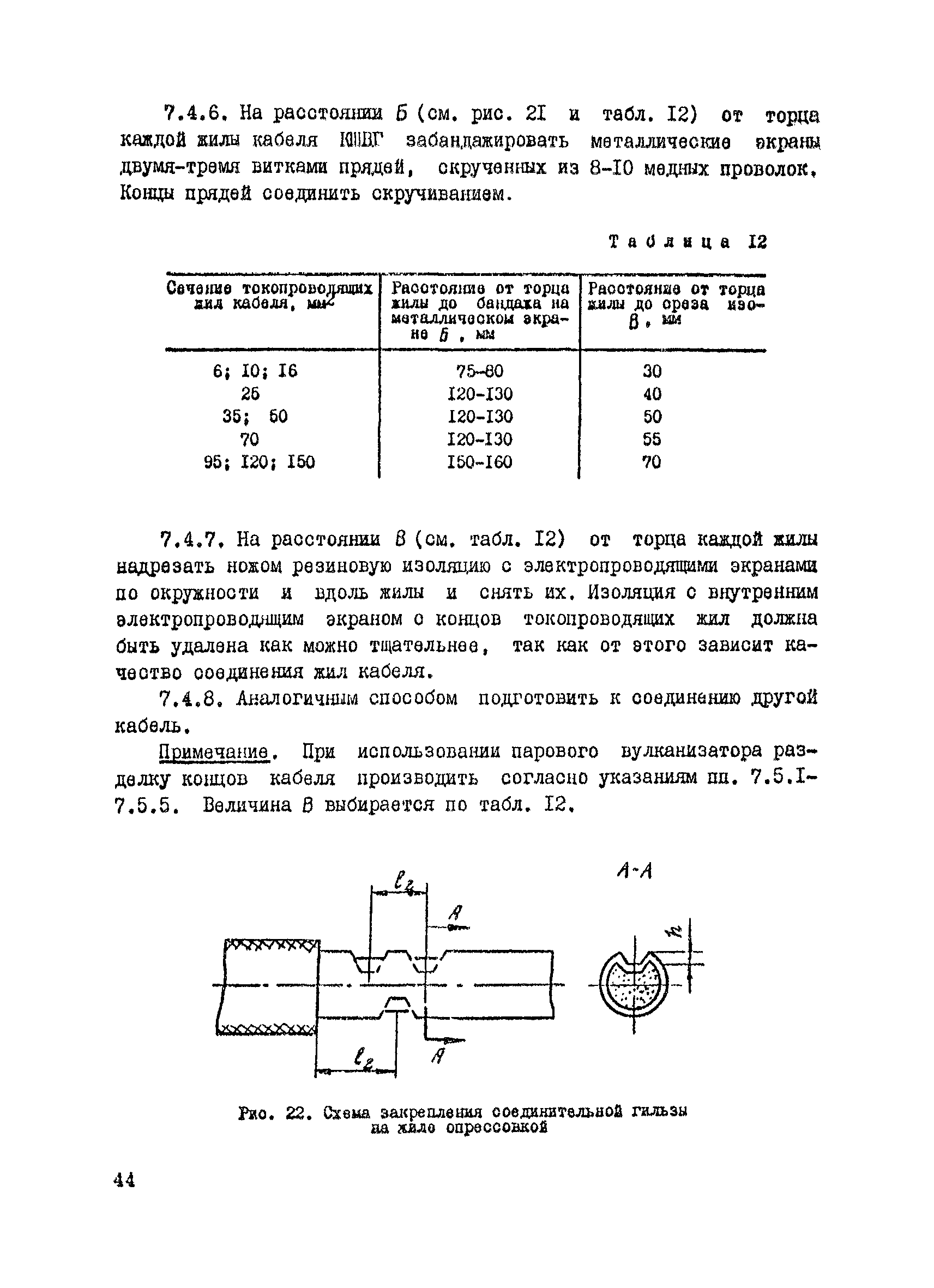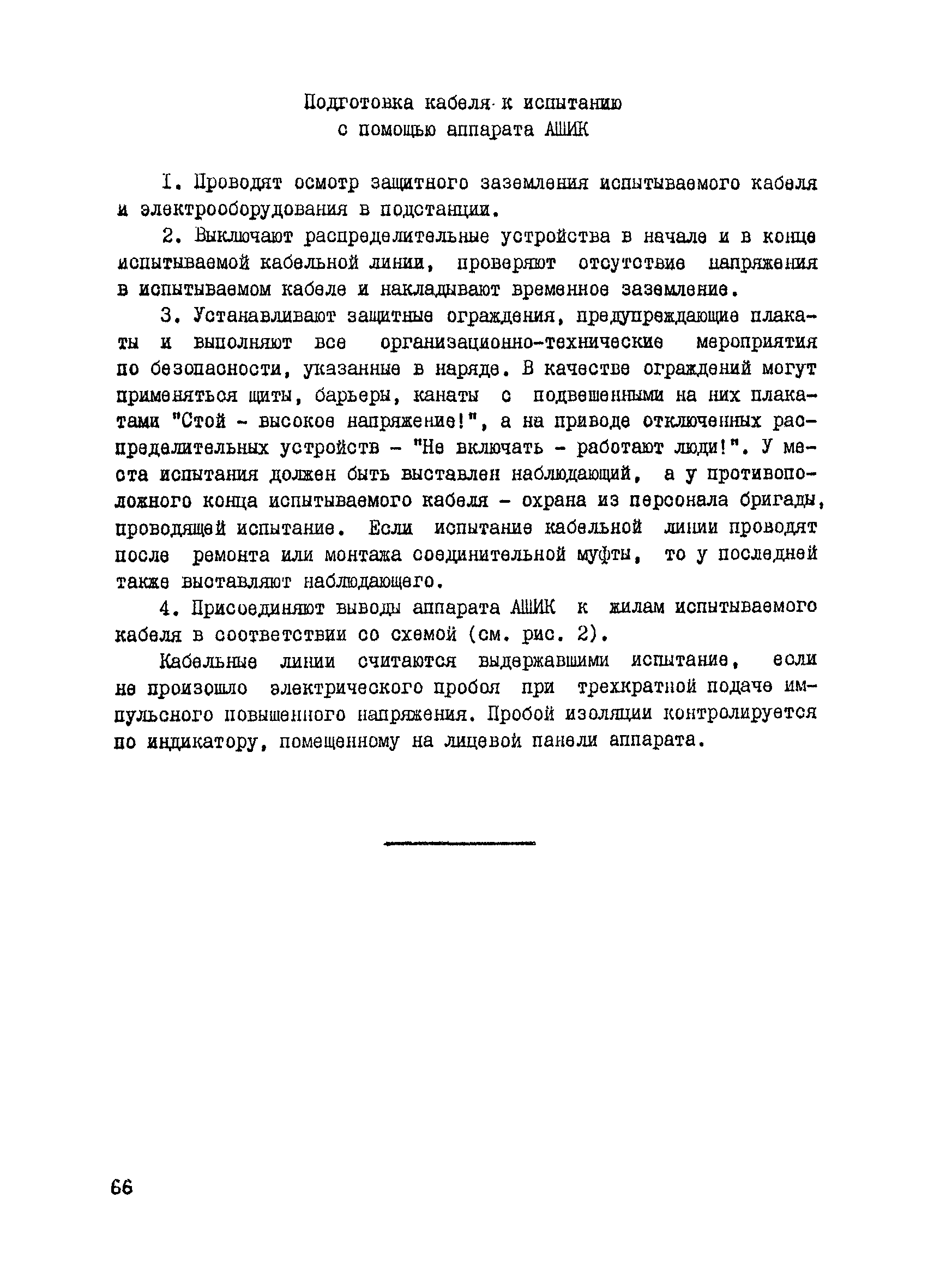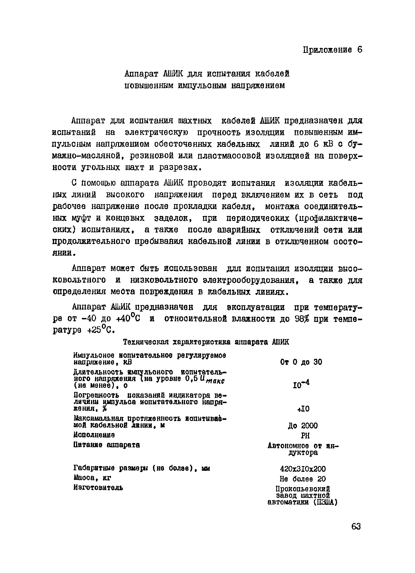 | Оглавление: | 1. Конструкция и основные технические данные кабелей марки КШНГ 2. Транспортирование и хранение кабелей 3. Меры безопасности 4. Концевые заделки кабелей 4.1. Общие требования и указания 4.2. Подготовка к работе 4.3. Порядок разделки кабеля 4.4. Порядок выполнения концевой заделки с помощью починочной резины 4.5. Порядок выполнения концевой заделки с помощью трубок из кремнийорганической резины 4.6. Порядок выполнения концевой заделки с помощью электроизоляционных гильз 4.7. Установка кабельных наконечников 5. Присоединение и эксплуатация кабелей 6. Проверка технического состояния и методы обнаружения неисправностей кабелей 7. Ремонт и соединение отрезков кабелей 7.1. Ремонт внешней оболочки и поясного экрана из электропроводящей резины 7.2. Ремонт металлического экрана основных жил кабелей типа КШНГ (на длине не более 260 мм) 7.3. Ремонт изоляции жилы 7.4. Соединение токопроводящих жил в помощью медных гильз 7.5. Соединение токопроводящих жил кабелей, наматываемых на кабельный барабан 7.6. Восстановление изоляции жил, экранов и оболочки при соединении отрезков кабеля Приложение 1 Перечень оборудования, инструмента и спецодежды, необходимых при ремонте, соединении и концевых заделках кабелей Приложение 2 Перечень материалов, необходимых для выполнения ремонта, соединений и концевых заделов кабелей Приложение 3 Нормы расхода основных материалов на выполнение 100 ремонтов для соединений кабелей КШНГ Приложение 4 Нормы расхода основных материалов на выполнение 100 концевых заделок кабелей КШНГ Приложение 5 Краткие сведения об особенностях принципа действия и эксплуатации вулканизаторов для выполнения концевых заделок ремонта и соединения гибких кабелей Приложение 6 Аппарат АШИК для испытания кабелей повышенным импульсным напряжением Подготовка кабеля к испытанию с помощью аппарата АШИК |