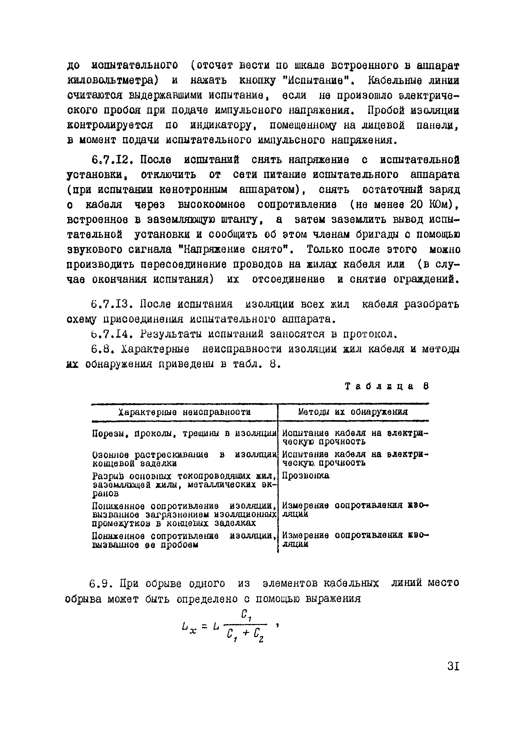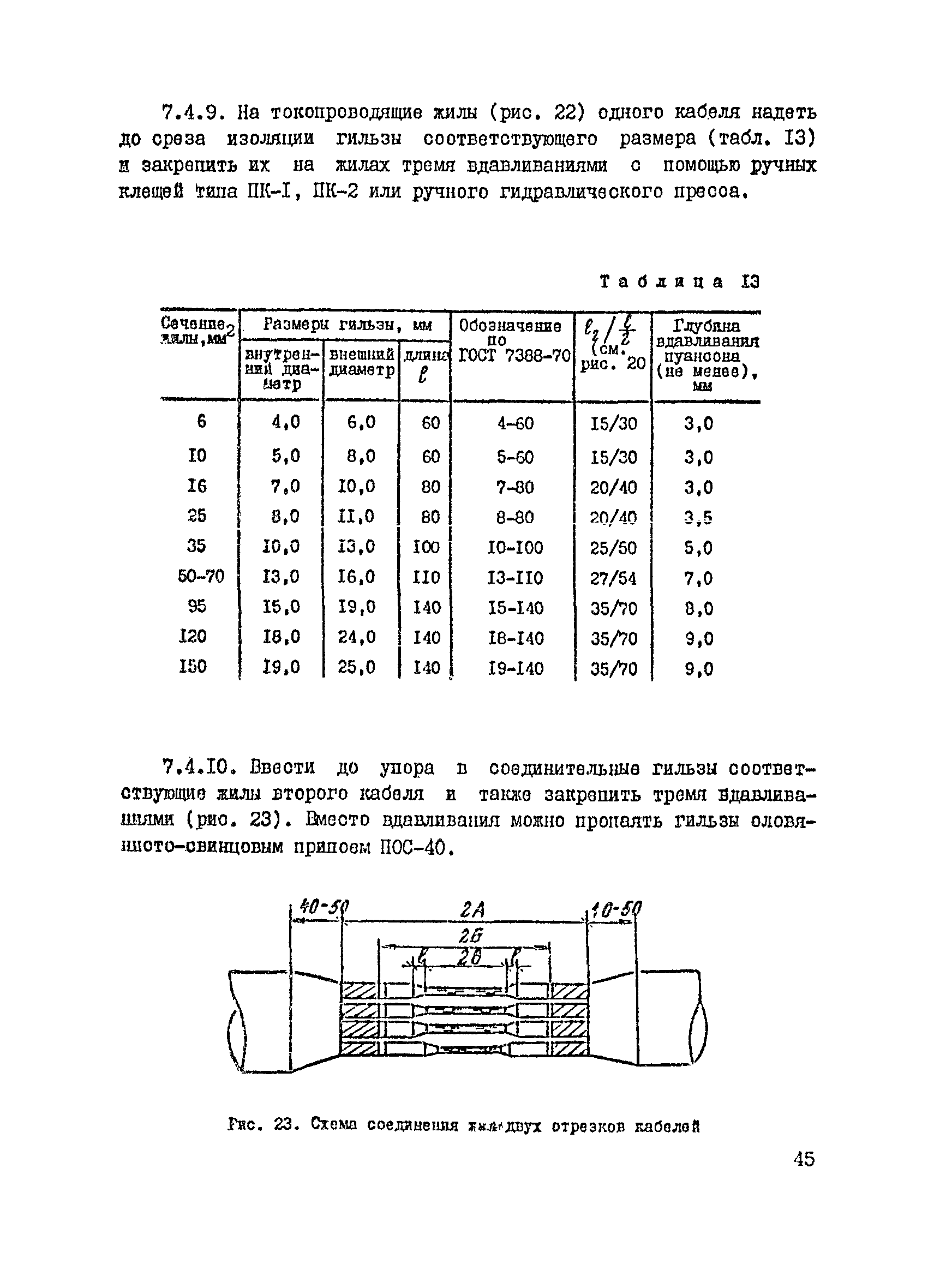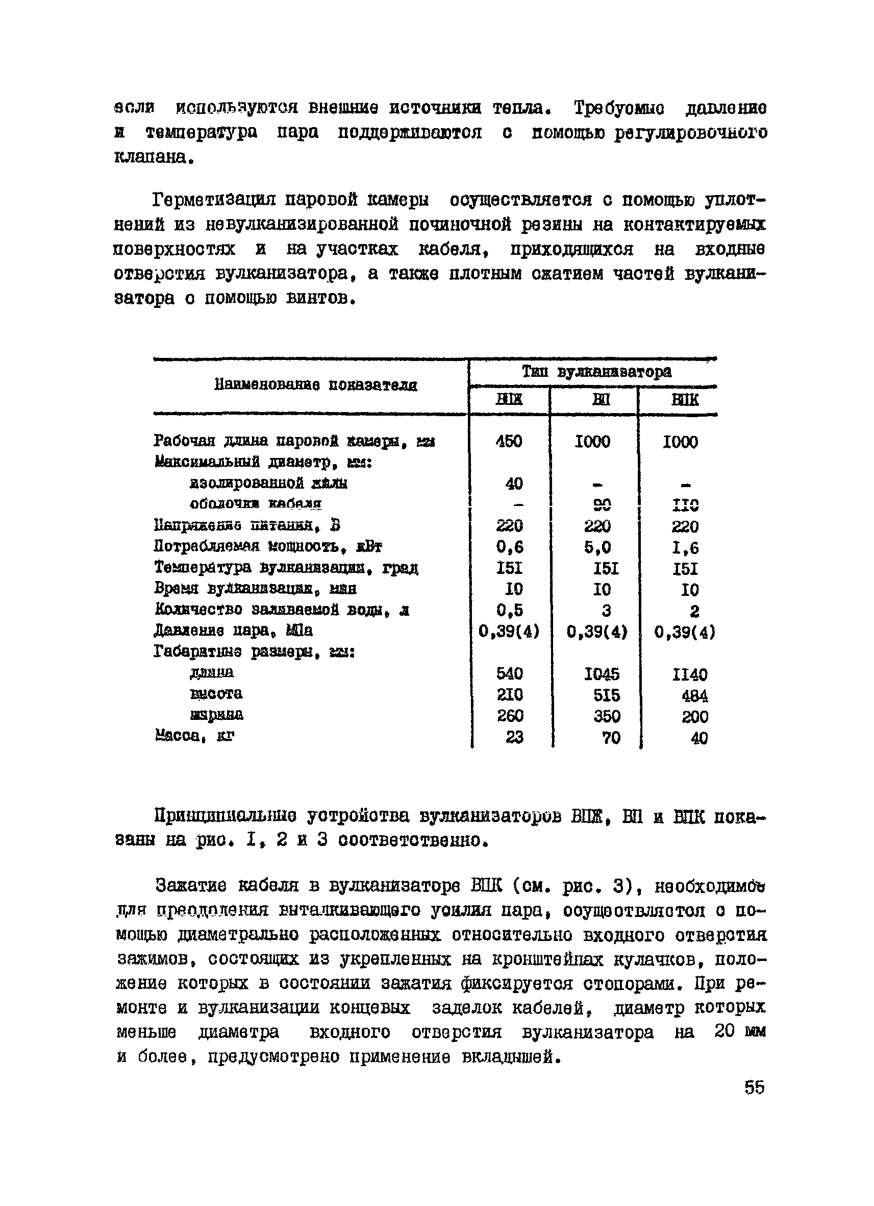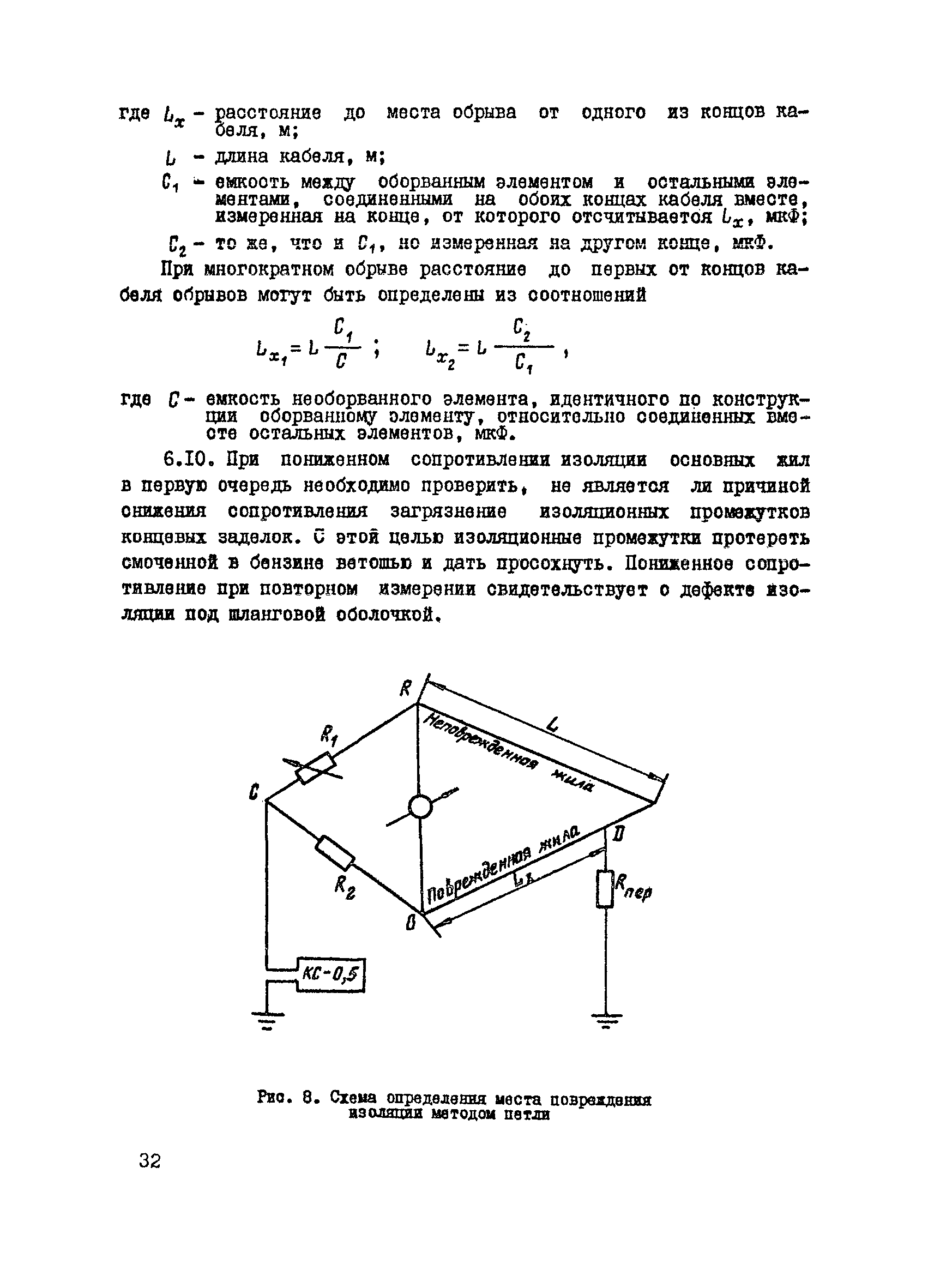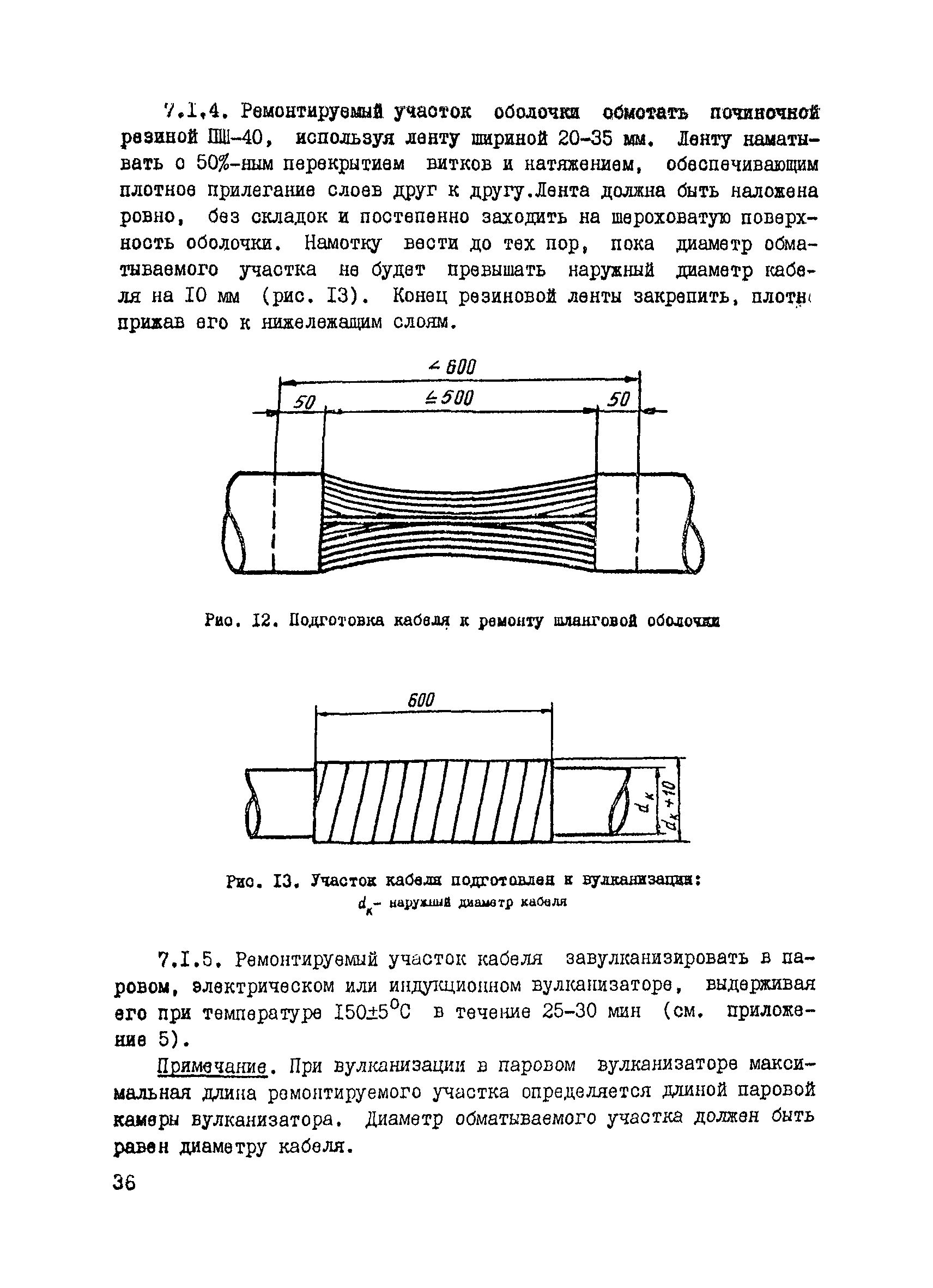 | Оглавление: | 1. Конструкция и основные технические данные кабелей марки КШНГ 2. Транспортирование и хранение кабелей 3. Меры безопасности 4. Концевые заделки кабелей 4.1. Общие требования и указания 4.2. Подготовка к работе 4.3. Порядок разделки кабеля 4.4. Порядок выполнения концевой заделки с помощью починочной резины 4.5. Порядок выполнения концевой заделки с помощью трубок из кремнийорганической резины 4.6. Порядок выполнения концевой заделки с помощью электроизоляционных гильз 4.7. Установка кабельных наконечников 5. Присоединение и эксплуатация кабелей 6. Проверка технического состояния и методы обнаружения неисправностей кабелей 7. Ремонт и соединение отрезков кабелей 7.1. Ремонт внешней оболочки и поясного экрана из электропроводящей резины 7.2. Ремонт металлического экрана основных жил кабелей типа КШНГ (на длине не более 260 мм) 7.3. Ремонт изоляции жилы 7.4. Соединение токопроводящих жил в помощью медных гильз 7.5. Соединение токопроводящих жил кабелей, наматываемых на кабельный барабан 7.6. Восстановление изоляции жил, экранов и оболочки при соединении отрезков кабеля Приложение 1 Перечень оборудования, инструмента и спецодежды, необходимых при ремонте, соединении и концевых заделках кабелей Приложение 2 Перечень материалов, необходимых для выполнения ремонта, соединений и концевых заделов кабелей Приложение 3 Нормы расхода основных материалов на выполнение 100 ремонтов для соединений кабелей КШНГ Приложение 4 Нормы расхода основных материалов на выполнение 100 концевых заделок кабелей КШНГ Приложение 5 Краткие сведения об особенностях принципа действия и эксплуатации вулканизаторов для выполнения концевых заделок ремонта и соединения гибких кабелей Приложение 6 Аппарат АШИК для испытания кабелей повышенным импульсным напряжением Подготовка кабеля к испытанию с помощью аппарата АШИК |