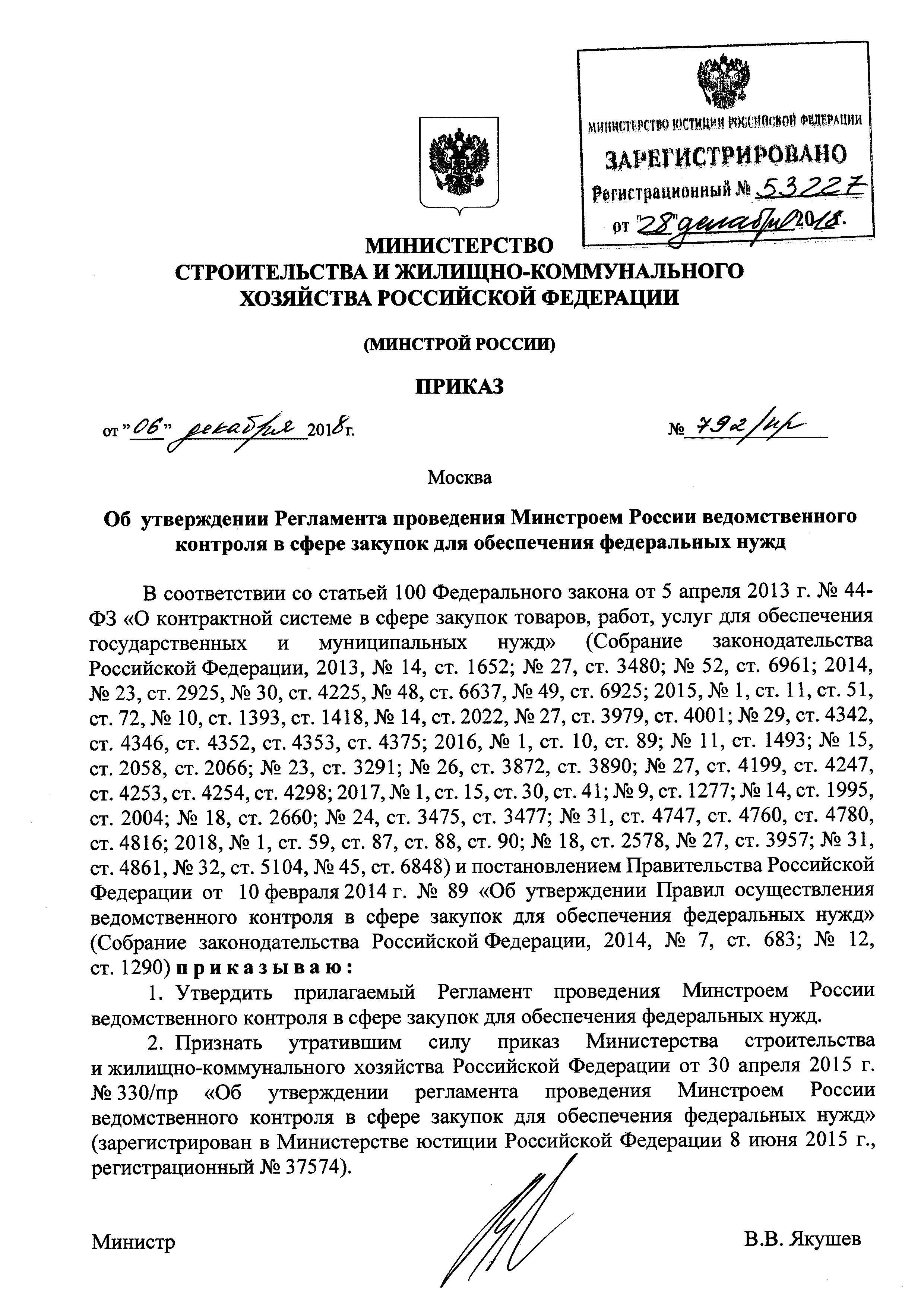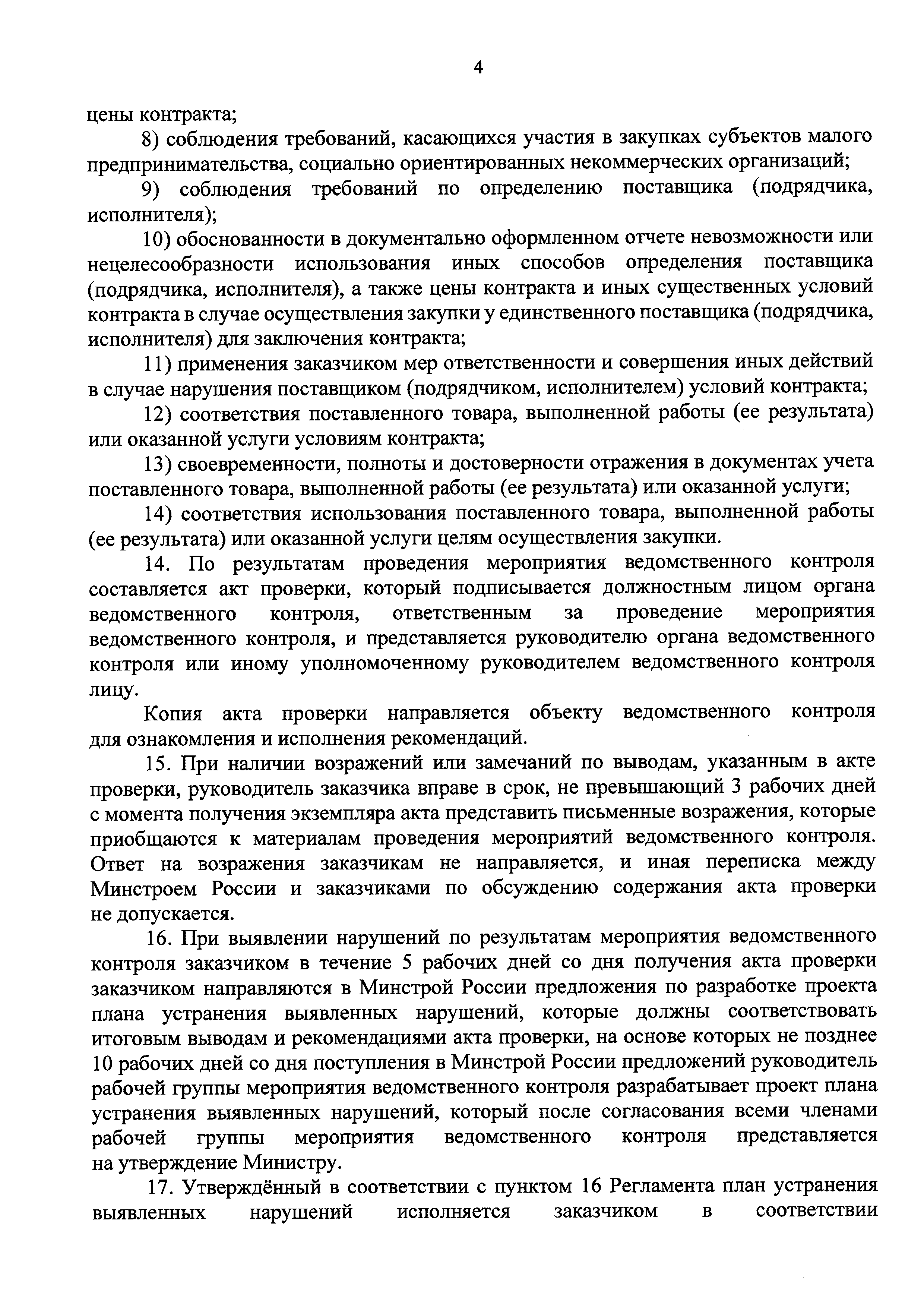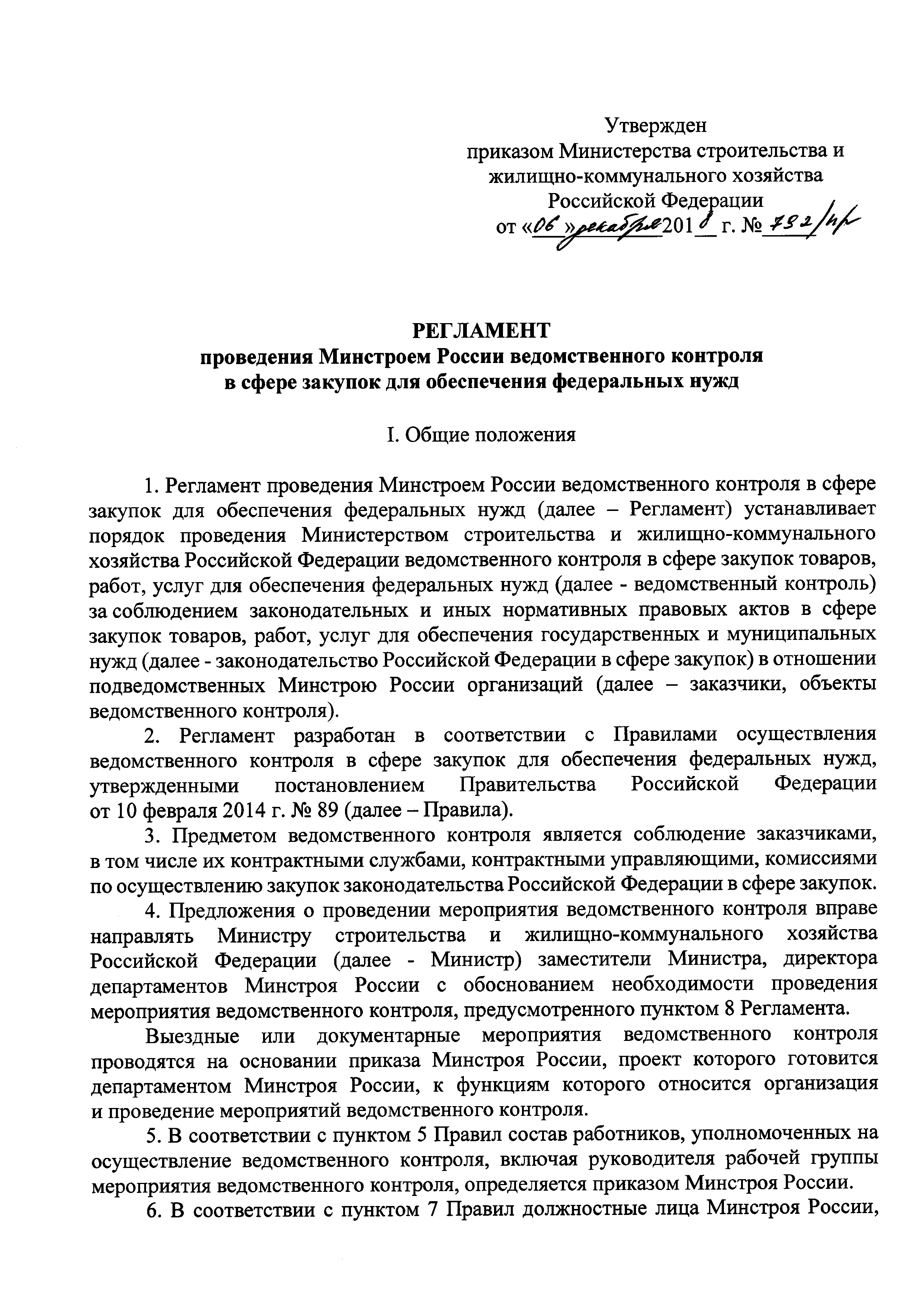 | Область применения: | Регламент устанавливает порядок проведения Министерством строительства и жилищно-коммунального хозяйства Российской Федерации ведомственного контроля в сфере закупок товаров, работ, услуг для обеспечения федеральных нужд за соблюдением законодательных и иных нормативных правовых актов в сфере закупок товаров, работ, услуг для обеспечения государственных и муниципальных нужд в отношении подведомственных Минстрою России организаций |