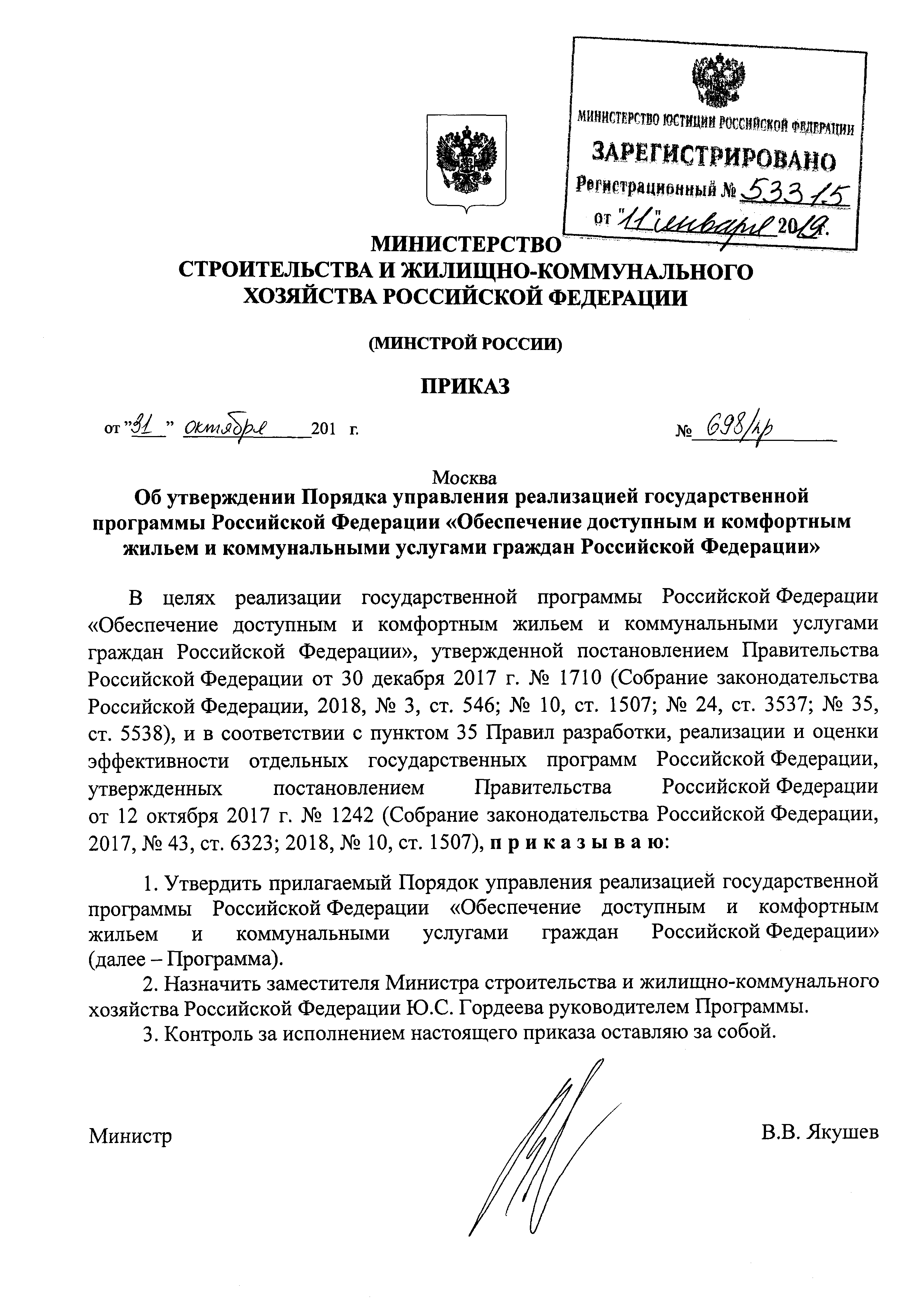 | Название рус.: | Порядок управления реализацией государственной программы Российской Федерации "Обеспечение доступным и комфортным жильем и коммунальными услугами граждан Российской Федерации" |