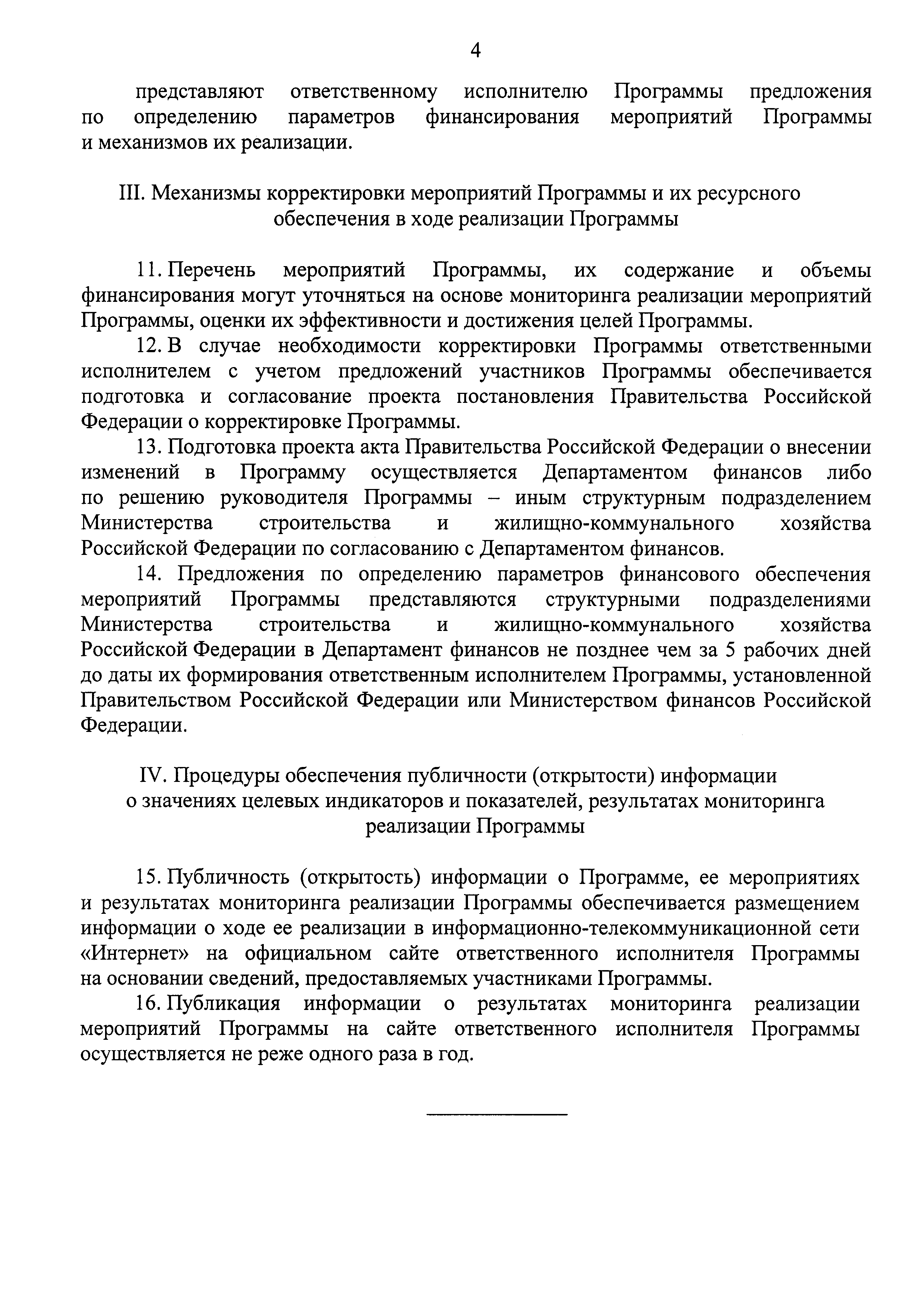 | Оглавление: | I. Общие положения II. Порядок управления Программой III. Взаимодействие ответственного исполнителя Программы, участников Программы и руководителей проектов, входящих в состав Программы III. Механизмы корректировки мероприятий Программы и их ресурсного обеспечения в ходе реализации Программы IV. Процедуры обеспечения публичности (открытости) информации о значениях целевых индикаторов и показателей, результатах мониторинга реализации Программы |
