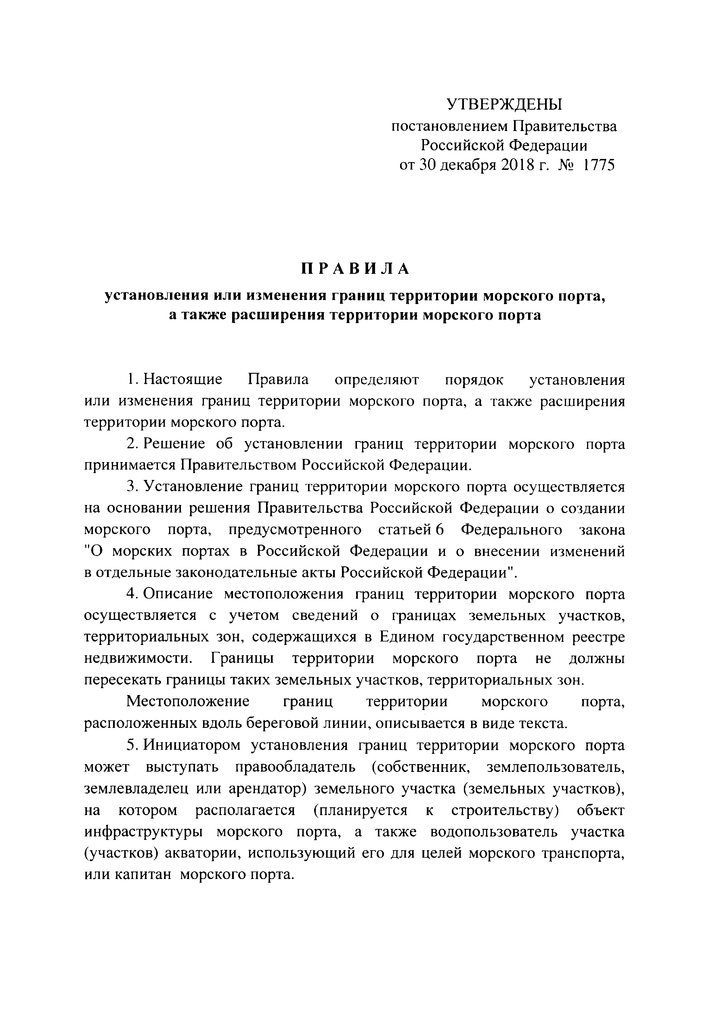 Правила установления или изменения границ территории морского порта, а также расширения территории морского порта| Статус: | действует | | Название рус.: | Правила установления или изменения границ территории морского порта, а также расширения территории морского порта | | Дата добавления в базу: | 01.02.2020 | | Дата актуализации: | 01.01.2021 | | Дата введения: | 17.01.2019 | | Утверждён: | 30.12.2018 Правительство Российской Федерации (1775)