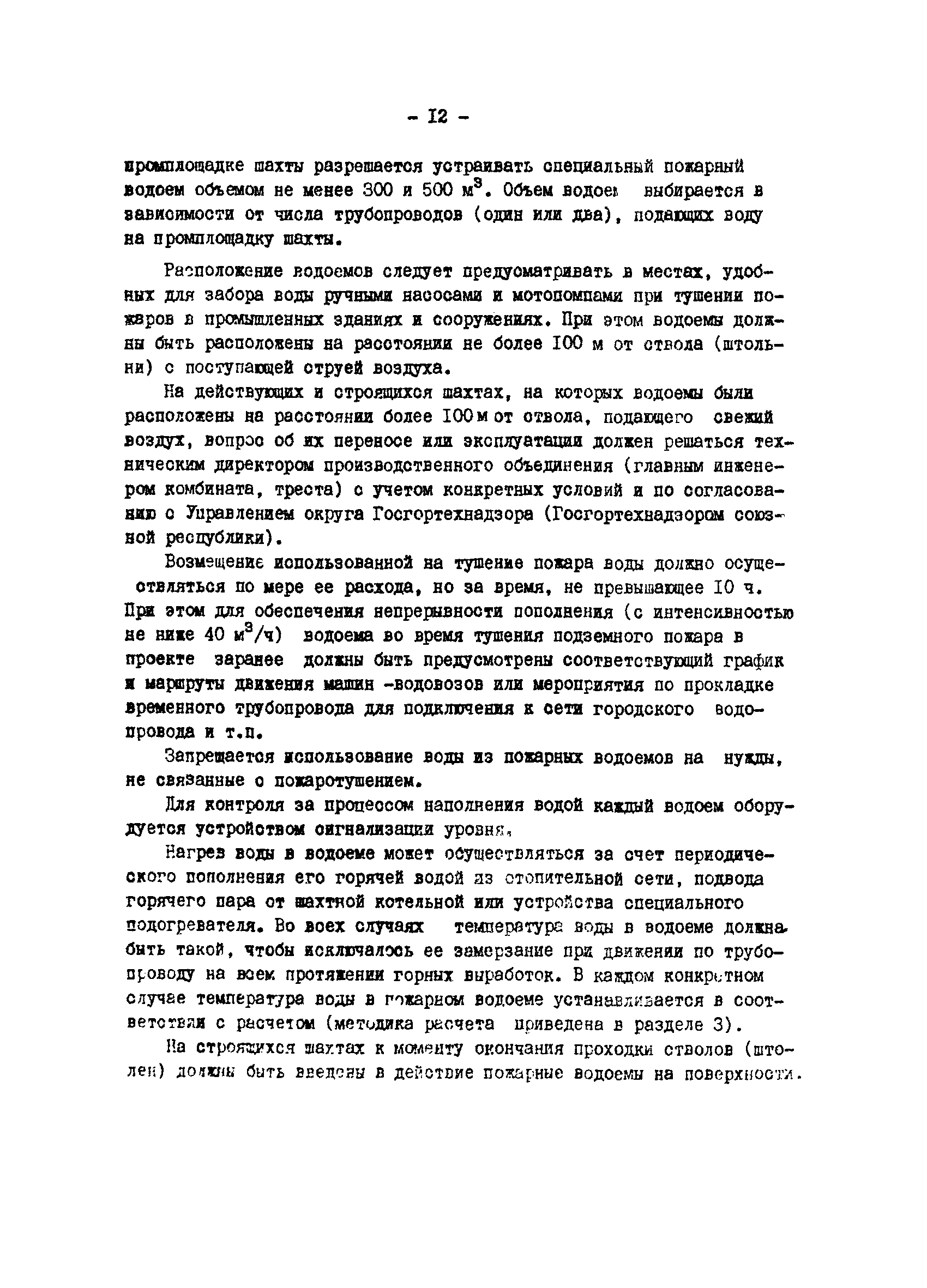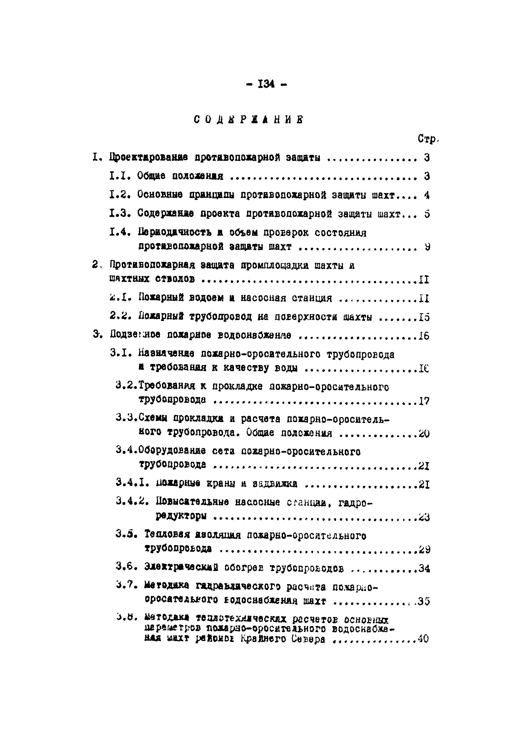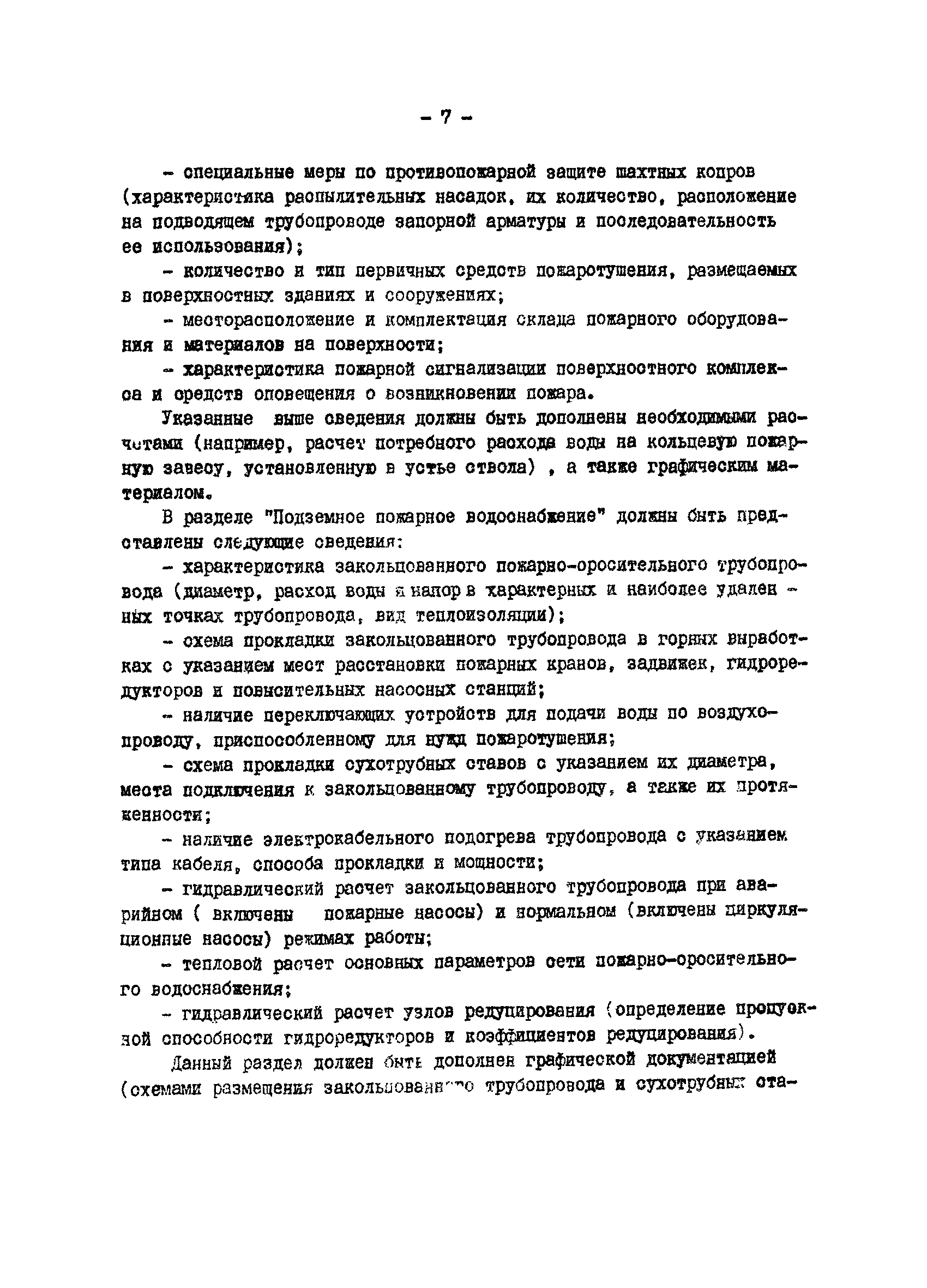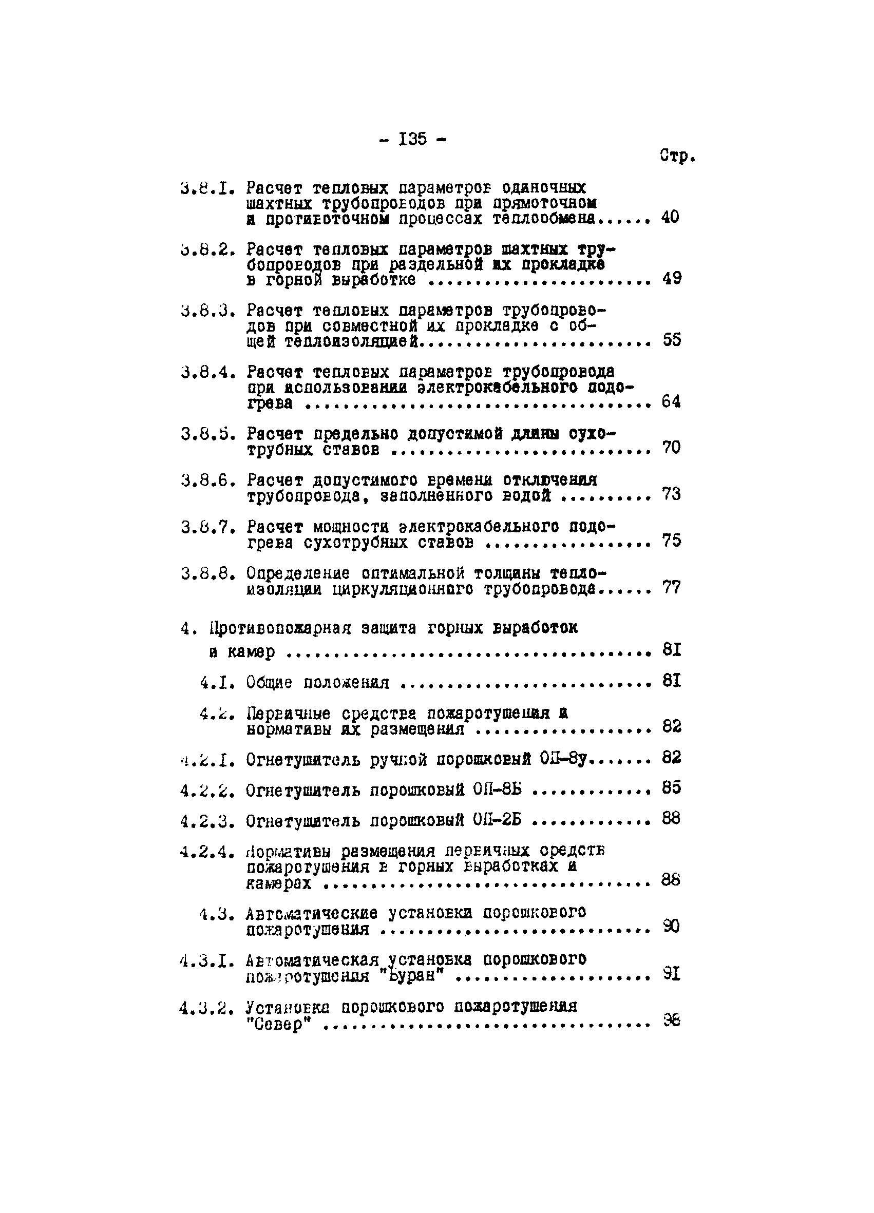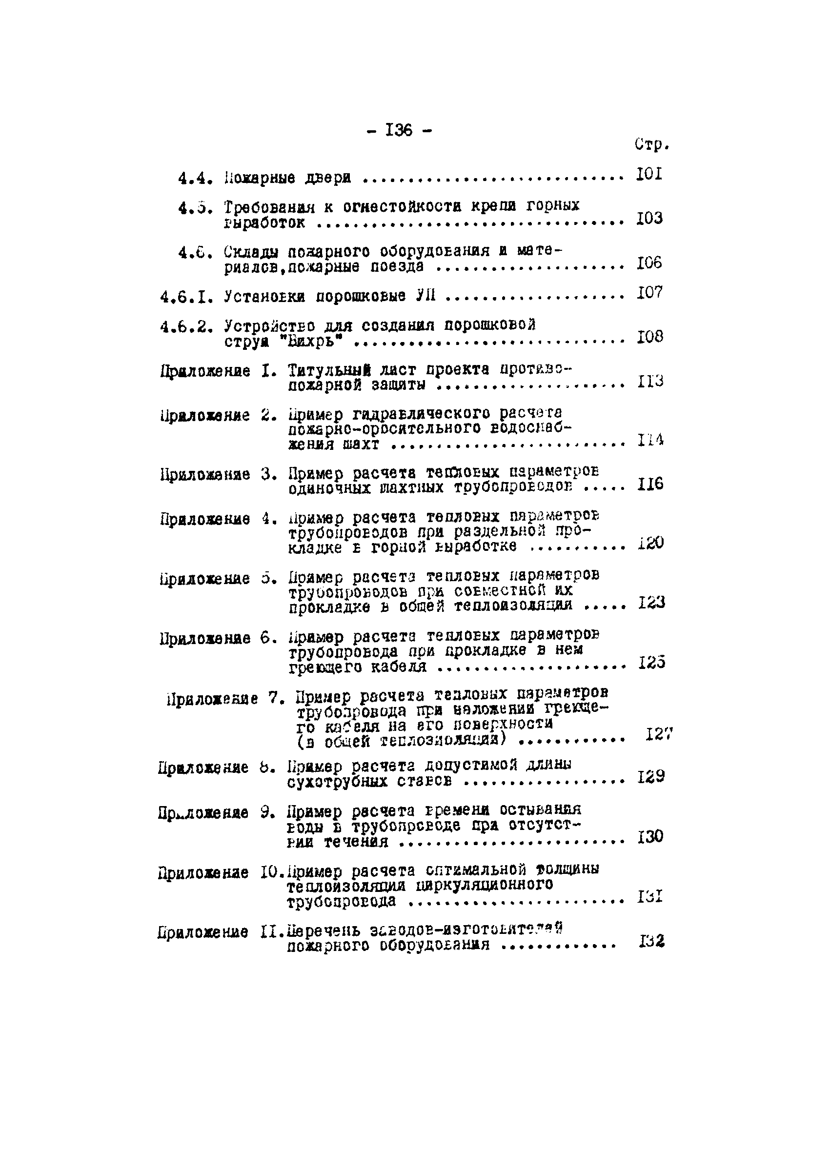 | Оглавление: | 1 Проектирование противопожарной защиты 1.1 Общие положения 1.2 Основные принципы противопожарной защиты шахт 1.3 Содержание проекта противопожарной защиты шахт 1.4 Периодичность и объем проверок состояния противопожарной защиты шахт 2 Противопожарная защита промплощадки шахты и шахтных стволов 2.1 Пожарный водоем и насосная станция 2.2 Пожарный трубопровод на поверхности шахты 3 Подземное пожарное водоснабжение 3.1 Назначение пожарно-оросительного трубопровода 3.2 Требования к прокладке пожарно-оросительного трубопровода 3.3 Схемы прокладки и расчета пожарно-оросительного трубопровода. Общие положения 3.4 Оборудование сети пожарно-оросительного трубопровода 3.4.1 Пожарные краны и задвижка 3.4.2 Повысительные нососные станции, гидроредукторы 3.5 Тепловая изоляция пожарно-оросительного трубопровода 3.6 Электрический обогрев трубопровода 3.7 Методика гидравлического расчета пожарно-оросительного водоснаюжения шахт 3.8 Методика теплотехнических расчетов основных параметров пожарно-оросительного водоснабжения шахт районов Крайнего Севера 3.8.1 Расчет тепловых параметров одиночных шахтных трубопроводов при прямоточном и противоточмом процессах теплообмена 3.8.2 Расчет тепловых параметров шахтных трубопроводов при раздельной их прокладке в горной выработке 3.8.3 Расчет тепловых параметров трубопроводов при совместной их прокладке с общей теплоизоляцией 3.8.4 Расчет тепловых параметров трубопровода при использовании электрокабельного подогрева 3.8.5 Расчет предельно допустимой длины сухотрубных ставов 3.8.6 Расчет допустимого времени отключения трубопровода, заполненного водой 3.8.7 Расчет мощности электрокабельного подогрева сухотрубных ставов 3.8.8 Определение оптимальной толщины теплоизоляции циркуляционного трубопровода 4 Противопожарная защита горных выработок и камер 4.1 Общие положения 4.2 Первичные средства пожаротушения и нормативы их размещения 4.2.1 Огнетушитель ручной порошковый ОП-8у 4.2.2 Огнетушитель порошковый ОП-8Б 4.2.3 Огнетушитель порошковый ОП-2Б 4.2.4 Нормативы размещения первичных средств пожаротушения в горных выработках и камерах 4.3 Автоматические установки порошкового пожаротушения 4.3.1 Автоматическая установка порошкового пожаротушения "Буран" 4.3.2 Установка порошкового пожаротушения "Север" 4.4 Пожарные двери 4.5 Требования к огнестойкости крепи горных выработок 4.6 Склады пожарного оборудования 4.6.1 Установки порошковые УП 4.6.2 Устройство для создания порошковой струи "Вихрь" Приложение 1. Титульный лист проекта противопожарной защиты Приложение 2. Пример гидравлического расчета пожарно-оросительного водоснабжения шахт Приложение 3. Пример расчета тепловых параметров одиночных шахтных трубопроводов Приложение 4. Пример расчета тепловых параметров трубопроводов при раздельной прокладке в горной выработке Приложение 5. Пример расчета тепловых параметров труобпроводов при совместной их прокладке в обшей теплоизоляции Приложение 6. Пример расчета тепловых параметров трубопровода при прокладке в нем греющего кабеля Приложение 7. Пример расчета тепловых параметров трубопровода при наложении греющего кабеля на его поверхности (в общей теплоизоляции) Приложение 8. Пример расчета допустимой длины сухотрубных ставов Приложение 9. Пример расчета времени остывания воды в трубопроводе при отсутстви