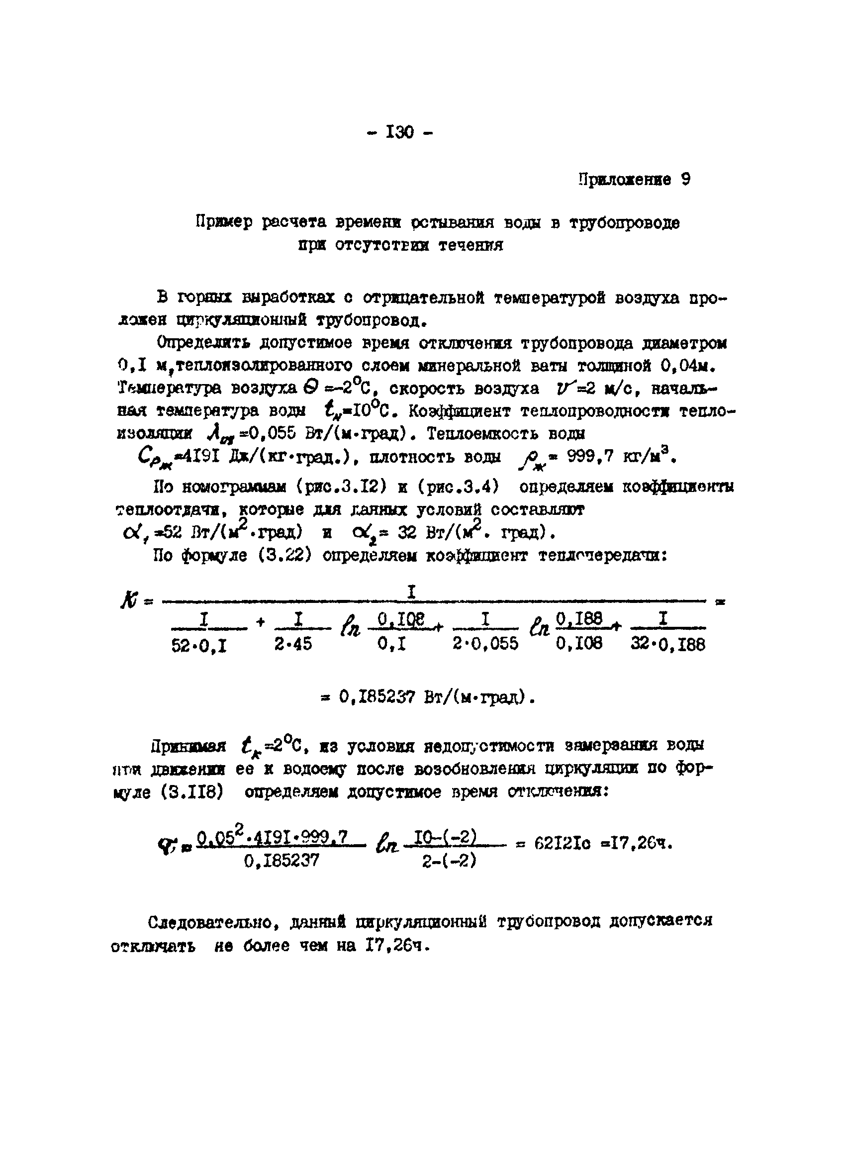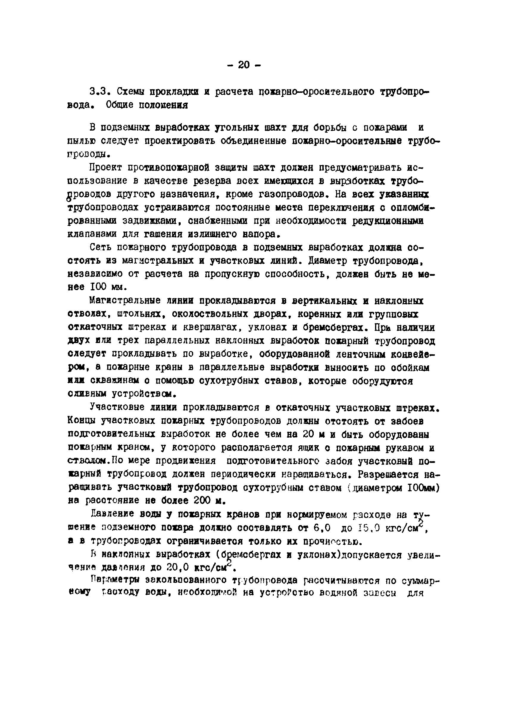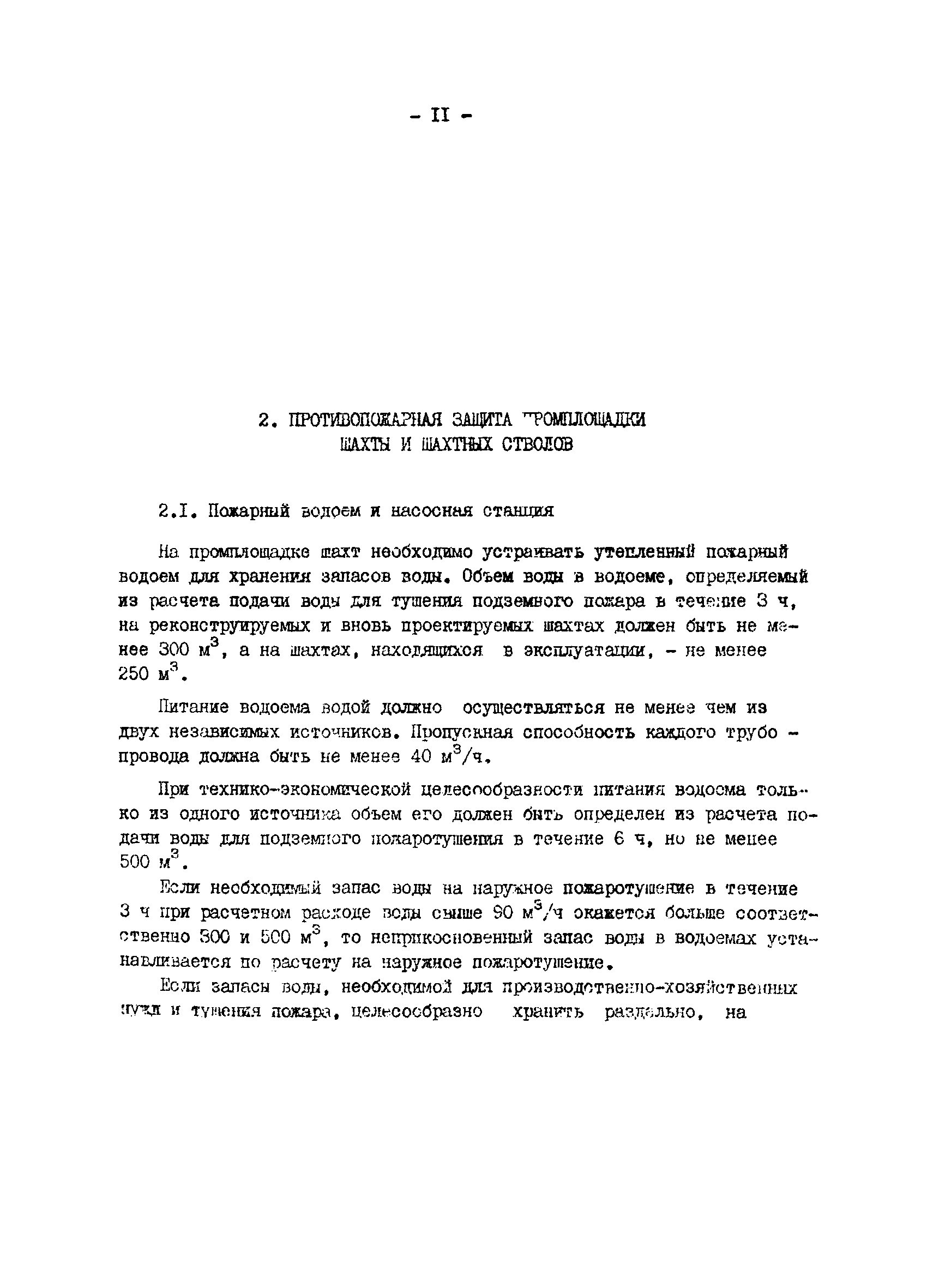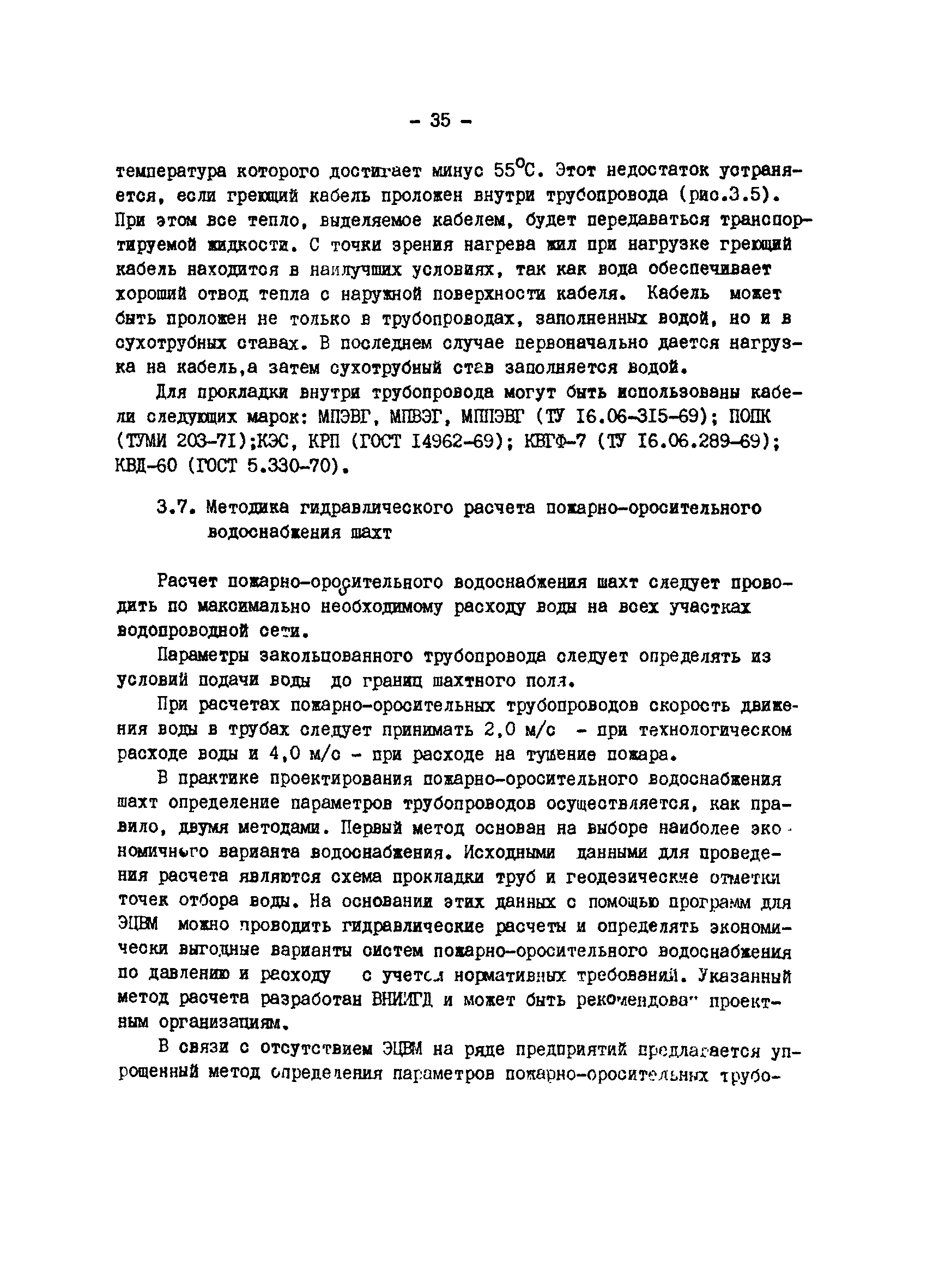 | Оглавление: | 1 Проектирование противопожарной защиты 1.1 Общие положения 1.2 Основные принципы противопожарной защиты шахт 1.3 Содержание проекта противопожарной защиты шахт 1.4 Периодичность и объем проверок состояния противопожарной защиты шахт 2 Противопожарная защита промплощадки шахты и шахтных стволов 2.1 Пожарный водоем и насосная станция 2.2 Пожарный трубопровод на поверхности шахты 3 Подземное пожарное водоснабжение 3.1 Назначение пожарно-оросительного трубопровода 3.2 Требования к прокладке пожарно-оросительного трубопровода 3.3 Схемы прокладки и расчета пожарно-оросительного трубопровода. Общие положения 3.4 Оборудование сети пожарно-оросительного трубопровода 3.4.1 Пожарные краны и задвижка 3.4.2 Повысительные нососные станции, гидроредукторы 3.5 Тепловая изоляция пожарно-оросительного трубопровода 3.6 Электрический обогрев трубопровода 3.7 Методика гидравлического расчета пожарно-оросительного водоснаюжения шахт 3.8 Методика теплотехнических расчетов основных параметров пожарно-оросительного водоснабжения шахт районов Крайнего Севера 3.8.1 Расчет тепловых параметров одиночных шахтных трубопроводов при прямоточном и противоточмом процессах теплообмена 3.8.2 Расчет тепловых параметров шахтных трубопроводов при раздельной их прокладке в горной выработке 3.8.3 Расчет тепловых параметров трубопроводов при совместной их прокладке с общей теплоизоляцией 3.8.4 Расчет тепловых параметров трубопровода при использовании электрокабельного подогрева 3.8.5 Расчет предельно допустимой длины сухотрубных ставов 3.8.6 Расчет допустимого времени отключения трубопровода, заполненного водой 3.8.7 Расчет мощности электрокабельного подогрева сухотрубных ставов 3.8.8 Определение оптимальной толщины теплоизоляции циркуляционного трубопровода 4 Противопожарная защита горных выработок и камер 4.1 Общие положения 4.2 Первичные средства пожаротушения и нормативы их размещения 4.2.1 Огнетушитель ручной порошковый ОП-8у 4.2.2 Огнетушитель порошковый ОП-8Б 4.2.3 Огнетушитель порошковый ОП-2Б 4.2.4 Нормативы размещения первичных средств пожаротушения в горных выработках и камерах 4.3 Автоматические установки порошкового пожаротушения 4.3.1 Автоматическая установка порошкового пожаротушения "Буран" 4.3.2 Установка порошкового пожаротушения "Север" 4.4 Пожарные двери 4.5 Требования к огнестойкости крепи горных выработок 4.6 Склады пожарного оборудования 4.6.1 Установки порошковые УП 4.6.2 Устройство для создания порошковой струи "Вихрь" Приложение 1. Титульный лист проекта противопожарной защиты Приложение 2. Пример гидравлического расчета пожарно-оросительного водоснабжения шахт Приложение 3. Пример расчета тепловых параметров одиночных шахтных трубопроводов Приложение 4. Пример расчета тепловых параметров трубопроводов при раздельной прокладке в горной выработке Приложение 5. Пример расчета тепловых параметров труобпроводов при совместной их прокладке в обшей теплоизоляции Приложение 6. Пример расчета тепловых параметров трубопровода при прокладке в нем греющего кабеля Приложение 7. Пример расчета тепловых параметров трубопровода при наложении греющего кабеля на его поверхности (в общей теплоизоляции) Приложение 8. Пример расчета допустимой длины сухотрубных ставов Приложение 9. Пример расчета времени остывания воды в трубопроводе при отсутстви