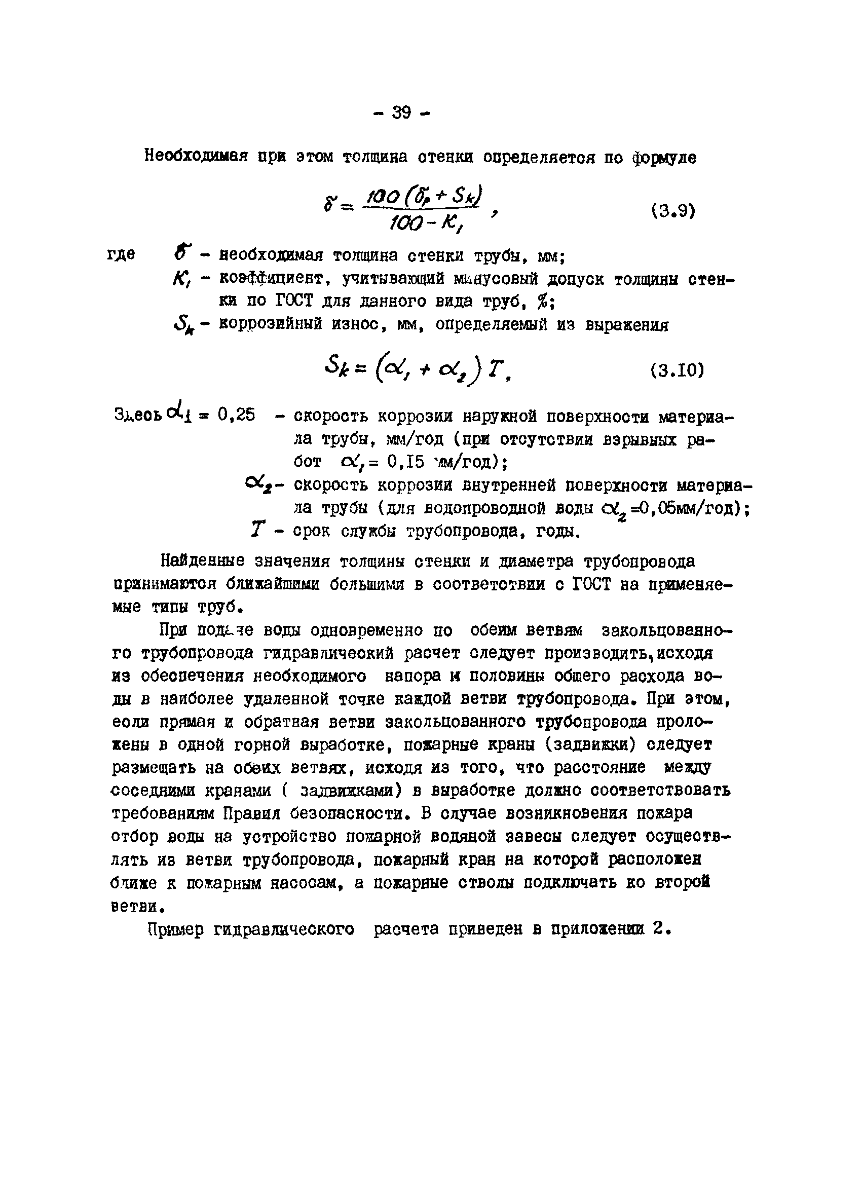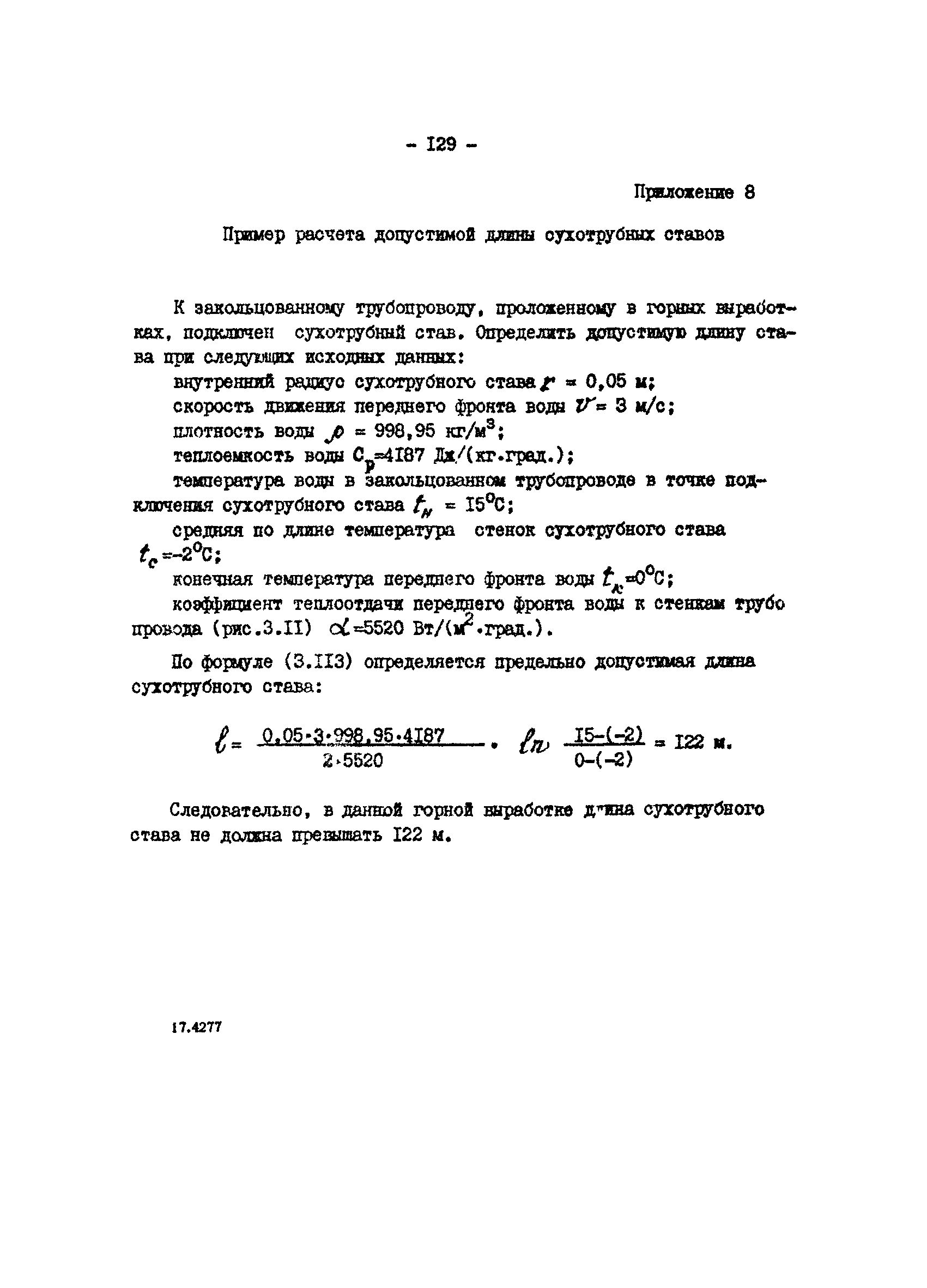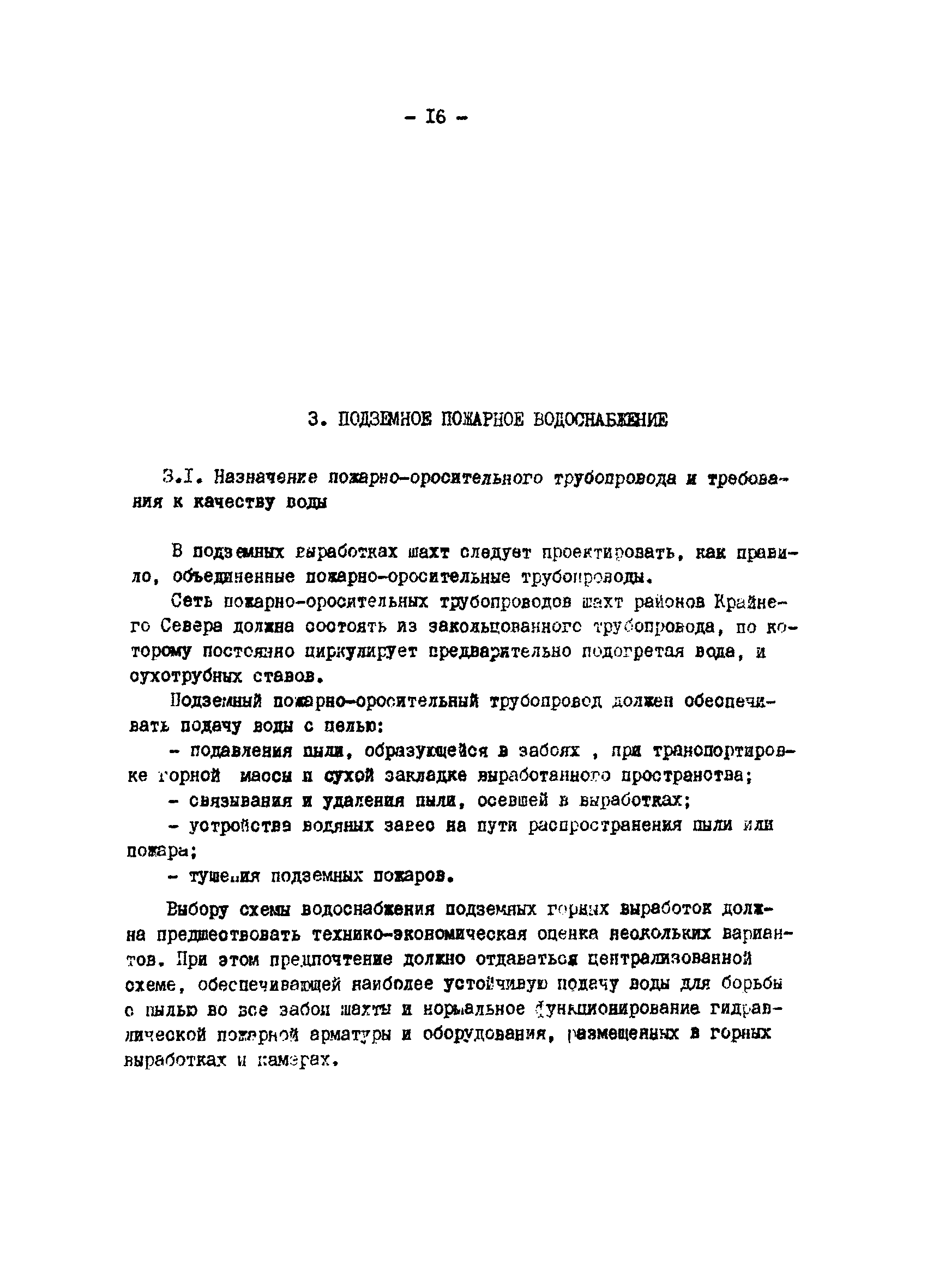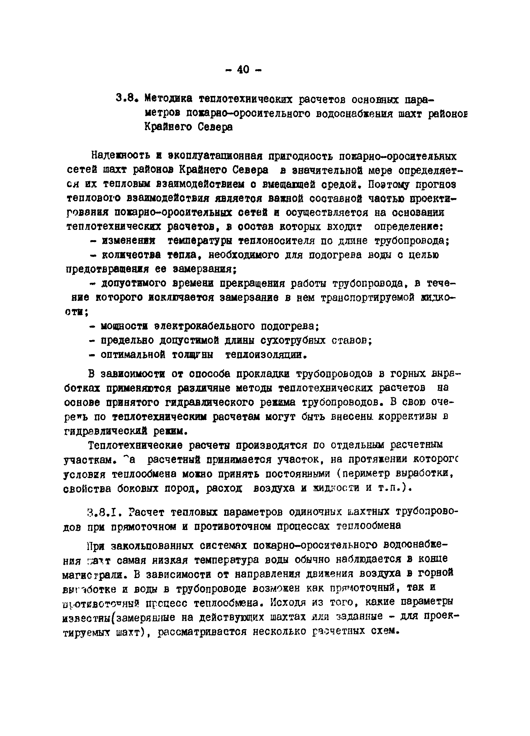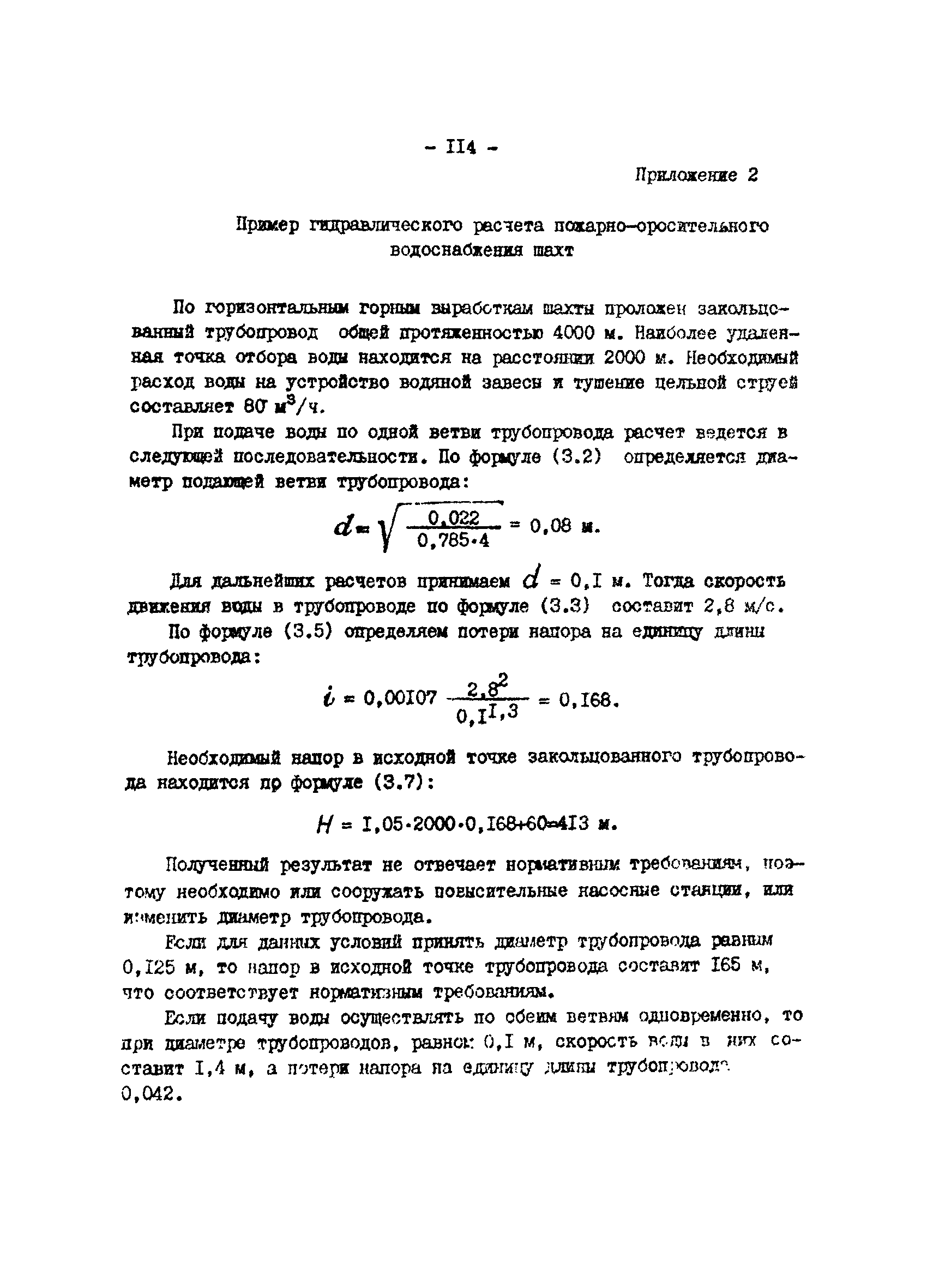 | Оглавление: | 1 Проектирование противопожарной защиты 1.1 Общие положения 1.2 Основные принципы противопожарной защиты шахт 1.3 Содержание проекта противопожарной защиты шахт 1.4 Периодичность и объем проверок состояния противопожарной защиты шахт 2 Противопожарная защита промплощадки шахты и шахтных стволов 2.1 Пожарный водоем и насосная станция 2.2 Пожарный трубопровод на поверхности шахты 3 Подземное пожарное водоснабжение 3.1 Назначение пожарно-оросительного трубопровода 3.2 Требования к прокладке пожарно-оросительного трубопровода 3.3 Схемы прокладки и расчета пожарно-оросительного трубопровода. Общие положения 3.4 Оборудование сети пожарно-оросительного трубопровода 3.4.1 Пожарные краны и задвижка 3.4.2 Повысительные нососные станции, гидроредукторы 3.5 Тепловая изоляция пожарно-оросительного трубопровода 3.6 Электрический обогрев трубопровода 3.7 Методика гидравлического расчета пожарно-оросительного водоснаюжения шахт 3.8 Методика теплотехнических расчетов основных параметров пожарно-оросительного водоснабжения шахт районов Крайнего Севера 3.8.1 Расчет тепловых параметров одиночных шахтных трубопроводов при прямоточном и противоточмом процессах теплообмена 3.8.2 Расчет тепловых параметров шахтных трубопроводов при раздельной их прокладке в горной выработке 3.8.3 Расчет тепловых параметров трубопроводов при совместной их прокладке с общей теплоизоляцией 3.8.4 Расчет тепловых параметров трубопровода при использовании электрокабельного подогрева 3.8.5 Расчет предельно допустимой длины сухотрубных ставов 3.8.6 Расчет допустимого времени отключения трубопровода, заполненного водой 3.8.7 Расчет мощности электрокабельного подогрева сухотрубных ставов 3.8.8 Определение оптимальной толщины теплоизоляции циркуляционного трубопровода 4 Противопожарная защита горных выработок и камер 4.1 Общие положения 4.2 Первичные средства пожаротушения и нормативы их размещения 4.2.1 Огнетушитель ручной порошковый ОП-8у 4.2.2 Огнетушитель порошковый ОП-8Б 4.2.3 Огнетушитель порошковый ОП-2Б 4.2.4 Нормативы размещения первичных средств пожаротушения в горных выработках и камерах 4.3 Автоматические установки порошкового пожаротушения 4.3.1 Автоматическая установка порошкового пожаротушения "Буран" 4.3.2 Установка порошкового пожаротушения "Север" 4.4 Пожарные двери 4.5 Требования к огнестойкости крепи горных выработок 4.6 Склады пожарного оборудования 4.6.1 Установки порошковые УП 4.6.2 Устройство для создания порошковой струи "Вихрь" Приложение 1. Титульный лист проекта противопожарной защиты Приложение 2. Пример гидравлического расчета пожарно-оросительного водоснабжения шахт Приложение 3. Пример расчета тепловых параметров одиночных шахтных трубопроводов Приложение 4. Пример расчета тепловых параметров трубопроводов при раздельной прокладке в горной выработке Приложение 5. Пример расчета тепловых параметров труобпроводов при совместной их прокладке в обшей теплоизоляции Приложение 6. Пример расчета тепловых параметров трубопровода при прокладке в нем греющего кабеля Приложение 7. Пример расчета тепловых параметров трубопровода при наложении греющего кабеля на его поверхности (в общей теплоизоляции) Приложение 8. Пример расчета допустимой длины сухотрубных ставов Приложение 9. Пример расчета времени остывания воды в трубопроводе при отсутстви