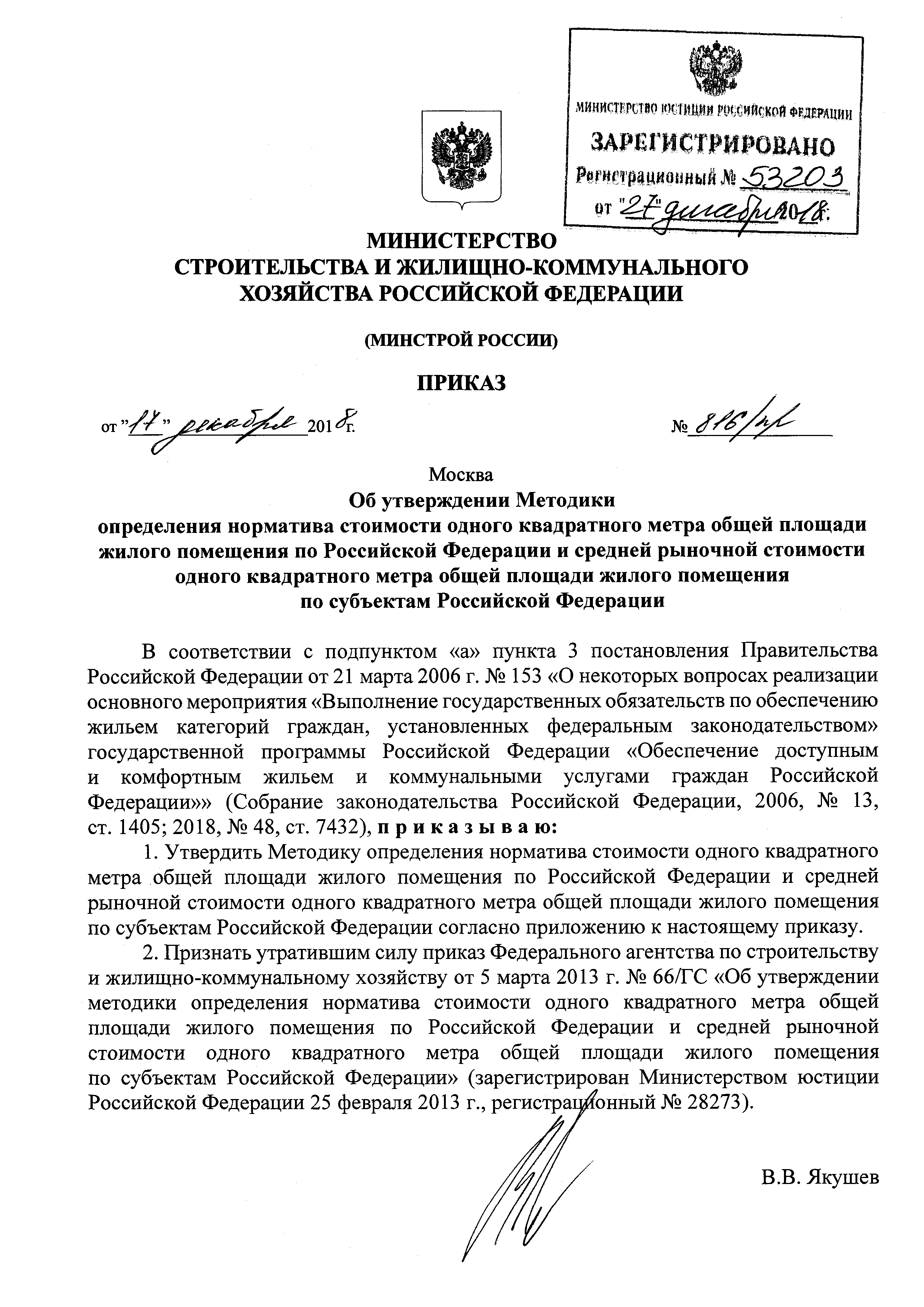 | Заменяет собой: | - Приказ 66/ГС от 05.03.2013 г. «Об утверждении Методики определения норматива стоимости одного квадратного метра общей площади жилого помещения по Российской Федерации и средней рыночной стоимости одного квадратного метра общей площади жилого помещения по субъектам Российской Федерации»