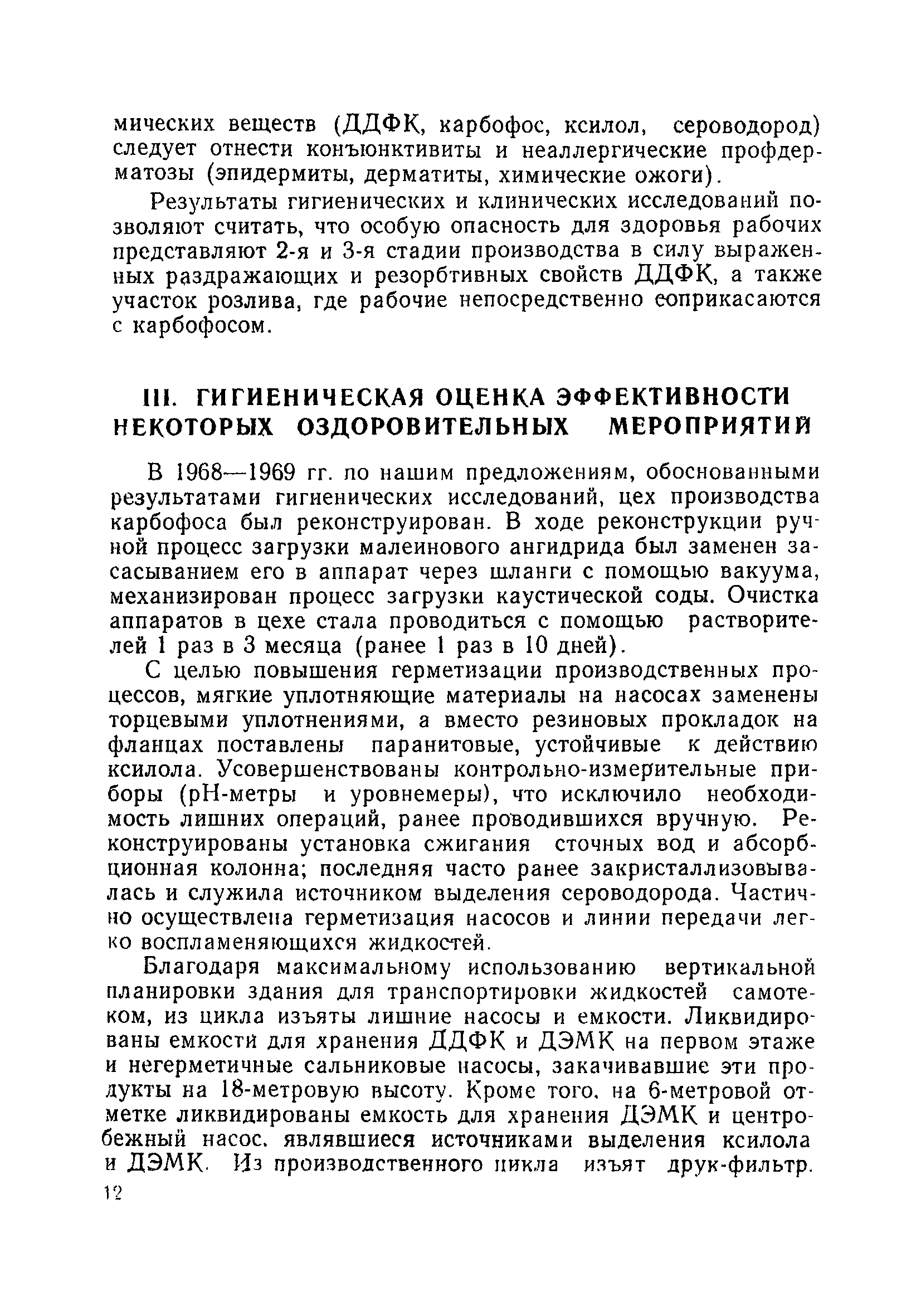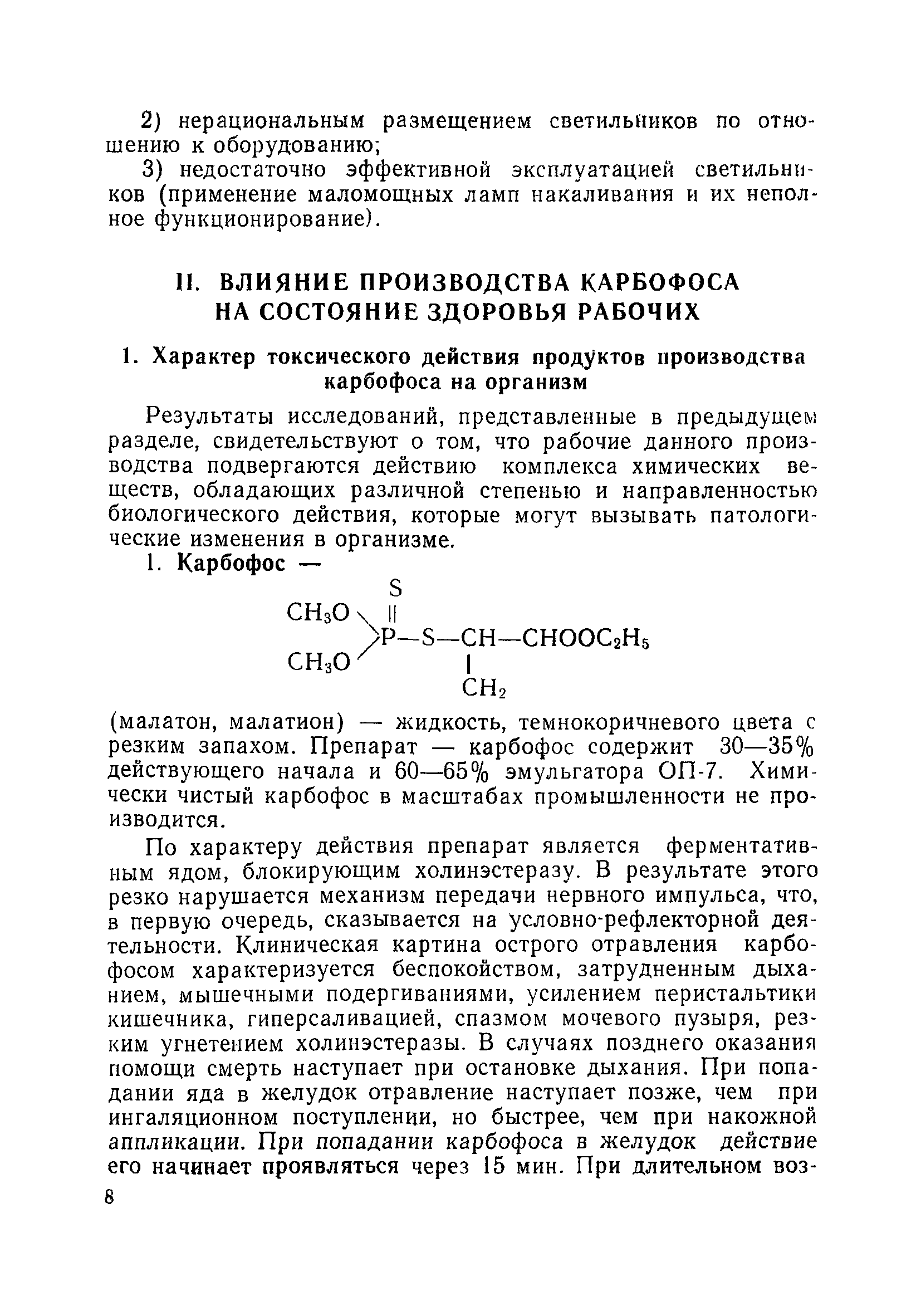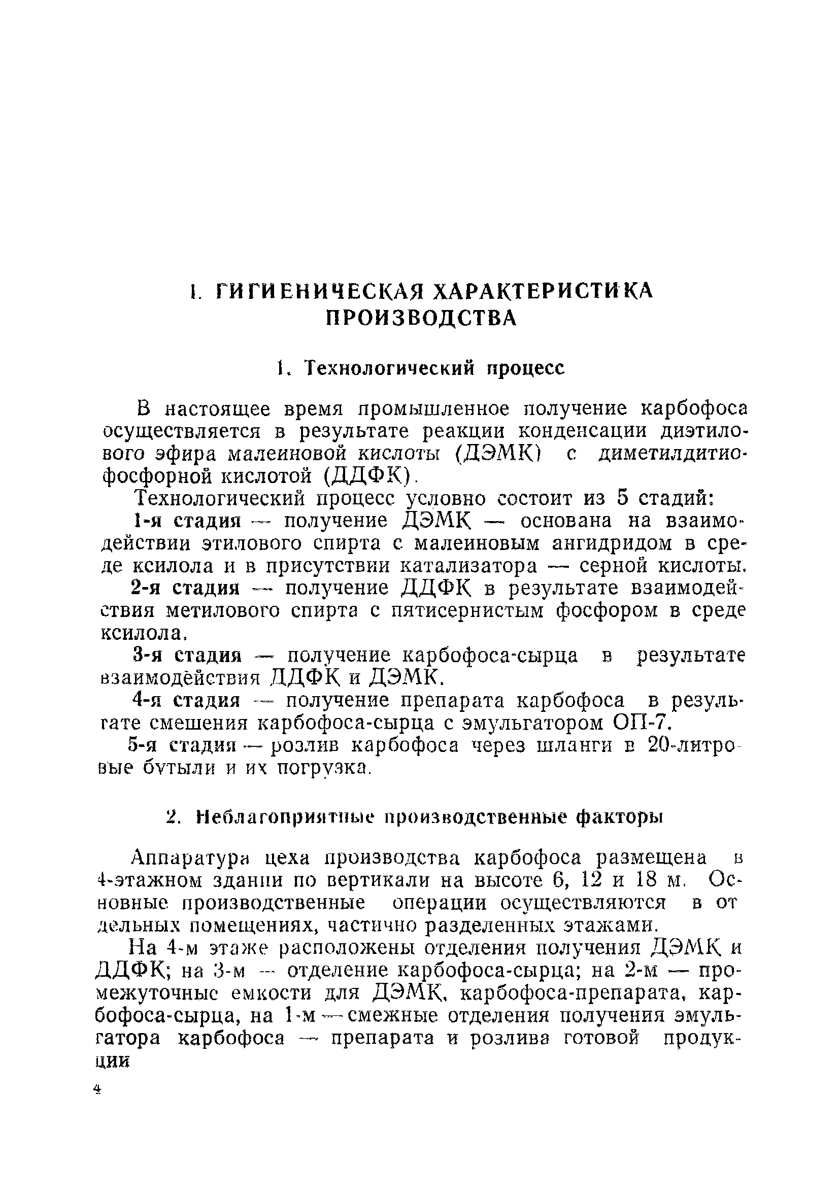 | Оглавление: | I Гигиеническая характеристика производства 1 Технологический процесс 2 Неблагоприятные производственные факторы II Влияние производства карбофоса на состояние здоровья рабочих 1 Характер токсического действия продуктов производства карбофоса на организм 2 Клиническая картина при хроническом воздействии комплекса профессиональных вредностей III Гигиеническая оценка эффективности некоторых оздоровительных мероприятий Мероприятия по оздоровлению условий труда |
