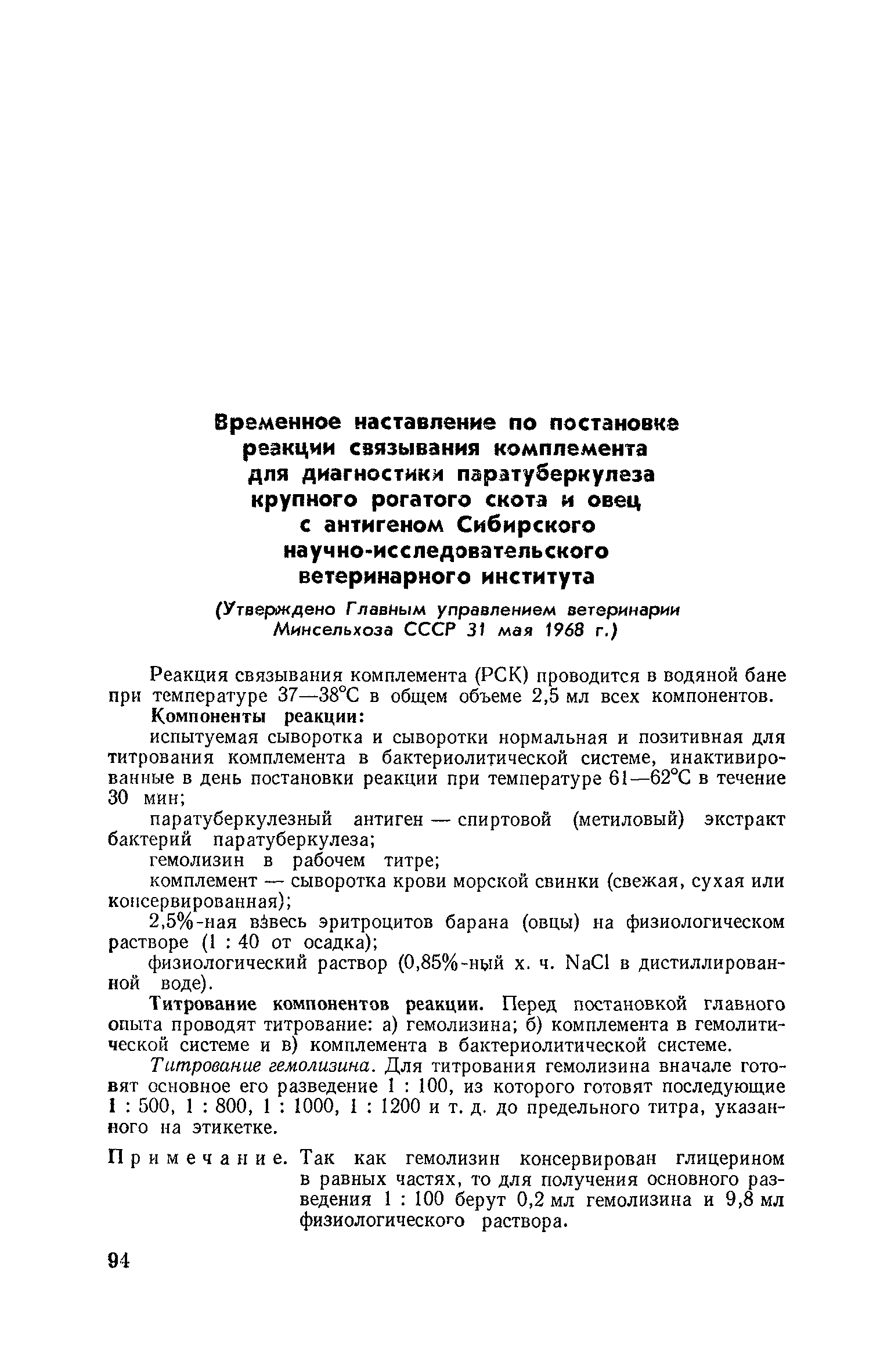 | Название рус.: | Временное наставление по постановке реакции связывания комплемента для диагностики паратуберкулеза крупного рогатого скота и овец с антигеном Сибирского научно-исследовательского ветеринарного института |