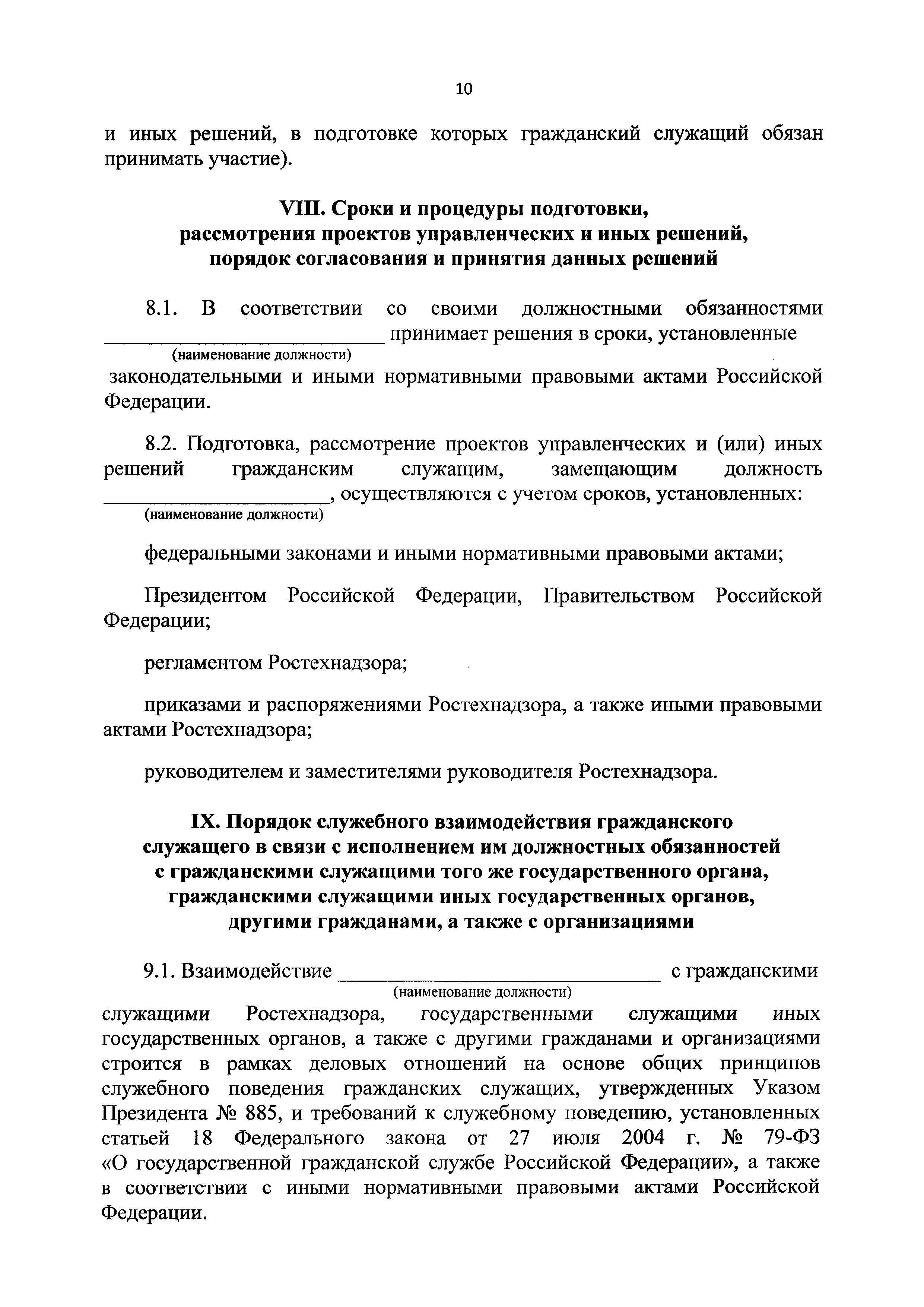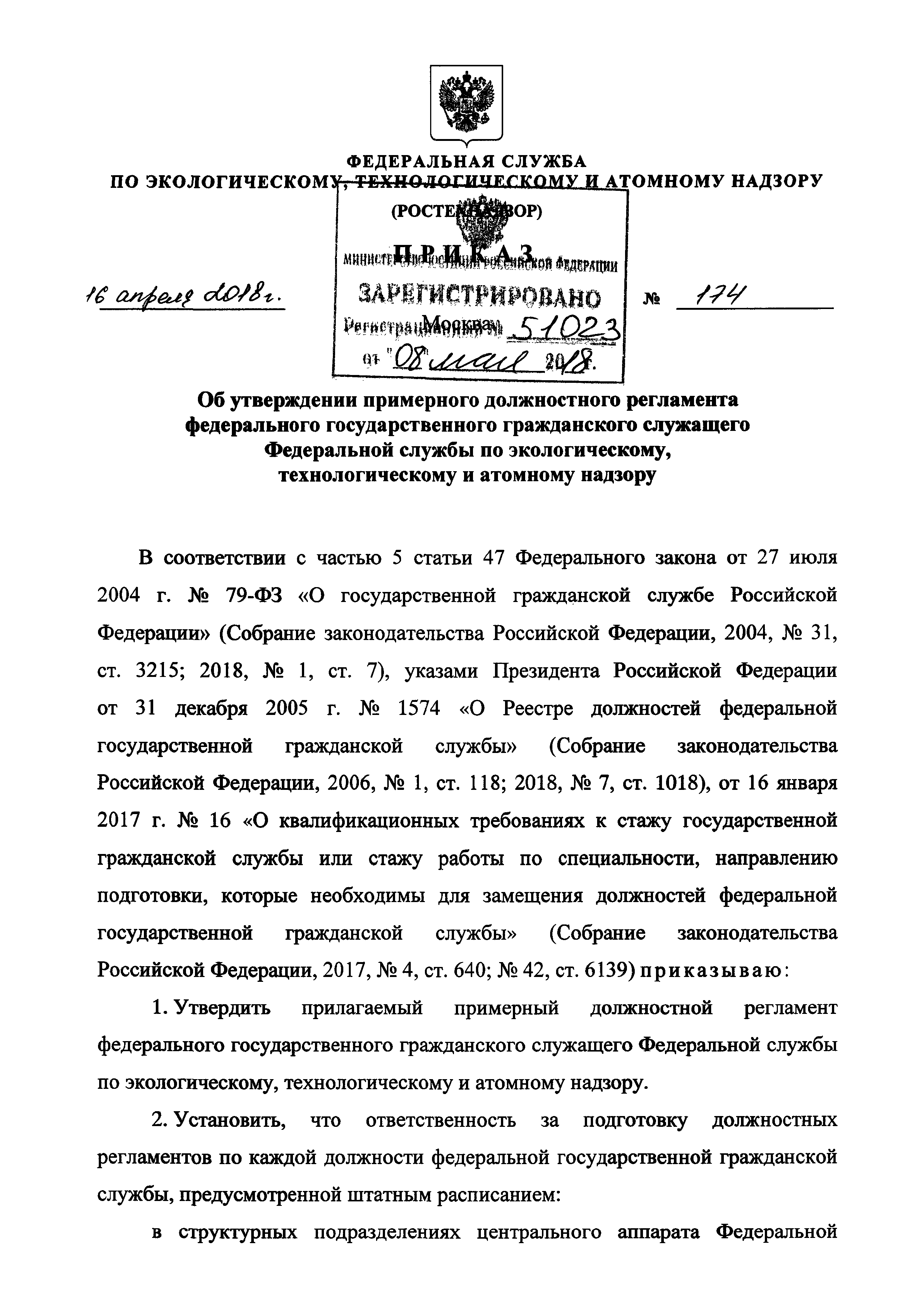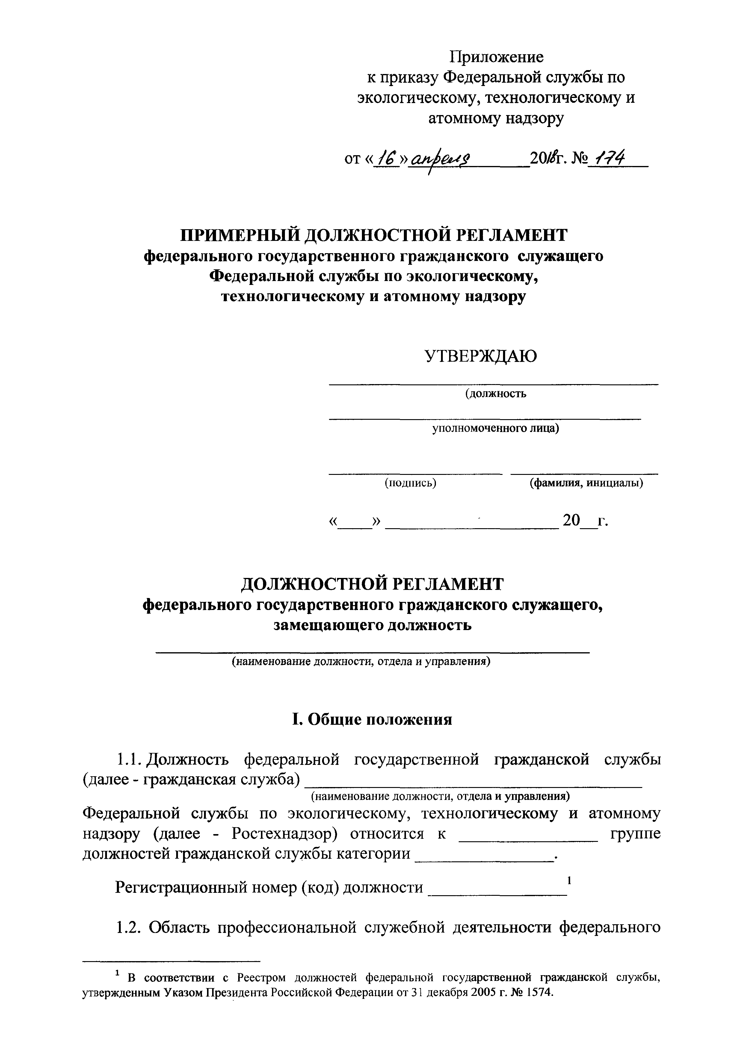 | | Заменяет собой: | - «Примерные должностные регламенты федеральных государственных гражданских служащих Федеральной службы по экологическому, технологическому и атомному надзору»