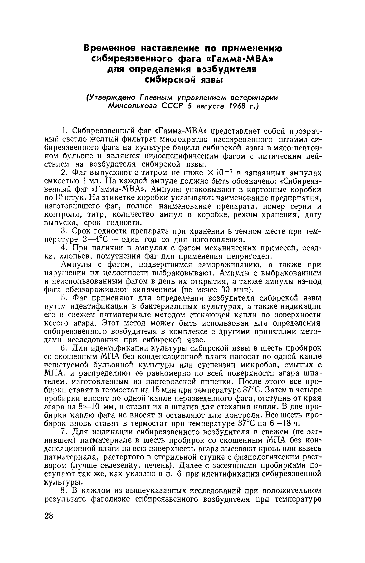 Временное наставление по применению сибиреязвенного фага "Гамма-МВА" для определения возбудителя сибирской язвы| Статус: | не действует | | Название рус.: | Временное наставление по применению сибиреязвенного фага "Гамма-МВА" для определения возбудителя сибирской язвы | | Дата добавления в базу: | 01.02.2020 | | Дата актуализации: | 01.01.2021 | | Область применения: | Документ предназначен для ветврачей и фельдшеров, лаборантов ветеринарных лабораторий. | | Утверждён: | 05.08.1968 Главное управление ветеринарии Министерства сельского хозяйства СССР