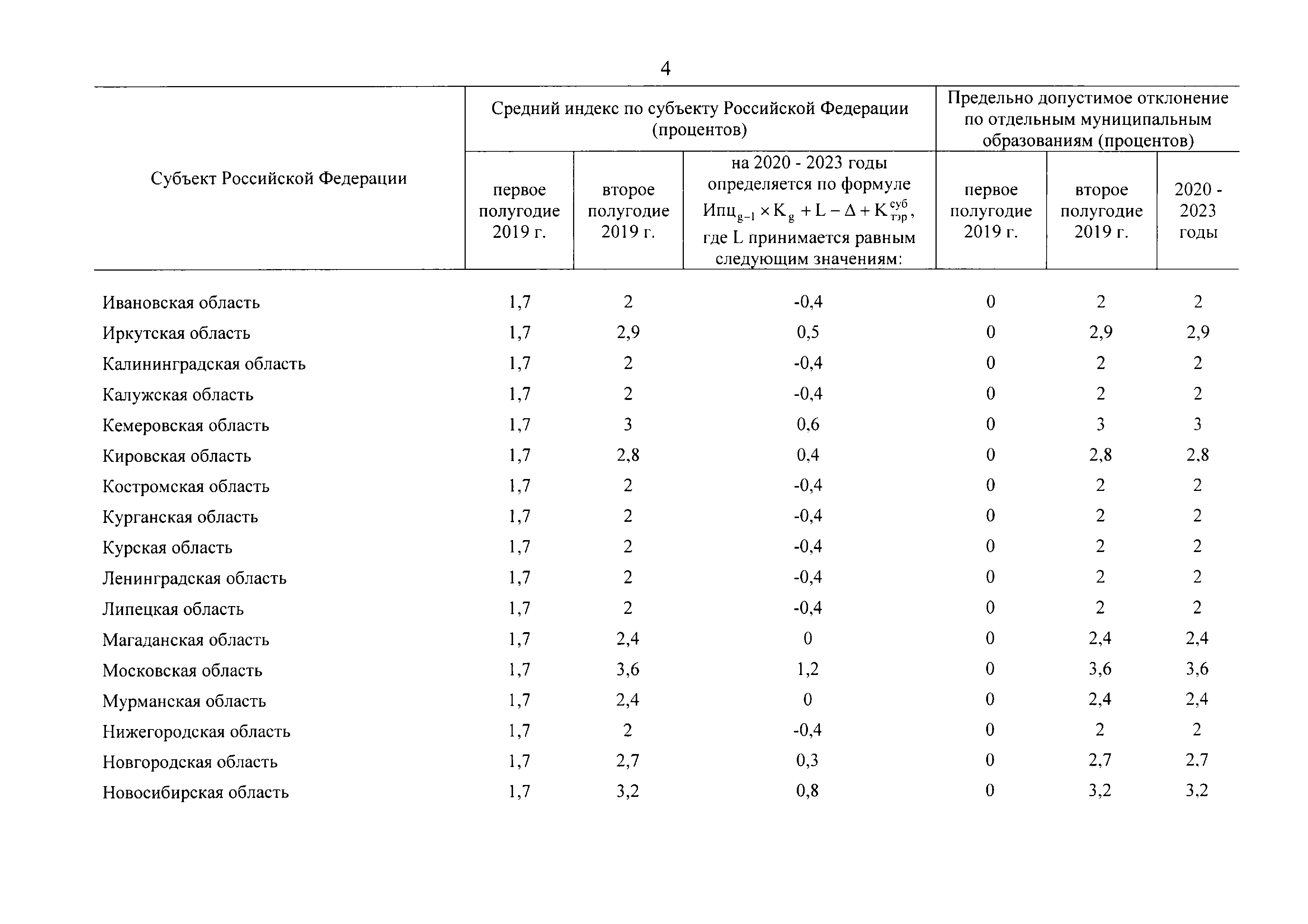 | Название рус.: | Индексы изменения размера вносимой гражданами платы за коммунальные услуги в среднем по субъектам Российской Федерации и предельно допустимые отклонения по отдельным муниципальным образованиям от величины указанных индексов на 2019 - 2023 годы |