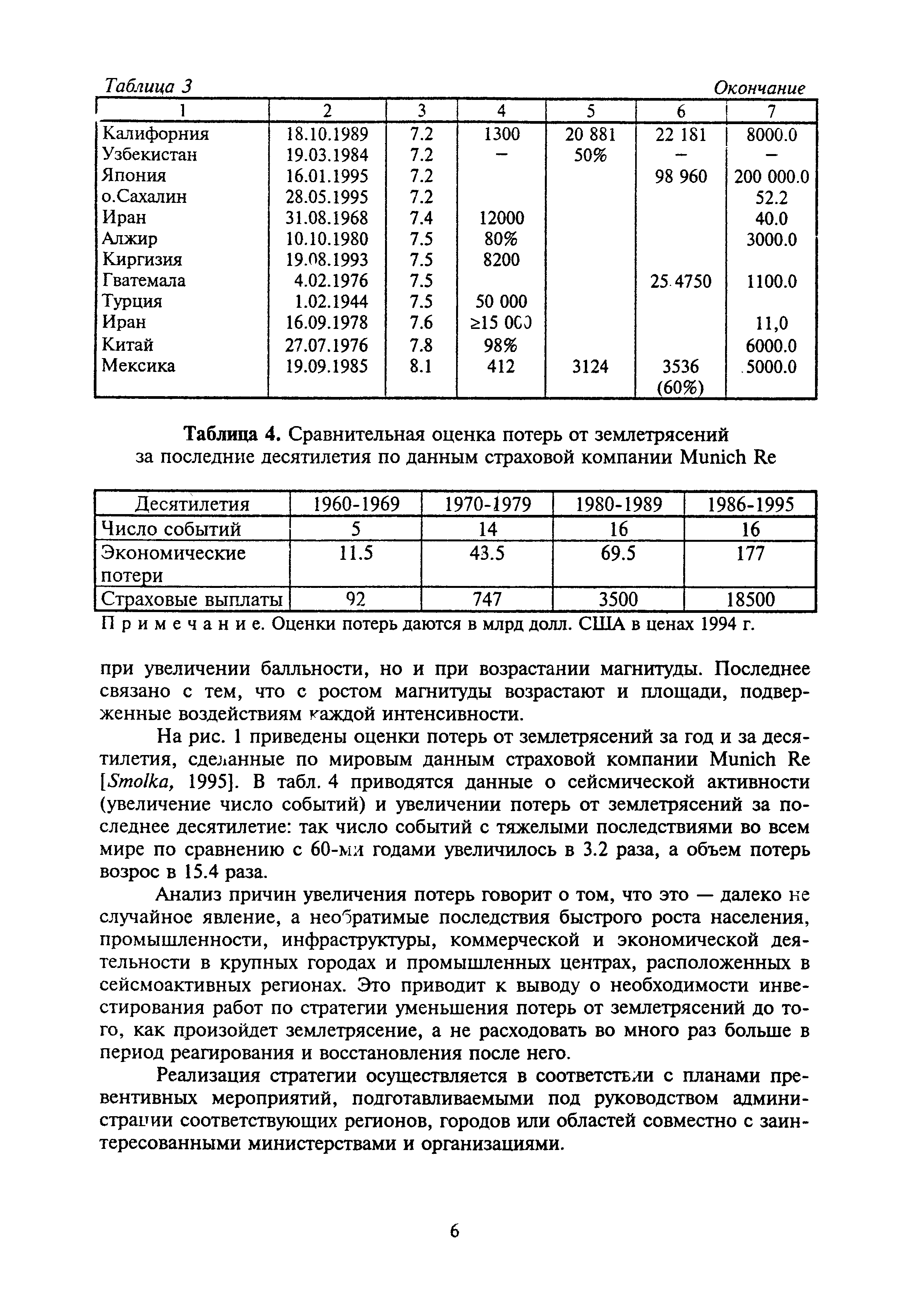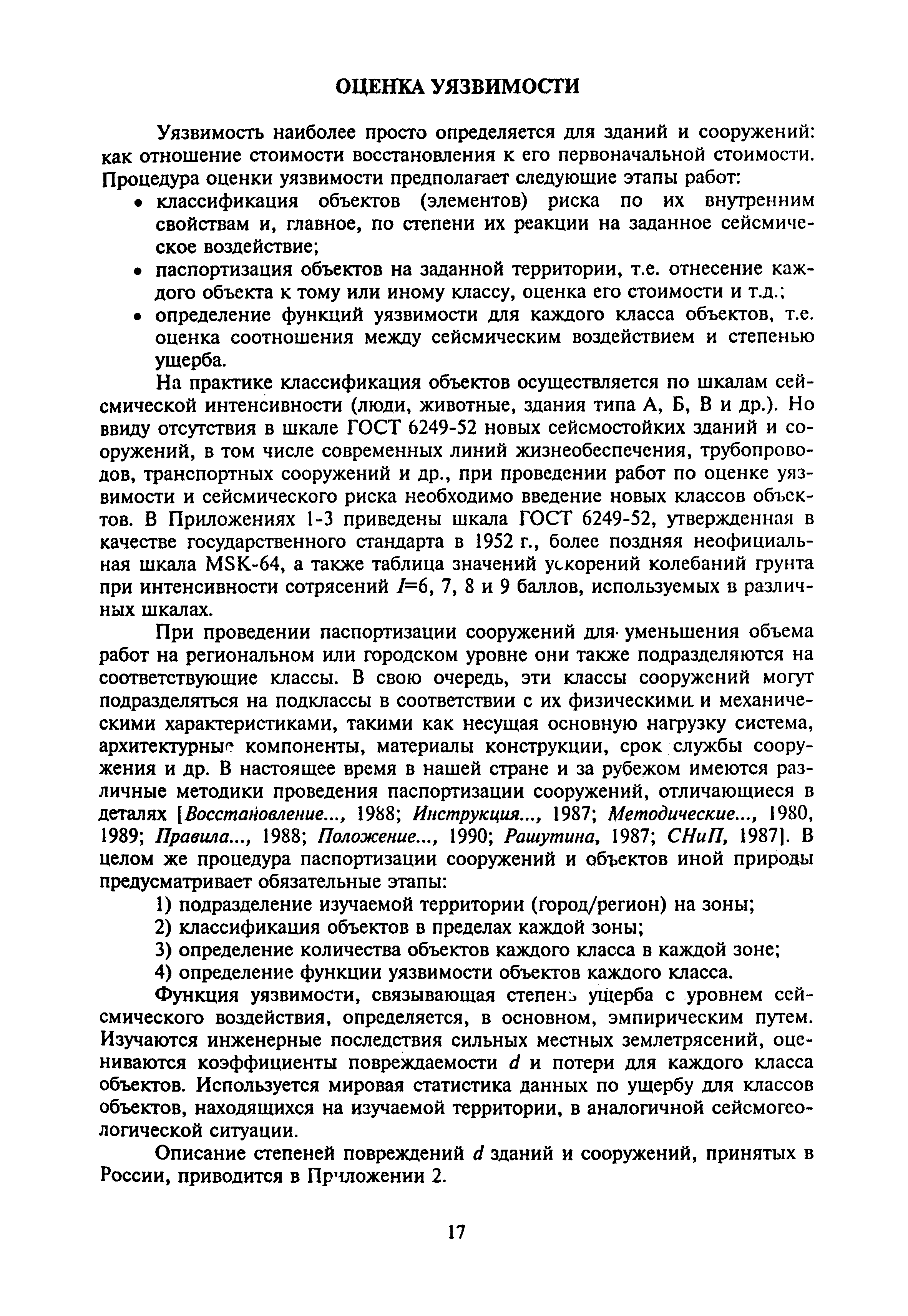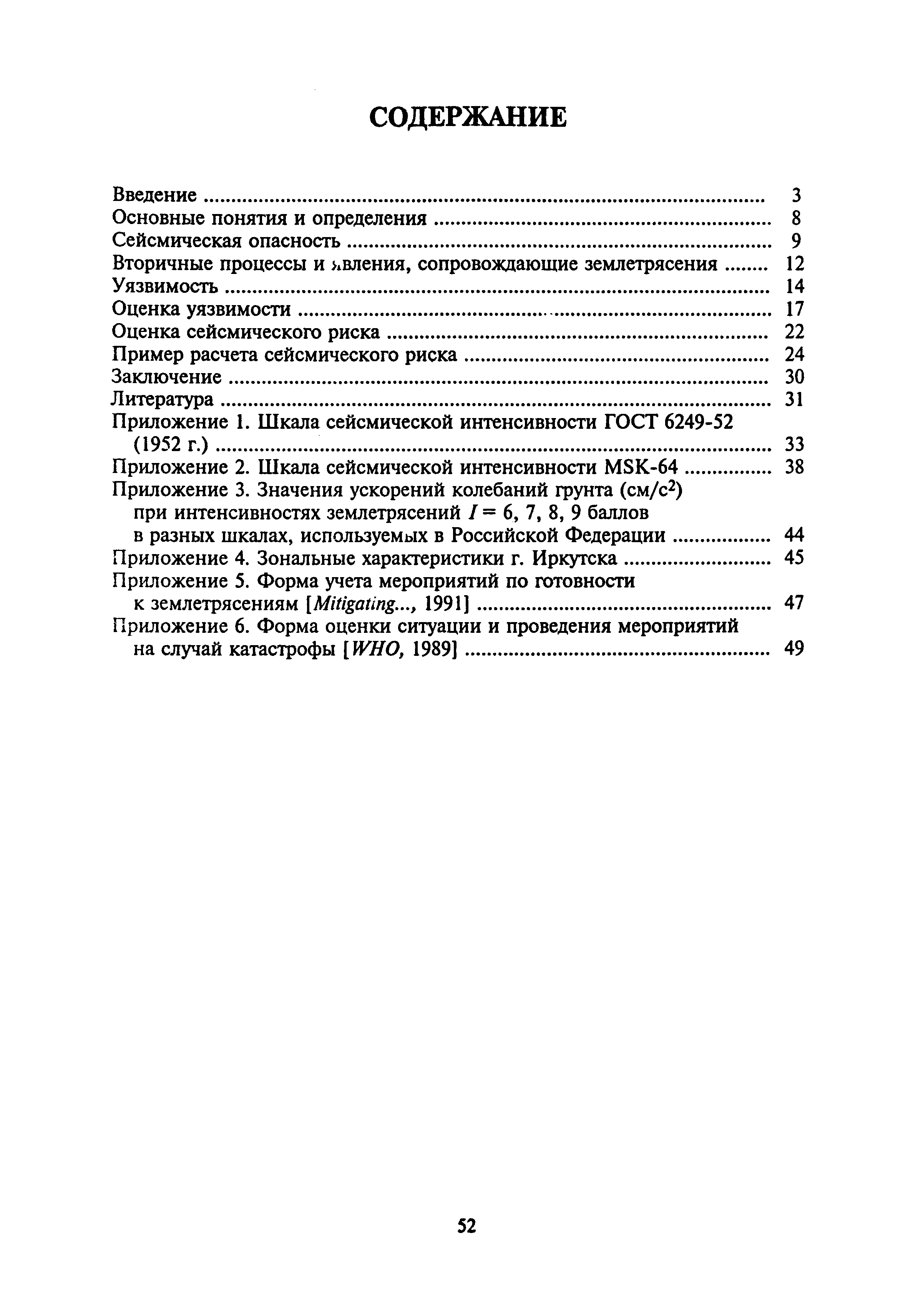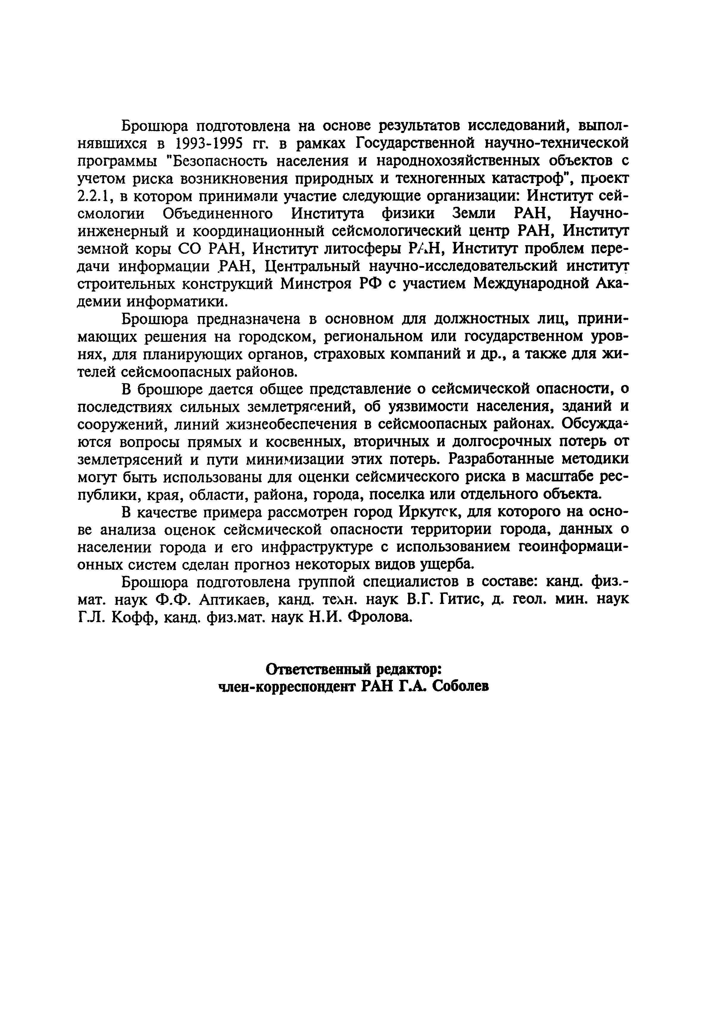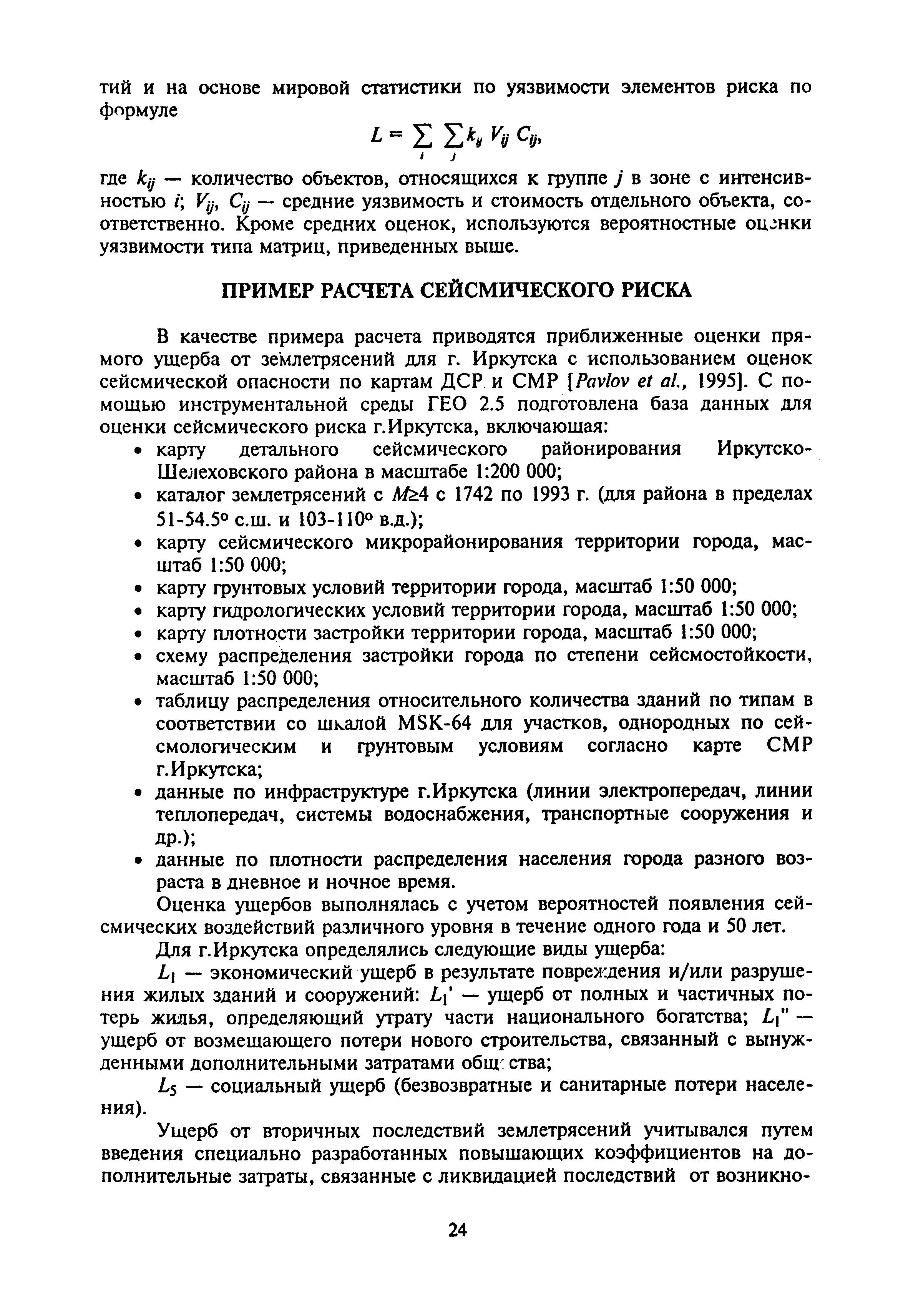 Оценка сейсмической опасности и сейсмического риска. Пособие для должностных лиц| Статус: | справочные материалы, мп, тпр | | Название рус.: | Оценка сейсмической опасности и сейсмического риска. Пособие для должностных лиц | | Дата добавления в базу: | 01.01.2019 | | Дата актуализации: | 01.01.2021 | | Область применения: | Документ предназначен в основном для должностных лиц, принимающих решения на городском, региональном или государственном уровнях, для планирующих органов, страховых компаний и др., а также для жителей сейсмоопасных районов. | | Оглавление: | Основные понятия и определения Сейсмическая опасность Вторичные процессы и явления, сопровождающие землетрясения Уязвимость Оценка уязвимости Оценка сейсмического риска Пример расчета сейсмического риска Заключение Литература Приложение 1. Шкала сейсмической интенсивности ГОСТ 6249-52 Приложение 2. Шкала сейсмической интенсивности MSK-64 Приложение 3. Значения ускорений колебаний грунта (см/с2) при интенсивностях землетрясений I = 6, 7, 8, 9 баллов в разных шкалах, используемых в Российской Федерации Приложение 4. Зональные характеристики г. Иркутска Приложение 5. Форма учета мероприятий по готовности к землетрясениям Приложение 6. Форма оценки ситуации и проведения мероприятий на случай катастрофы | | Нормативные ссылки: | |