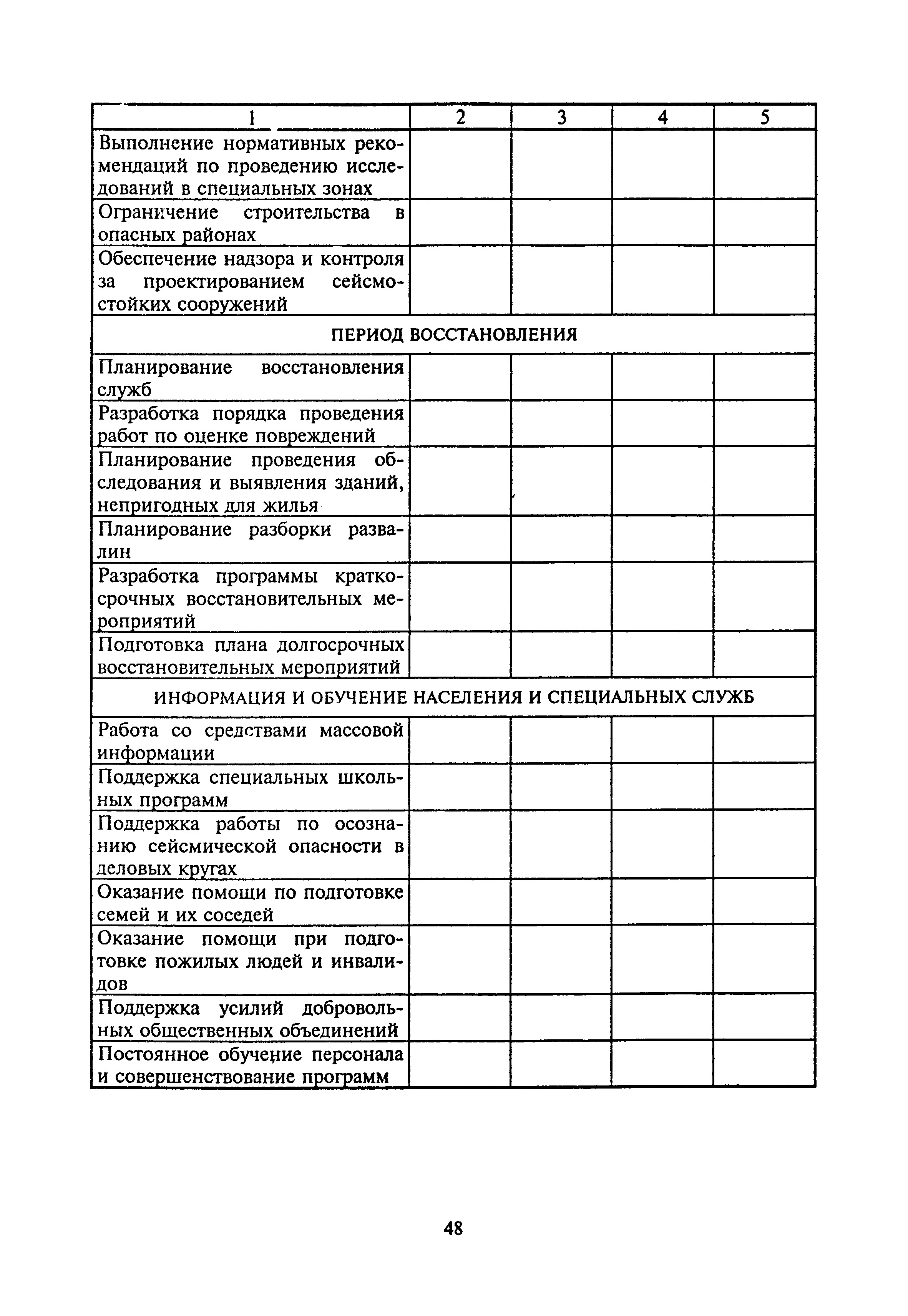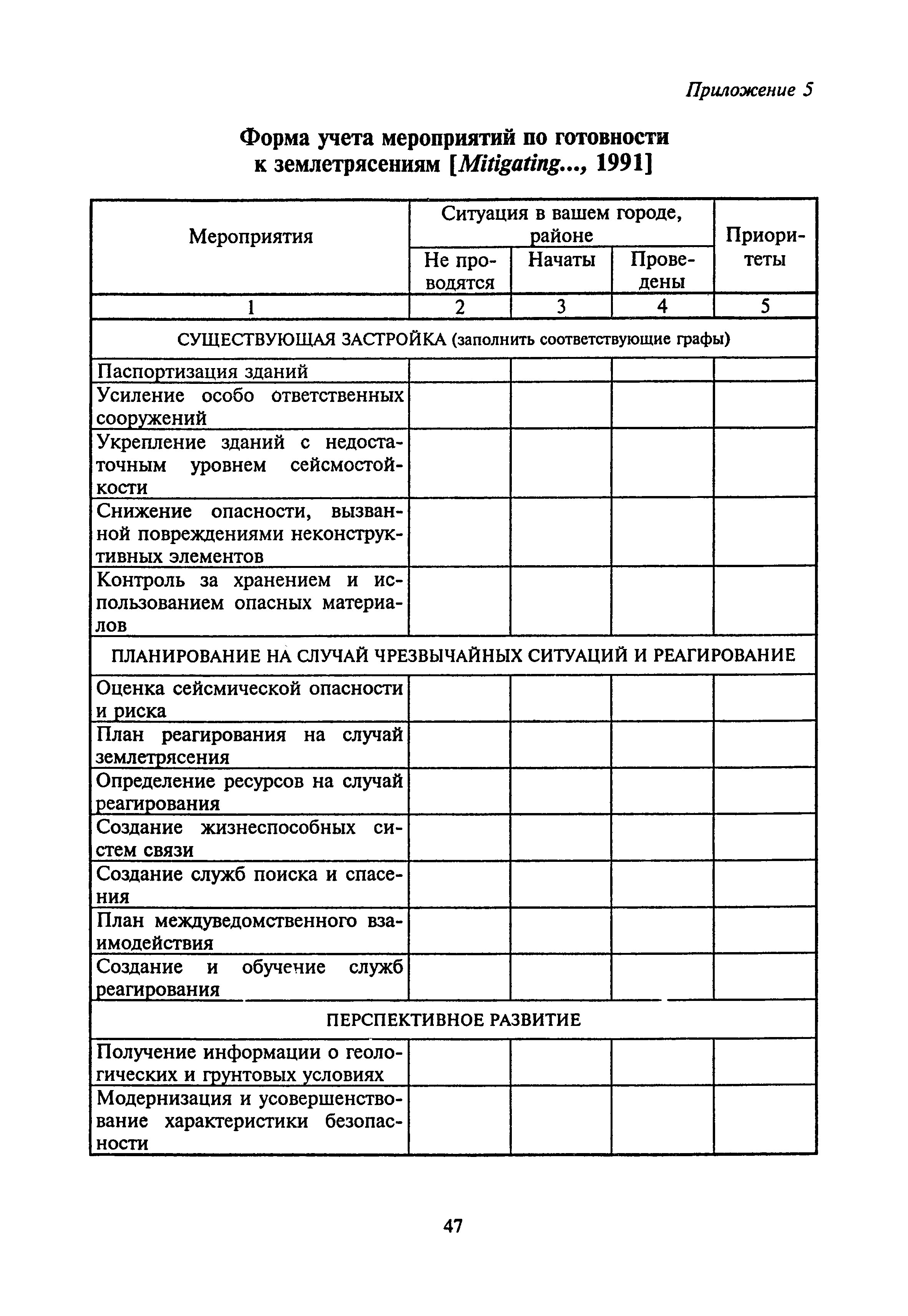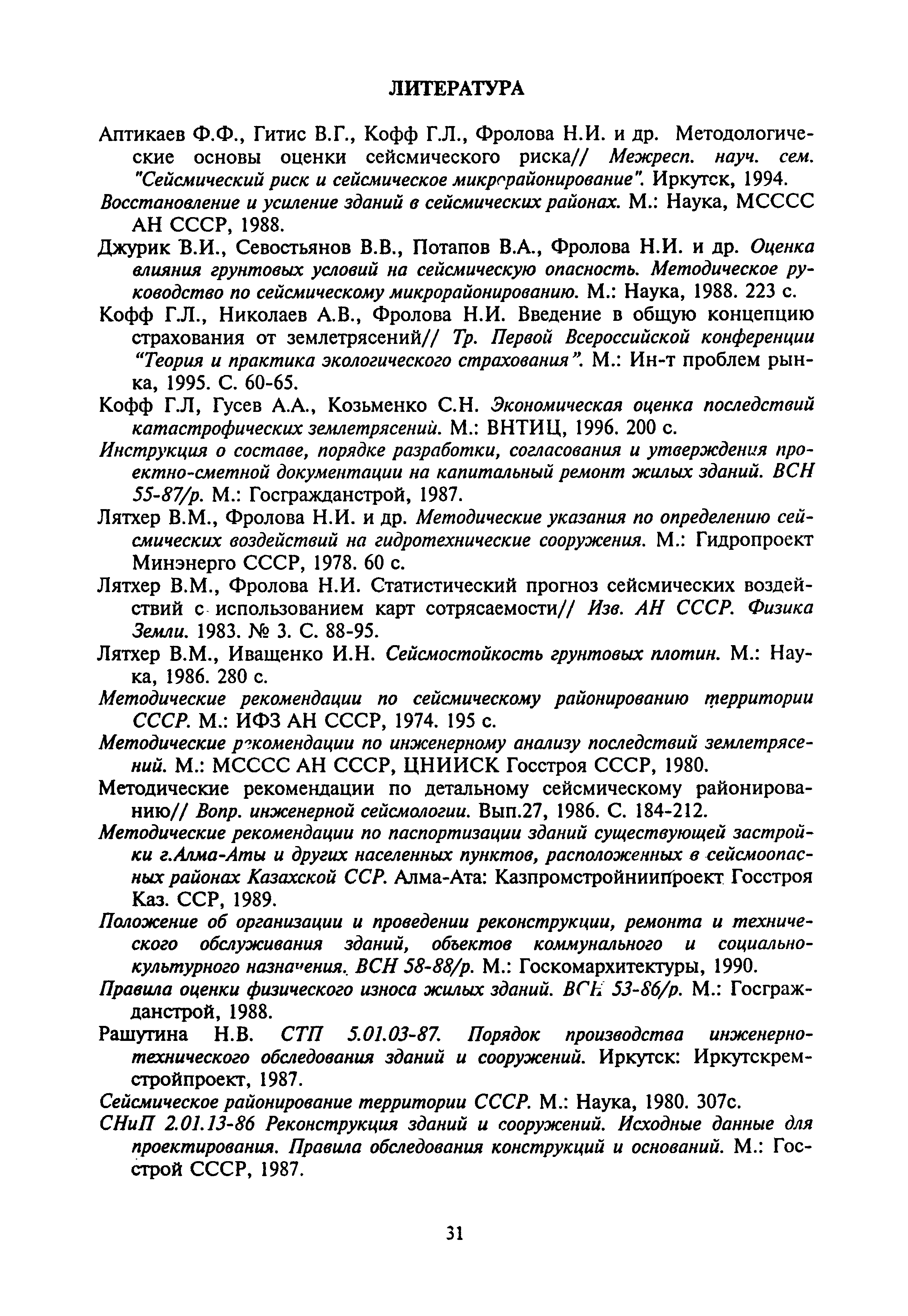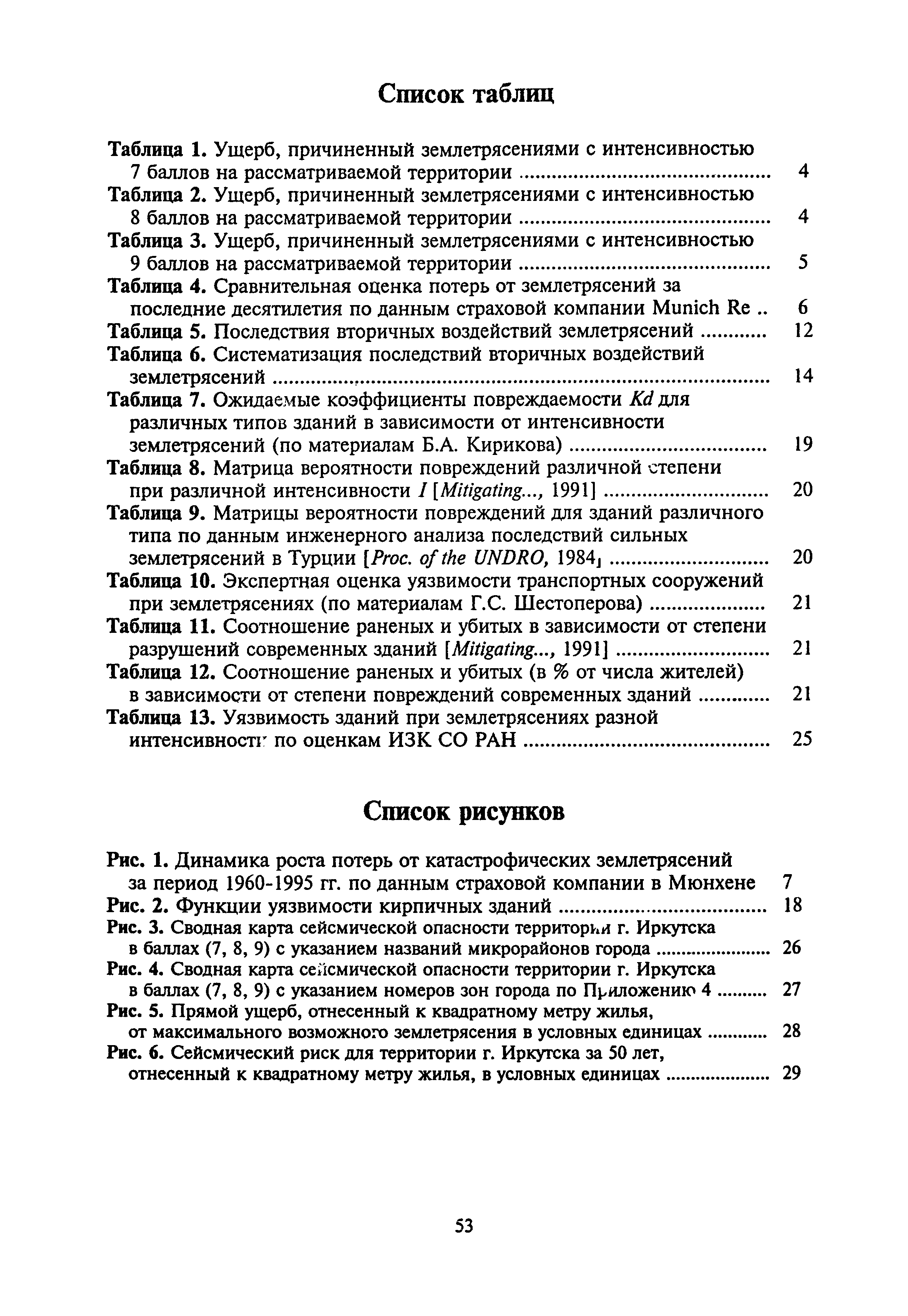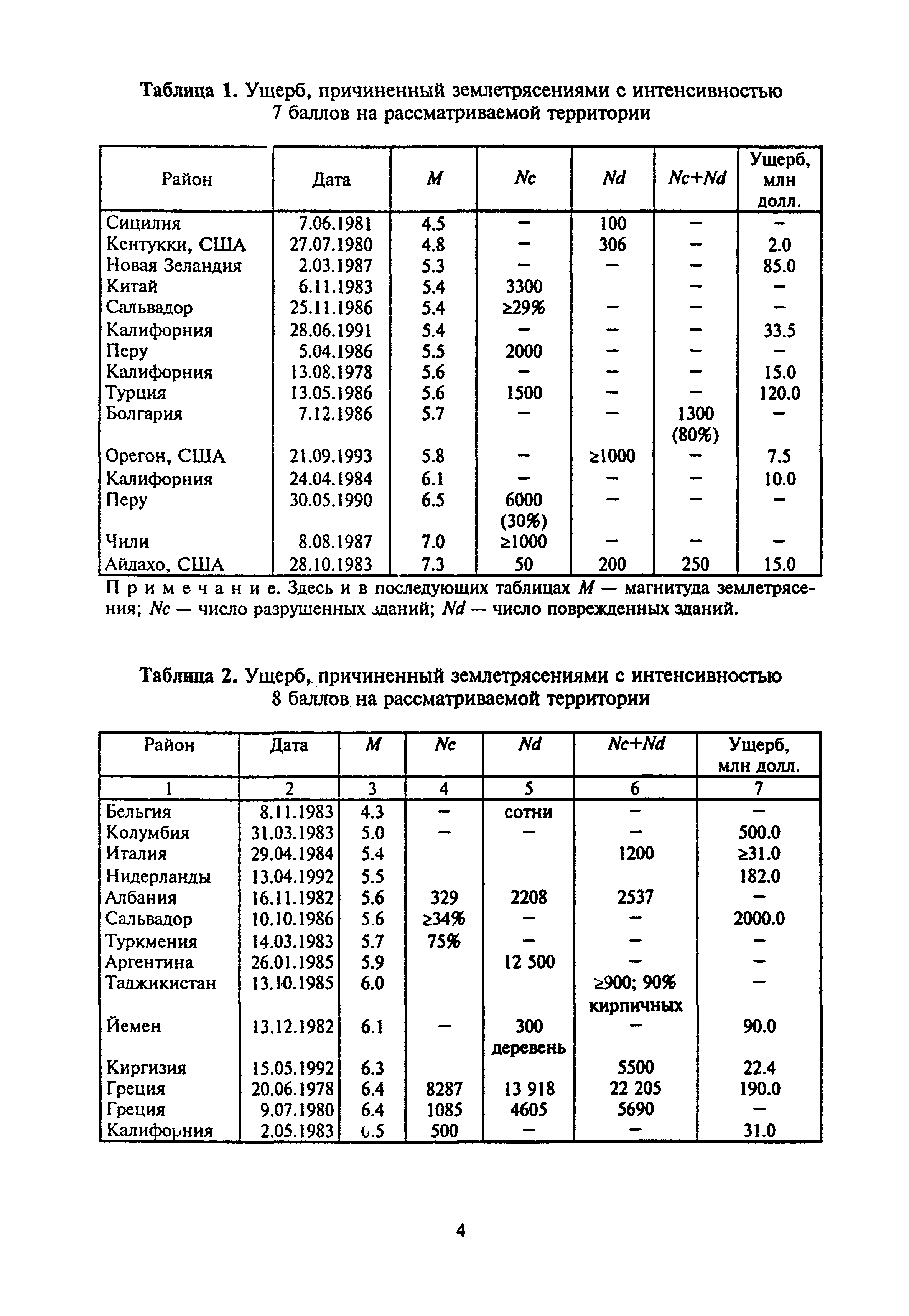 Оценка сейсмической опасности и сейсмического риска. Пособие для должностных лиц| Статус: | справочные материалы, мп, тпр | | Название рус.: | Оценка сейсмической опасности и сейсмического риска. Пособие для должностных лиц | | Дата добавления в базу: | 01.01.2019 | | Дата актуализации: | 01.01.2021 | | Область применения: | Документ предназначен в основном для должностных лиц, принимающих решения на городском, региональном или государственном уровнях, для планирующих органов, страховых компаний и др., а также для жителей сейсмоопасных районов. | | Оглавление: | Основные понятия и определения Сейсмическая опасность Вторичные процессы и явления, сопровождающие землетрясения Уязвимость Оценка уязвимости Оценка сейсмического риска Пример расчета сейсмического риска Заключение Литература Приложение 1. Шкала сейсмической интенсивности ГОСТ 6249-52 Приложение 2. Шкала сейсмической интенсивности MSK-64 Приложение 3. Значения ускорений колебаний грунта (см/с2) при интенсивностях землетрясений I = 6, 7, 8, 9 баллов в разных шкалах, используемых в Российской Федерации Приложение 4. Зональные характеристики г. Иркутска Приложение 5. Форма учета мероприятий по готовности к землетрясениям Приложение 6. Форма оценки ситуации и проведения мероприятий на случай катастрофы | | Нормативные ссылки: | |