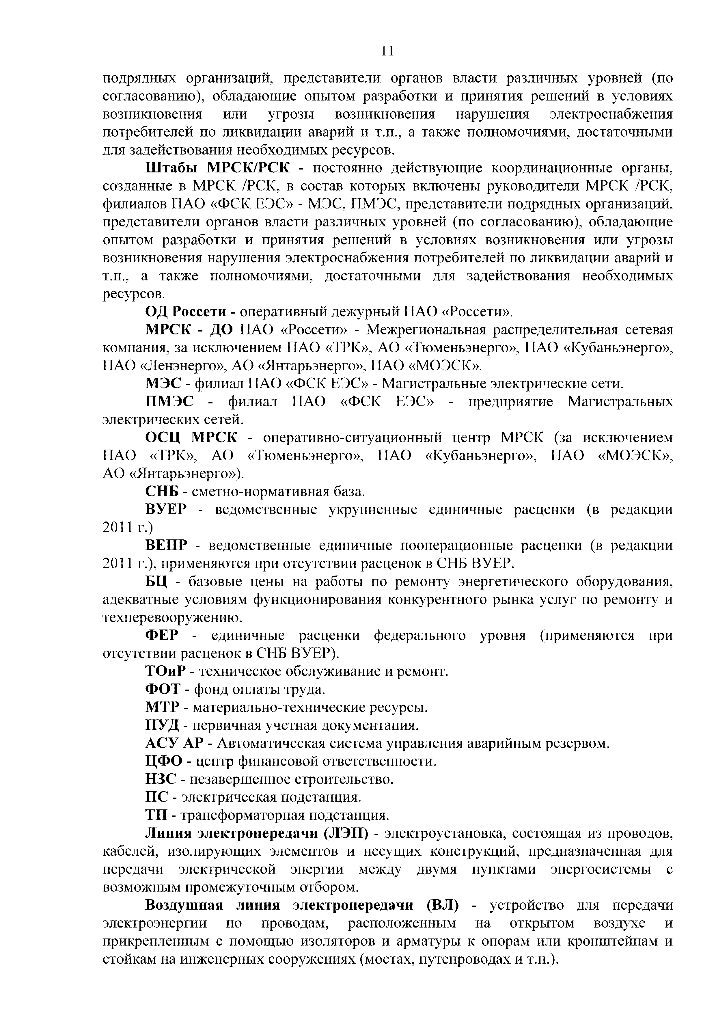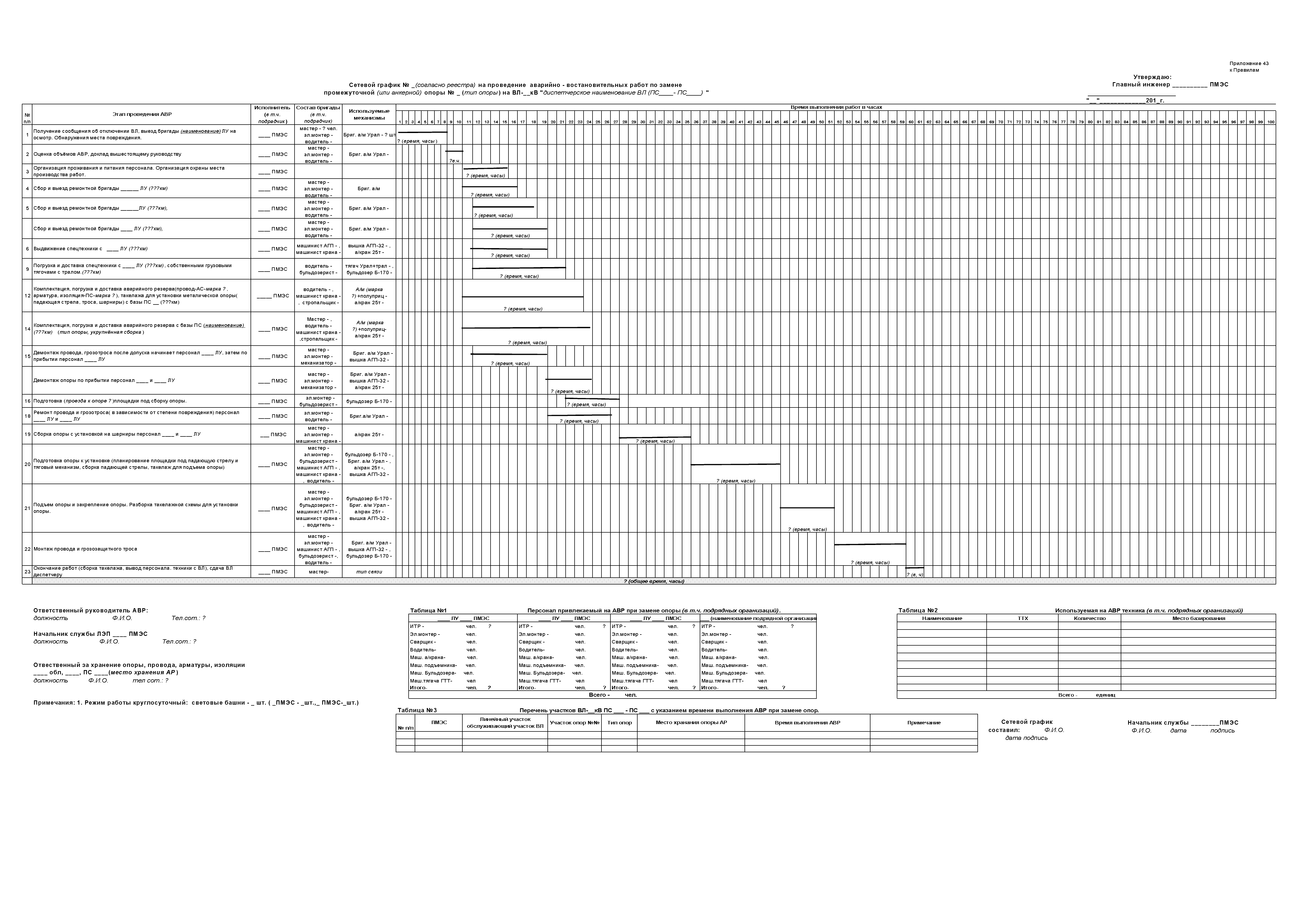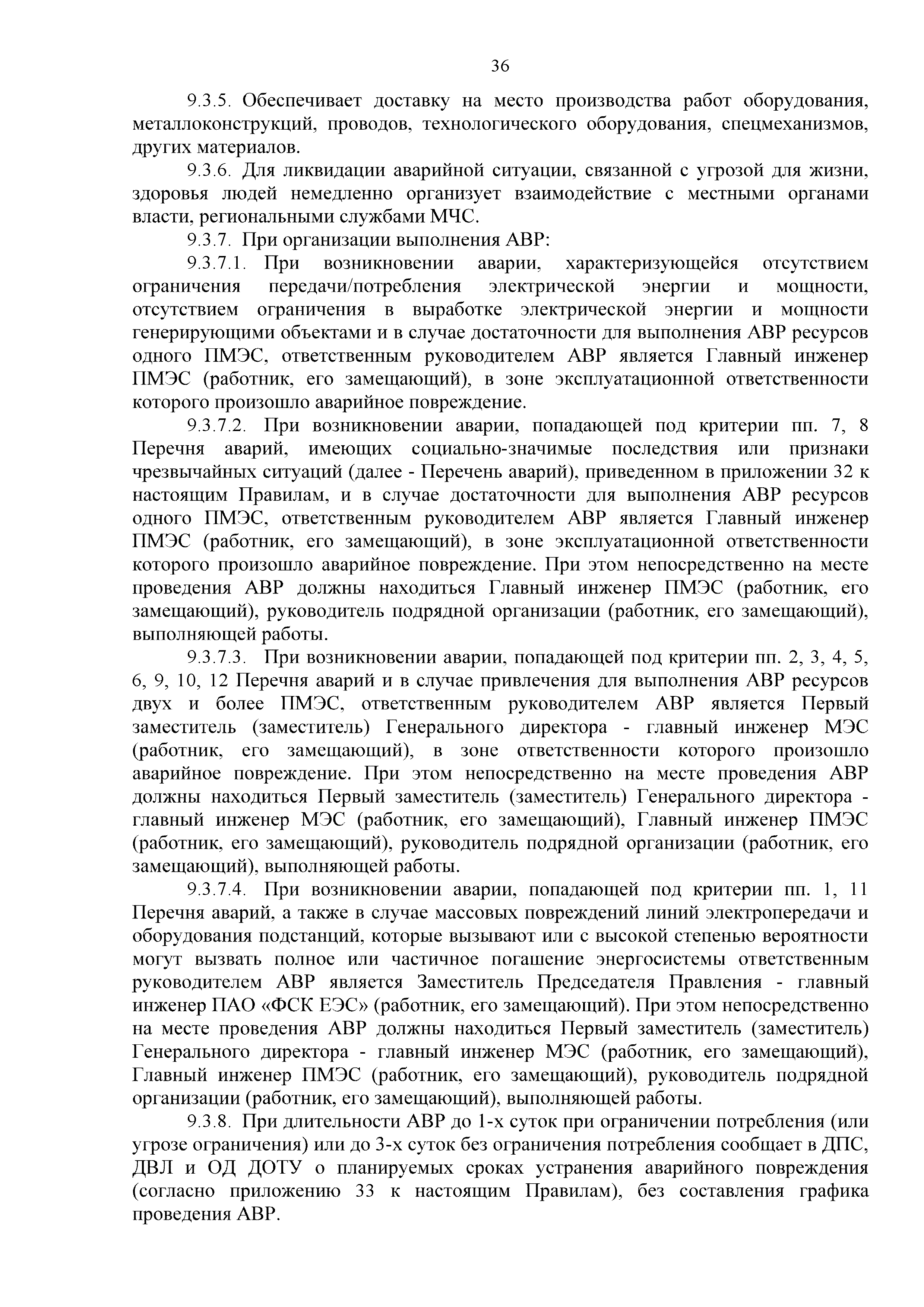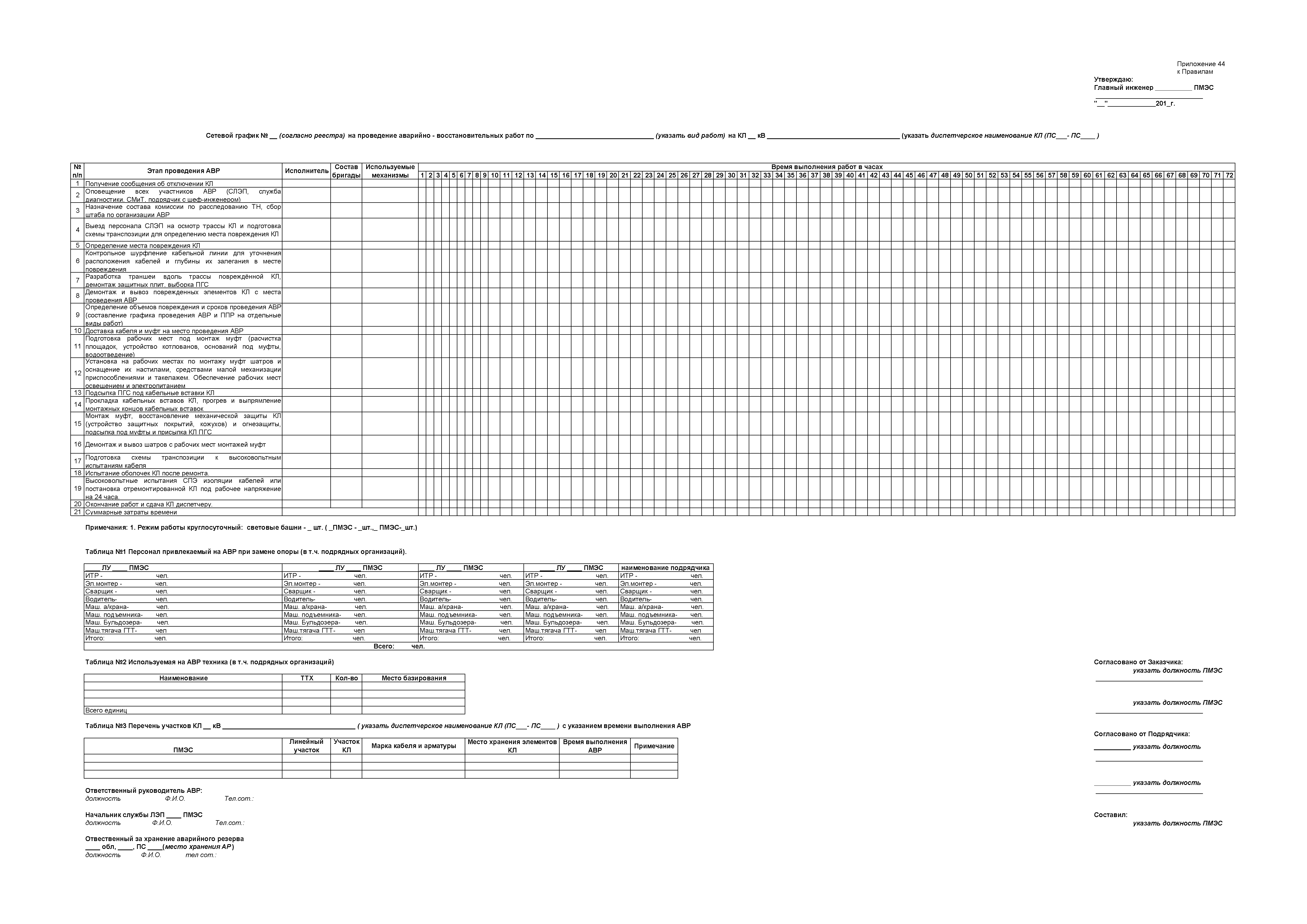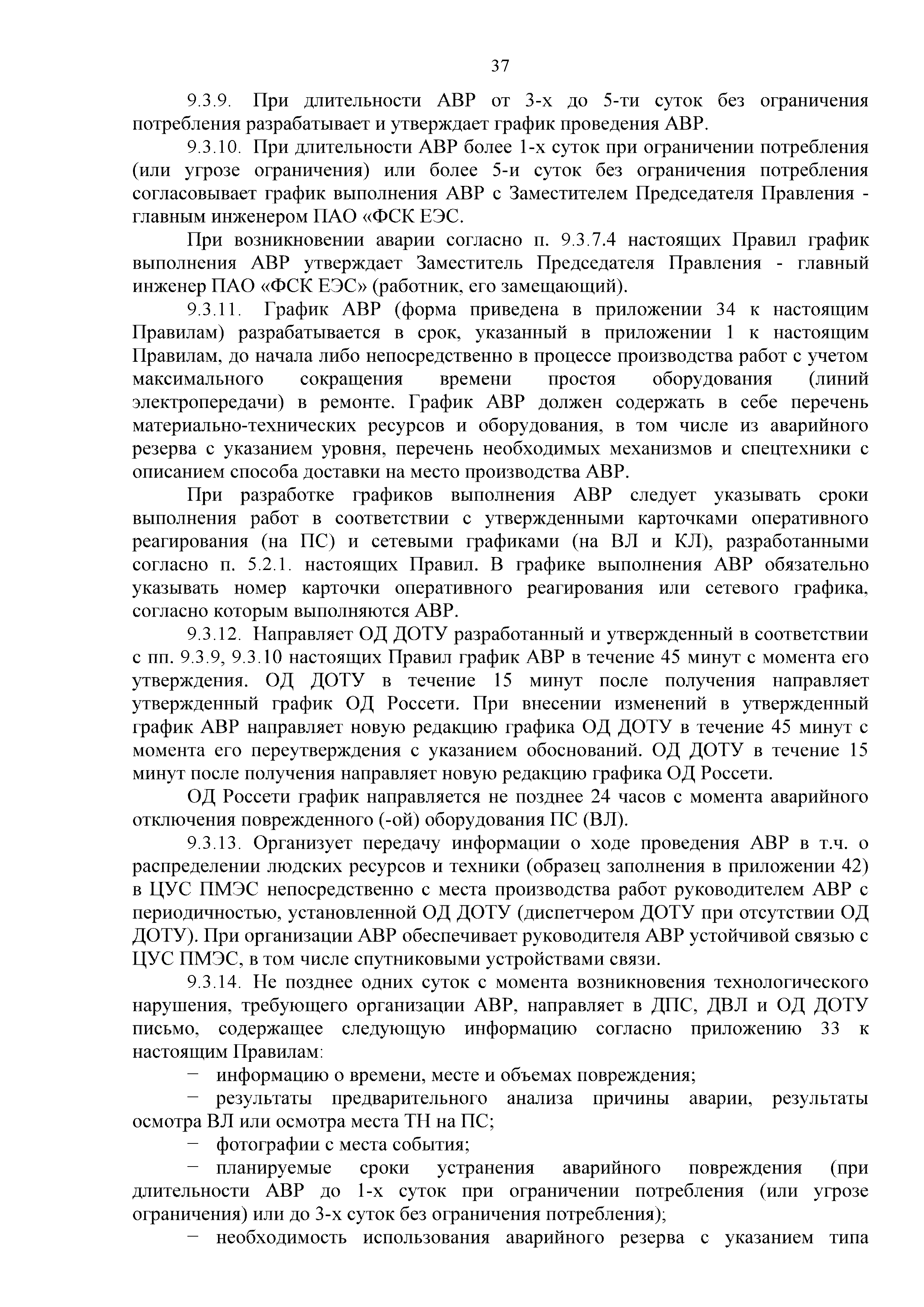 | Оглавление: | 1. Аннотация 1.1. Цель разработки документа 1.2. Краткое содержание документа 1.3. Целевой пользователь документа 1.4. Ответственность за разработку документа 2. Термины и определения 3. Общие положения 4. Общие принципы организации и основные этапы выполнения АВР на электросетевых объектах 5. Разработка филиалами ПАО "ФСК ЕЭС" - МЭС документов в области предотвращения и ликвидации аварий 6. Организация управления аварийным резервом ПАО "ФСК ЕЭС" 6.1. Общая часть 6.2. Комплектование аварийного резерва ПАО "ФСК ЕЭС" 6.3. Хранение и содержание аварийного резерва ПАО "ФСК ЕЭС" 6.4. Текущий контроль состояния АР 6.5. Использование аварийного резерва ПАО "ФСК ЕЭС" при выполнении АВР и работ, направленных на предупреждение аварийных ситуаций 6.6. Восполнение аварийного резерва ПАО "ФСК ЕЭС" 6.7. Ротация оборудования и материалов аварийного резерва ПАО "ФСК ЕЭС" 6.8. Учет оборудования и материалов аварийного резерва 6.9. Истечение срока хранения оборудования и материалов АР 7. Применение РИСЭ ПАО "ФСК ЕЭС" 7.1. Порядок формирования парка РИСЭ 7.2. Порядок учета РИСЭ и ведения необходимой документации 7.3. Приемка РИСЭ в эксплуатацию 7.4. Требования к хранению и содержанию РИСЭ 7.5. Порядок применения РИСЭ при нарушениях электроснабжения 7.6. Порядок учета работы РИСЭ 7.7. Порядок представления РИСЭ другим субъектам электроэнергетики во временное пользование 8. Организация учений и тренировок по отработке взаимодействия при ликвидации аварийных ситуаций в электросетевом комплексе 9. Организация АВР на электросетевых объектах ПАО "ФСК ЕЭС" 9.1. Действия при возникновении и обнаружении мест аварийных повреждений электросетевого оборудования 9.2. Особенности организации и проведения послеаварийных осмотров ВЛ, КВЛ с расчетным местом повреждения в пределах воздушного участка КВЛ с успешным АПВ или РПВ 9.3. Действия при ликвидации аварийных повреждений на электросетевых объектах ПАО "ФСК ЕЭС" 9.4. Действия при ликвидации аварийных повреждений ОАО "Электросетьсервис ЕНЭС" или внешним подрядчиком 9.5. Требования к сдаче-приемке объекта после аварийно-восстановительных работ 9.6. Порядок привлечения сил и средств филиалов ПАО "ФСК ЕЭС" - МЭС для ликвидации аварийных повреждений на объектах электросетевых компаний, функционирующих на одноименных территориях 10. Организационные мероприятия по ликвидации массовых отключений электросетевых объектов Приложение 1. Предельные сроки выполнения мероприятий по организации АВР Приложение 2. Порядок и сроки представления документации в ПАО "ФСК ЕЭС" и ПАО "Россети" Приложение 3. Информация о привлечении к АВР дополнительных сил и средств (других ДО ПАО "Россети", подрядных организаций), а также информации о выполнении АВР собственными силами на электросетевых объектах иных собственников (кроме ДО ПАО "Россети") в рамках оказания содействия в проведении АВР Приложение 4. Информация о зонах покрытия радиотелефонной связи стандарта GSM и спутниковой связи МЭС Приложение 5. Наличие, распределение и состояние автотранспортных средств и механизмов филиала ПАО "ФСК ЕЭС" - МЭС Приложение 6. Информация о наличии и местах размещения ММПС филиала ПАО "ФСК ЕЭС" - МЭС Приложение 7. Сетевой график на проведение аварийно-востановительных работ по замене промежуточной (или анкерной) опоры на ВЛ Приложение 8. Сетевой график на проведение ава