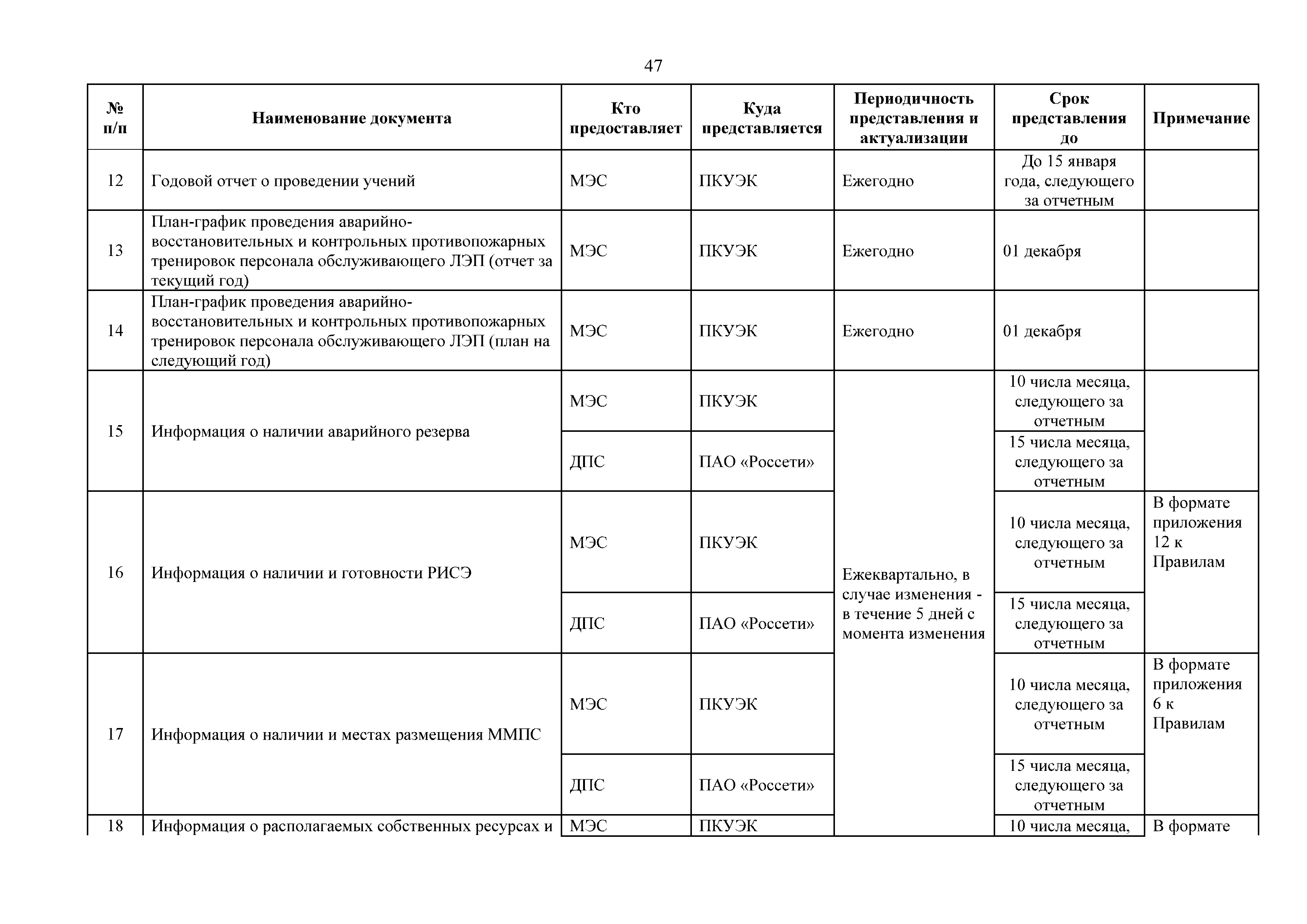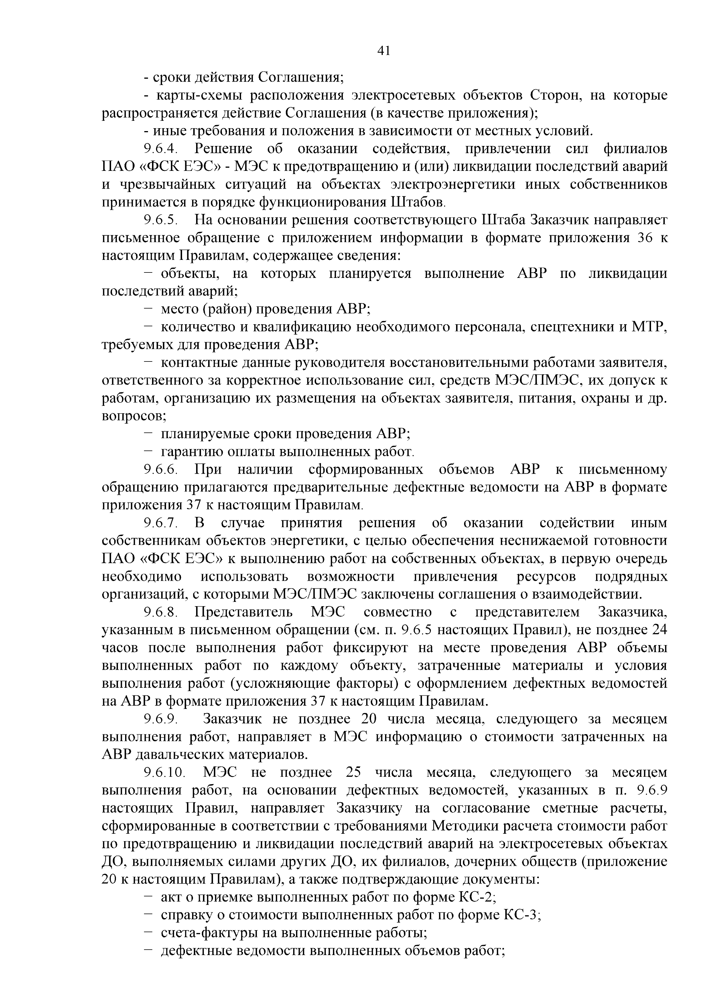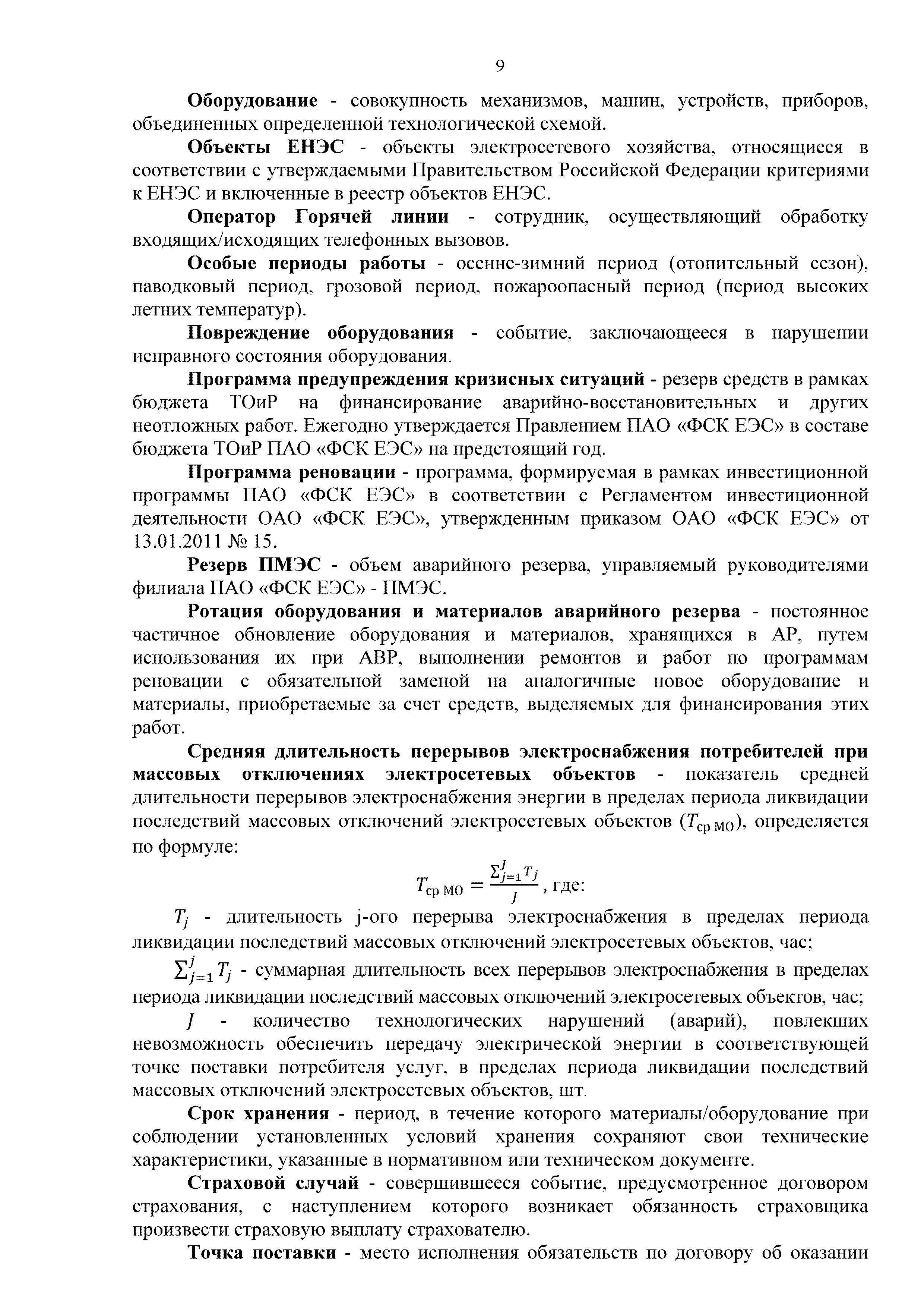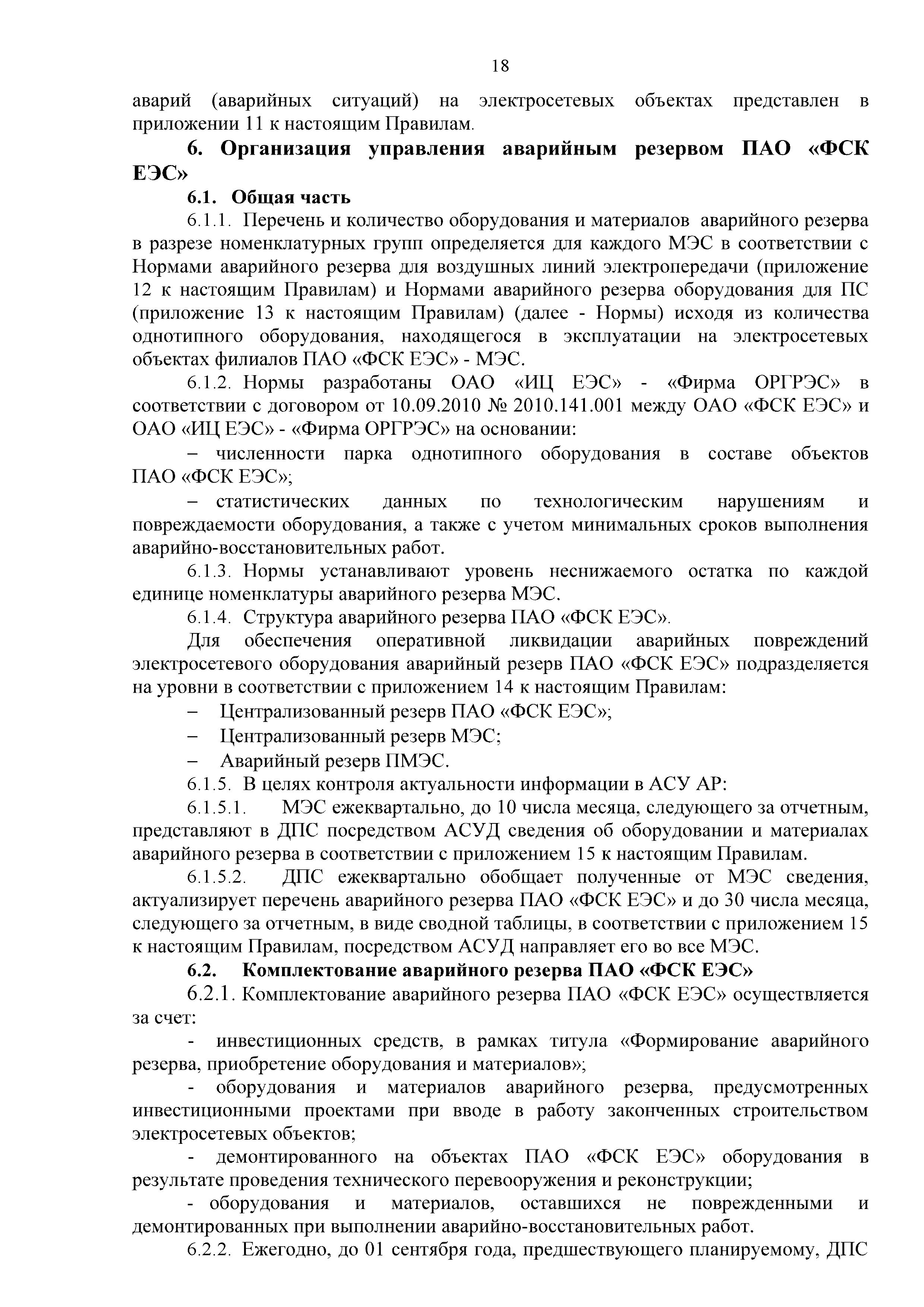 | Оглавление: | 1. Аннотация 1.1. Цель разработки документа 1.2. Краткое содержание документа 1.3. Целевой пользователь документа 1.4. Ответственность за разработку документа 2. Термины и определения 3. Общие положения 4. Общие принципы организации и основные этапы выполнения АВР на электросетевых объектах 5. Разработка филиалами ПАО "ФСК ЕЭС" - МЭС документов в области предотвращения и ликвидации аварий 6. Организация управления аварийным резервом ПАО "ФСК ЕЭС" 6.1. Общая часть 6.2. Комплектование аварийного резерва ПАО "ФСК ЕЭС" 6.3. Хранение и содержание аварийного резерва ПАО "ФСК ЕЭС" 6.4. Текущий контроль состояния АР 6.5. Использование аварийного резерва ПАО "ФСК ЕЭС" при выполнении АВР и работ, направленных на предупреждение аварийных ситуаций 6.6. Восполнение аварийного резерва ПАО "ФСК ЕЭС" 6.7. Ротация оборудования и материалов аварийного резерва ПАО "ФСК ЕЭС" 6.8. Учет оборудования и материалов аварийного резерва 6.9. Истечение срока хранения оборудования и материалов АР 7. Применение РИСЭ ПАО "ФСК ЕЭС" 7.1. Порядок формирования парка РИСЭ 7.2. Порядок учета РИСЭ и ведения необходимой документации 7.3. Приемка РИСЭ в эксплуатацию 7.4. Требования к хранению и содержанию РИСЭ 7.5. Порядок применения РИСЭ при нарушениях электроснабжения 7.6. Порядок учета работы РИСЭ 7.7. Порядок представления РИСЭ другим субъектам электроэнергетики во временное пользование 8. Организация учений и тренировок по отработке взаимодействия при ликвидации аварийных ситуаций в электросетевом комплексе 9. Организация АВР на электросетевых объектах ПАО "ФСК ЕЭС" 9.1. Действия при возникновении и обнаружении мест аварийных повреждений электросетевого оборудования 9.2. Особенности организации и проведения послеаварийных осмотров ВЛ, КВЛ с расчетным местом повреждения в пределах воздушного участка КВЛ с успешным АПВ или РПВ 9.3. Действия при ликвидации аварийных повреждений на электросетевых объектах ПАО "ФСК ЕЭС" 9.4. Действия при ликвидации аварийных повреждений ОАО "Электросетьсервис ЕНЭС" или внешним подрядчиком 9.5. Требования к сдаче-приемке объекта после аварийно-восстановительных работ 9.6. Порядок привлечения сил и средств филиалов ПАО "ФСК ЕЭС" - МЭС для ликвидации аварийных повреждений на объектах электросетевых компаний, функционирующих на одноименных территориях 10. Организационные мероприятия по ликвидации массовых отключений электросетевых объектов Приложение 1. Предельные сроки выполнения мероприятий по организации АВР Приложение 2. Порядок и сроки представления документации в ПАО "ФСК ЕЭС" и ПАО "Россети" Приложение 3. Информация о привлечении к АВР дополнительных сил и средств (других ДО ПАО "Россети", подрядных организаций), а также информации о выполнении АВР собственными силами на электросетевых объектах иных собственников (кроме ДО ПАО "Россети") в рамках оказания содействия в проведении АВР Приложение 4. Информация о зонах покрытия радиотелефонной связи стандарта GSM и спутниковой связи МЭС Приложение 5. Наличие, распределение и состояние автотранспортных средств и механизмов филиала ПАО "ФСК ЕЭС" - МЭС Приложение 6. Информация о наличии и местах размещения ММПС филиала ПАО "ФСК ЕЭС" - МЭС Приложение 7. Сетевой график на проведение аварийно-востановительных работ по замене промежуточной (или анкерной) опоры на ВЛ Приложение 8. Сетевой график на проведение ава