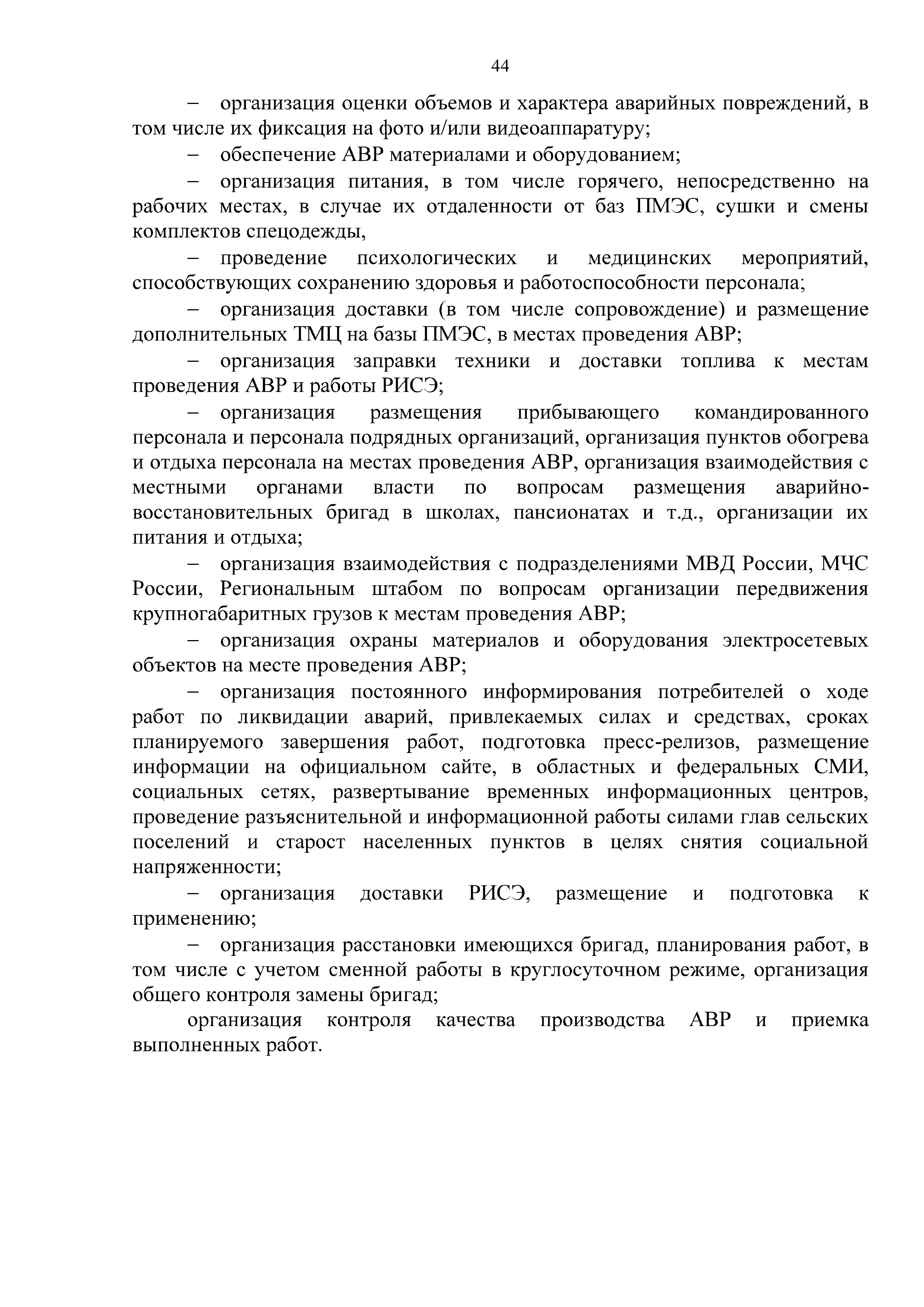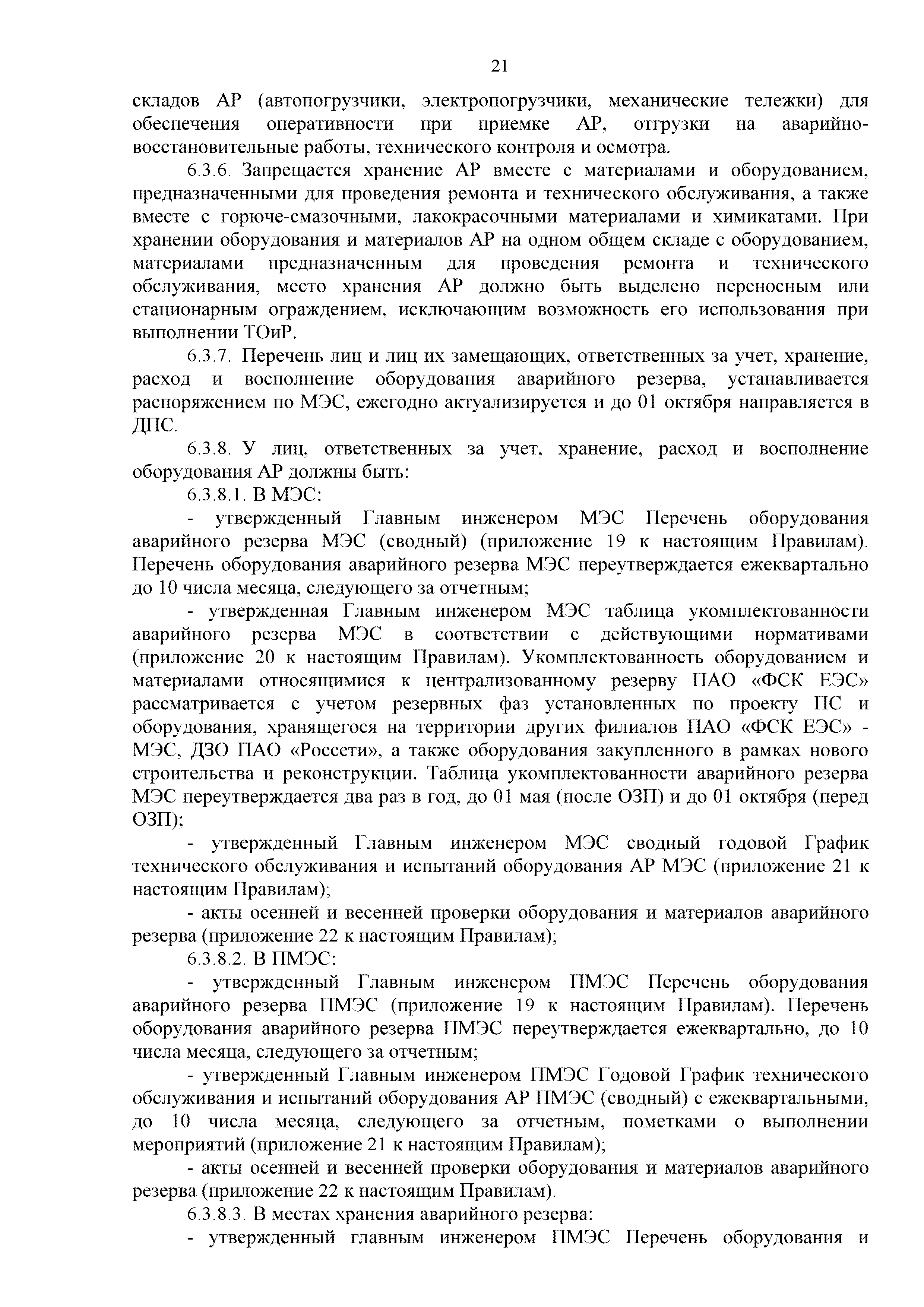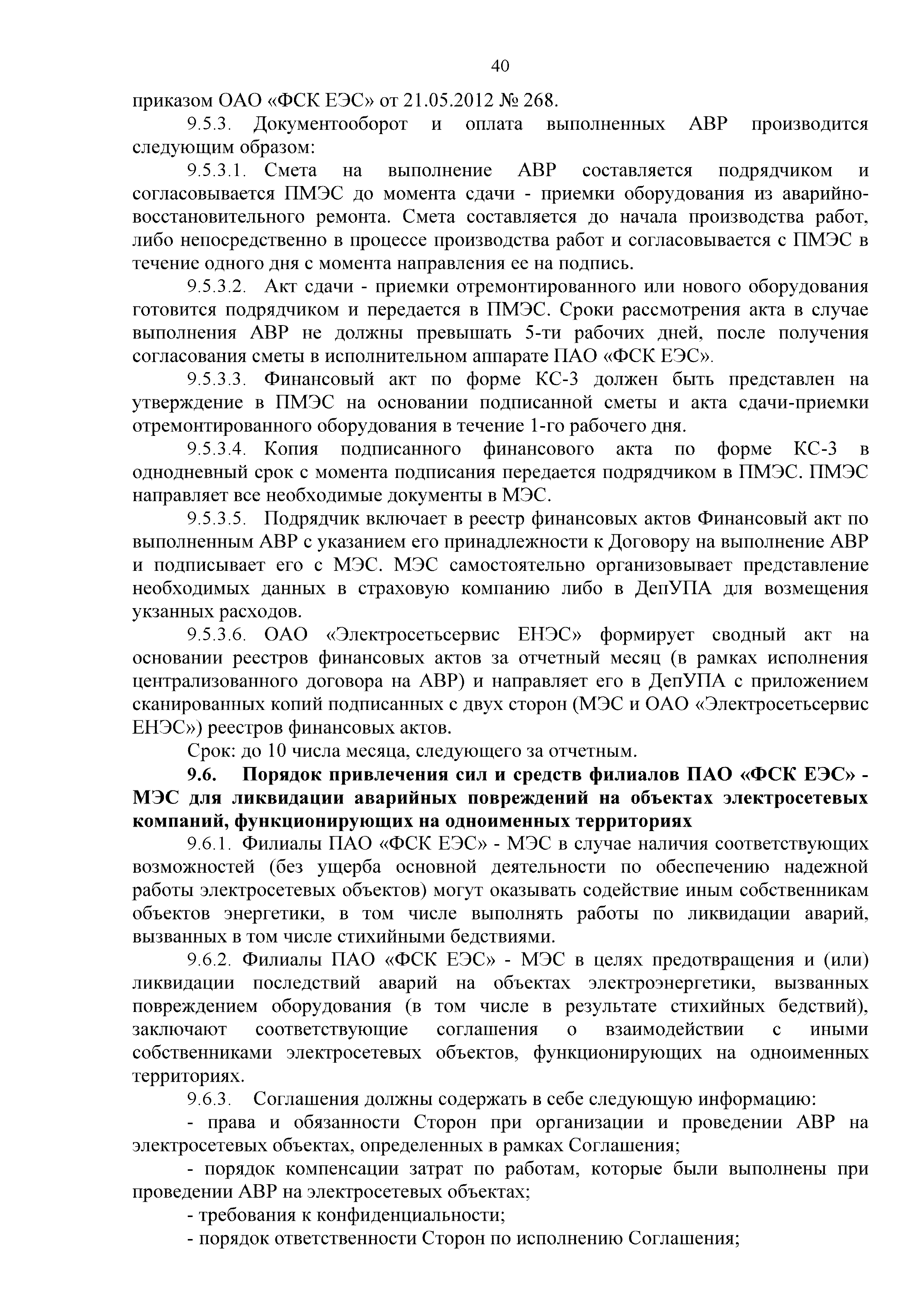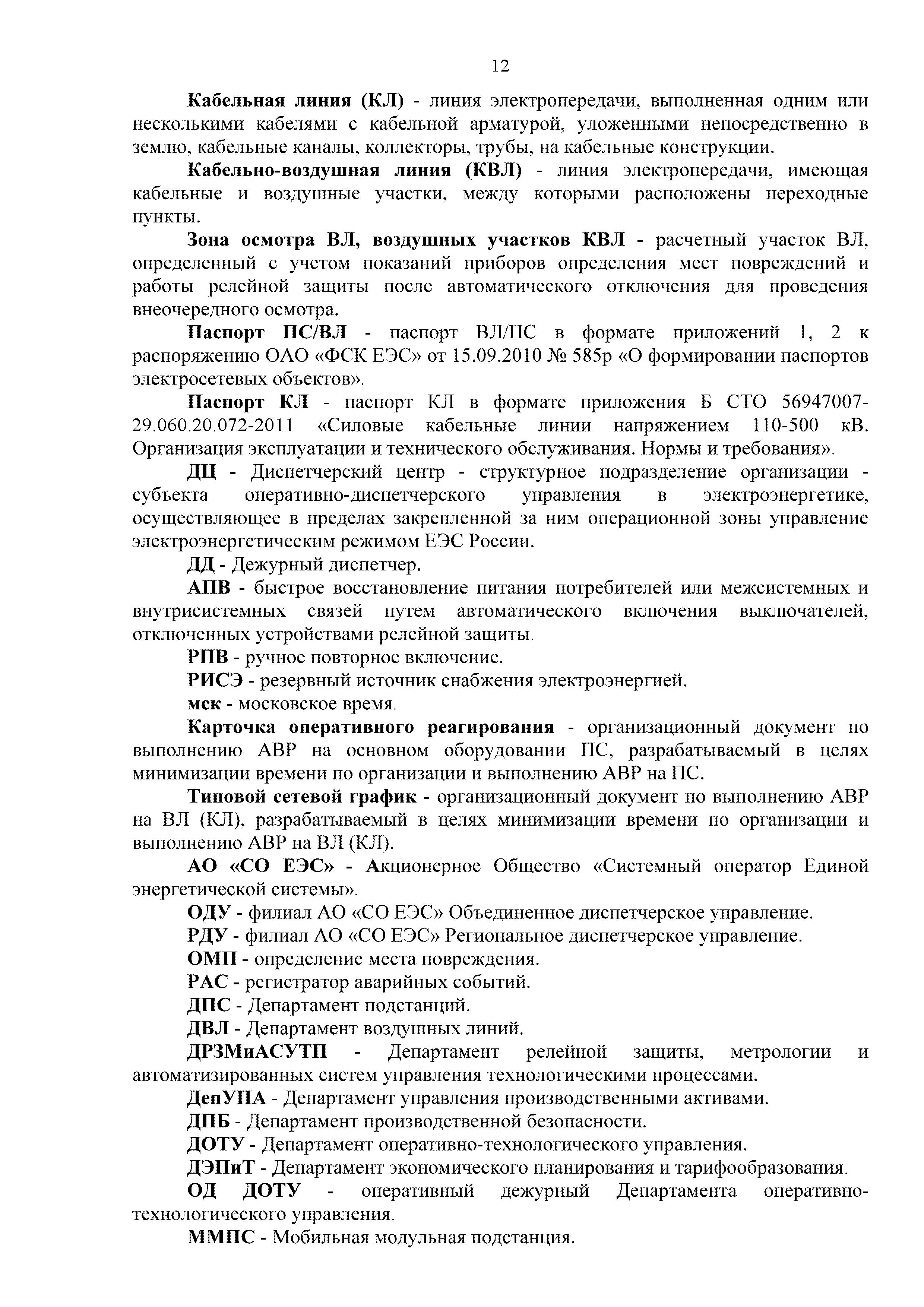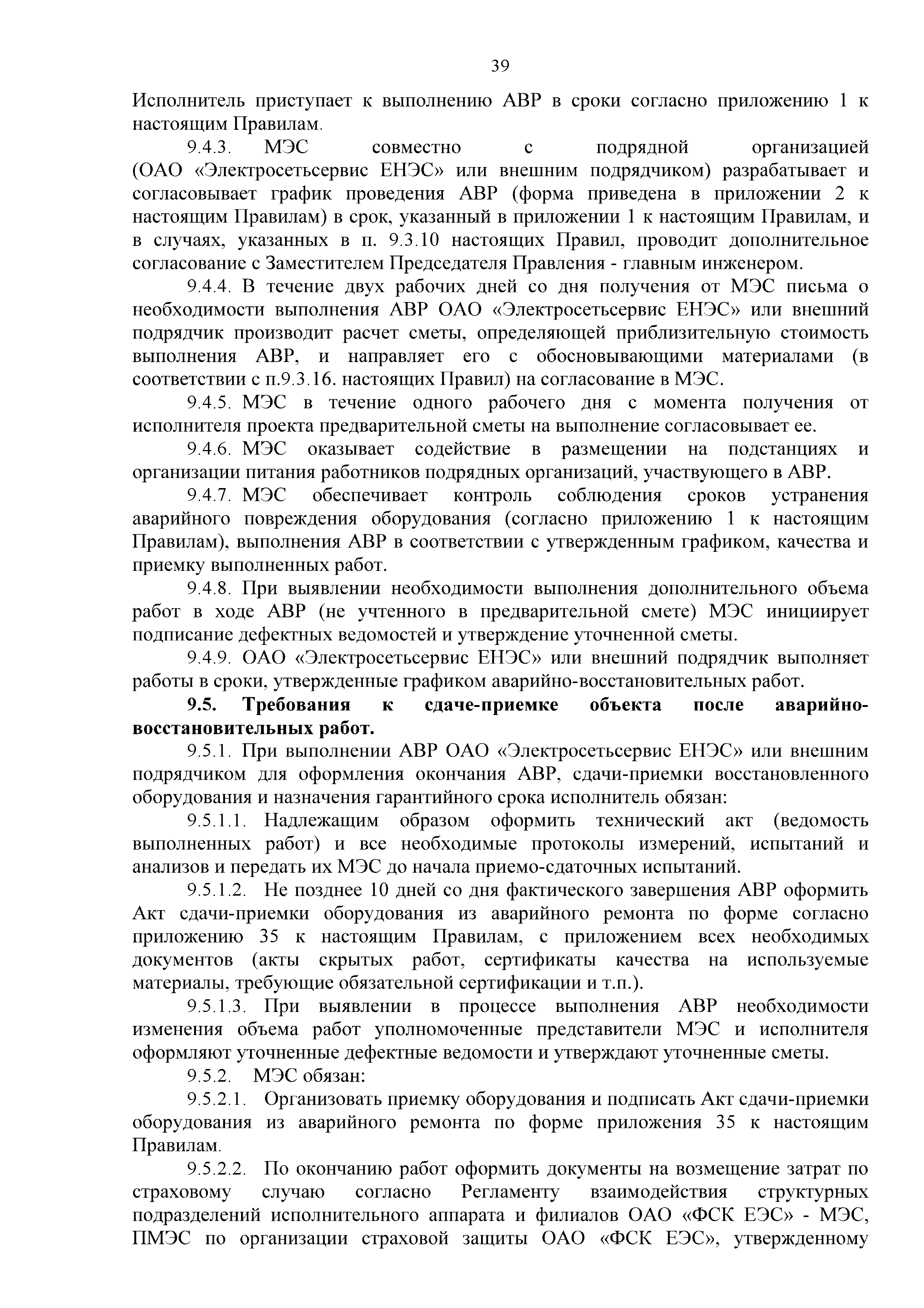 | Оглавление: | 1. Аннотация 1.1. Цель разработки документа 1.2. Краткое содержание документа 1.3. Целевой пользователь документа 1.4. Ответственность за разработку документа 2. Термины и определения 3. Общие положения 4. Общие принципы организации и основные этапы выполнения АВР на электросетевых объектах 5. Разработка филиалами ПАО "ФСК ЕЭС" - МЭС документов в области предотвращения и ликвидации аварий 6. Организация управления аварийным резервом ПАО "ФСК ЕЭС" 6.1. Общая часть 6.2. Комплектование аварийного резерва ПАО "ФСК ЕЭС" 6.3. Хранение и содержание аварийного резерва ПАО "ФСК ЕЭС" 6.4. Текущий контроль состояния АР 6.5. Использование аварийного резерва ПАО "ФСК ЕЭС" при выполнении АВР и работ, направленных на предупреждение аварийных ситуаций 6.6. Восполнение аварийного резерва ПАО "ФСК ЕЭС" 6.7. Ротация оборудования и материалов аварийного резерва ПАО "ФСК ЕЭС" 6.8. Учет оборудования и материалов аварийного резерва 6.9. Истечение срока хранения оборудования и материалов АР 7. Применение РИСЭ ПАО "ФСК ЕЭС" 7.1. Порядок формирования парка РИСЭ 7.2. Порядок учета РИСЭ и ведения необходимой документации 7.3. Приемка РИСЭ в эксплуатацию 7.4. Требования к хранению и содержанию РИСЭ 7.5. Порядок применения РИСЭ при нарушениях электроснабжения 7.6. Порядок учета работы РИСЭ 7.7. Порядок представления РИСЭ другим субъектам электроэнергетики во временное пользование 8. Организация учений и тренировок по отработке взаимодействия при ликвидации аварийных ситуаций в электросетевом комплексе 9. Организация АВР на электросетевых объектах ПАО "ФСК ЕЭС" 9.1. Действия при возникновении и обнаружении мест аварийных повреждений электросетевого оборудования 9.2. Особенности организации и проведения послеаварийных осмотров ВЛ, КВЛ с расчетным местом повреждения в пределах воздушного участка КВЛ с успешным АПВ или РПВ 9.3. Действия при ликвидации аварийных повреждений на электросетевых объектах ПАО "ФСК ЕЭС" 9.4. Действия при ликвидации аварийных повреждений ОАО "Электросетьсервис ЕНЭС" или внешним подрядчиком 9.5. Требования к сдаче-приемке объекта после аварийно-восстановительных работ 9.6. Порядок привлечения сил и средств филиалов ПАО "ФСК ЕЭС" - МЭС для ликвидации аварийных повреждений на объектах электросетевых компаний, функционирующих на одноименных территориях 10. Организационные мероприятия по ликвидации массовых отключений электросетевых объектов Приложение 1. Предельные сроки выполнения мероприятий по организации АВР Приложение 2. Порядок и сроки представления документации в ПАО "ФСК ЕЭС" и ПАО "Россети" Приложение 3. Информация о привлечении к АВР дополнительных сил и средств (других ДО ПАО "Россети", подрядных организаций), а также информации о выполнении АВР собственными силами на электросетевых объектах иных собственников (кроме ДО ПАО "Россети") в рамках оказания содействия в проведении АВР Приложение 4. Информация о зонах покрытия радиотелефонной связи стандарта GSM и спутниковой связи МЭС Приложение 5. Наличие, распределение и состояние автотранспортных средств и механизмов филиала ПАО "ФСК ЕЭС" - МЭС Приложение 6. Информация о наличии и местах размещения ММПС филиала ПАО "ФСК ЕЭС" - МЭС Приложение 7. Сетевой график на проведение аварийно-востановительных работ по замене промежуточной (или анкерной) опоры на ВЛ Приложение 8. Сетевой график на проведение ава