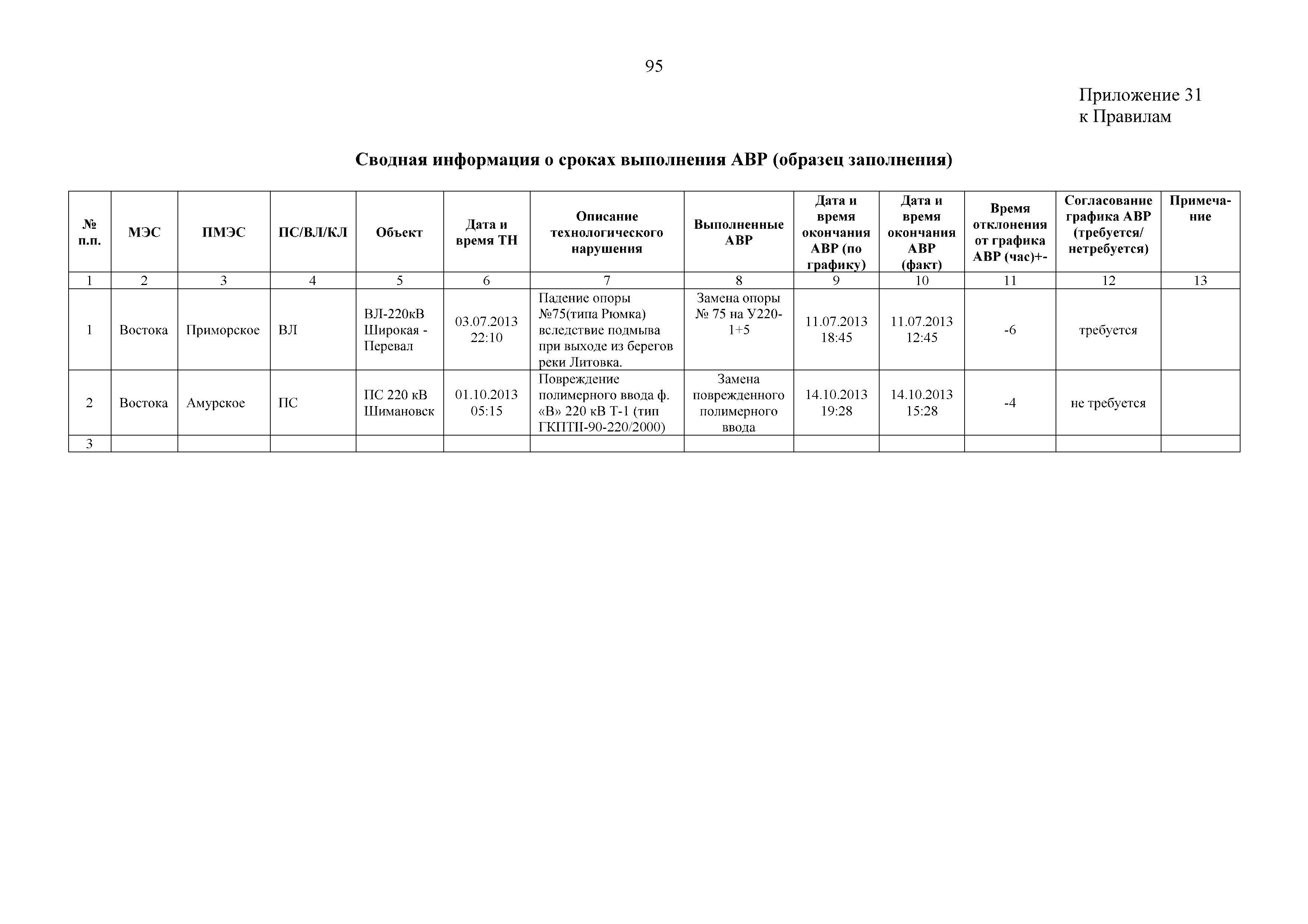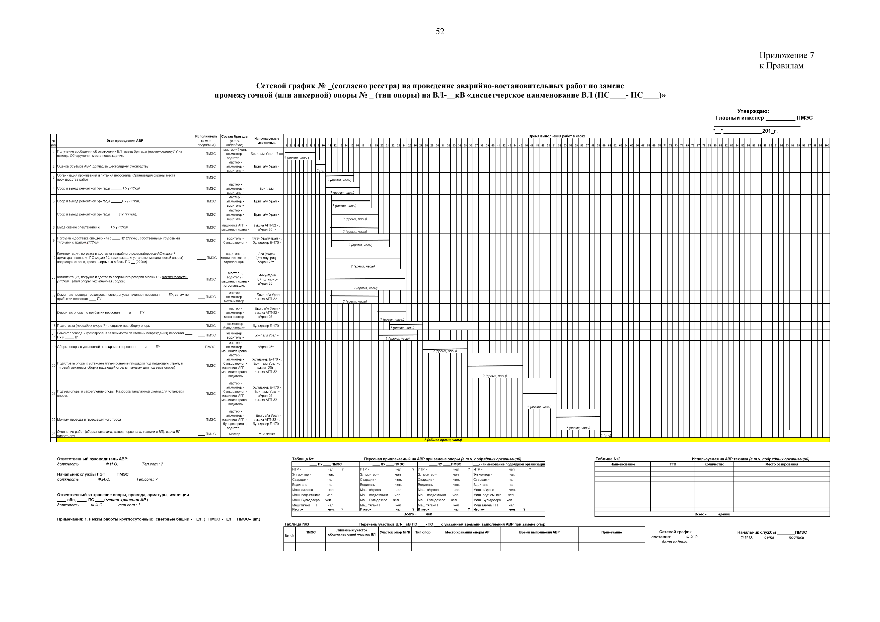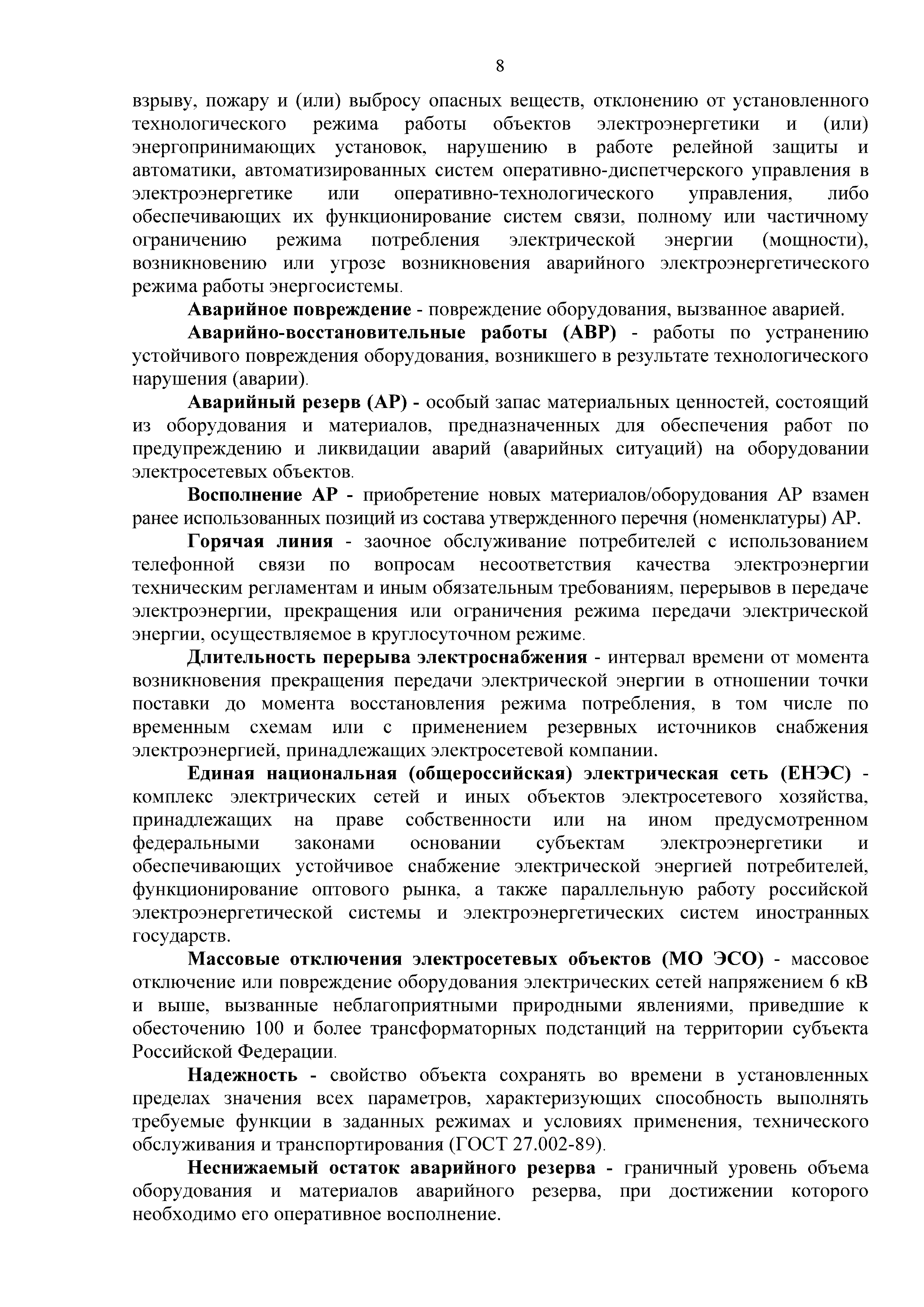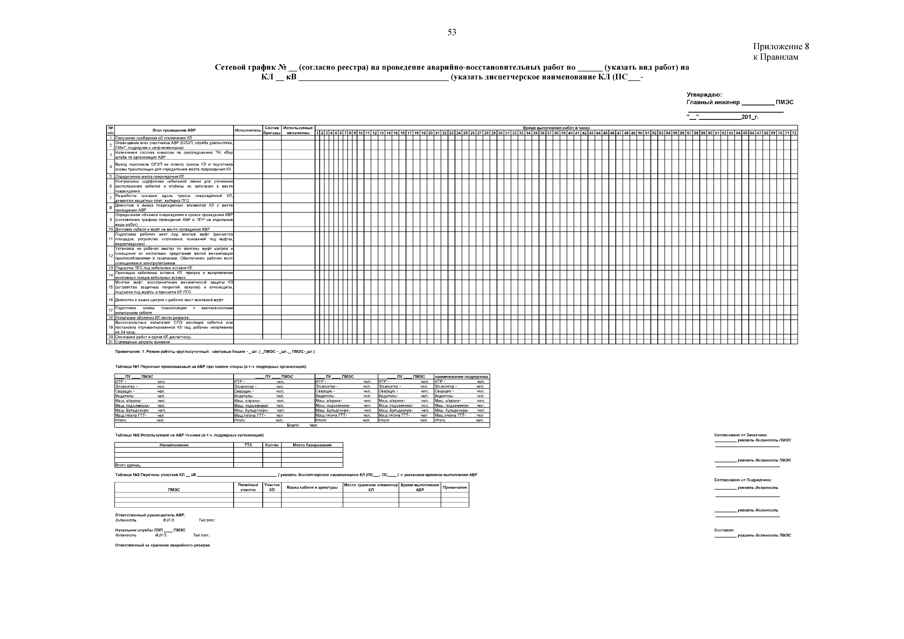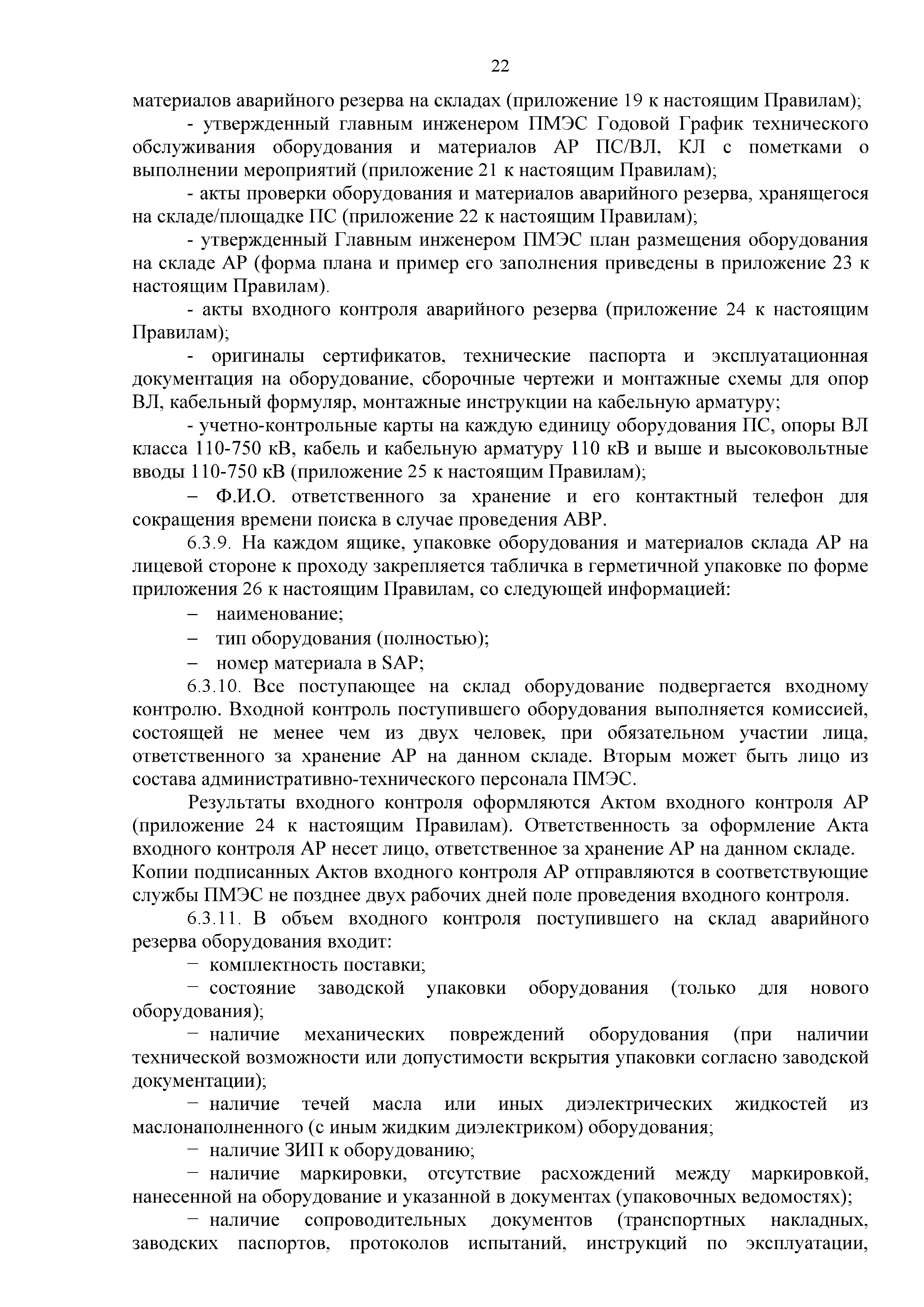 | Оглавление: | 1. Аннотация 1.1. Цель разработки документа 1.2. Краткое содержание документа 1.3. Целевой пользователь документа 1.4. Ответственность за разработку документа 2. Термины и определения 3. Общие положения 4. Общие принципы организации и основные этапы выполнения АВР на электросетевых объектах 5. Разработка филиалами ПАО "ФСК ЕЭС" - МЭС документов в области предотвращения и ликвидации аварий 6. Организация управления аварийным резервом ПАО "ФСК ЕЭС" 6.1. Общая часть 6.2. Комплектование аварийного резерва ПАО "ФСК ЕЭС" 6.3. Хранение и содержание аварийного резерва ПАО "ФСК ЕЭС" 6.4. Текущий контроль состояния АР 6.5. Использование аварийного резерва ПАО "ФСК ЕЭС" при выполнении АВР и работ, направленных на предупреждение аварийных ситуаций 6.6. Восполнение аварийного резерва ПАО "ФСК ЕЭС" 6.7. Ротация оборудования и материалов аварийного резерва ПАО "ФСК ЕЭС" 6.8. Учет оборудования и материалов аварийного резерва 6.9. Истечение срока хранения оборудования и материалов АР 7. Применение РИСЭ ПАО "ФСК ЕЭС" 7.1. Порядок формирования парка РИСЭ 7.2. Порядок учета РИСЭ и ведения необходимой документации 7.3. Приемка РИСЭ в эксплуатацию 7.4. Требования к хранению и содержанию РИСЭ 7.5. Порядок применения РИСЭ при нарушениях электроснабжения 7.6. Порядок учета работы РИСЭ 7.7. Порядок представления РИСЭ другим субъектам электроэнергетики во временное пользование 8. Организация учений и тренировок по отработке взаимодействия при ликвидации аварийных ситуаций в электросетевом комплексе 9. Организация АВР на электросетевых объектах ПАО "ФСК ЕЭС" 9.1. Действия при возникновении и обнаружении мест аварийных повреждений электросетевого оборудования 9.2. Особенности организации и проведения послеаварийных осмотров ВЛ, КВЛ с расчетным местом повреждения в пределах воздушного участка КВЛ с успешным АПВ или РПВ 9.3. Действия при ликвидации аварийных повреждений на электросетевых объектах ПАО "ФСК ЕЭС" 9.4. Действия при ликвидации аварийных повреждений ОАО "Электросетьсервис ЕНЭС" или внешним подрядчиком 9.5. Требования к сдаче-приемке объекта после аварийно-восстановительных работ 9.6. Порядок привлечения сил и средств филиалов ПАО "ФСК ЕЭС" - МЭС для ликвидации аварийных повреждений на объектах электросетевых компаний, функционирующих на одноименных территориях 10. Организационные мероприятия по ликвидации массовых отключений электросетевых объектов Приложение 1. Предельные сроки выполнения мероприятий по организации АВР Приложение 2. Порядок и сроки представления документации в ПАО "ФСК ЕЭС" и ПАО "Россети" Приложение 3. Информация о привлечении к АВР дополнительных сил и средств (других ДО ПАО "Россети", подрядных организаций), а также информации о выполнении АВР собственными силами на электросетевых объектах иных собственников (кроме ДО ПАО "Россети") в рамках оказания содействия в проведении АВР Приложение 4. Информация о зонах покрытия радиотелефонной связи стандарта GSM и спутниковой связи МЭС Приложение 5. Наличие, распределение и состояние автотранспортных средств и механизмов филиала ПАО "ФСК ЕЭС" - МЭС Приложение 6. Информация о наличии и местах размещения ММПС филиала ПАО "ФСК ЕЭС" - МЭС Приложение 7. Сетевой график на проведение аварийно-востановительных работ по замене промежуточной (или анкерной) опоры на ВЛ Приложение 8. Сетевой график на проведение ава