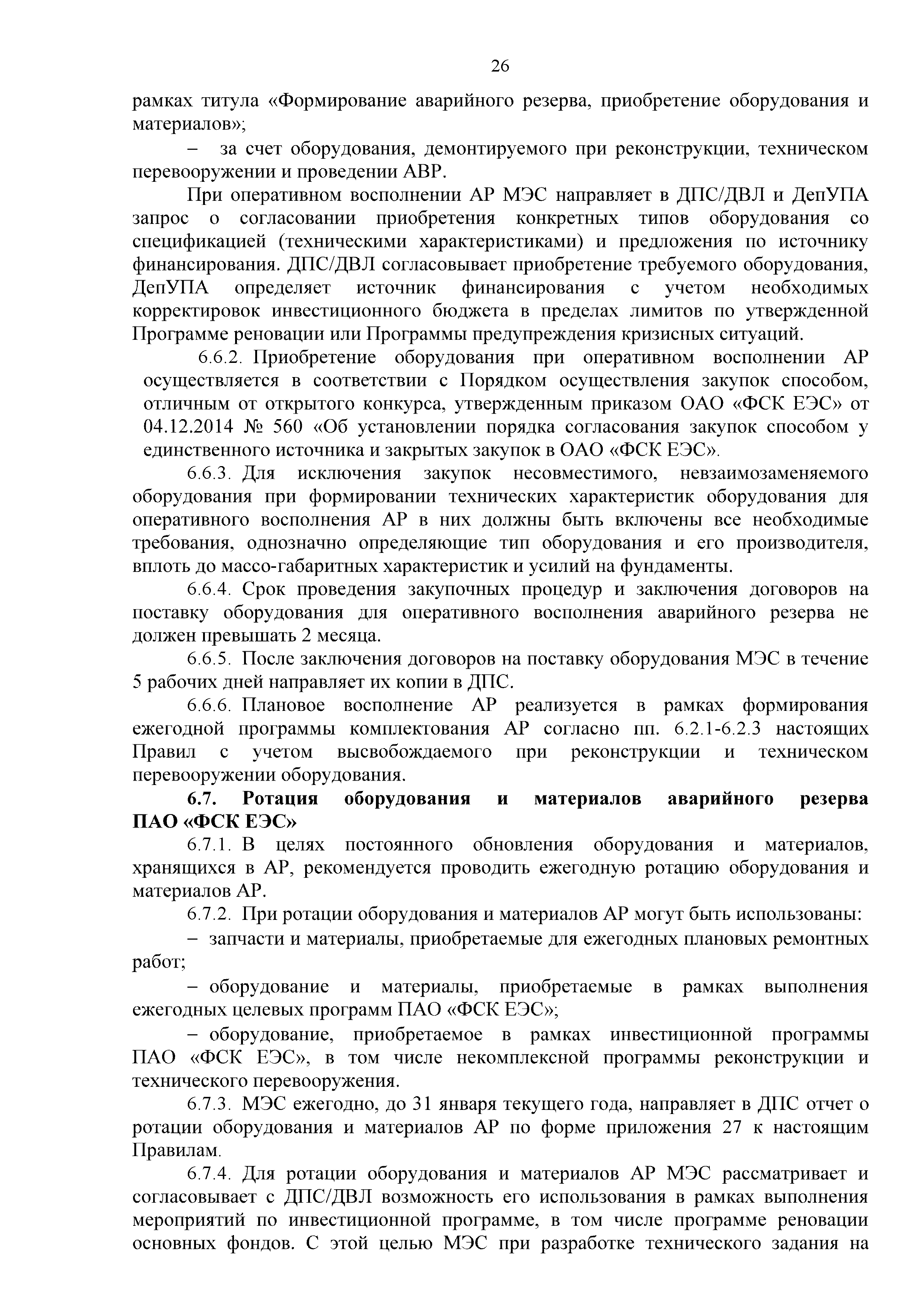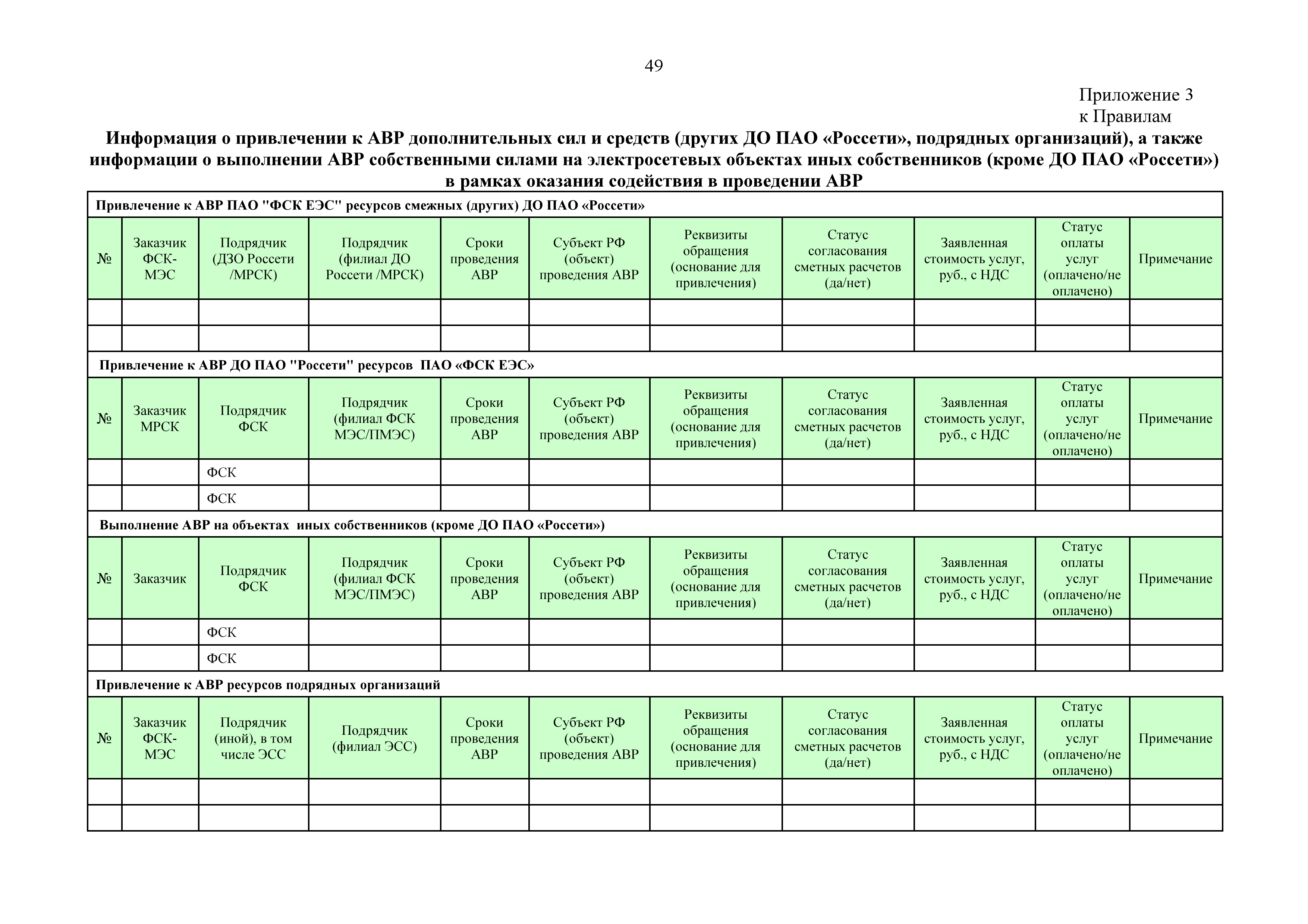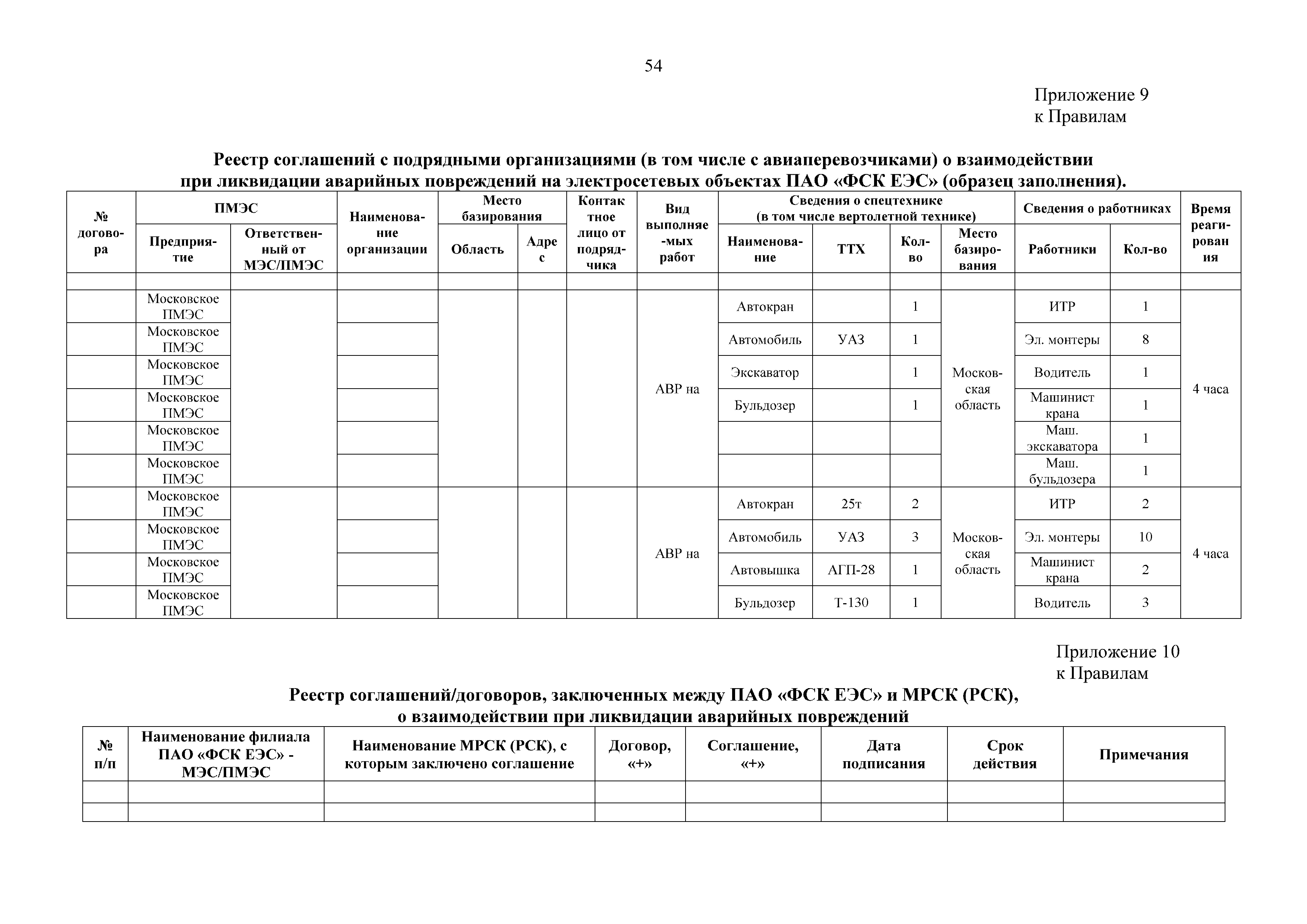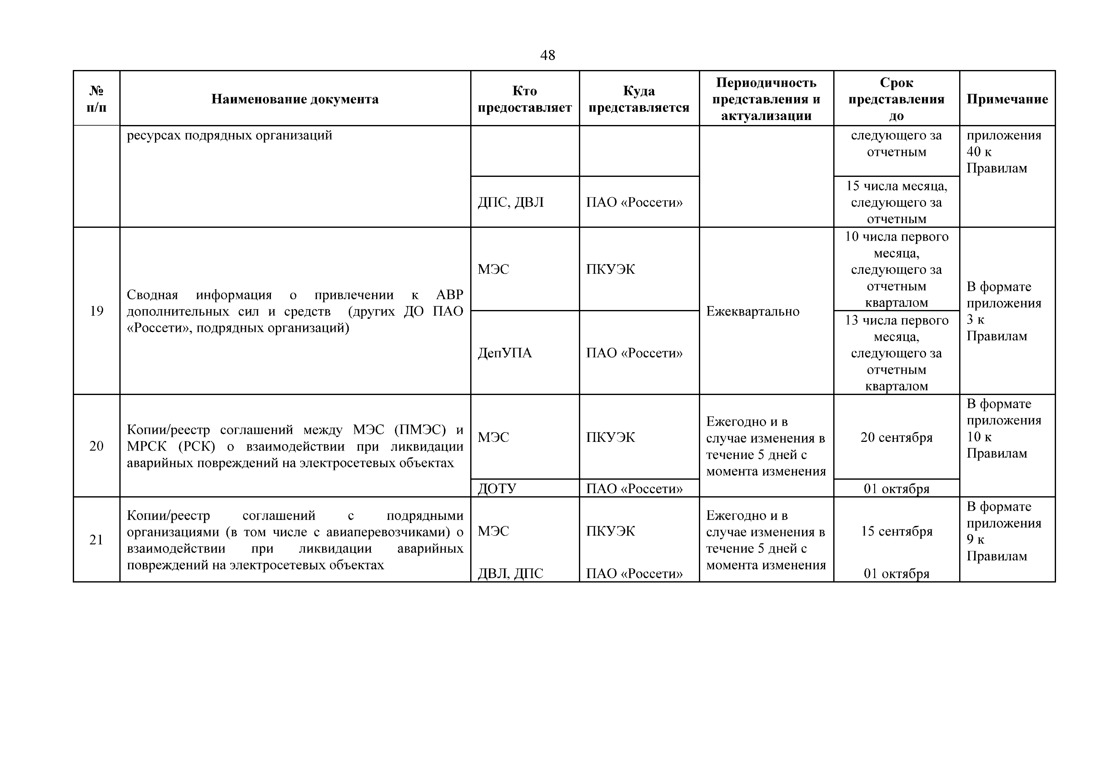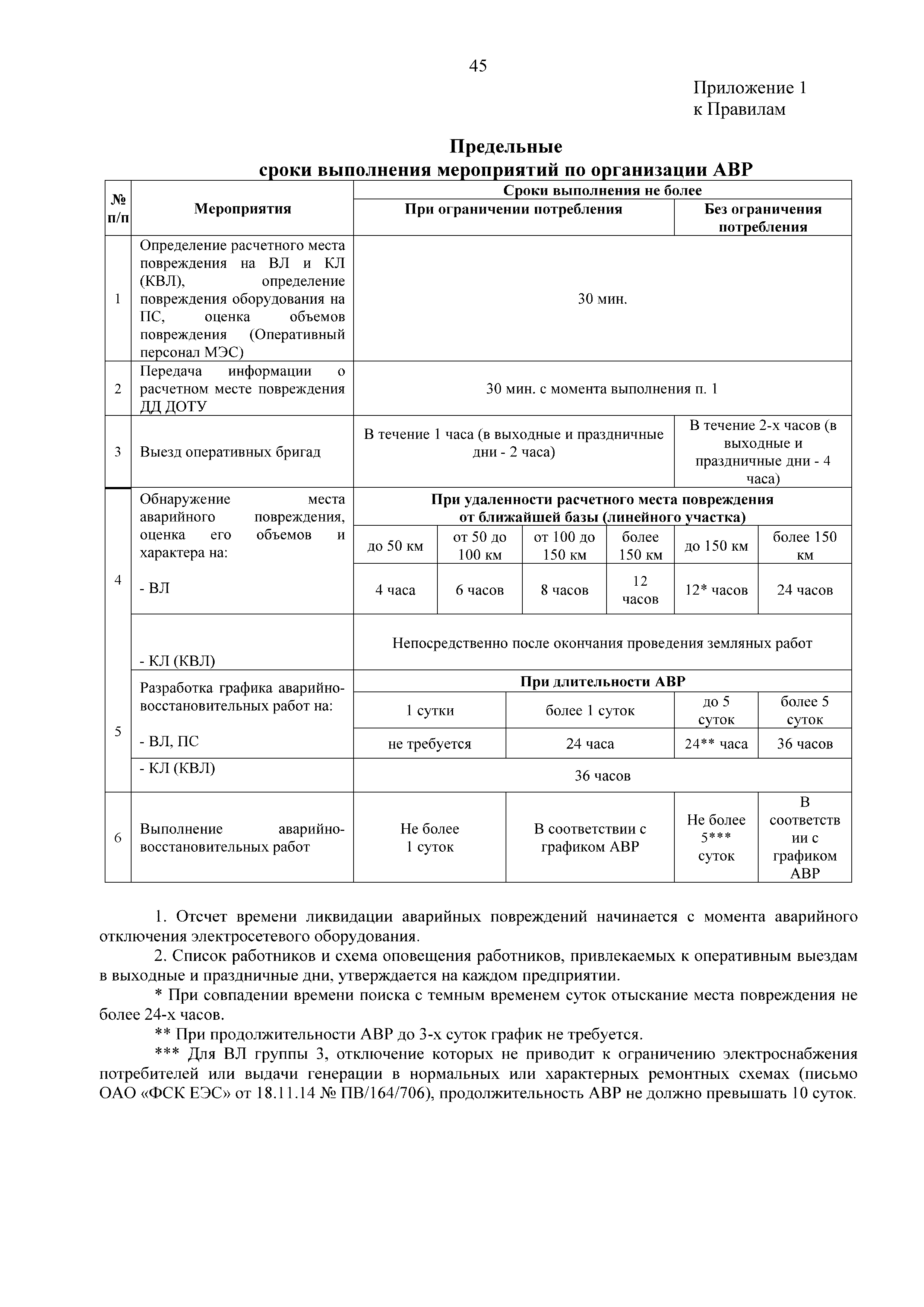 | Оглавление: | 1. Аннотация 1.1. Цель разработки документа 1.2. Краткое содержание документа 1.3. Целевой пользователь документа 1.4. Ответственность за разработку документа 2. Термины и определения 3. Общие положения 4. Общие принципы организации и основные этапы выполнения АВР на электросетевых объектах 5. Разработка филиалами ПАО "ФСК ЕЭС" - МЭС документов в области предотвращения и ликвидации аварий 6. Организация управления аварийным резервом ПАО "ФСК ЕЭС" 6.1. Общая часть 6.2. Комплектование аварийного резерва ПАО "ФСК ЕЭС" 6.3. Хранение и содержание аварийного резерва ПАО "ФСК ЕЭС" 6.4. Текущий контроль состояния АР 6.5. Использование аварийного резерва ПАО "ФСК ЕЭС" при выполнении АВР и работ, направленных на предупреждение аварийных ситуаций 6.6. Восполнение аварийного резерва ПАО "ФСК ЕЭС" 6.7. Ротация оборудования и материалов аварийного резерва ПАО "ФСК ЕЭС" 6.8. Учет оборудования и материалов аварийного резерва 6.9. Истечение срока хранения оборудования и материалов АР 7. Применение РИСЭ ПАО "ФСК ЕЭС" 7.1. Порядок формирования парка РИСЭ 7.2. Порядок учета РИСЭ и ведения необходимой документации 7.3. Приемка РИСЭ в эксплуатацию 7.4. Требования к хранению и содержанию РИСЭ 7.5. Порядок применения РИСЭ при нарушениях электроснабжения 7.6. Порядок учета работы РИСЭ 7.7. Порядок представления РИСЭ другим субъектам электроэнергетики во временное пользование 8. Организация учений и тренировок по отработке взаимодействия при ликвидации аварийных ситуаций в электросетевом комплексе 9. Организация АВР на электросетевых объектах ПАО "ФСК ЕЭС" 9.1. Действия при возникновении и обнаружении мест аварийных повреждений электросетевого оборудования 9.2. Особенности организации и проведения послеаварийных осмотров ВЛ, КВЛ с расчетным местом повреждения в пределах воздушного участка КВЛ с успешным АПВ или РПВ 9.3. Действия при ликвидации аварийных повреждений на электросетевых объектах ПАО "ФСК ЕЭС" 9.4. Действия при ликвидации аварийных повреждений ОАО "Электросетьсервис ЕНЭС" или внешним подрядчиком 9.5. Требования к сдаче-приемке объекта после аварийно-восстановительных работ 9.6. Порядок привлечения сил и средств филиалов ПАО "ФСК ЕЭС" - МЭС для ликвидации аварийных повреждений на объектах электросетевых компаний, функционирующих на одноименных территориях 10. Организационные мероприятия по ликвидации массовых отключений электросетевых объектов Приложение 1. Предельные сроки выполнения мероприятий по организации АВР Приложение 2. Порядок и сроки представления документации в ПАО "ФСК ЕЭС" и ПАО "Россети" Приложение 3. Информация о привлечении к АВР дополнительных сил и средств (других ДО ПАО "Россети", подрядных организаций), а также информации о выполнении АВР собственными силами на электросетевых объектах иных собственников (кроме ДО ПАО "Россети") в рамках оказания содействия в проведении АВР Приложение 4. Информация о зонах покрытия радиотелефонной связи стандарта GSM и спутниковой связи МЭС Приложение 5. Наличие, распределение и состояние автотранспортных средств и механизмов филиала ПАО "ФСК ЕЭС" - МЭС Приложение 6. Информация о наличии и местах размещения ММПС филиала ПАО "ФСК ЕЭС" - МЭС Приложение 7. Сетевой график на проведение аварийно-востановительных работ по замене промежуточной (или анкерной) опоры на ВЛ Приложение 8. Сетевой график на проведение ава