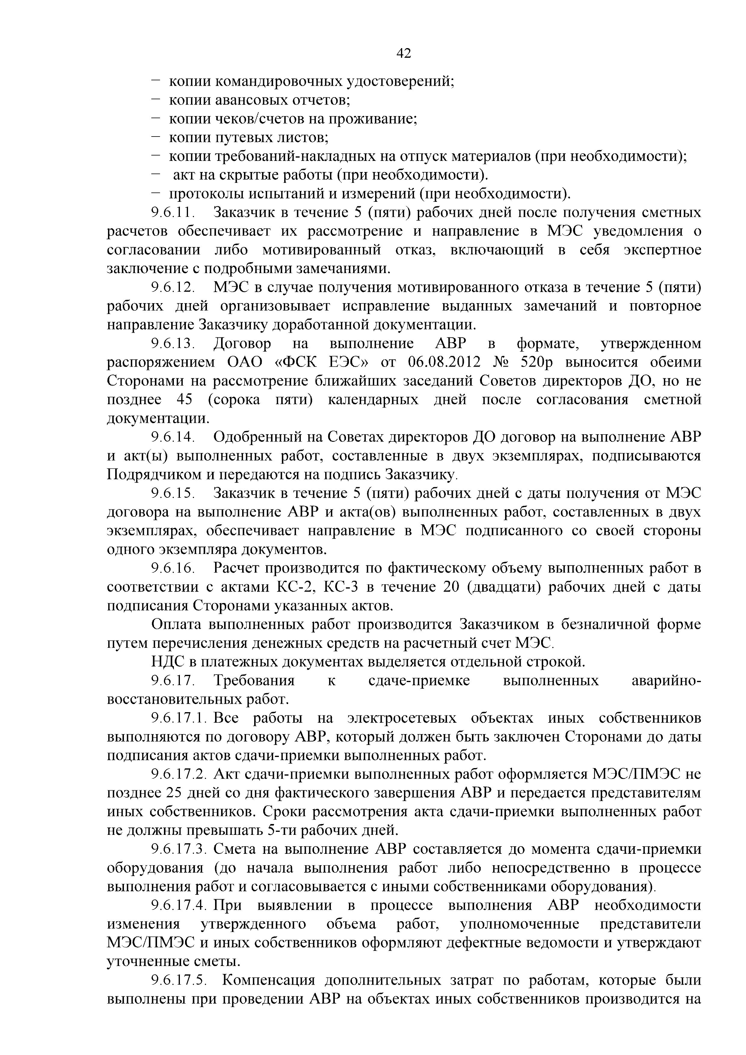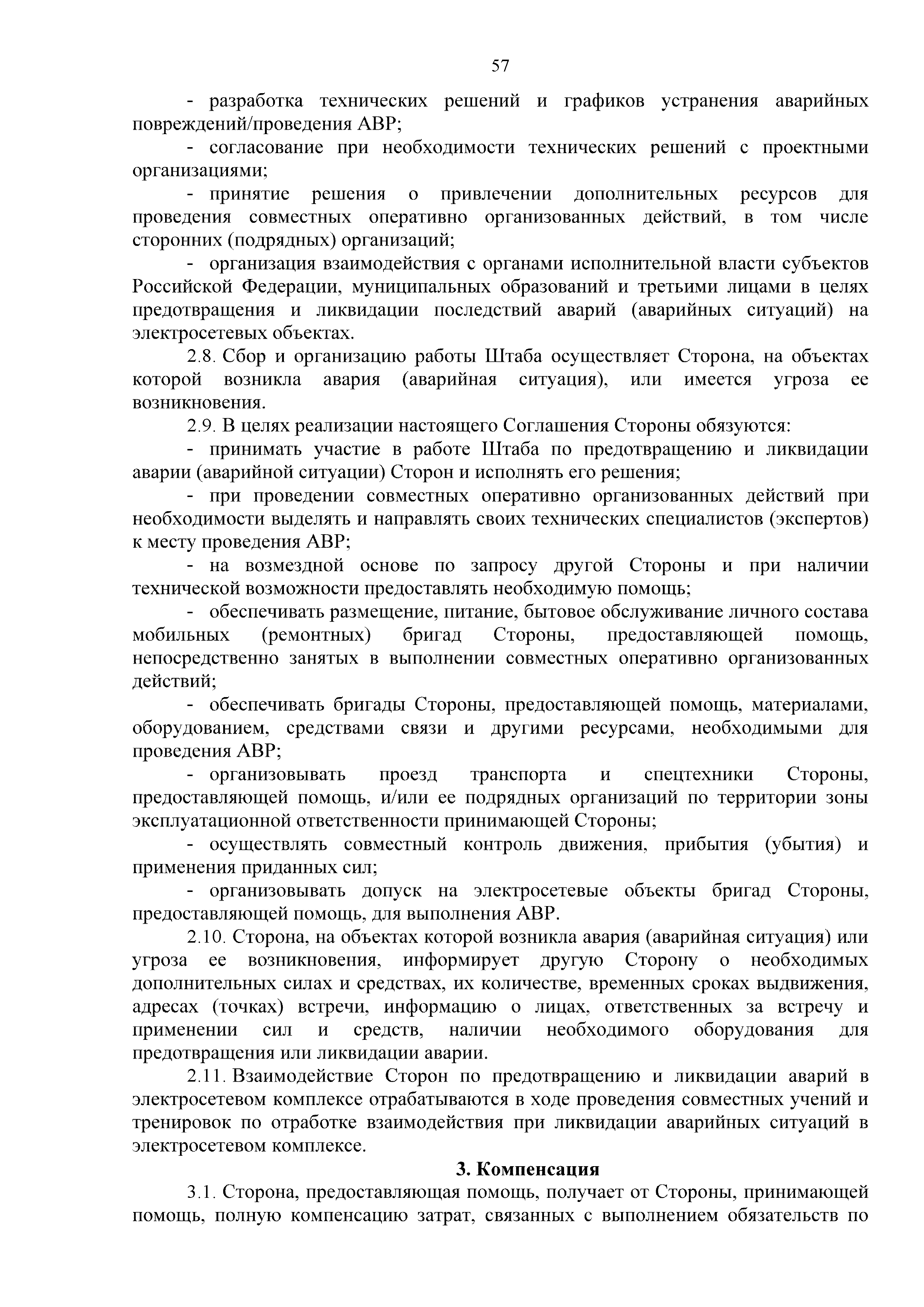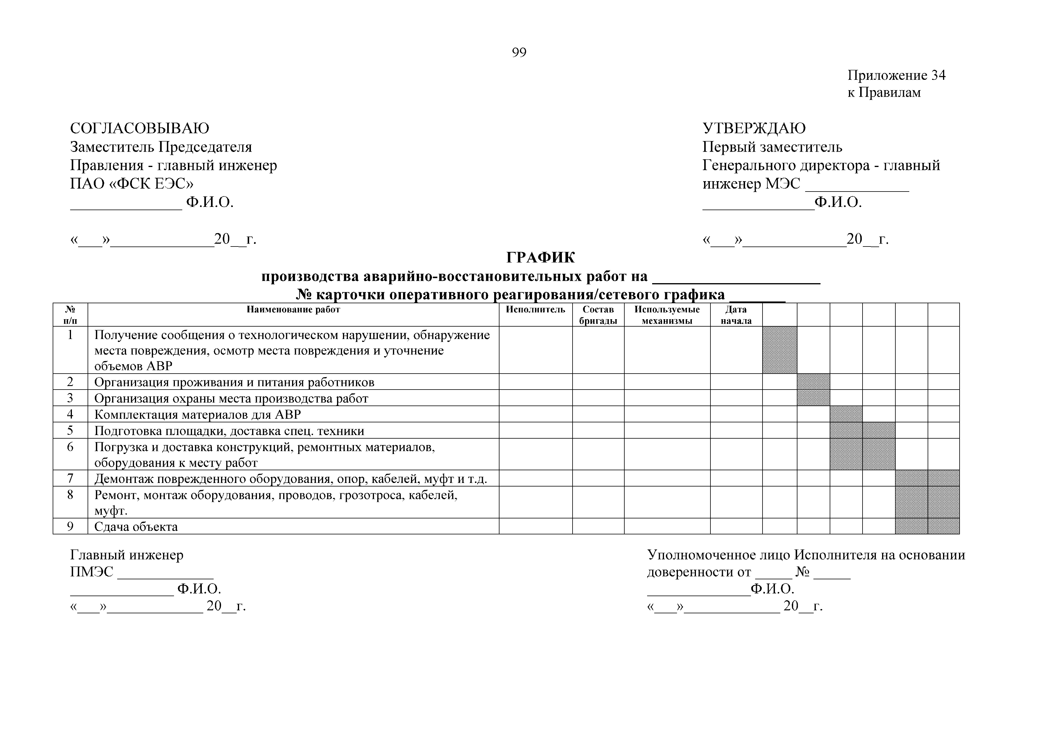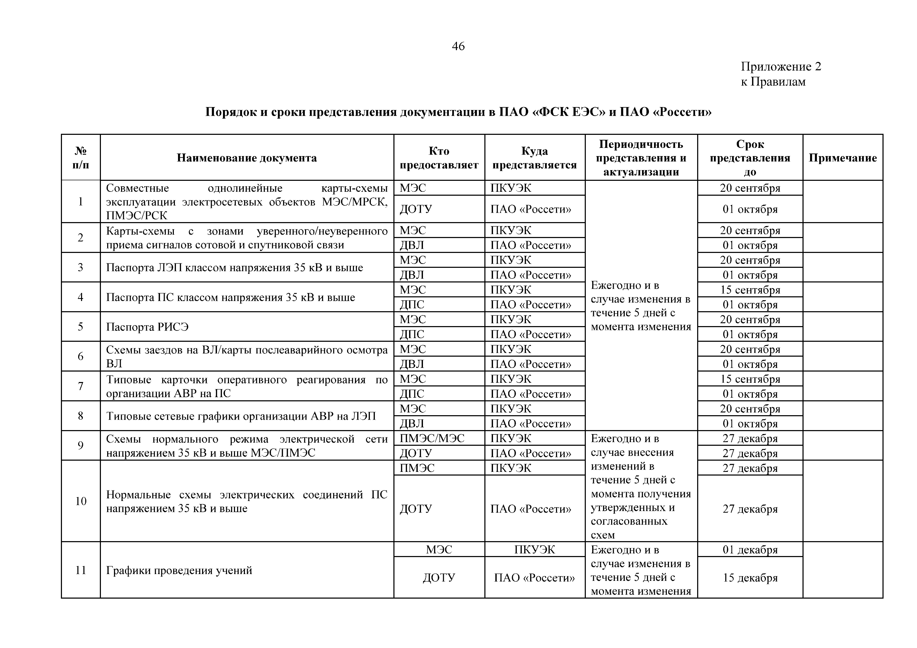 | Оглавление: | 1. Аннотация 1.1. Цель разработки документа 1.2. Краткое содержание документа 1.3. Целевой пользователь документа 1.4. Ответственность за разработку документа 2. Термины и определения 3. Общие положения 4. Общие принципы организации и основные этапы выполнения АВР на электросетевых объектах 5. Разработка филиалами ПАО "ФСК ЕЭС" - МЭС документов в области предотвращения и ликвидации аварий 6. Организация управления аварийным резервом ПАО "ФСК ЕЭС" 6.1. Общая часть 6.2. Комплектование аварийного резерва ПАО "ФСК ЕЭС" 6.3. Хранение и содержание аварийного резерва ПАО "ФСК ЕЭС" 6.4. Текущий контроль состояния АР 6.5. Использование аварийного резерва ПАО "ФСК ЕЭС" при выполнении АВР и работ, направленных на предупреждение аварийных ситуаций 6.6. Восполнение аварийного резерва ПАО "ФСК ЕЭС" 6.7. Ротация оборудования и материалов аварийного резерва ПАО "ФСК ЕЭС" 6.8. Учет оборудования и материалов аварийного резерва 6.9. Истечение срока хранения оборудования и материалов АР 7. Применение РИСЭ ПАО "ФСК ЕЭС" 7.1. Порядок формирования парка РИСЭ 7.2. Порядок учета РИСЭ и ведения необходимой документации 7.3. Приемка РИСЭ в эксплуатацию 7.4. Требования к хранению и содержанию РИСЭ 7.5. Порядок применения РИСЭ при нарушениях электроснабжения 7.6. Порядок учета работы РИСЭ 7.7. Порядок представления РИСЭ другим субъектам электроэнергетики во временное пользование 8. Организация учений и тренировок по отработке взаимодействия при ликвидации аварийных ситуаций в электросетевом комплексе 9. Организация АВР на электросетевых объектах ПАО "ФСК ЕЭС" 9.1. Действия при возникновении и обнаружении мест аварийных повреждений электросетевого оборудования 9.2. Особенности организации и проведения послеаварийных осмотров ВЛ, КВЛ с расчетным местом повреждения в пределах воздушного участка КВЛ с успешным АПВ или РПВ 9.3. Действия при ликвидации аварийных повреждений на электросетевых объектах ПАО "ФСК ЕЭС" 9.4. Действия при ликвидации аварийных повреждений ОАО "Электросетьсервис ЕНЭС" или внешним подрядчиком 9.5. Требования к сдаче-приемке объекта после аварийно-восстановительных работ 9.6. Порядок привлечения сил и средств филиалов ПАО "ФСК ЕЭС" - МЭС для ликвидации аварийных повреждений на объектах электросетевых компаний, функционирующих на одноименных территориях 10. Организационные мероприятия по ликвидации массовых отключений электросетевых объектов Приложение 1. Предельные сроки выполнения мероприятий по организации АВР Приложение 2. Порядок и сроки представления документации в ПАО "ФСК ЕЭС" и ПАО "Россети" Приложение 3. Информация о привлечении к АВР дополнительных сил и средств (других ДО ПАО "Россети", подрядных организаций), а также информации о выполнении АВР собственными силами на электросетевых объектах иных собственников (кроме ДО ПАО "Россети") в рамках оказания содействия в проведении АВР Приложение 4. Информация о зонах покрытия радиотелефонной связи стандарта GSM и спутниковой связи МЭС Приложение 5. Наличие, распределение и состояние автотранспортных средств и механизмов филиала ПАО "ФСК ЕЭС" - МЭС Приложение 6. Информация о наличии и местах размещения ММПС филиала ПАО "ФСК ЕЭС" - МЭС Приложение 7. Сетевой график на проведение аварийно-востановительных работ по замене промежуточной (или анкерной) опоры на ВЛ Приложение 8. Сетевой график на проведение ава