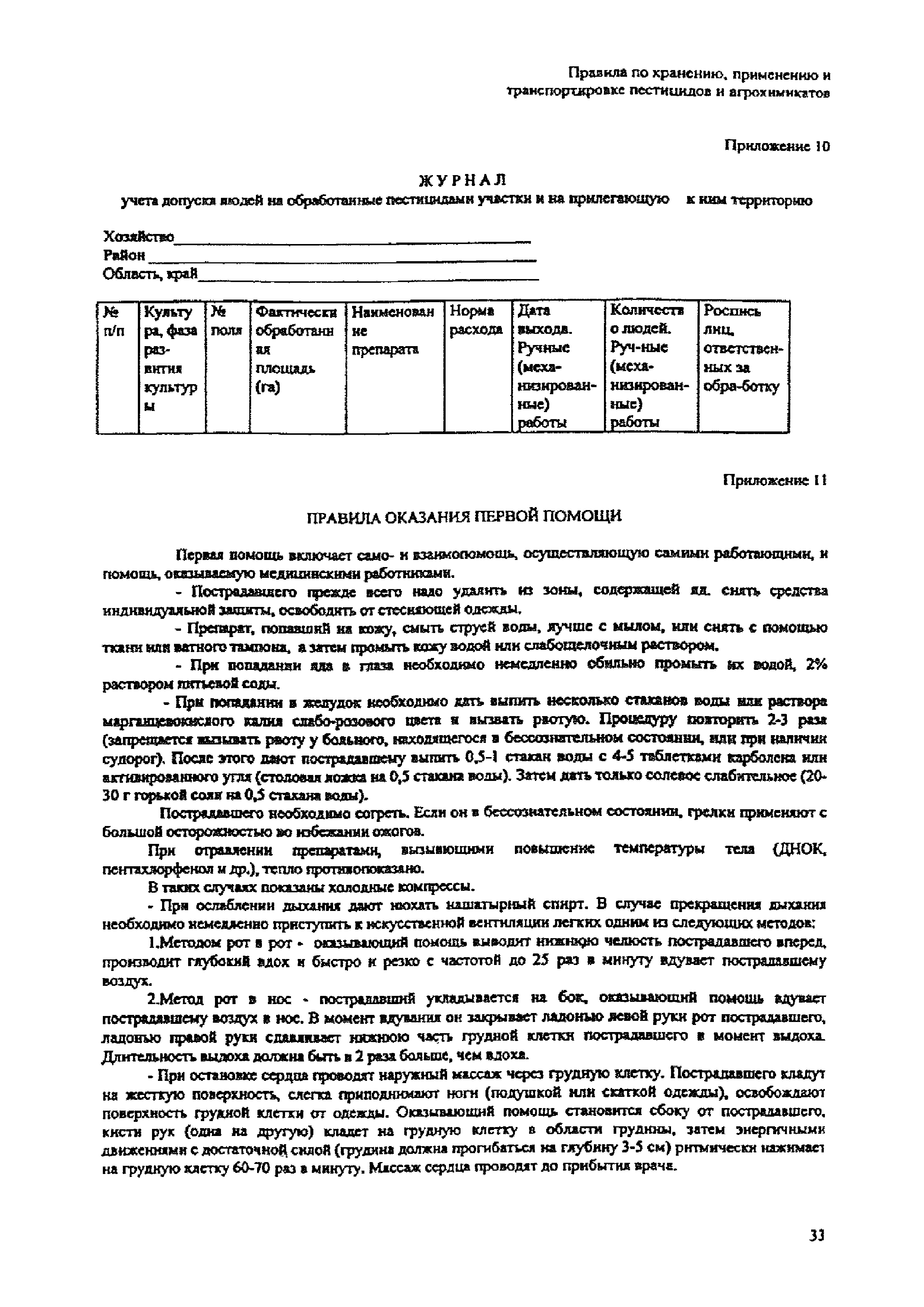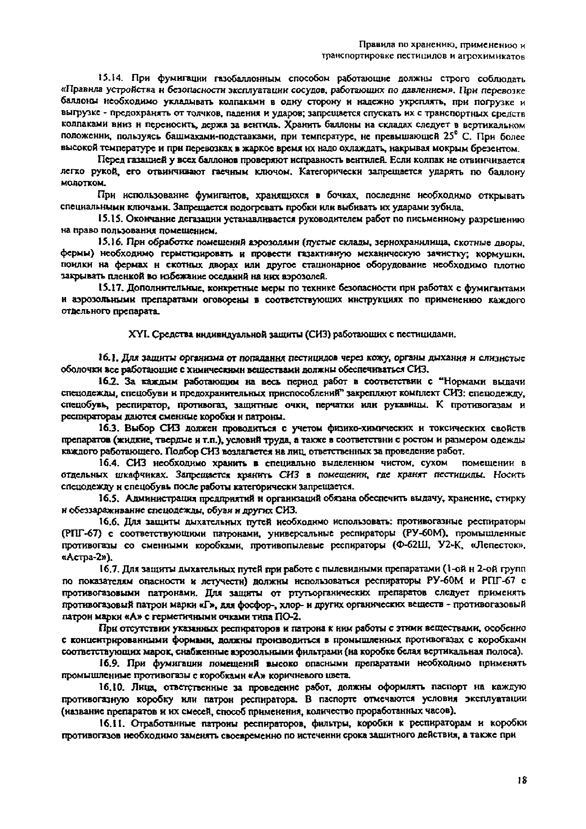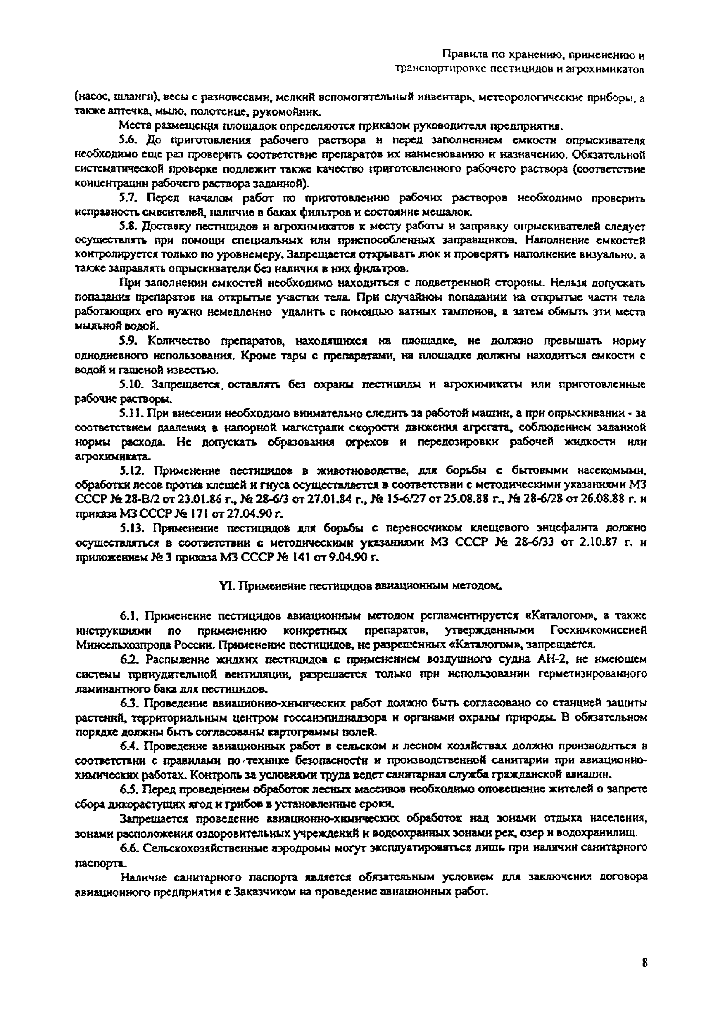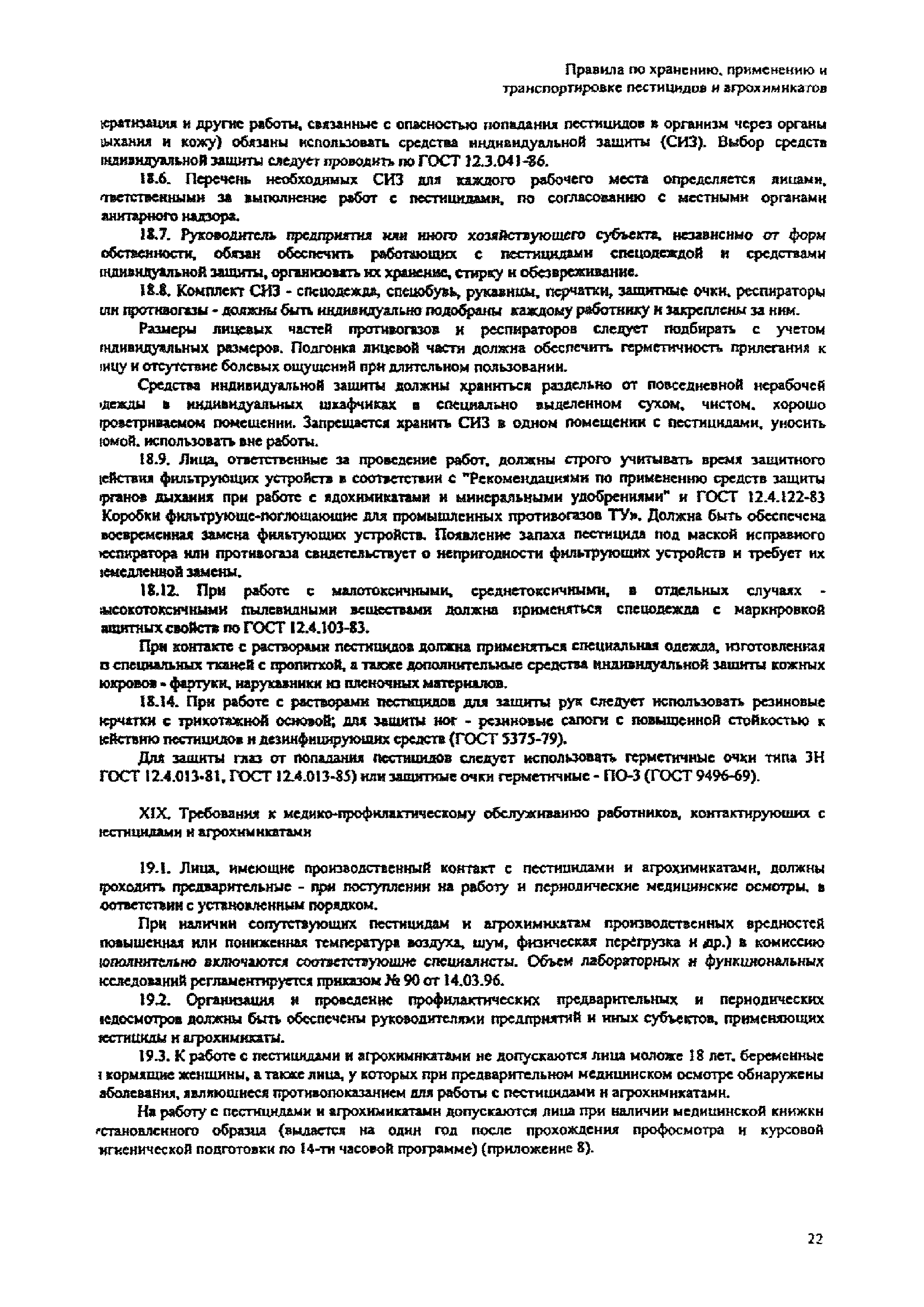 | Оглавление: | I. Область применения II. Общие требования безопасности III. Требования безопасности при хранении и отпуске пестицидов и агрохимикатов IV. Требования безопасности при работе с машинами и аппаратурой V. Требования безопасности при применении наземной аппаратуры для внесения пестицидов и агрохимикатов VI. Применение пестицидов авиационным методом VII. Применение пестицидов и агрохимикатов в теплицах VIII. Требования безопасности при предпосевной обработке семян, их перевозке и высеве IX. Требования безопасности при изготовлении и применении отравленных приманок X. Применение пестицидов в животноводстве XI. Применение пестицидов и агрохимикатов в лесном хозяйстве XII. Применение пестицидов и агрохимикатов для защиты зеленых насаждений населенных пунктов XIII. Применение пестицидов и агрохимикатов на землях железнодорожного транспорта XIV. Дезинсекция и дератизация в жилом секторе XV. Фумигация (газация) помещений и почвы, влажная дезинсекция XVI. Средства индивидуальной защиты (СИЗ) работающих с пестицидами XVII. Требования безопасности при обезвреживании транспортных средств, аппаратуры, тары, помещений и спецодежды XVIII. Требования к организации санитарно-бытового обслуживания XIX. Требования к медико-профилактическому обслуживанию работников, контактирующих с пестицидами и агрохимикатами XX. Мероприятия по охране объектов окружающей среды и сельскохозяйственной продукции (в том числе продуктов переработки) XXI. Транспортировка пестицидов и агрохимикатов Приложение 1. Требование на получение пестицидов со складов Приложение 2. Книга учета прихода-расхода пестицидов по складу хозяйств Приложение 3. Санитарный паспорт на право обращения с пестицидами и агрохимикатами Приложение 4. Наряд-допуск на выполнение работ с пестицидами и (или) агрохимикатами Приложение 5. Медицинская книжка работающего с пестицидами и агрохимикатами Приложение 6. Журнал учета применения пестицидов и (или) агрохимикатов Приложение 7. Журнал учета протравливания семян Приложение 8. Журнал учета обработок помещений для содержания сельскохозяйственных животных и птицы Приложение 9. Журнал учета обработок пестицидами сельскохозяйственных животных и птицы Приложение 10. Журнал учета допуска людей на обработанные пестицидами участки и на прилегающую к ним территорию Приложение 11. Правила оказания первой помощи Нормативные ссылки |