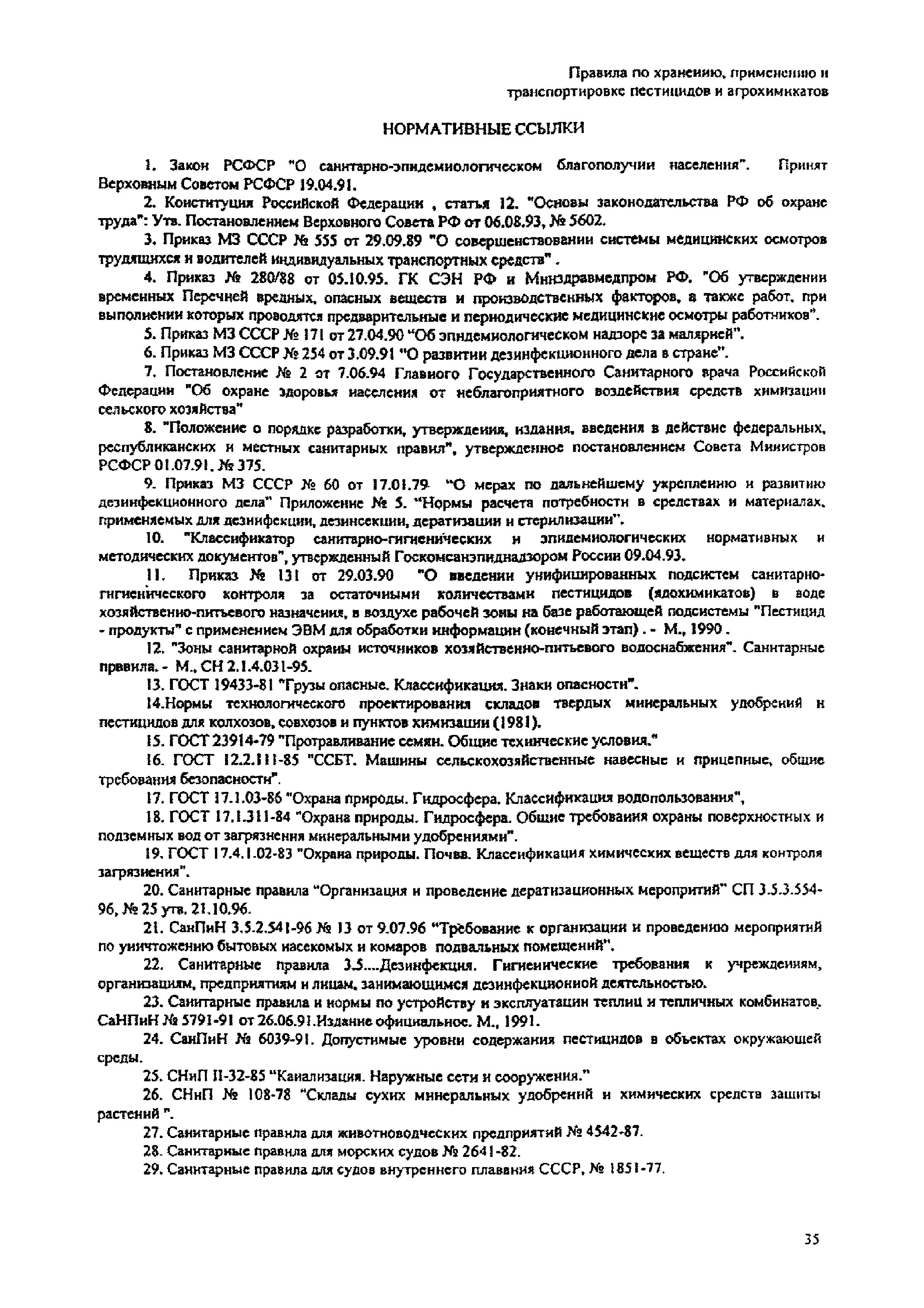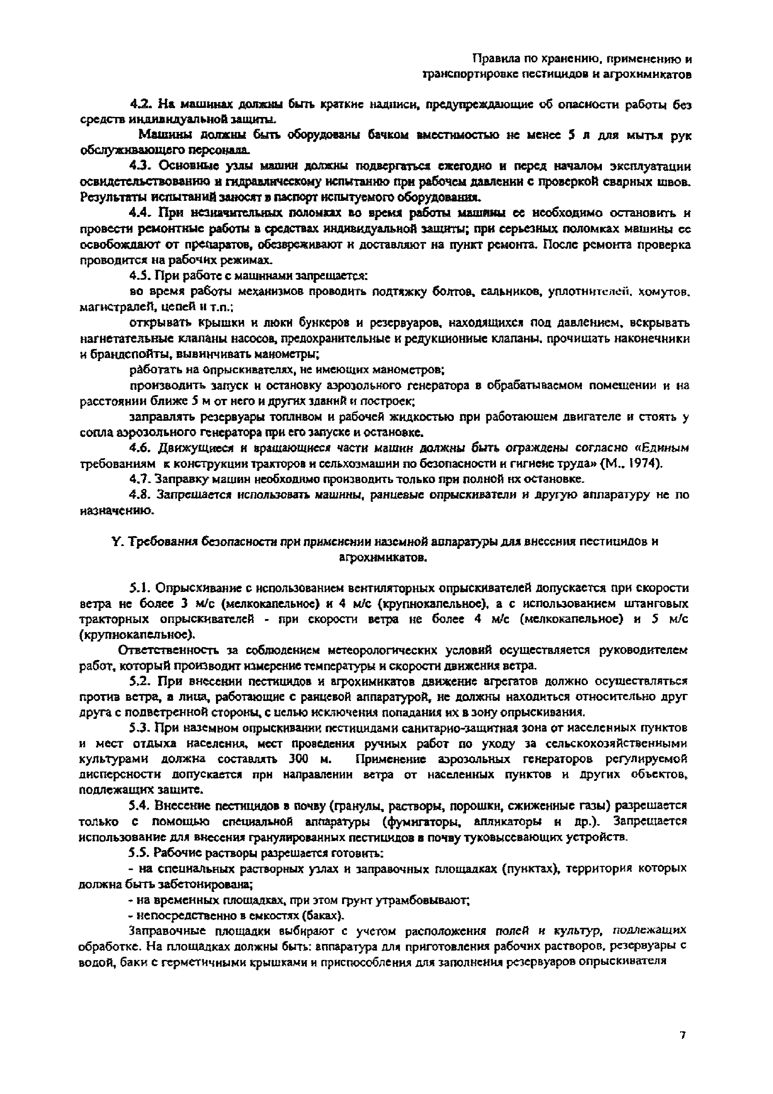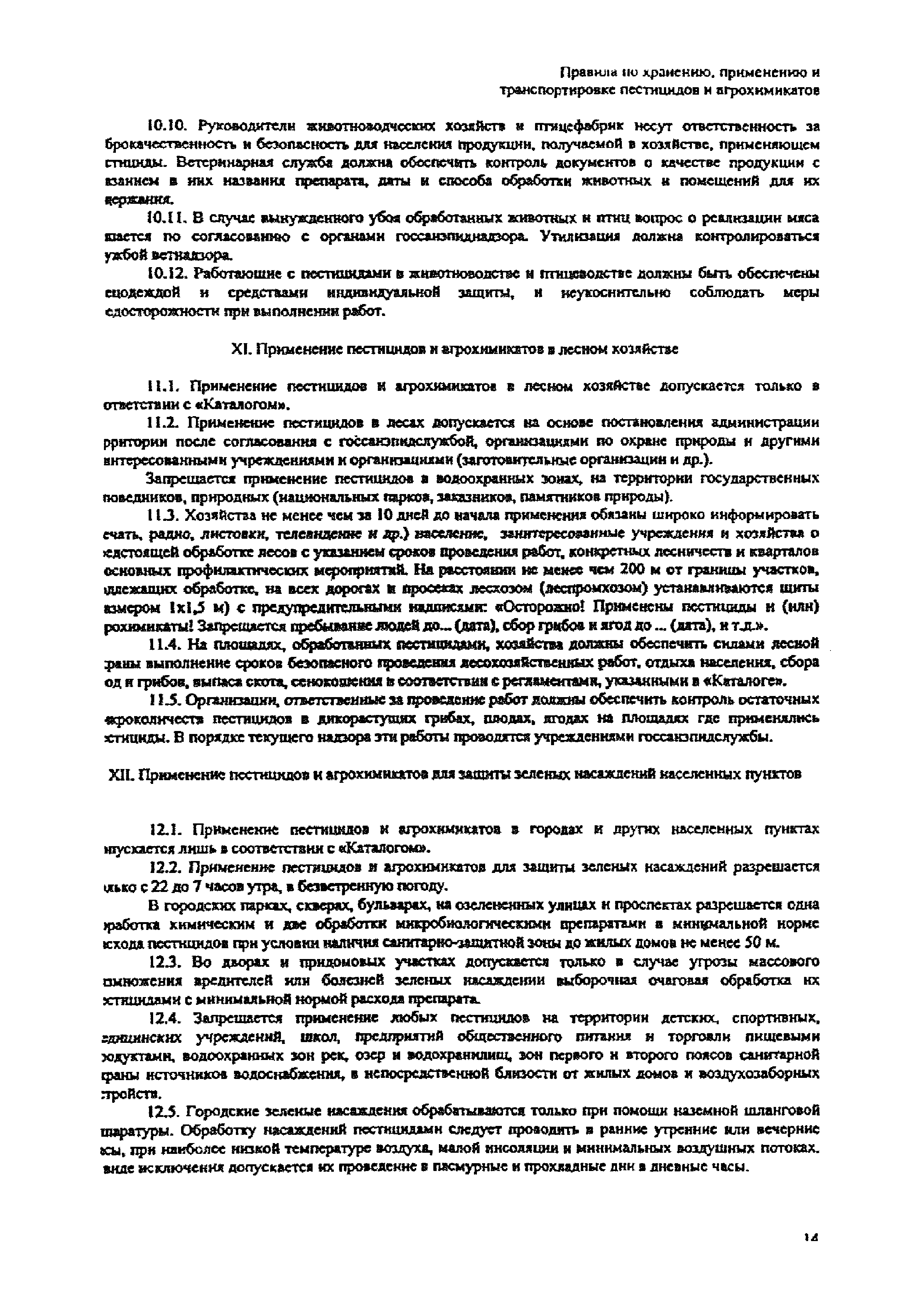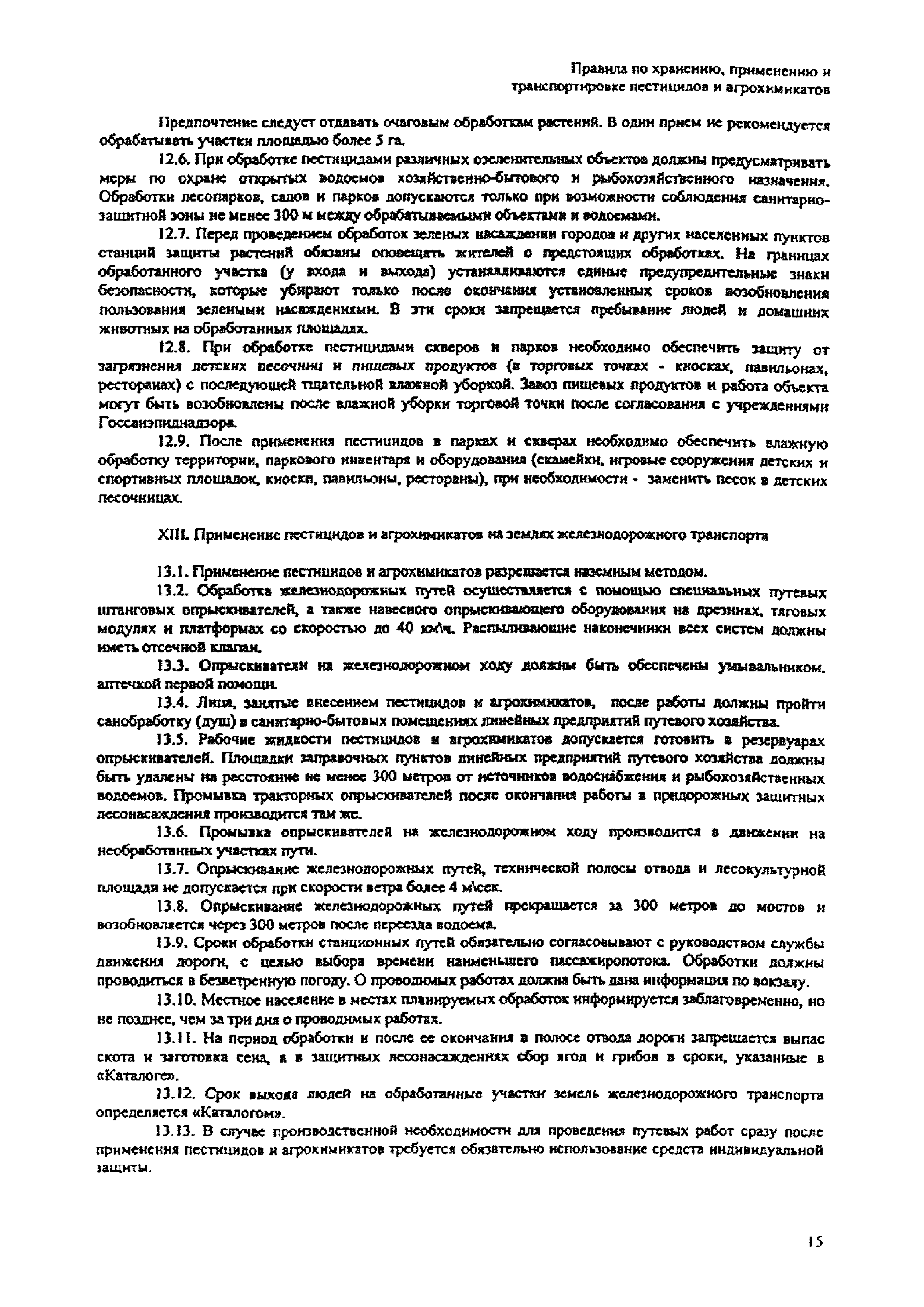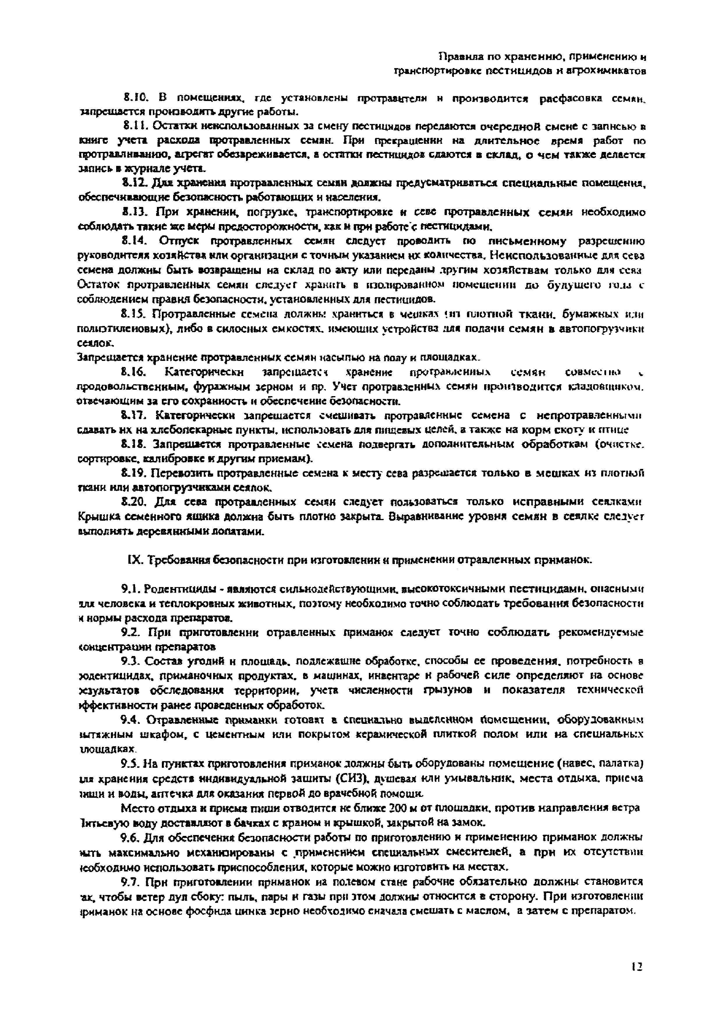 | Оглавление: | I. Область применения II. Общие требования безопасности III. Требования безопасности при хранении и отпуске пестицидов и агрохимикатов IV. Требования безопасности при работе с машинами и аппаратурой V. Требования безопасности при применении наземной аппаратуры для внесения пестицидов и агрохимикатов VI. Применение пестицидов авиационным методом VII. Применение пестицидов и агрохимикатов в теплицах VIII. Требования безопасности при предпосевной обработке семян, их перевозке и высеве IX. Требования безопасности при изготовлении и применении отравленных приманок X. Применение пестицидов в животноводстве XI. Применение пестицидов и агрохимикатов в лесном хозяйстве XII. Применение пестицидов и агрохимикатов для защиты зеленых насаждений населенных пунктов XIII. Применение пестицидов и агрохимикатов на землях железнодорожного транспорта XIV. Дезинсекция и дератизация в жилом секторе XV. Фумигация (газация) помещений и почвы, влажная дезинсекция XVI. Средства индивидуальной защиты (СИЗ) работающих с пестицидами XVII. Требования безопасности при обезвреживании транспортных средств, аппаратуры, тары, помещений и спецодежды XVIII. Требования к организации санитарно-бытового обслуживания XIX. Требования к медико-профилактическому обслуживанию работников, контактирующих с пестицидами и агрохимикатами XX. Мероприятия по охране объектов окружающей среды и сельскохозяйственной продукции (в том числе продуктов переработки) XXI. Транспортировка пестицидов и агрохимикатов Приложение 1. Требование на получение пестицидов со складов Приложение 2. Книга учета прихода-расхода пестицидов по складу хозяйств Приложение 3. Санитарный паспорт на право обращения с пестицидами и агрохимикатами Приложение 4. Наряд-допуск на выполнение работ с пестицидами и (или) агрохимикатами Приложение 5. Медицинская книжка работающего с пестицидами и агрохимикатами Приложение 6. Журнал учета применения пестицидов и (или) агрохимикатов Приложение 7. Журнал учета протравливания семян Приложение 8. Журнал учета обработок помещений для содержания сельскохозяйственных животных и птицы Приложение 9. Журнал учета обработок пестицидами сельскохозяйственных животных и птицы Приложение 10. Журнал учета допуска людей на обработанные пестицидами участки и на прилегающую к ним территорию Приложение 11. Правила оказания первой помощи Нормативные ссылки |