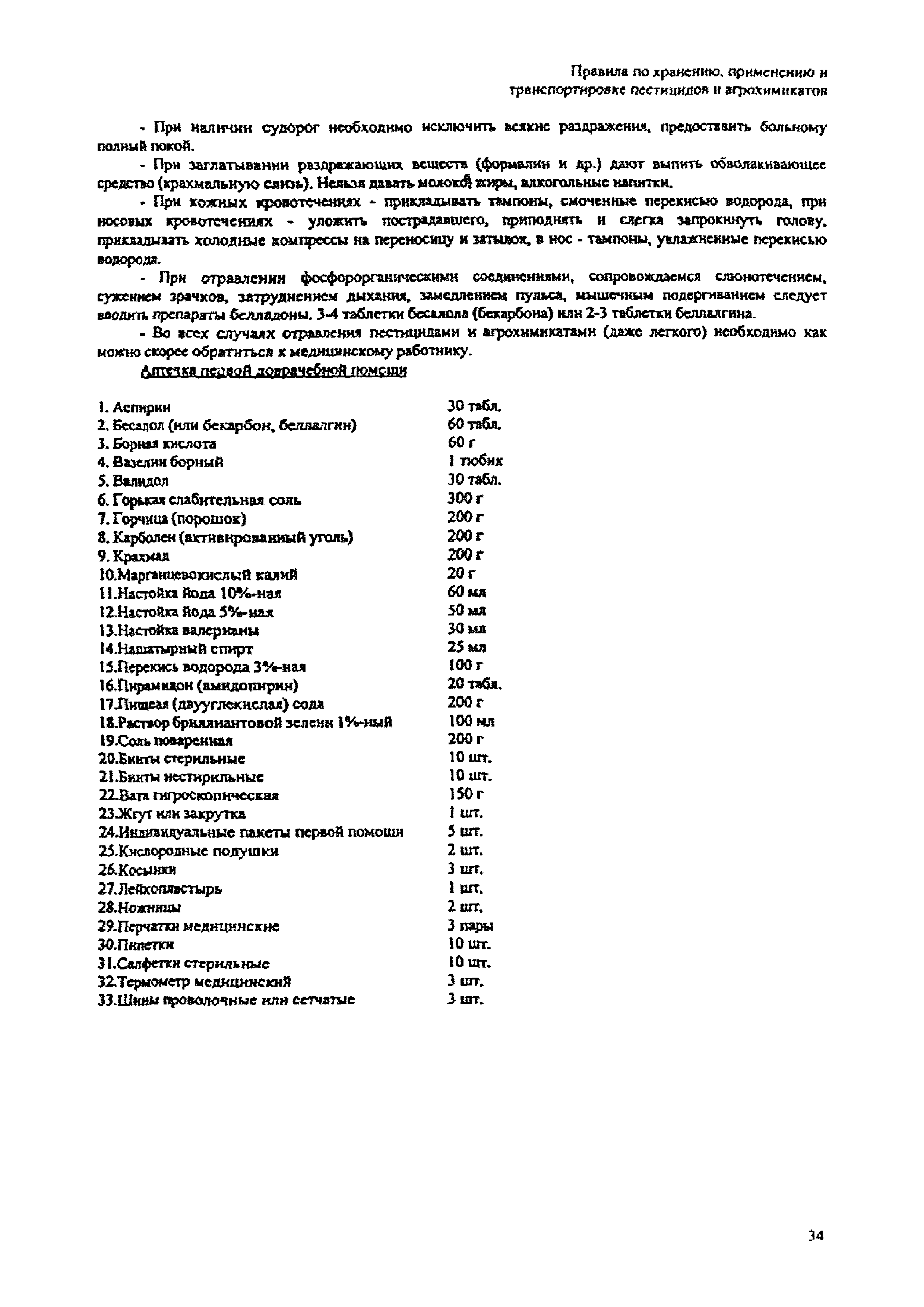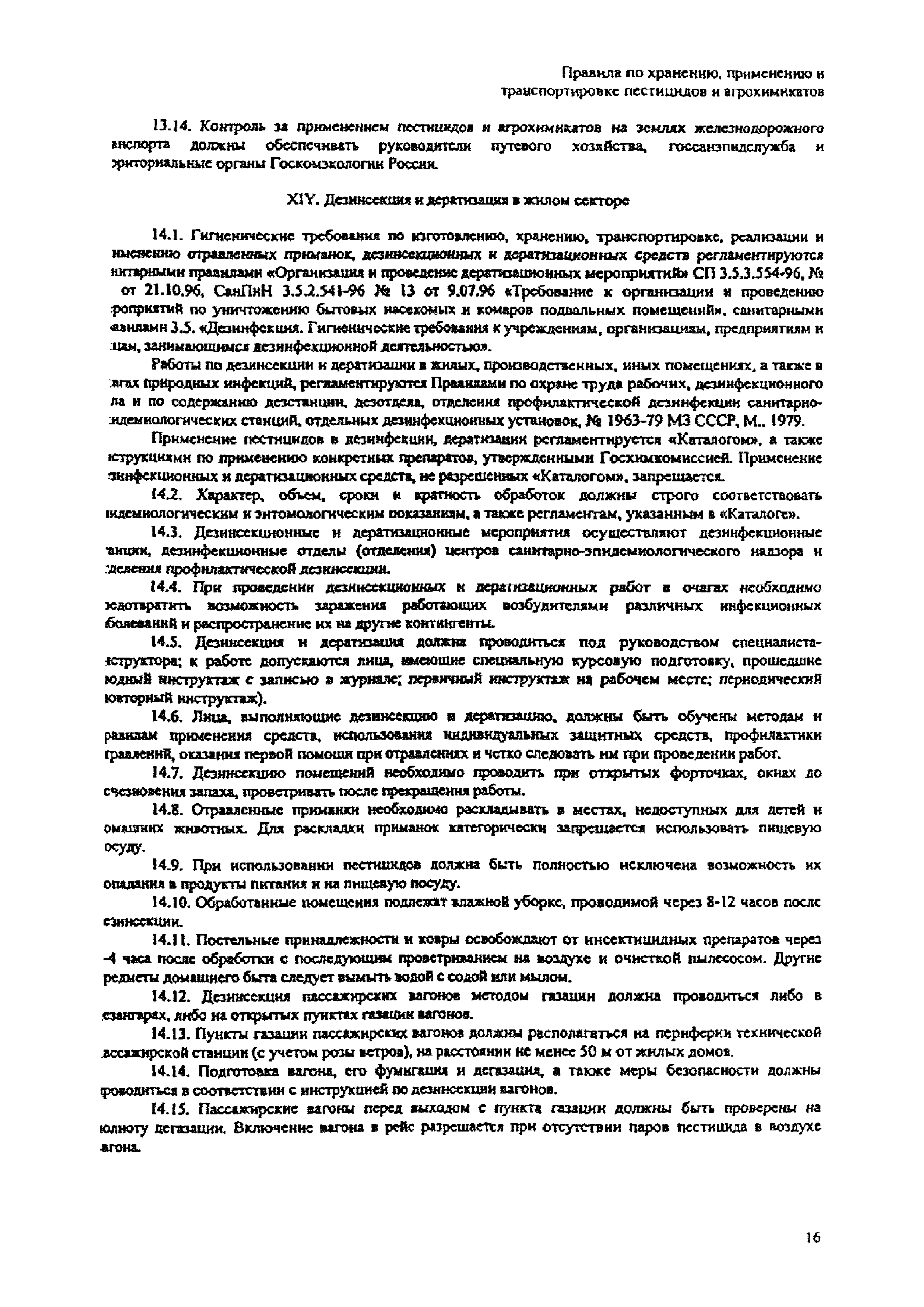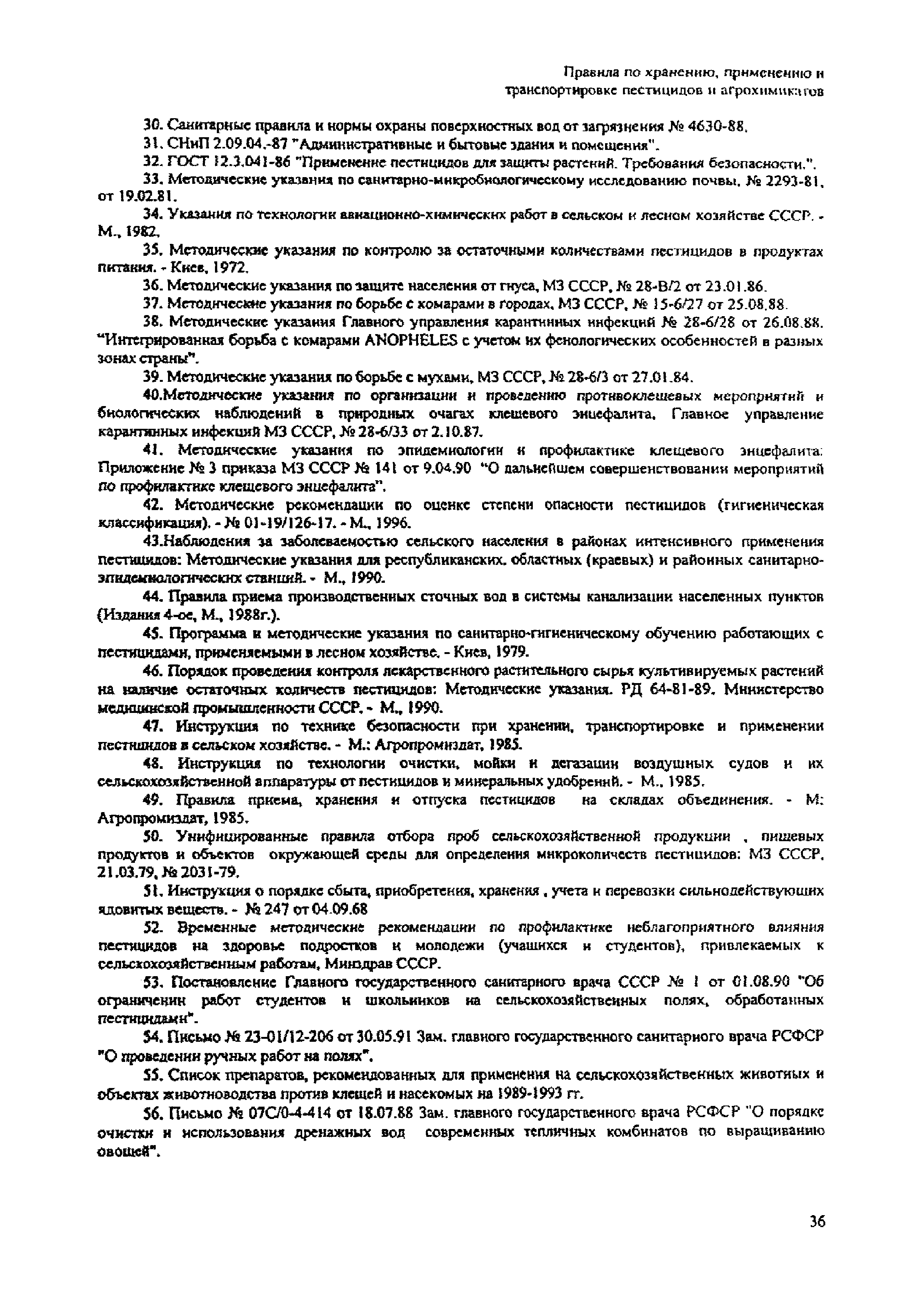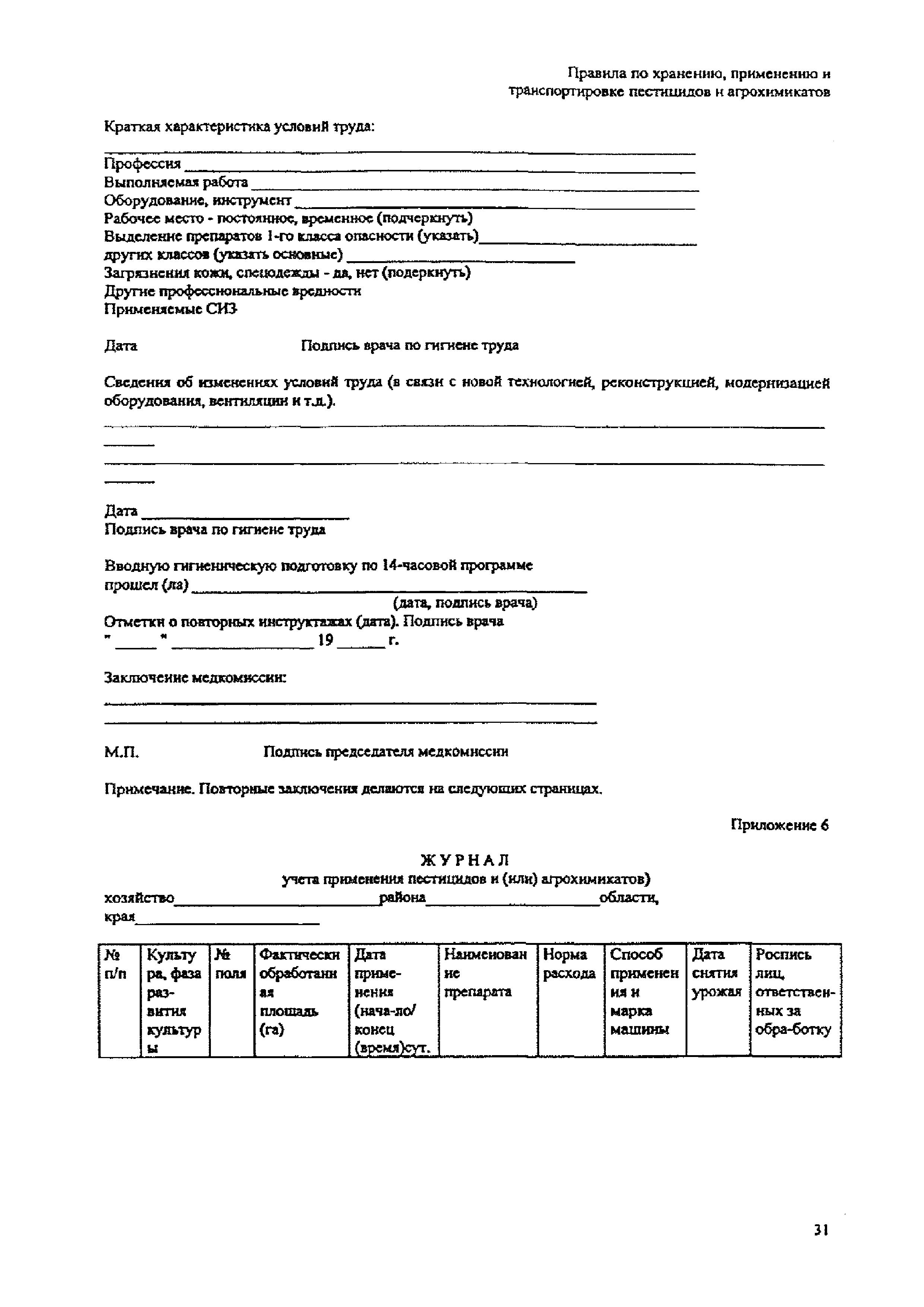 | Оглавление: | I. Область применения II. Общие требования безопасности III. Требования безопасности при хранении и отпуске пестицидов и агрохимикатов IV. Требования безопасности при работе с машинами и аппаратурой V. Требования безопасности при применении наземной аппаратуры для внесения пестицидов и агрохимикатов VI. Применение пестицидов авиационным методом VII. Применение пестицидов и агрохимикатов в теплицах VIII. Требования безопасности при предпосевной обработке семян, их перевозке и высеве IX. Требования безопасности при изготовлении и применении отравленных приманок X. Применение пестицидов в животноводстве XI. Применение пестицидов и агрохимикатов в лесном хозяйстве XII. Применение пестицидов и агрохимикатов для защиты зеленых насаждений населенных пунктов XIII. Применение пестицидов и агрохимикатов на землях железнодорожного транспорта XIV. Дезинсекция и дератизация в жилом секторе XV. Фумигация (газация) помещений и почвы, влажная дезинсекция XVI. Средства индивидуальной защиты (СИЗ) работающих с пестицидами XVII. Требования безопасности при обезвреживании транспортных средств, аппаратуры, тары, помещений и спецодежды XVIII. Требования к организации санитарно-бытового обслуживания XIX. Требования к медико-профилактическому обслуживанию работников, контактирующих с пестицидами и агрохимикатами XX. Мероприятия по охране объектов окружающей среды и сельскохозяйственной продукции (в том числе продуктов переработки) XXI. Транспортировка пестицидов и агрохимикатов Приложение 1. Требование на получение пестицидов со складов Приложение 2. Книга учета прихода-расхода пестицидов по складу хозяйств Приложение 3. Санитарный паспорт на право обращения с пестицидами и агрохимикатами Приложение 4. Наряд-допуск на выполнение работ с пестицидами и (или) агрохимикатами Приложение 5. Медицинская книжка работающего с пестицидами и агрохимикатами Приложение 6. Журнал учета применения пестицидов и (или) агрохимикатов Приложение 7. Журнал учета протравливания семян Приложение 8. Журнал учета обработок помещений для содержания сельскохозяйственных животных и птицы Приложение 9. Журнал учета обработок пестицидами сельскохозяйственных животных и птицы Приложение 10. Журнал учета допуска людей на обработанные пестицидами участки и на прилегающую к ним территорию Приложение 11. Правила оказания первой помощи Нормативные ссылки |