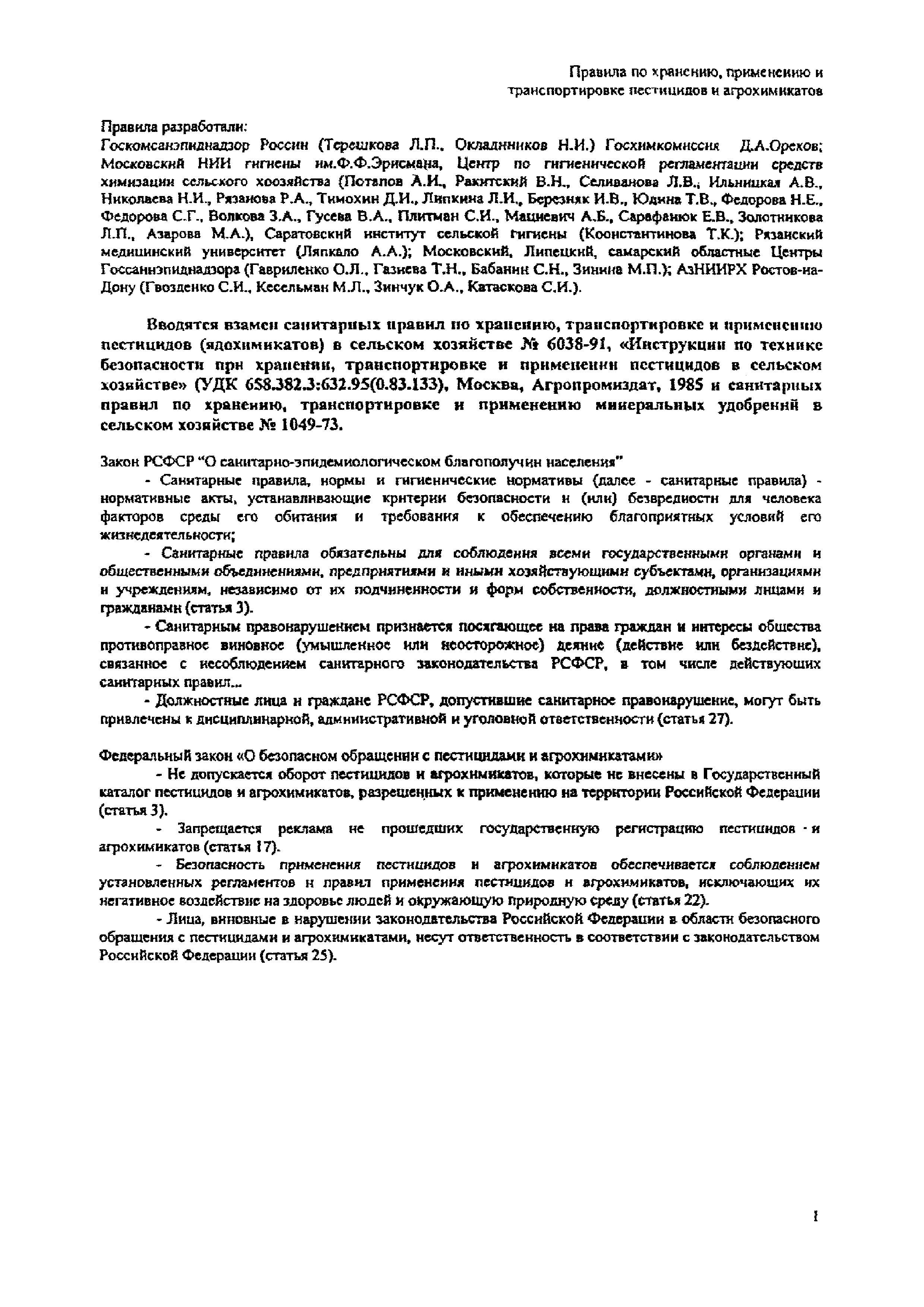 | Разработан: | Госкомсанэпиднадзор России Московский областной центр госсанэпиднадзора Рязанский медицинский университет Московский НИИ гигиены им. Ф.Ф. Эрисмана Центр по гигиенической регламентации средств химизации сельского хозяйства Саратовский институт сельской гигиены Липецкий областной Центр Госсанэпиднадзора Самарский областной Центр Госсанэпиднадзора АзНИИРХ Ростов-на-Дону |