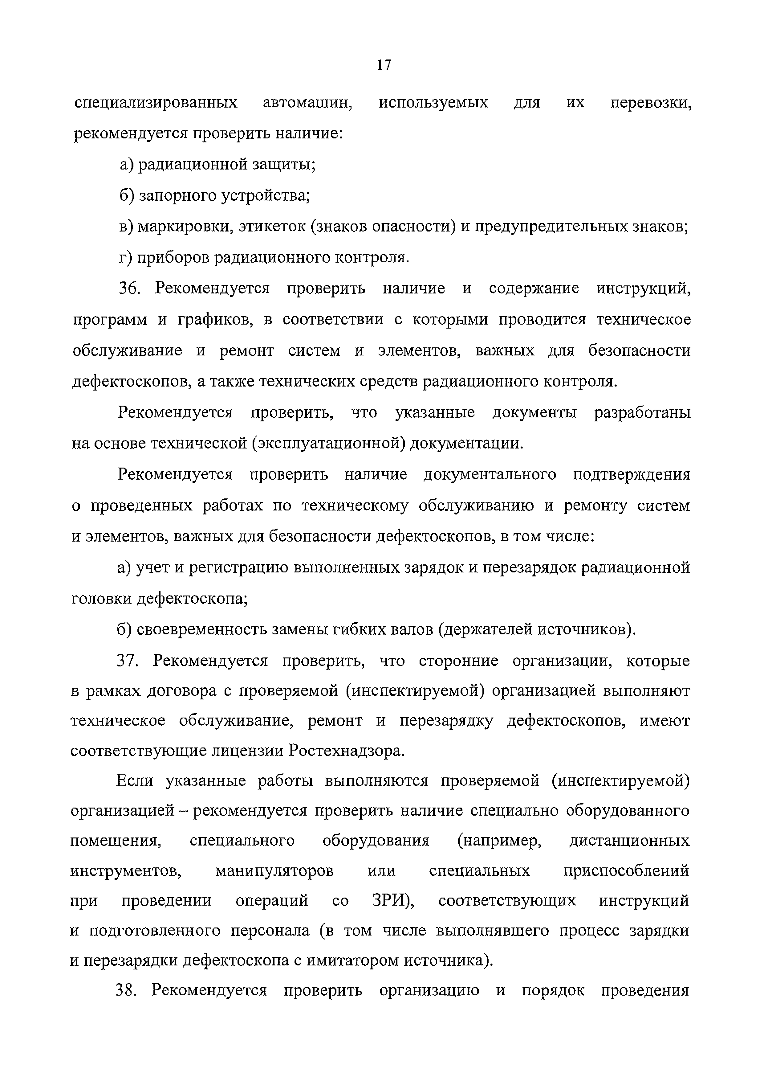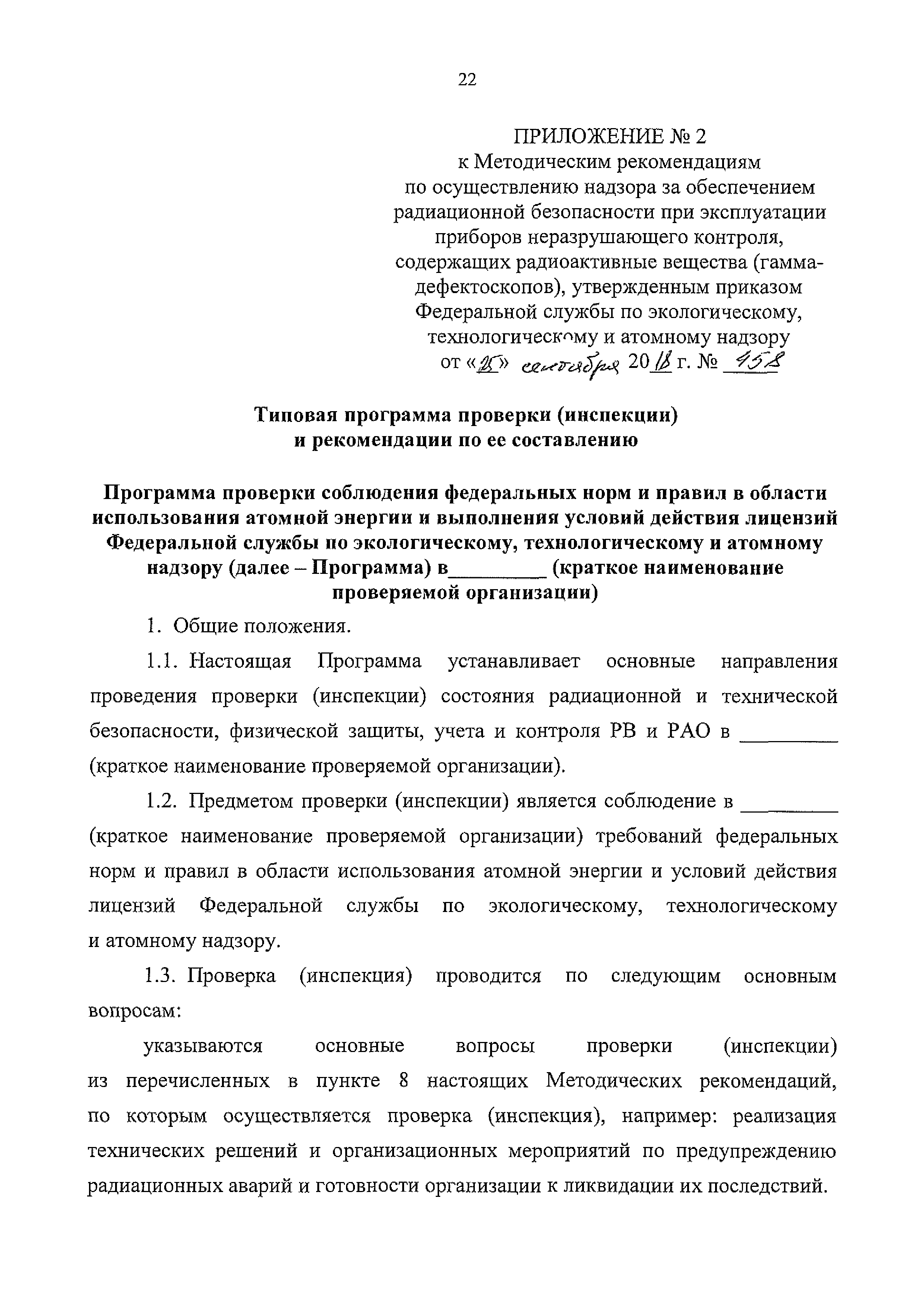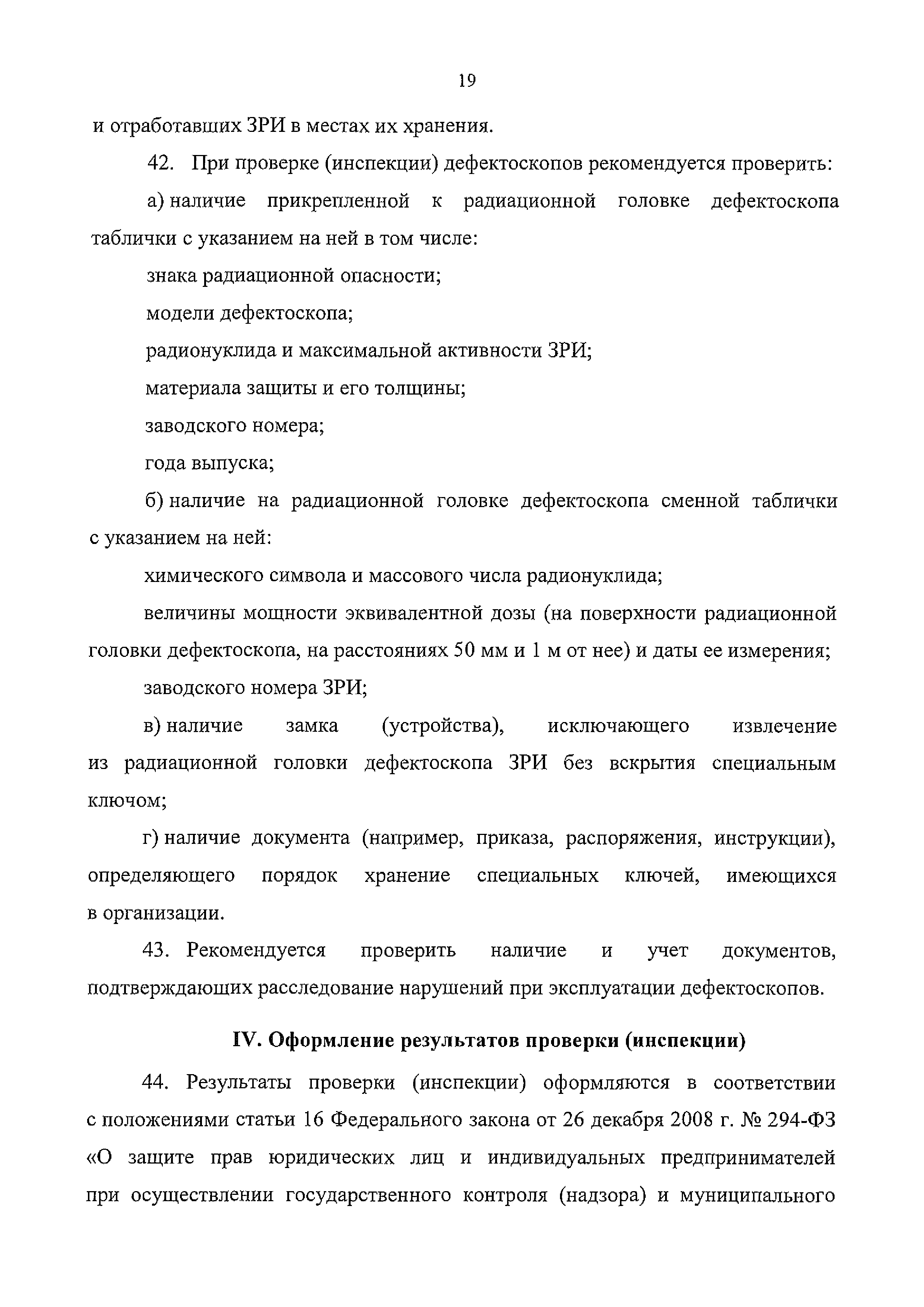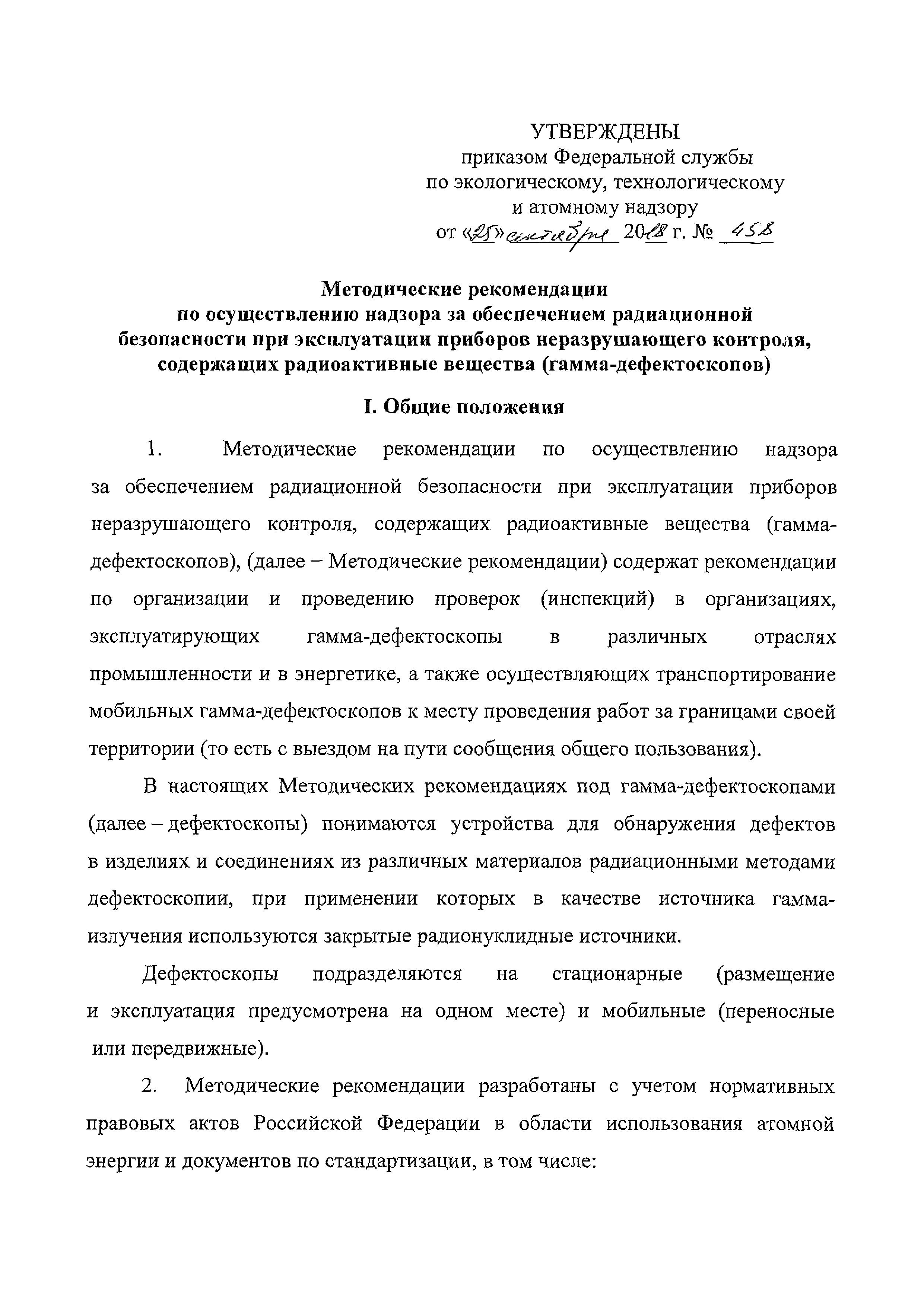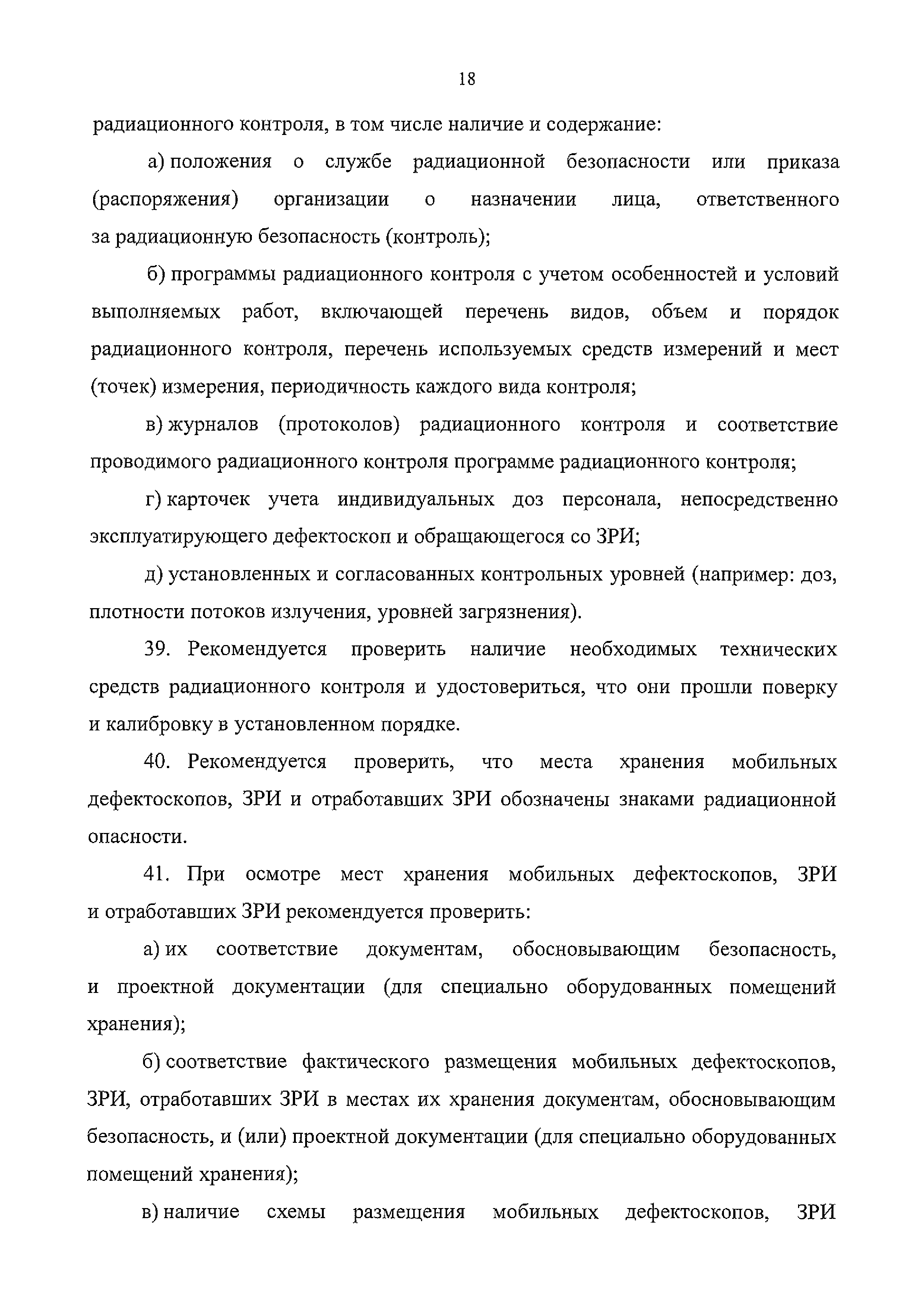 В Методических рекомендациях под гамма-дефектоскопами понимаются устройства для обнаружения дефектов в изделиях и соединениях из различных материалов радиационными методами дефектоскопии, при применении которых в качестве источника гамма-излучения используются закрытые радионуклидные источники. | | Оглавление: | I Общие положения II Организация проверки (инспекции) III Проведение проверки (инспекции) IV Оформление результатов проверки (инспекции) Приложение 1. Список сокращений Приложение 2. Типовая программа проверки (инспекции) и рекомендации по ее составлению Приложение 3. Образцы опросных листов | | Утверждён: | 25.09.2018 Федеральная служба по экологическому, технологическому и атомному надзору (458)