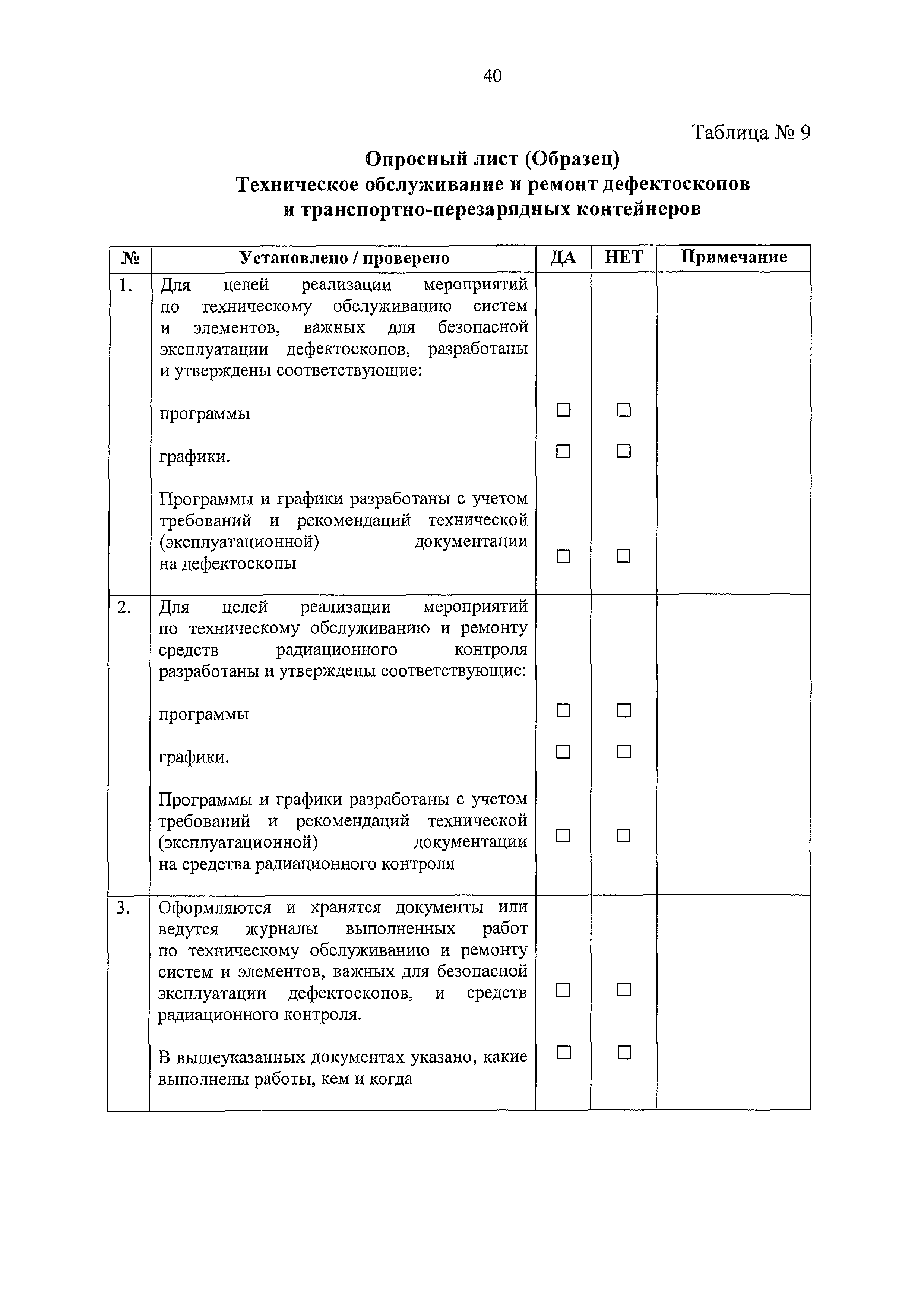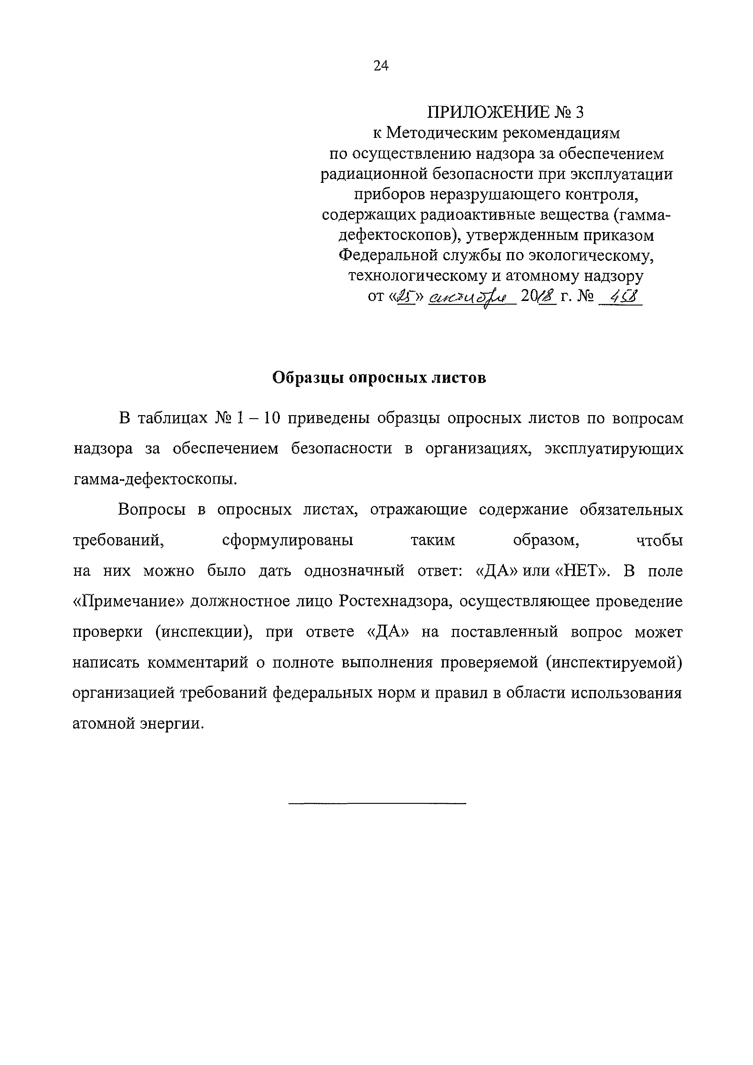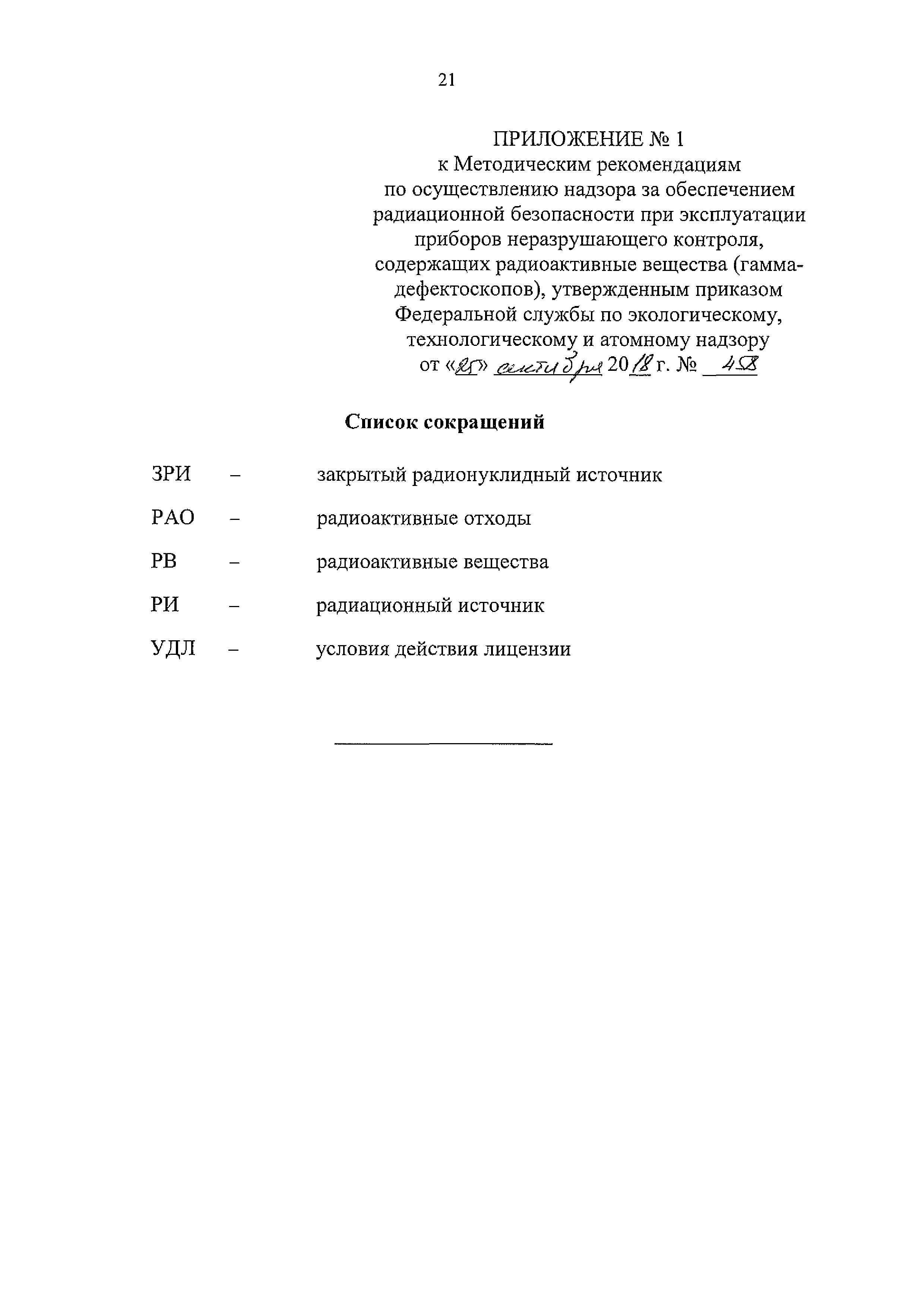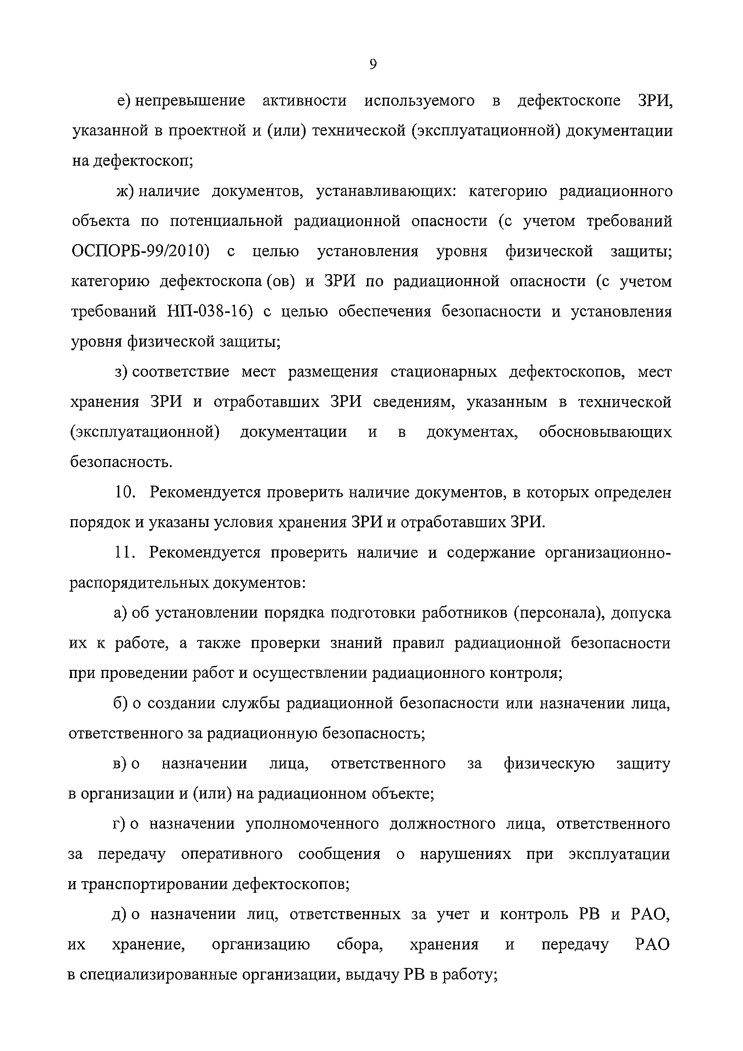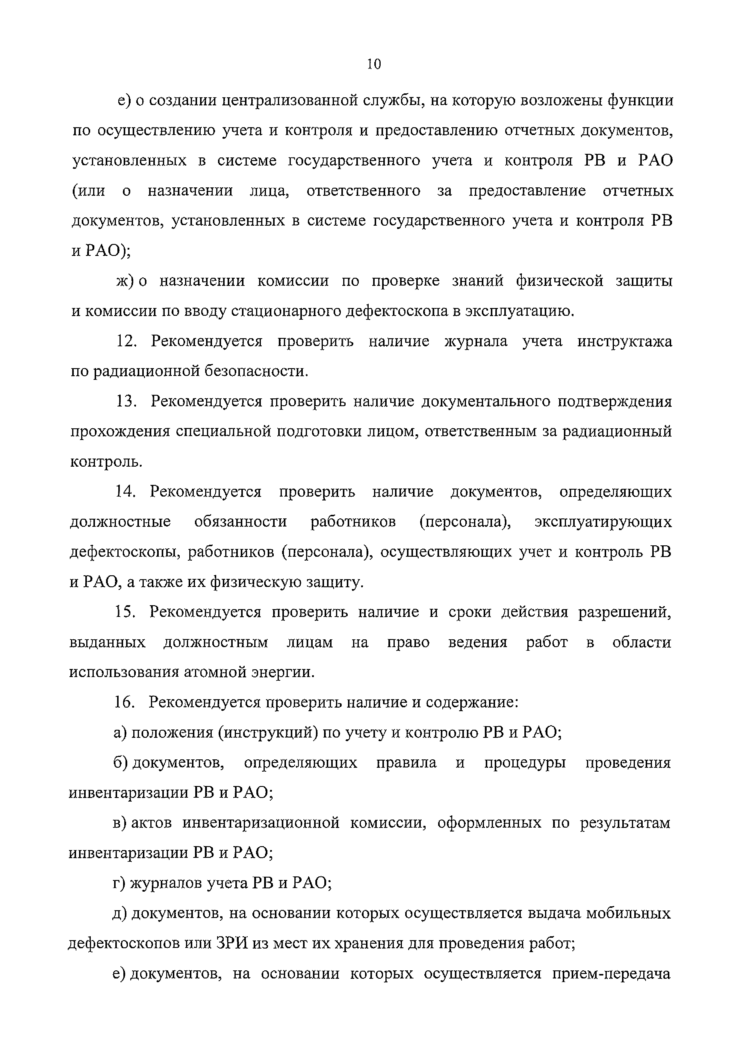В Методических рекомендациях под гамма-дефектоскопами понимаются устройства для обнаружения дефектов в изделиях и соединениях из различных материалов радиационными методами дефектоскопии, при применении которых в качестве источника гамма-излучения используются закрытые радионуклидные источники. | | Оглавление: | I Общие положения II Организация проверки (инспекции) III Проведение проверки (инспекции) IV Оформление результатов проверки (инспекции) Приложение 1. Список сокращений Приложение 2. Типовая программа проверки (инспекции) и рекомендации по ее составлению Приложение 3. Образцы опросных листов | | Утверждён: | 25.09.2018 Федеральная служба по экологическому, технологическому и атомному надзору (458)