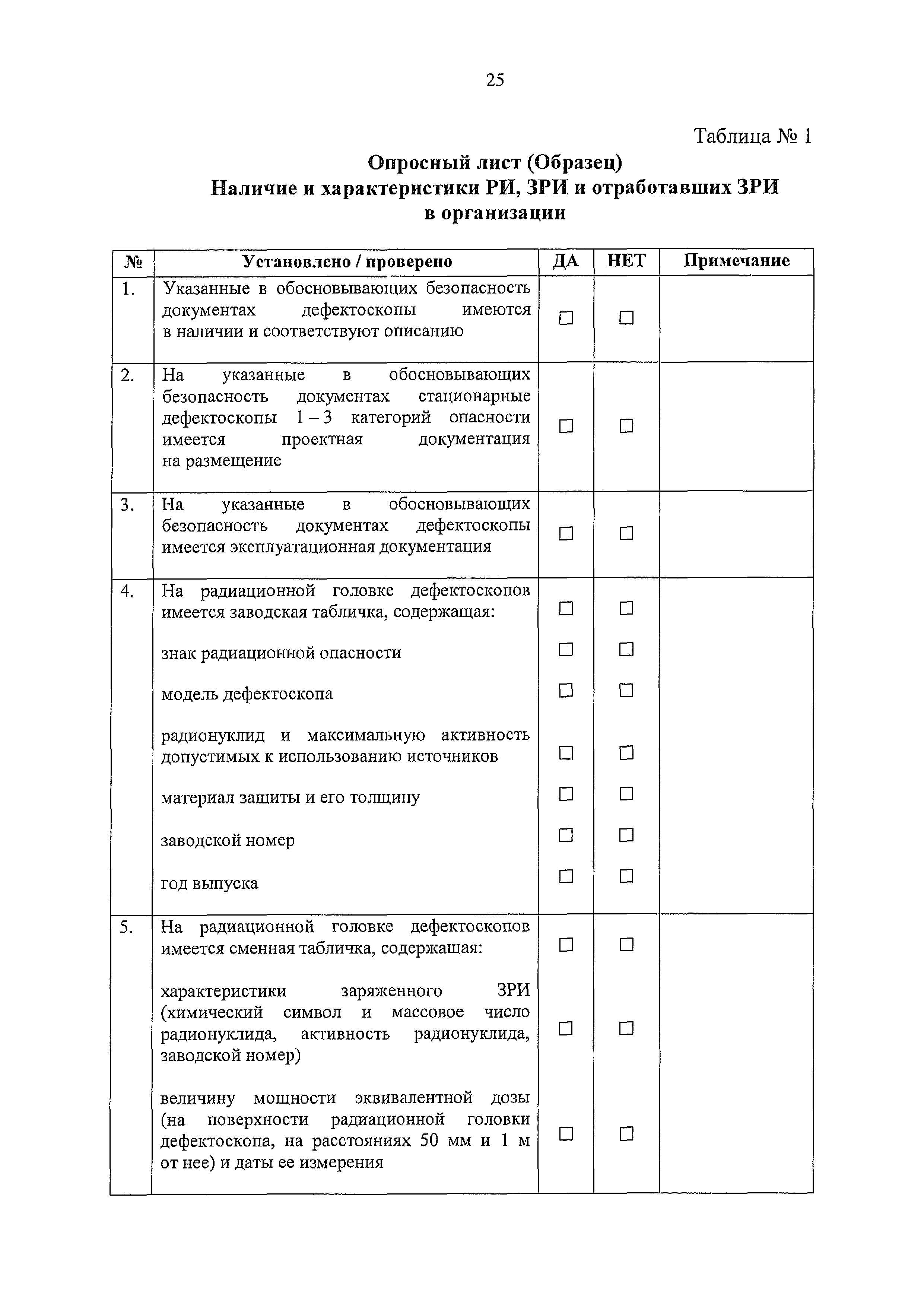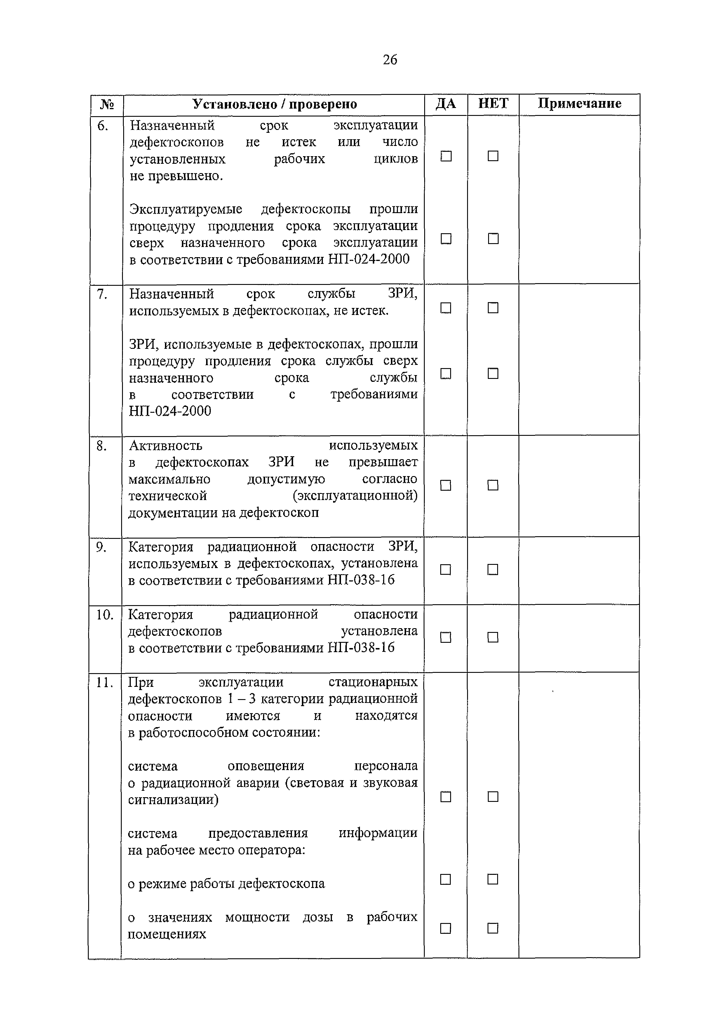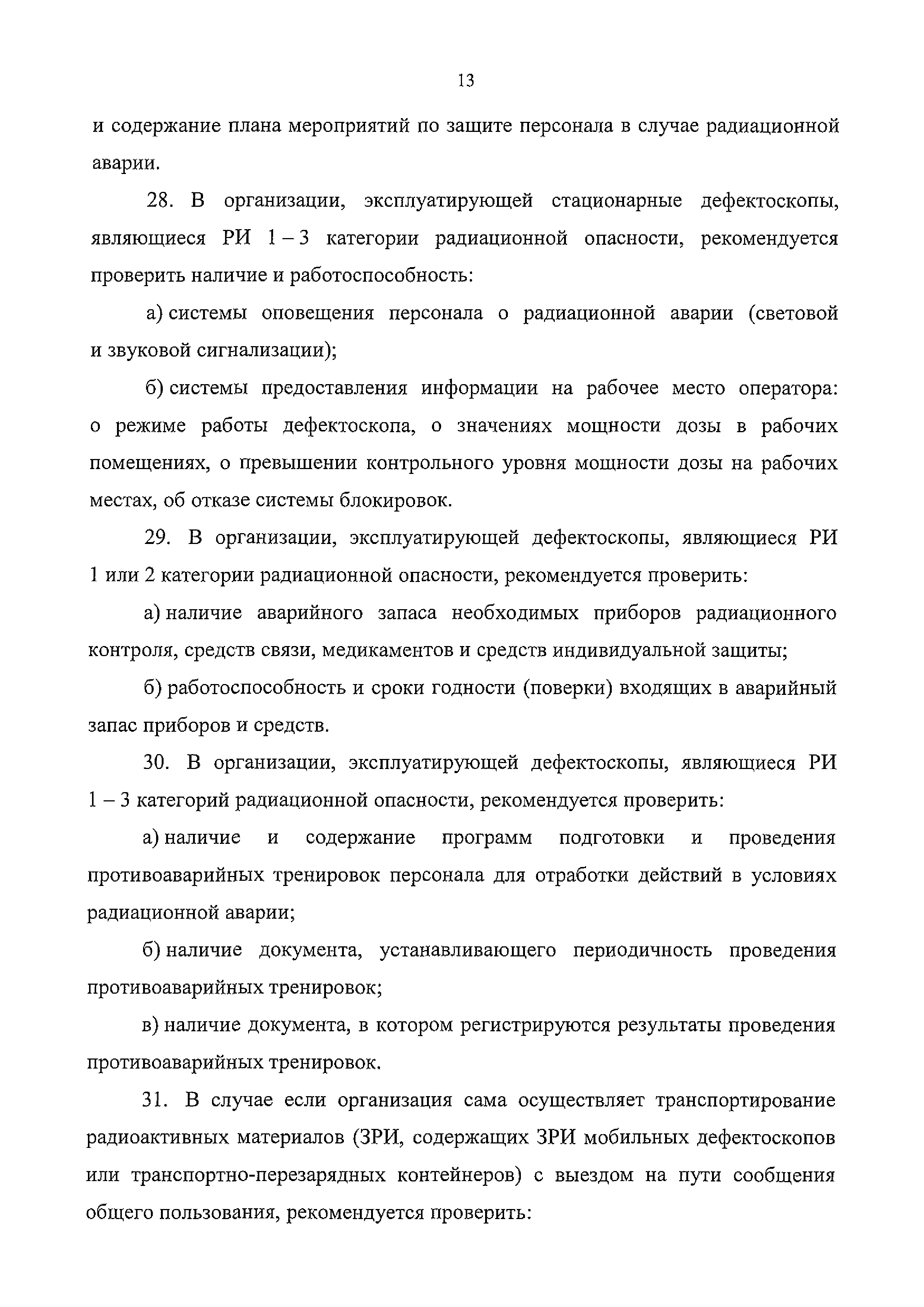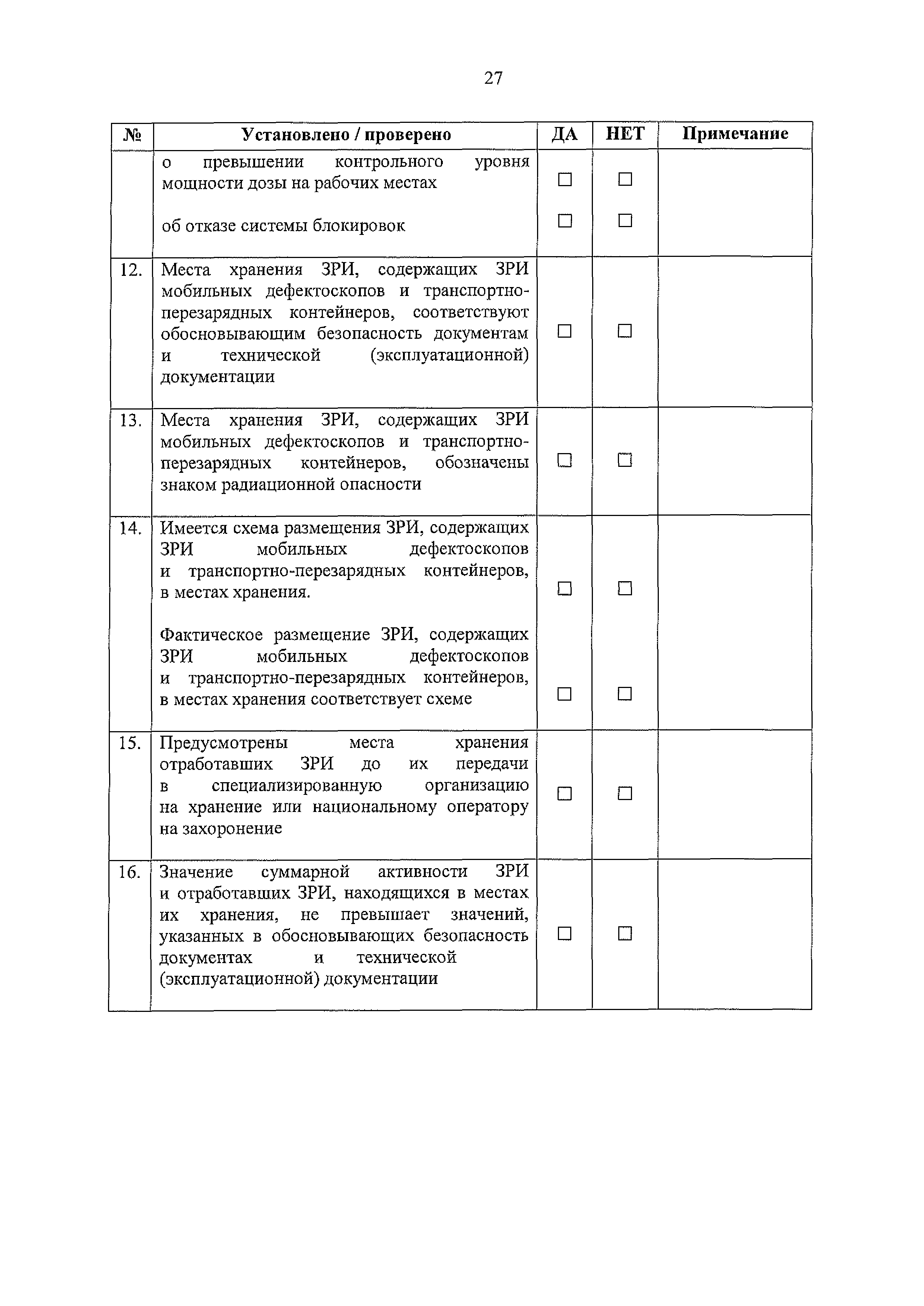 В Методических рекомендациях под гамма-дефектоскопами понимаются устройства для обнаружения дефектов в изделиях и соединениях из различных материалов радиационными методами дефектоскопии, при применении которых в качестве источника гамма-излучения используются закрытые радионуклидные источники. | | Оглавление: | I Общие положения II Организация проверки (инспекции) III Проведение проверки (инспекции) IV Оформление результатов проверки (инспекции) Приложение 1. Список сокращений Приложение 2. Типовая программа проверки (инспекции) и рекомендации по ее составлению Приложение 3. Образцы опросных листов | | Утверждён: | 25.09.2018 Федеральная служба по экологическому, технологическому и атомному надзору (458)