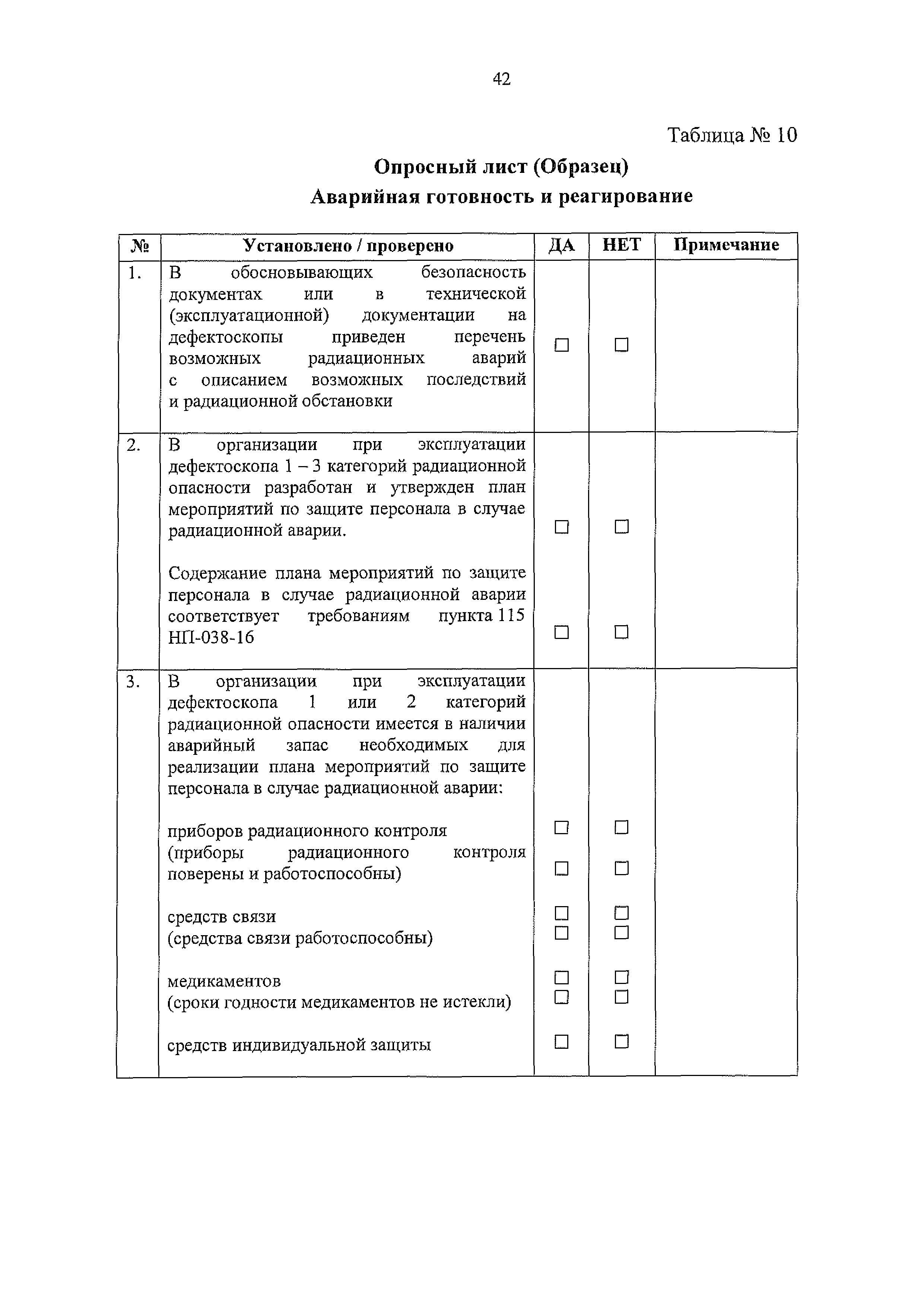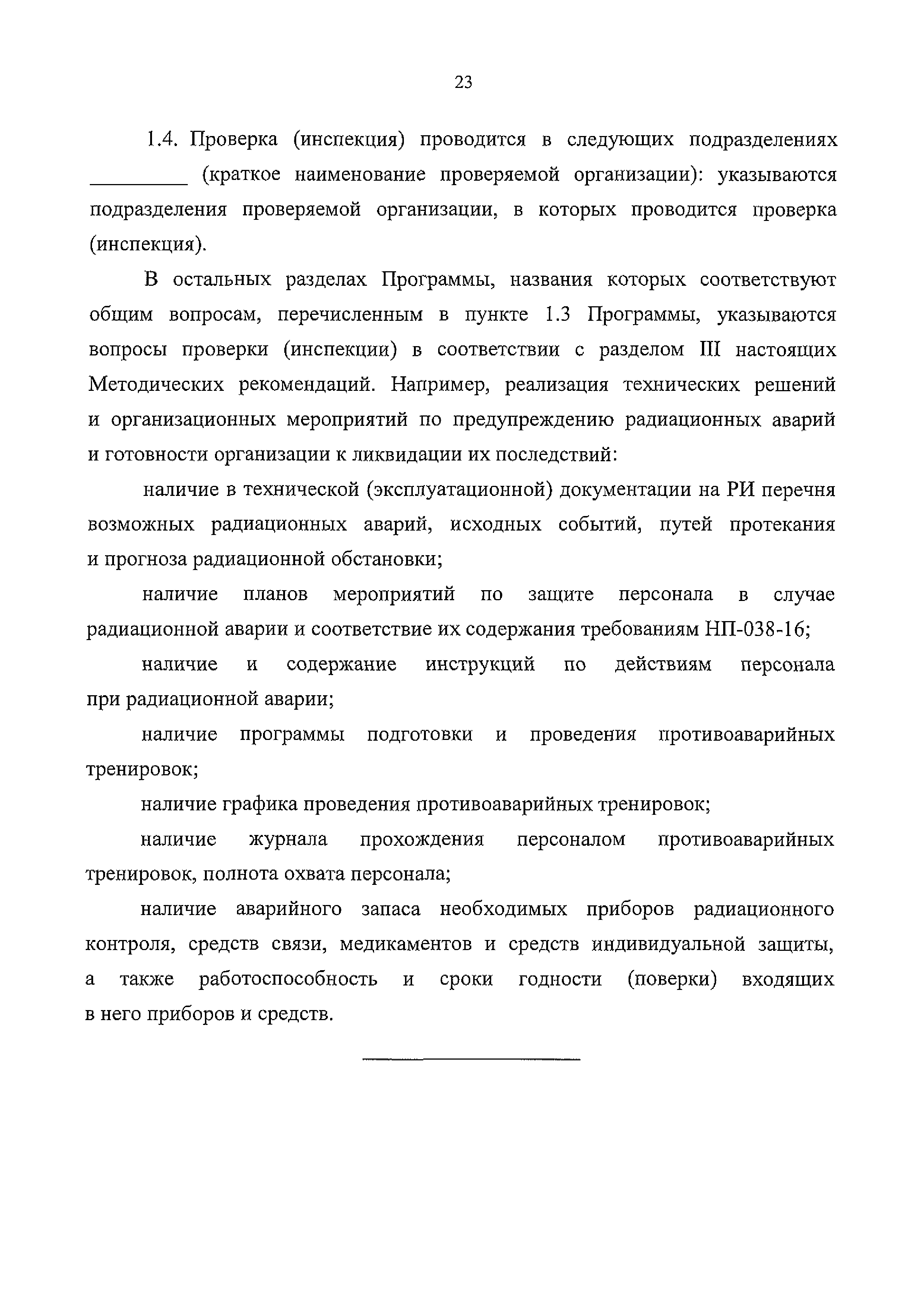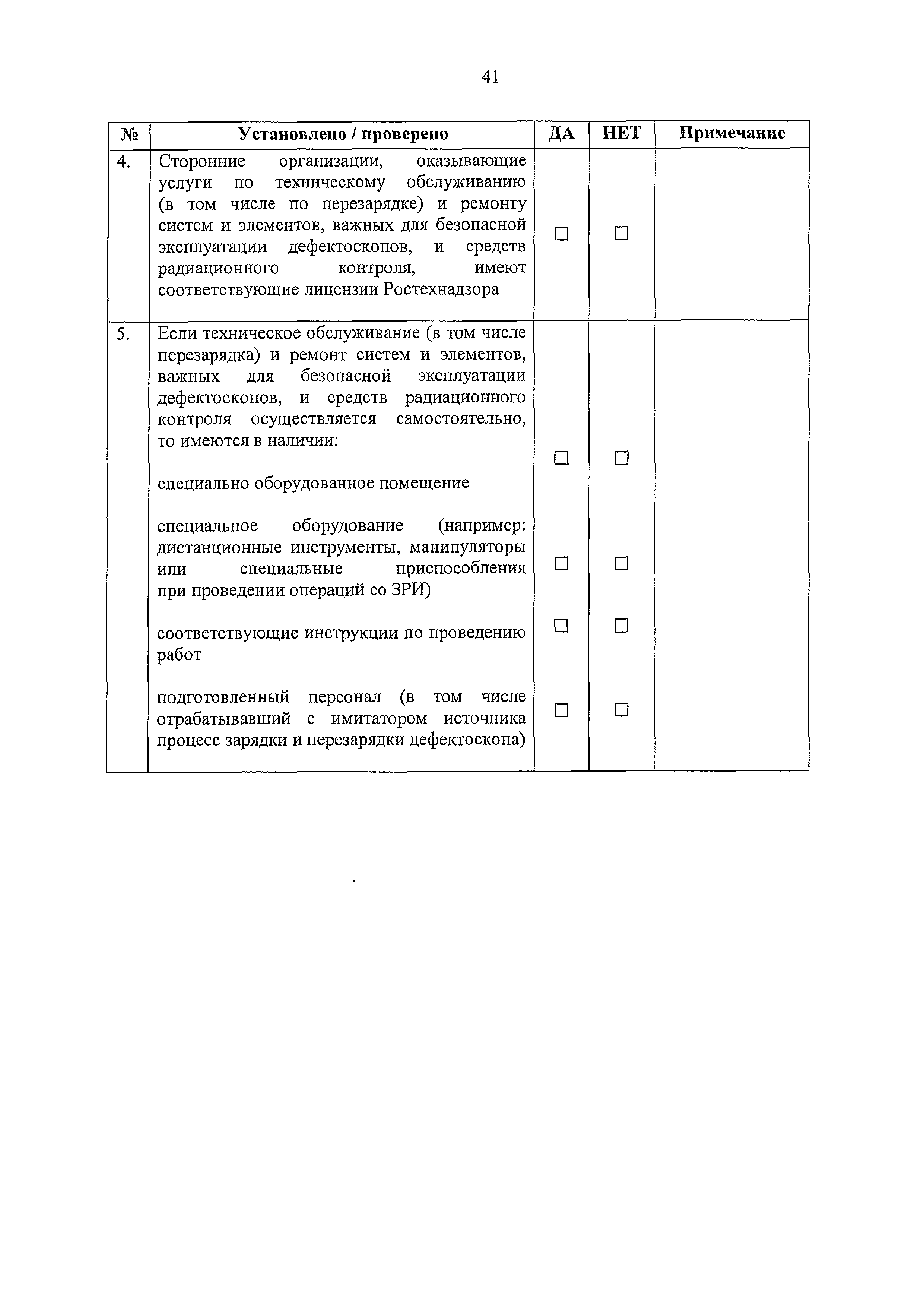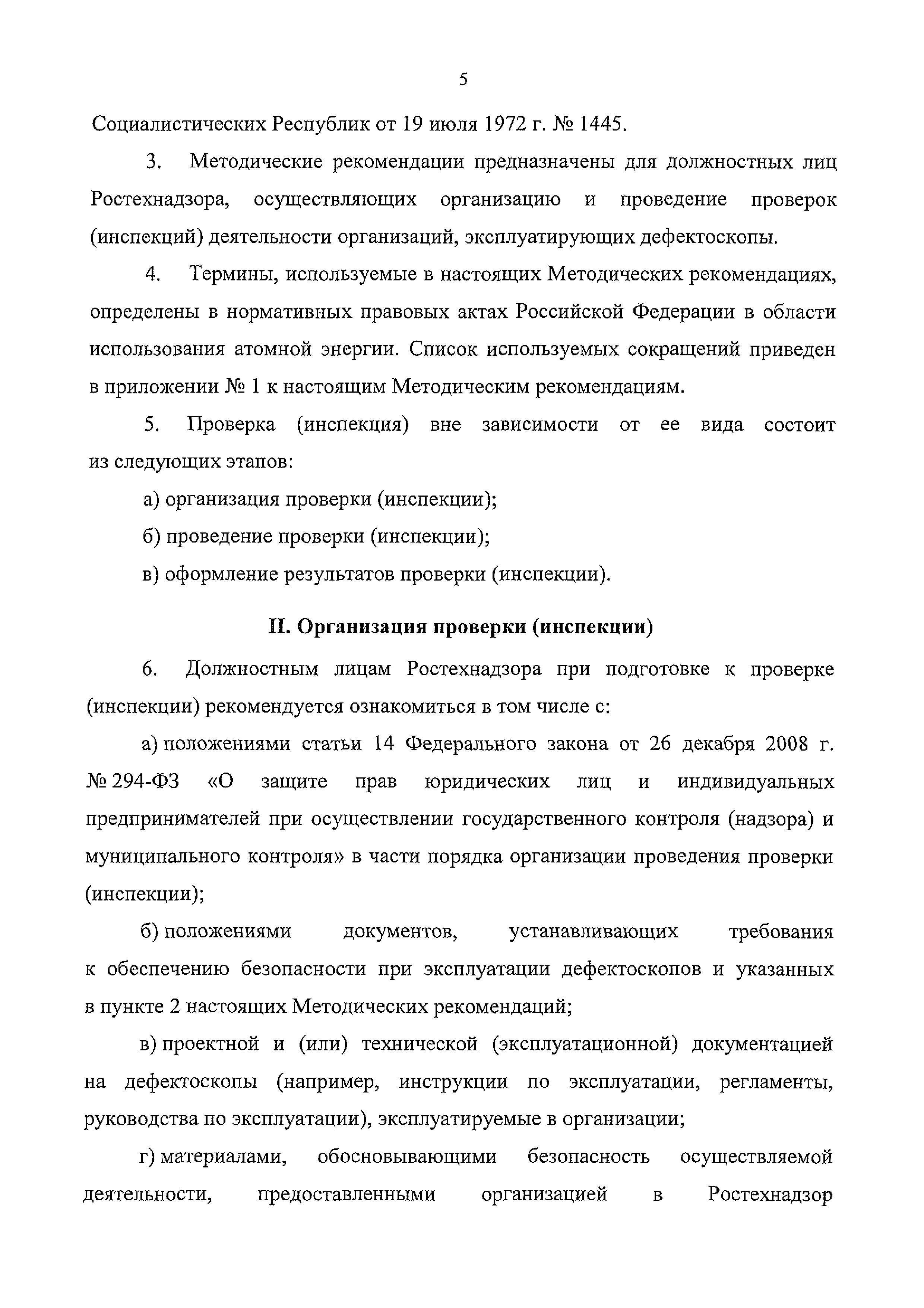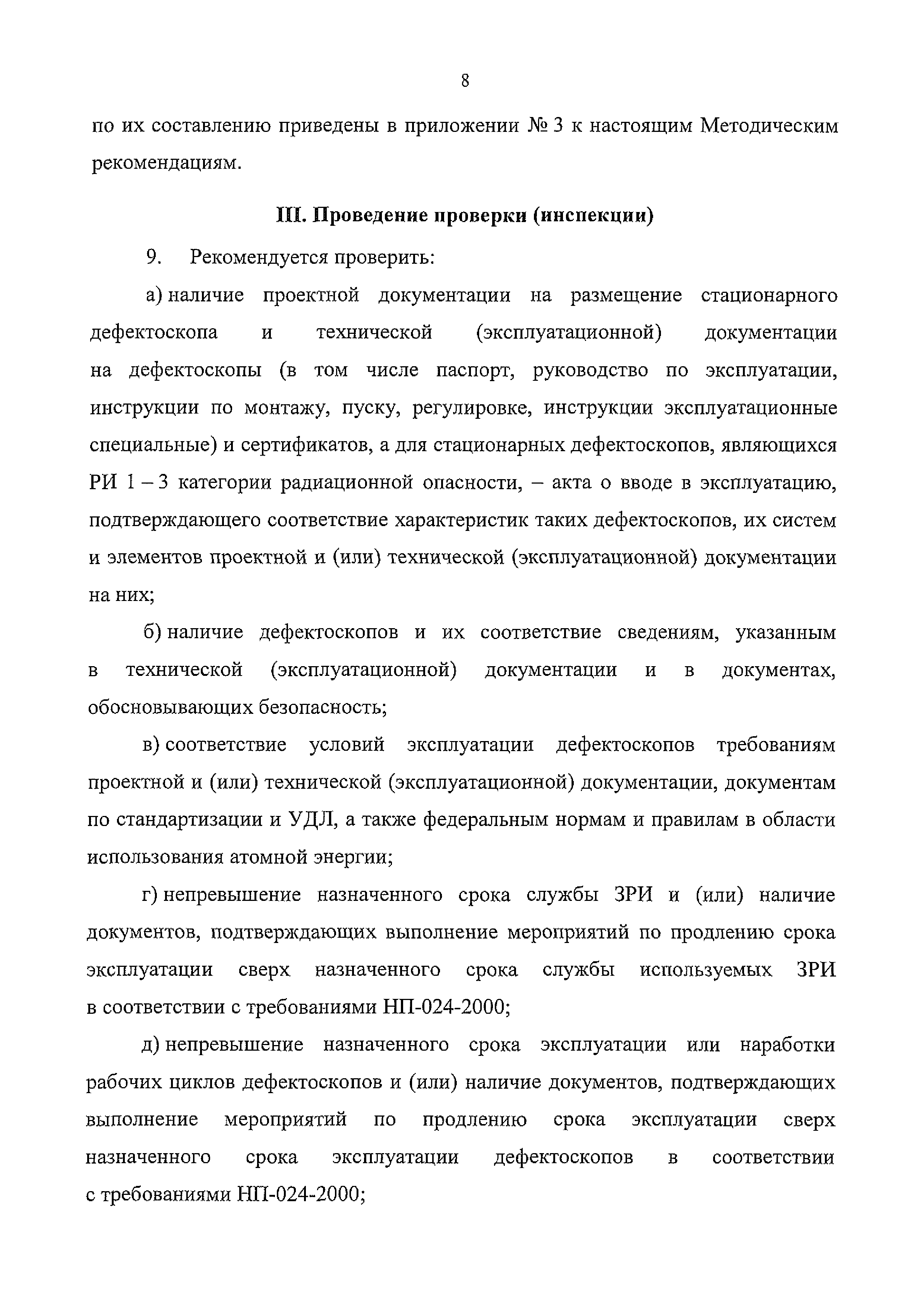 В Методических рекомендациях под гамма-дефектоскопами понимаются устройства для обнаружения дефектов в изделиях и соединениях из различных материалов радиационными методами дефектоскопии, при применении которых в качестве источника гамма-излучения используются закрытые радионуклидные источники. | | Оглавление: | I Общие положения II Организация проверки (инспекции) III Проведение проверки (инспекции) IV Оформление результатов проверки (инспекции) Приложение 1. Список сокращений Приложение 2. Типовая программа проверки (инспекции) и рекомендации по ее составлению Приложение 3. Образцы опросных листов | | Утверждён: | 25.09.2018 Федеральная служба по экологическому, технологическому и атомному надзору (458)