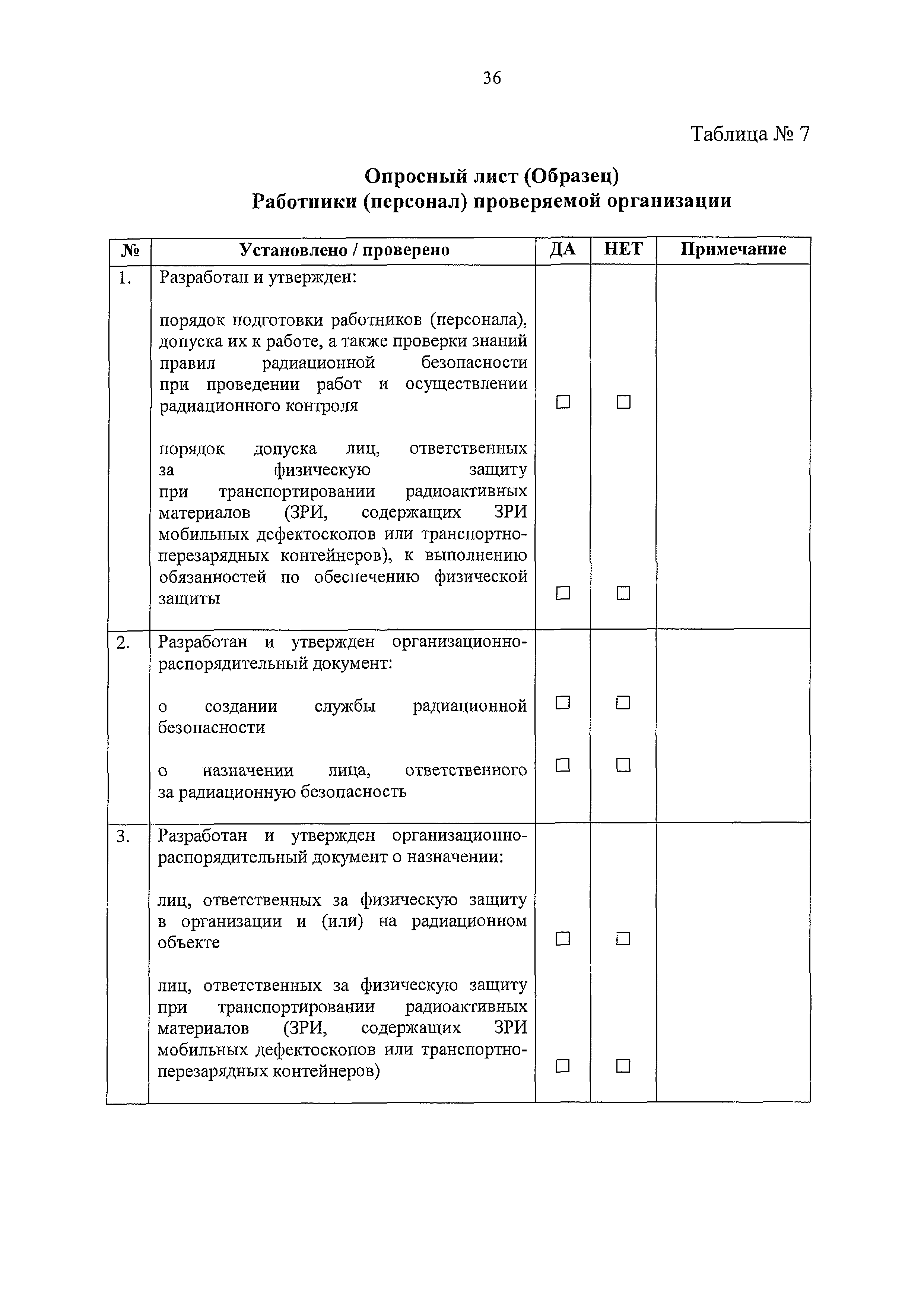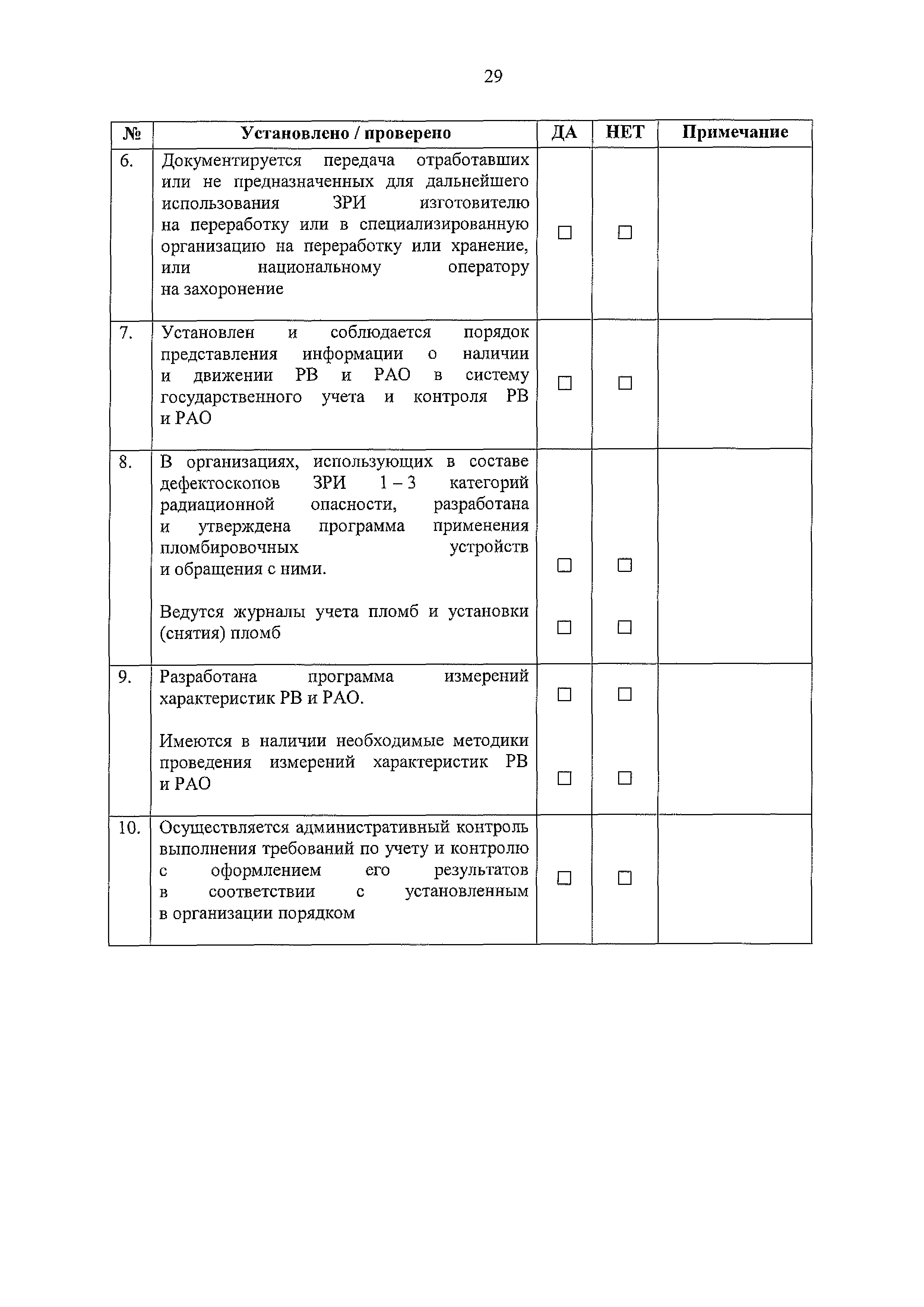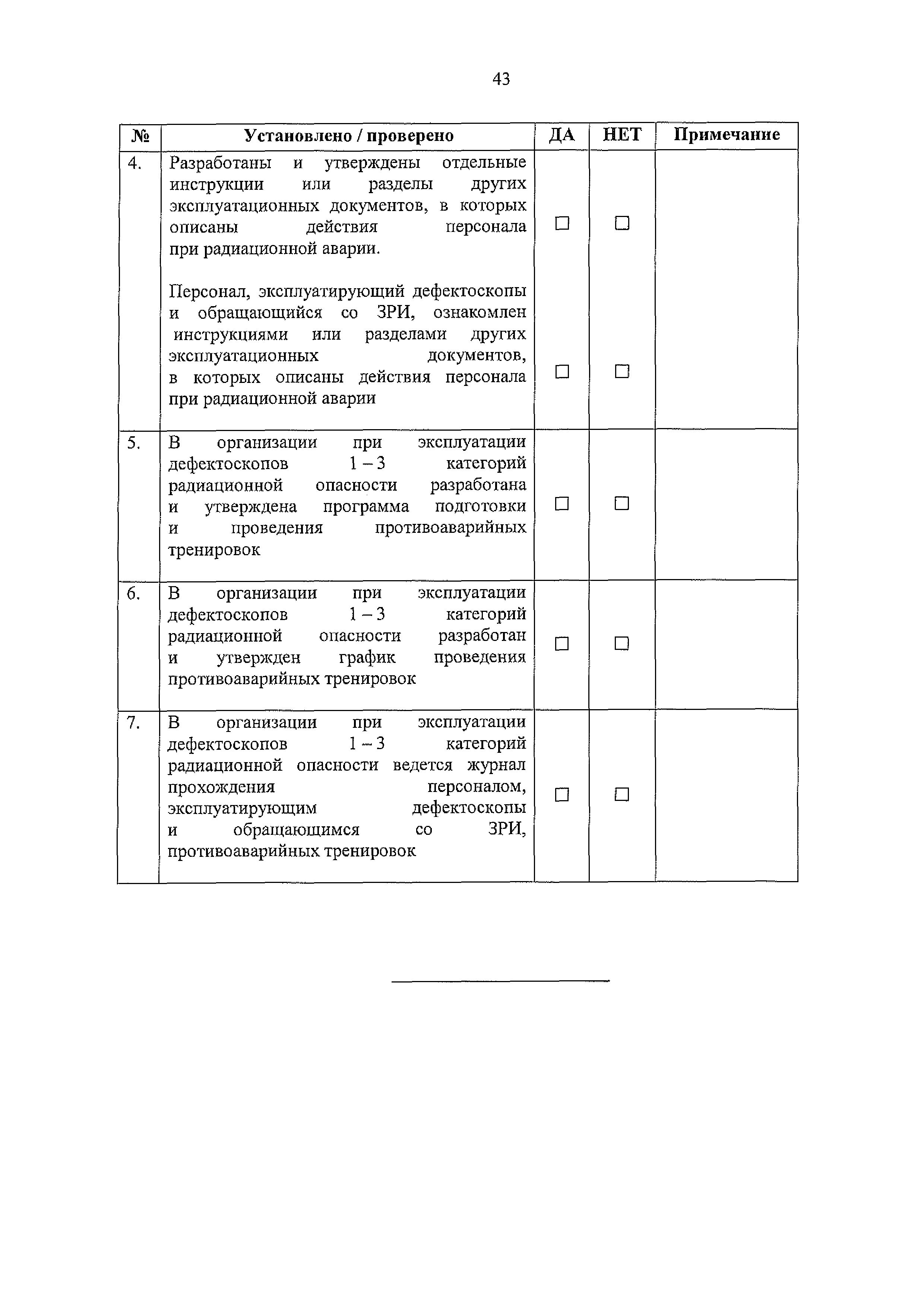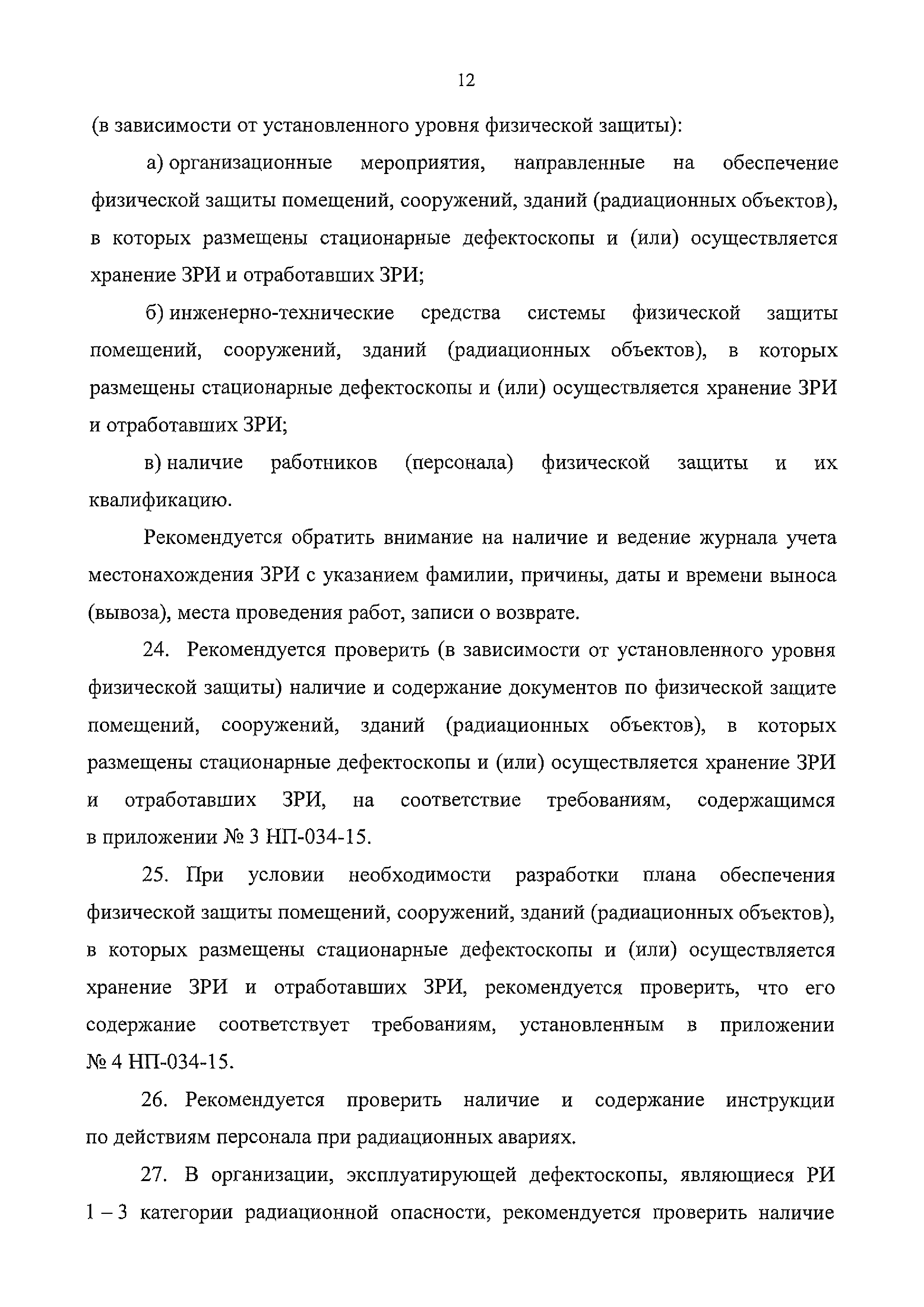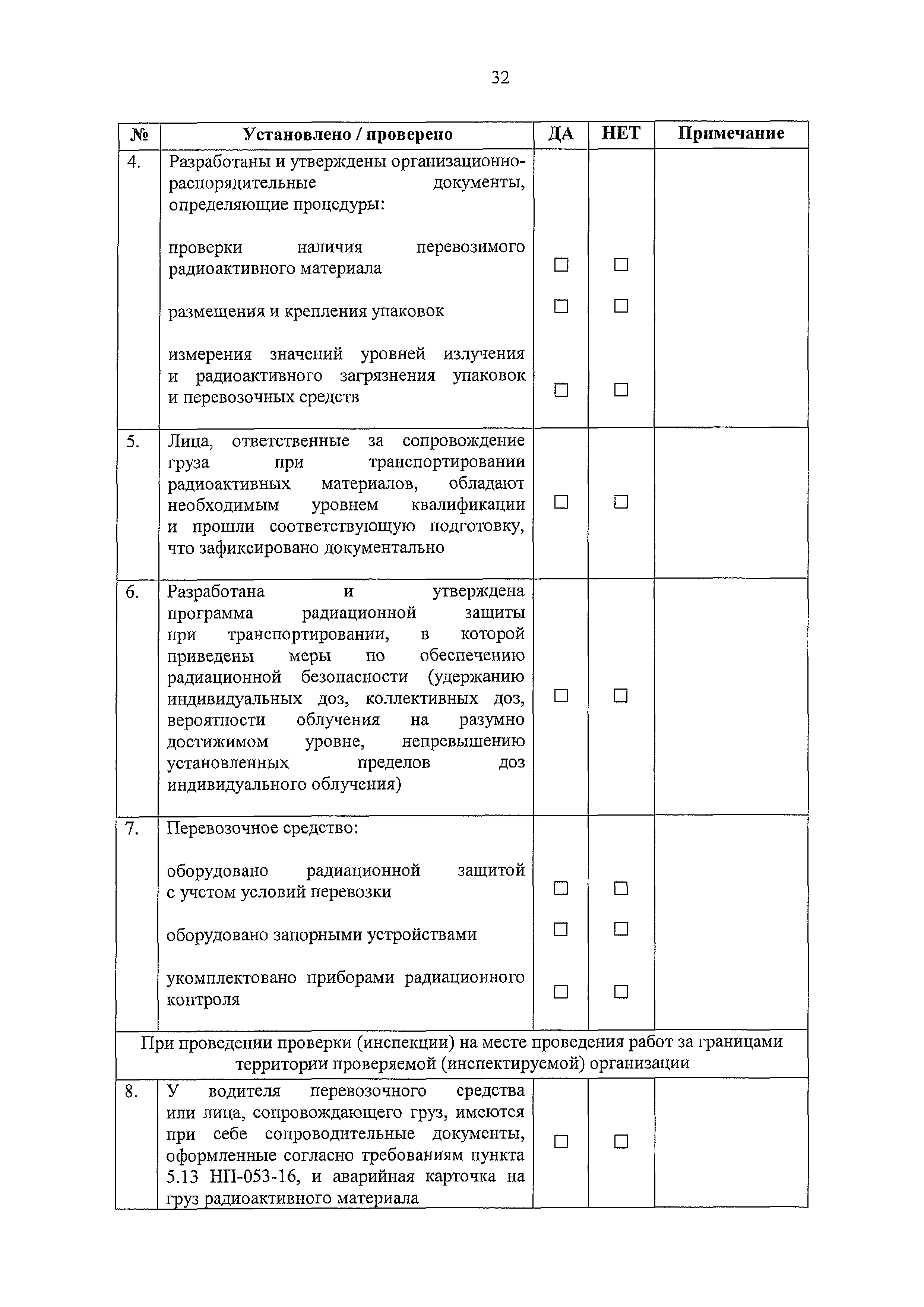В Методических рекомендациях под гамма-дефектоскопами понимаются устройства для обнаружения дефектов в изделиях и соединениях из различных материалов радиационными методами дефектоскопии, при применении которых в качестве источника гамма-излучения используются закрытые радионуклидные источники. | | Оглавление: | I Общие положения II Организация проверки (инспекции) III Проведение проверки (инспекции) IV Оформление результатов проверки (инспекции) Приложение 1. Список сокращений Приложение 2. Типовая программа проверки (инспекции) и рекомендации по ее составлению Приложение 3. Образцы опросных листов | | Утверждён: | 25.09.2018 Федеральная служба по экологическому, технологическому и атомному надзору (458)
