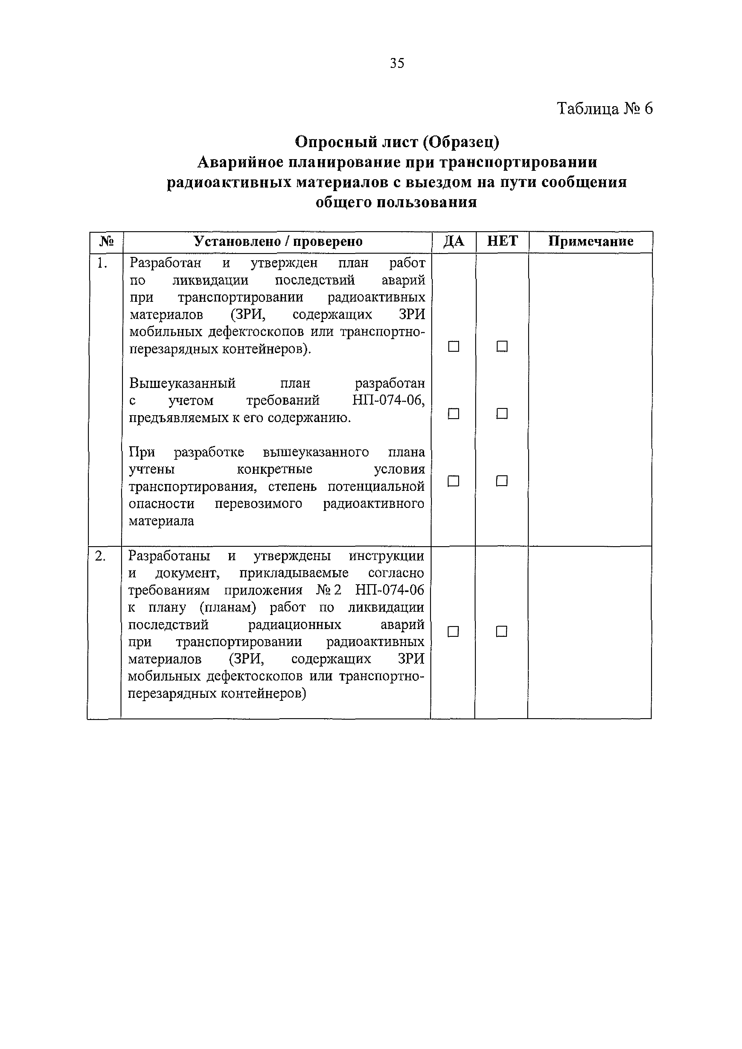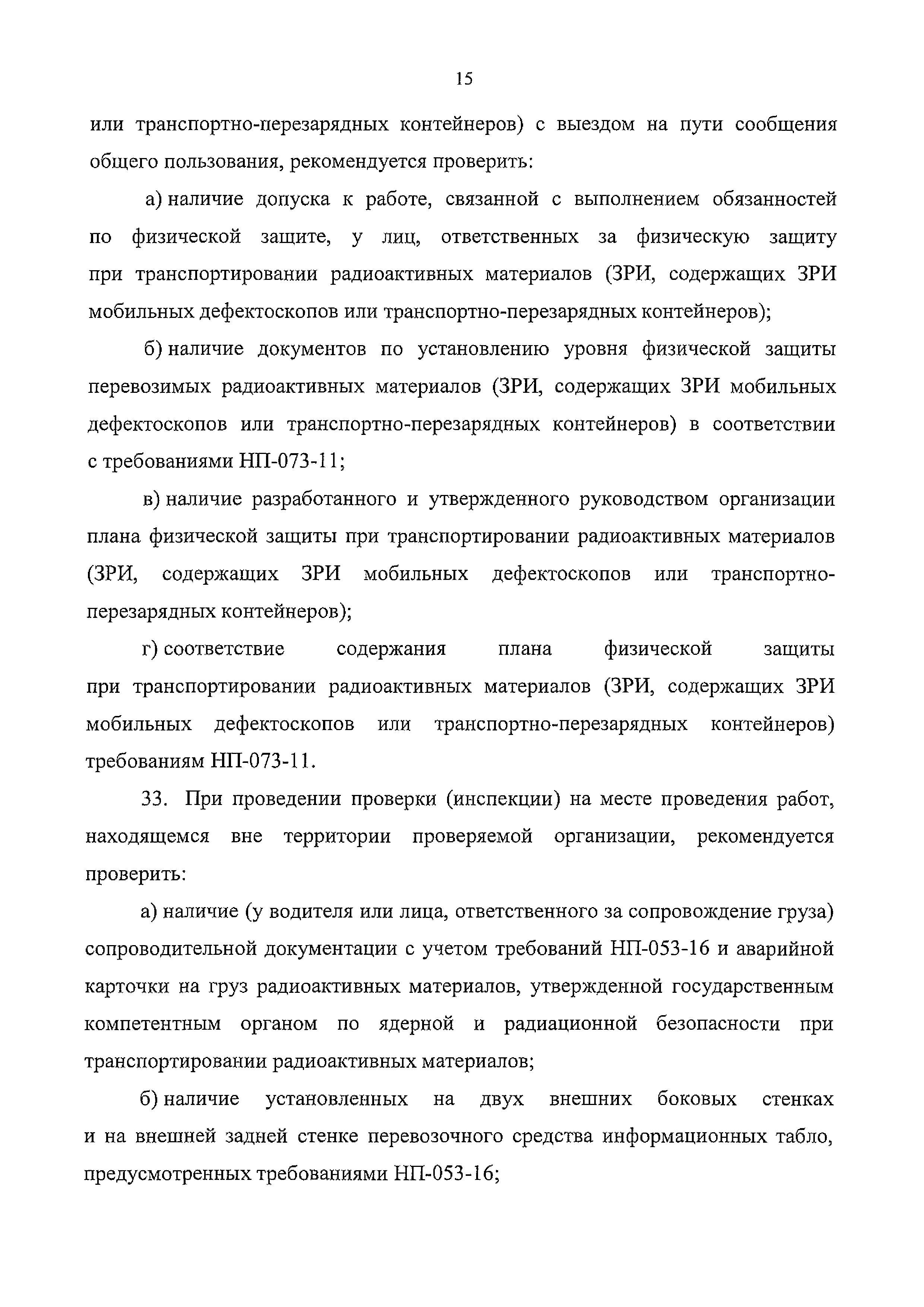 Методические рекомендации по осуществлению надзора за обеспечением радиационной безопасности при эксплуатации приборов неразрушающего контроля, содержащих радиоактивные вещества (гамма-дефектоскопов)| Статус: | взамен | | Название рус.: | Методические рекомендации по осуществлению надзора за обеспечением радиационной безопасности при эксплуатации приборов неразрушающего контроля, содержащих радиоактивные вещества (гамма-дефектоскопов) | | Дата добавления в базу: | 01.01.2019 | | Дата актуализации: | 01.01.2021 | | Дата введения: | 25.09.2018 | | Область применения: | Документ содержит рекомендации по организации и проведению проверок (инспекций) в организациях, эксплуатирующих гамма-дефектоскопы в различных отраслях промышленности и в энергетике, а также осуществляющих транспортирование мобильных гамма-дефектоскопов к месту проведения работ за границами своей территории (то есть с выездом на пути сообщения общего пользования).