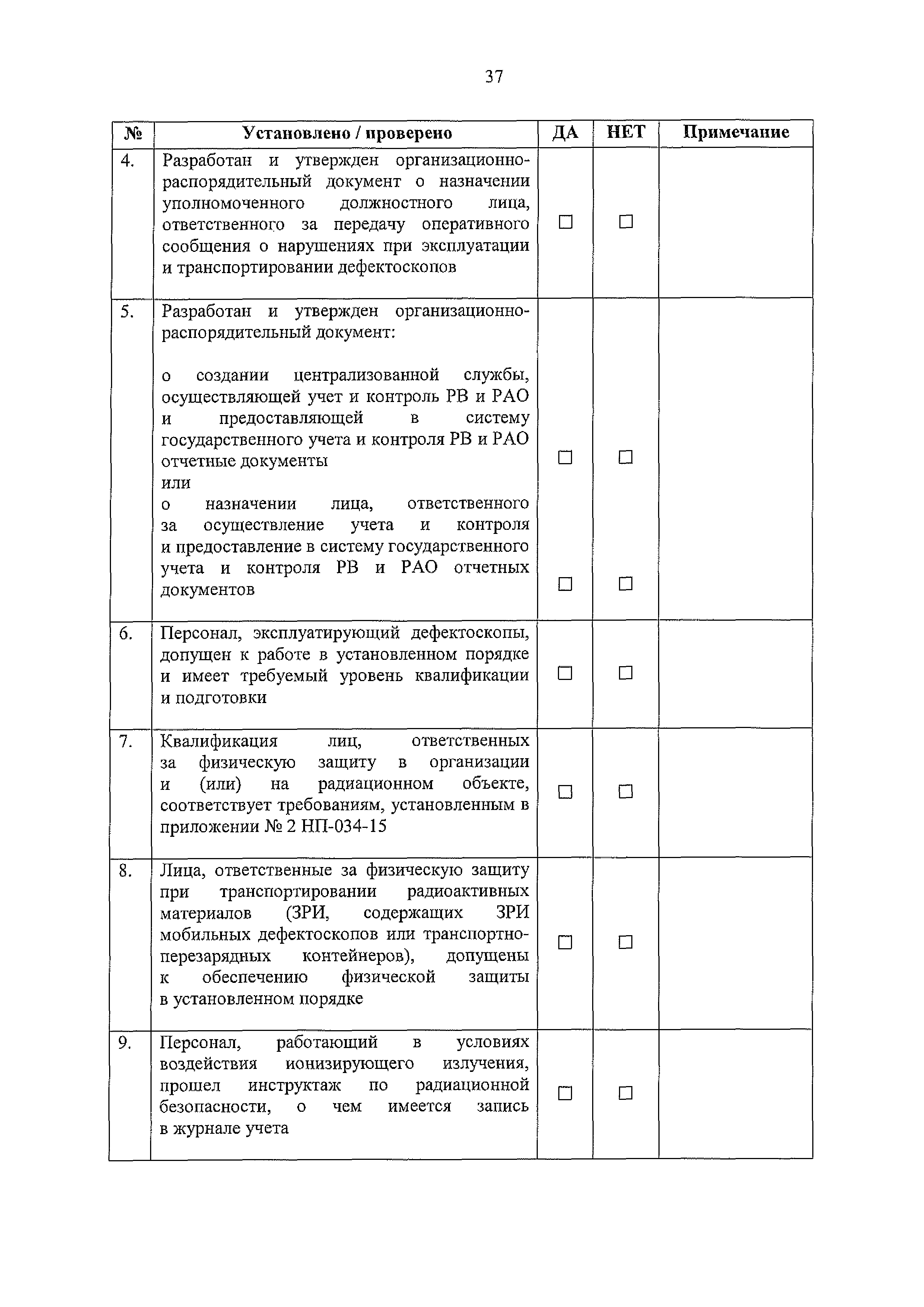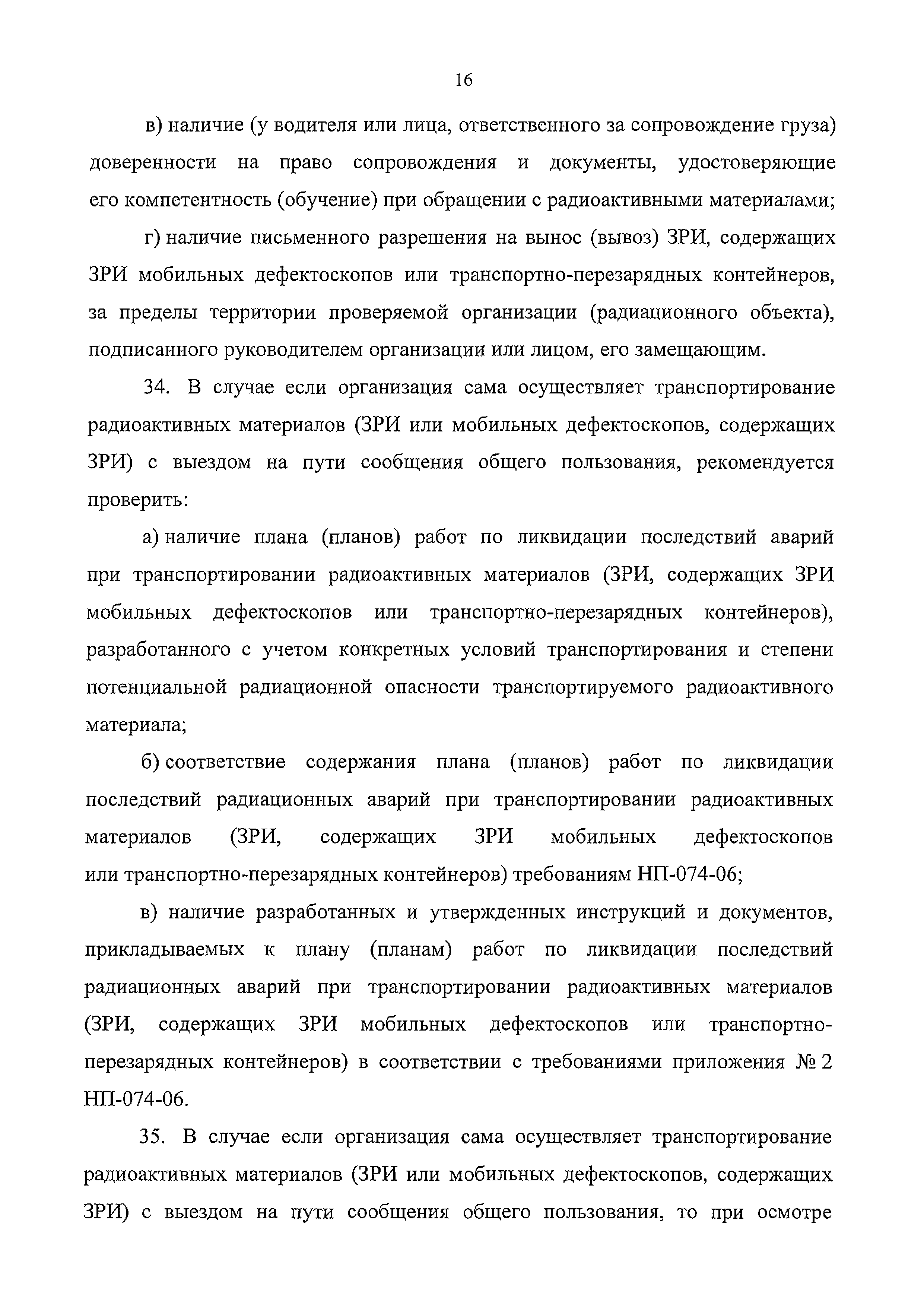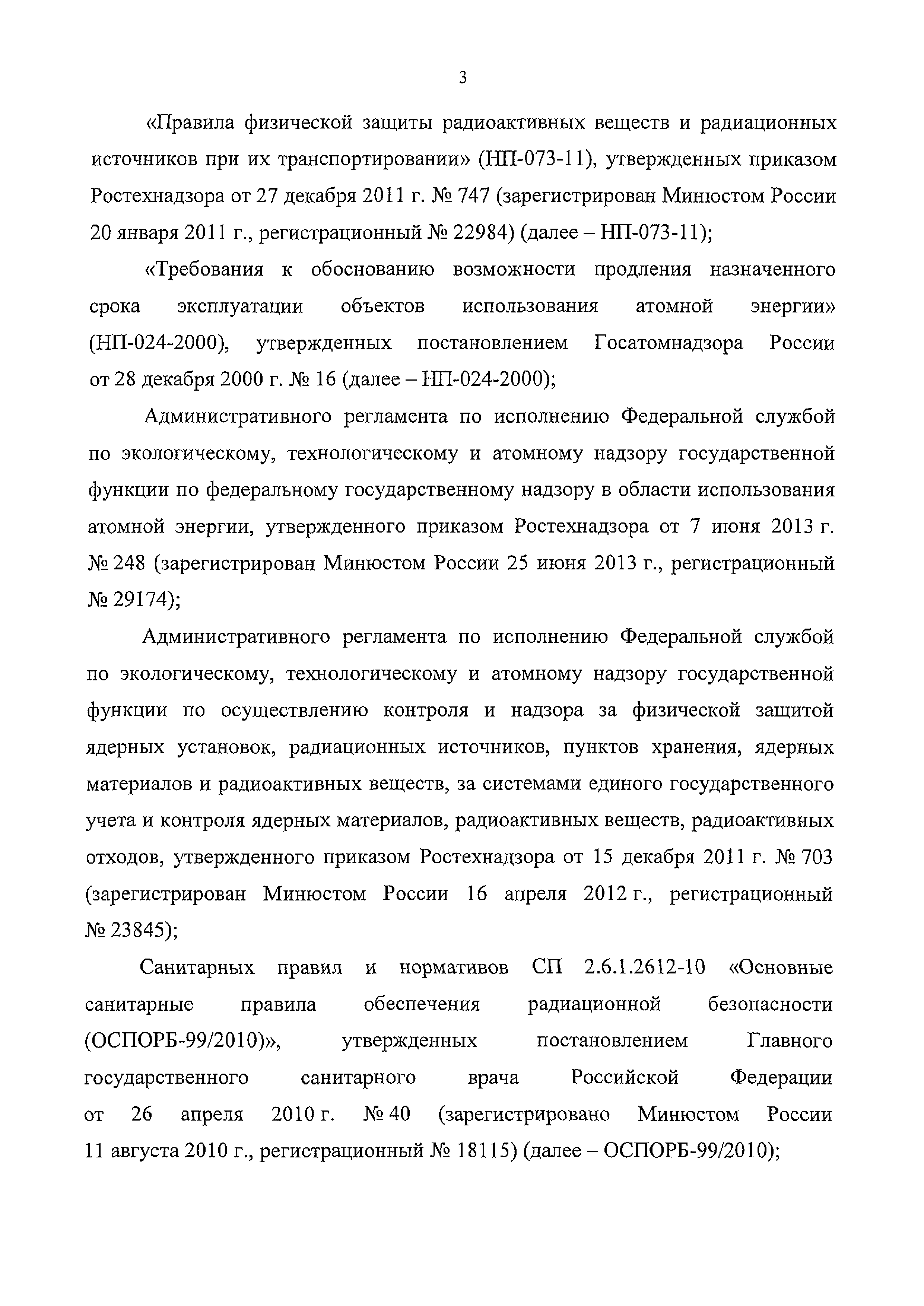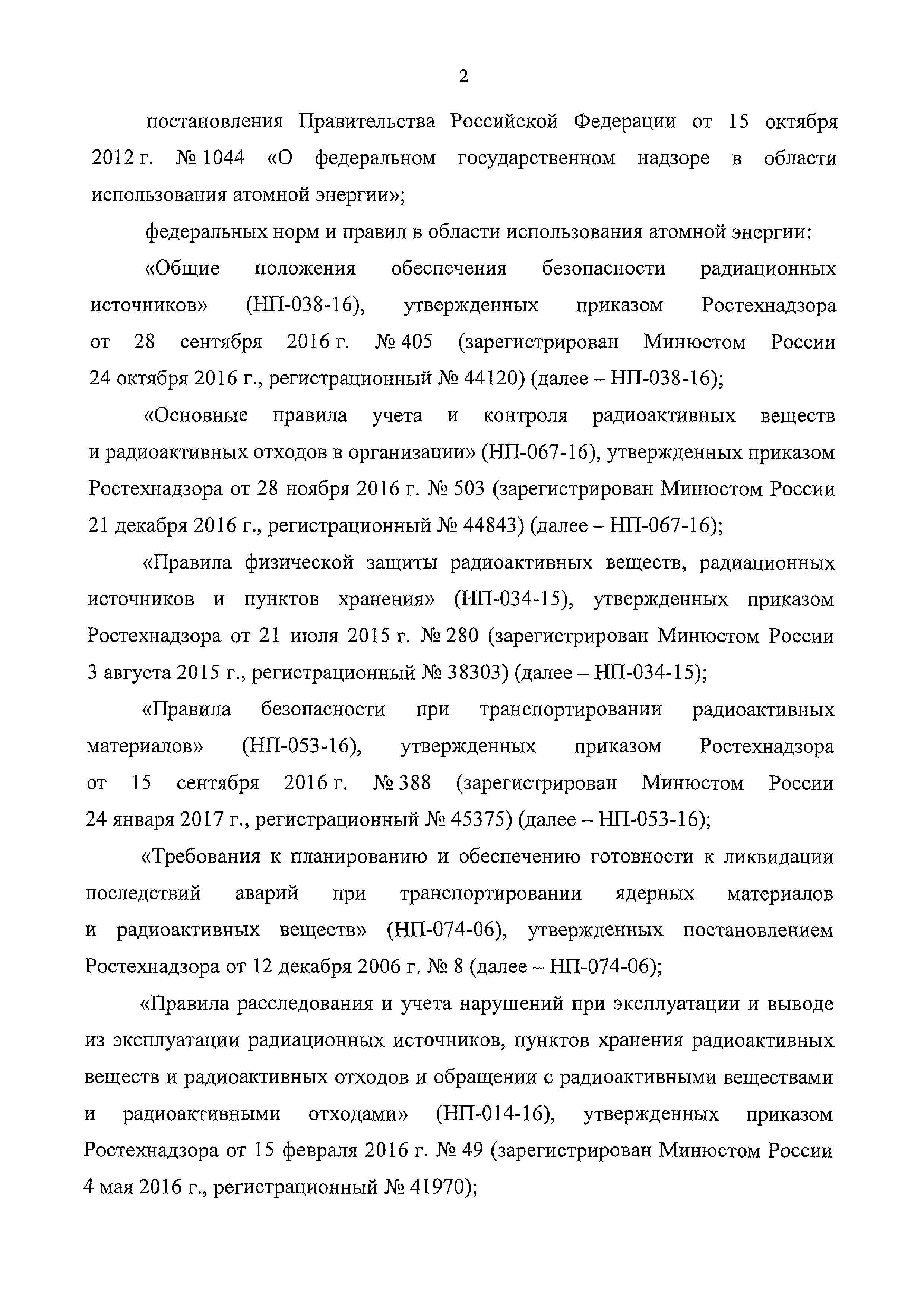 | | Нормативные ссылки: |   НП 024-2000 «Федеральные нормы и правила в области использования атомной энергии. Требования к обоснованию возможности продления назначенного срока эксплуатации объектов использования атомной энергии» ГОСТ 16758-71 «Аппараты терапевтические радиоизотопные. Термины и определения»  ГОСТ 17925-72 «Знак радиационной опасности» ГОСТ 23154-78 «Аппараты гамма-терапевтические статические и ротационные для дальнедистанционного облучения. Общие технические условия» ГОСТ 24658-81 «Аппараты радиоизотопные терапевтические внутриполостные для контактного облучения. Общие технические требования»  НП 074-06 «Требования к планированию и обеспечению готовности к ликвидации последствий аварий при транспортировании ядерных материалов и радиоактивных веществ»  Федеральный закон 294-ФЗ «О защите прав юридических лиц и индивидуальных предпринимателей при осуществлении государственного контроля (надзора) и муниципального контроля»  СП 2.6.1.2612-10 «Основные санитарные правила обеспечения радиационной безопасности» СанПиН 2.6.1.2891-11 «Требования радиационной безопасности при производстве, эксплуатации и выводе из эксплуатации (утилизации) медицинской техники, содержащей источники ионизирующего излучения»  НП 073-11 «Федеральные нормы и правила в области использования атомной энергии "Правила физической защиты радиоактивных веществ и радиационных источников при их транспортировании"» «Положение о федеральном государственном надзоре в области использования атомной энергии» «Административный регламент по исполнению Федеральной службой по экологическому, технологическому и атомному надзору государственной функции по осуществлению контроля и надзора за физической защитой ядерных установок, радиационных источников, пунктов хранения, ядерных материалов и радиоактивных веществ, за системами единого государственного учета и контроля ядерных материалов, радиоактивных веществ, радиоактивных отходов»  НП 034-15 «Правила физической защиты радиоактивных веществ, радиационных источников и пунктов хранения» НП 014-16 «Федеральные нормы и правила в области использования атомной энергии "Правила расследования и учета нарушений при эксплуатации и выводе из эксплуатации радиационных источников, пунктов хранения радиоактивных веществ и радиоактивных отходов и обращении с радиоактивными веществами и радиоактивными отходами"»  НП 038-16 «Федеральные нормы и правила в области использования атомной энергии "Общие положения обеспечения безопасности радиационных источников"»  НП 067-16 «Федеральные нормы и правила в области использования атомной энергии "Основные правила учета и контроля радиоактивных веществ и радиоактивных отходов в организации"»  НП 053-16 «Федеральные нормы и правила в области использования атомной энергии "Правила безопасности при транспортировании радиоактивных материалов"»