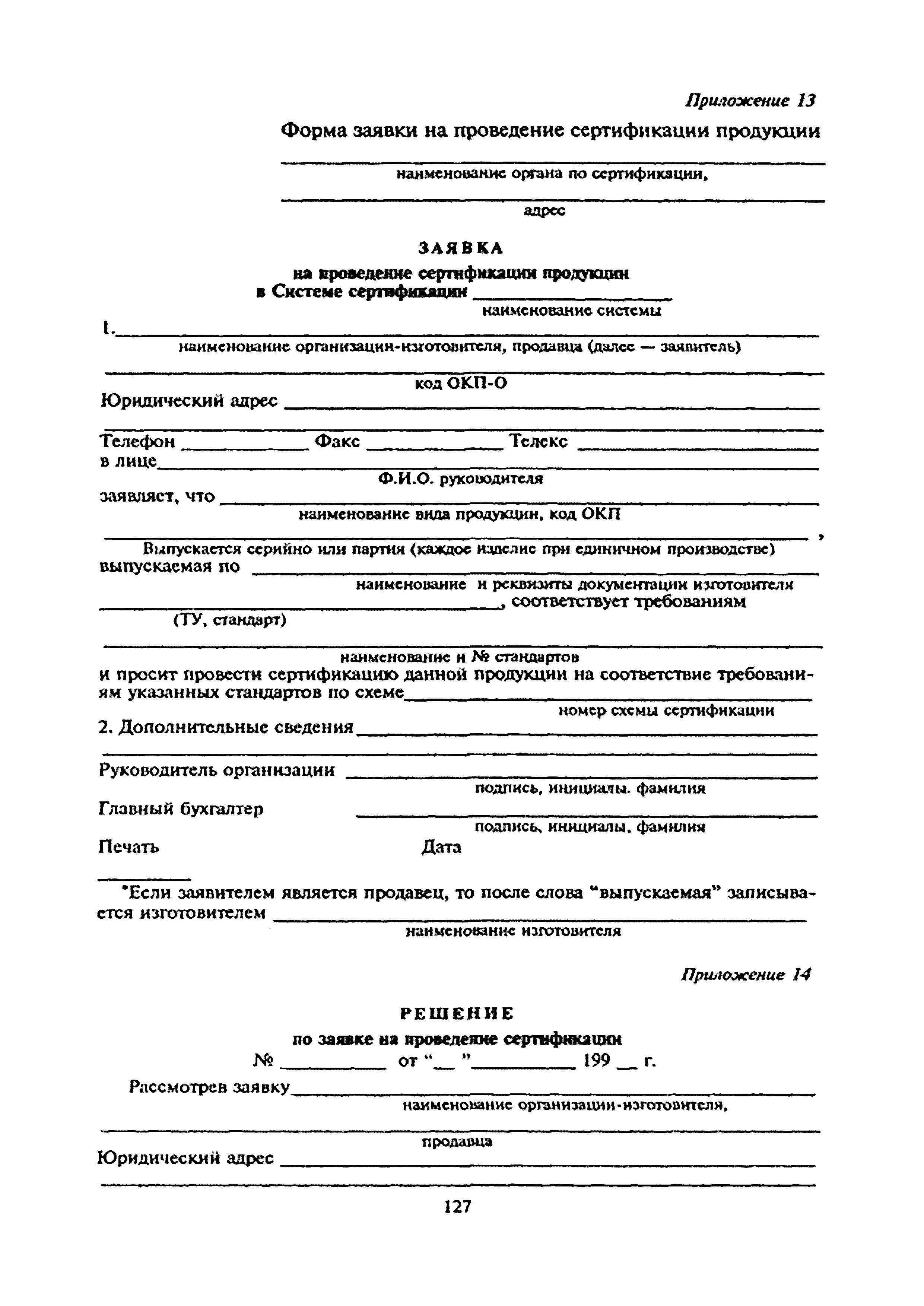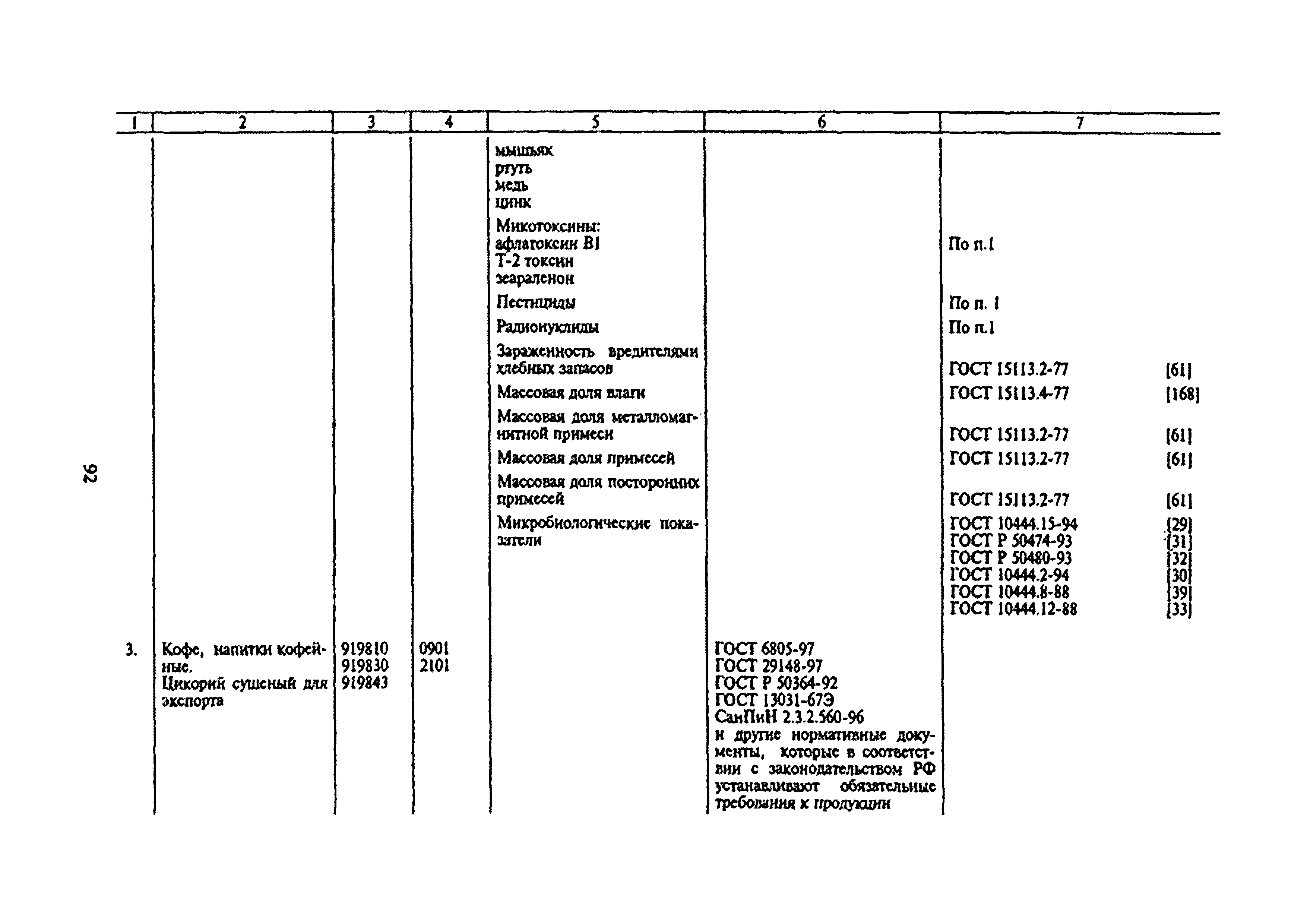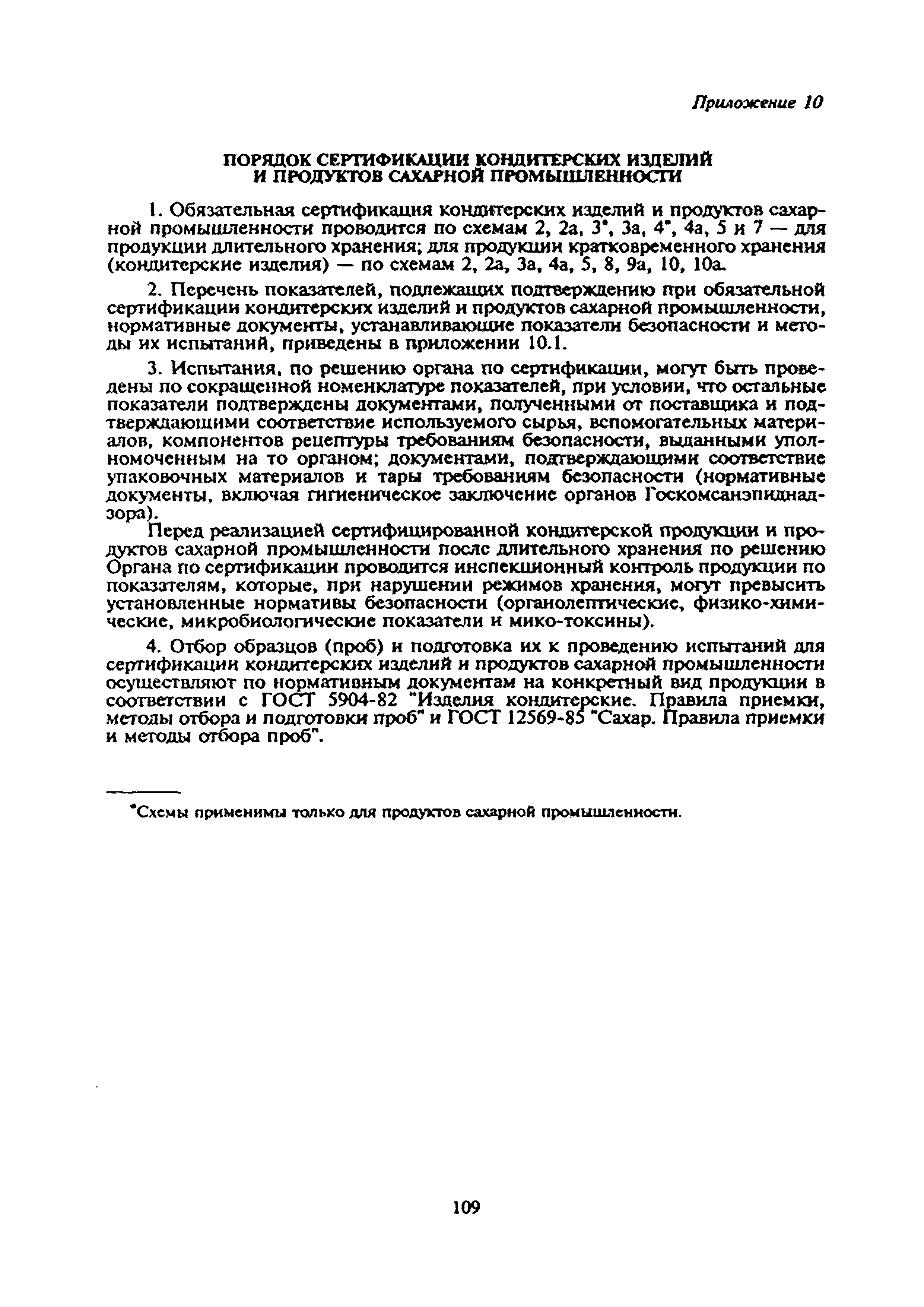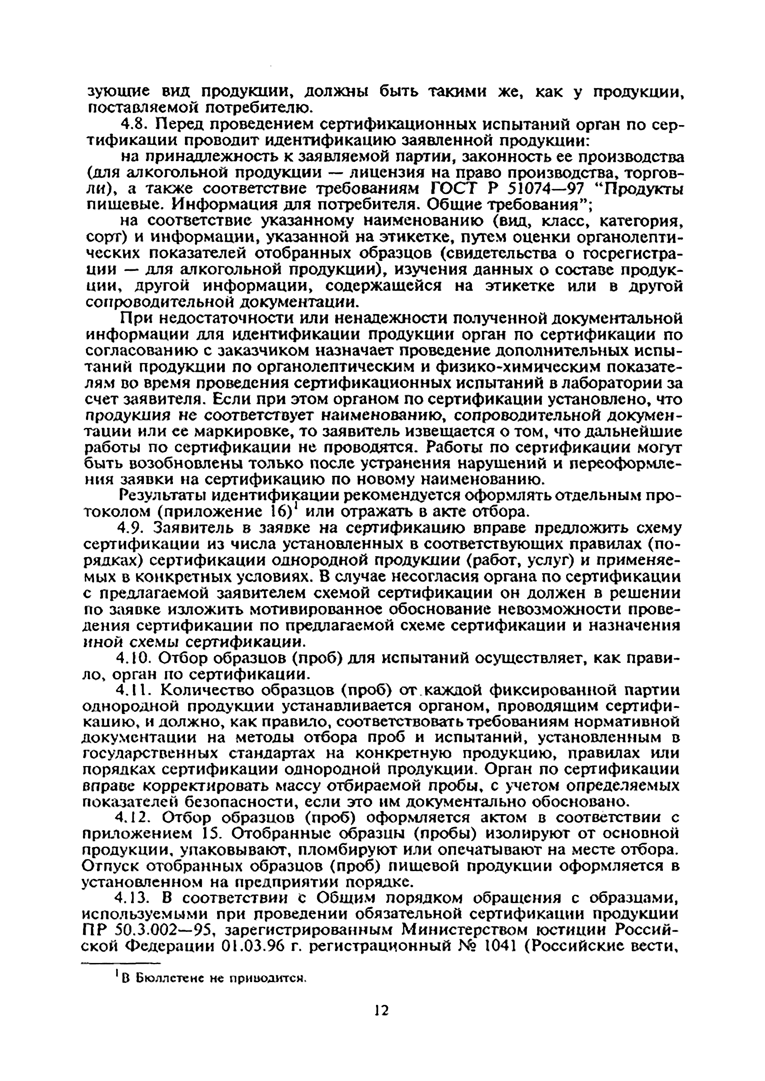 | Оглавление: | I Область применения II Общие положения III Структура системы IV Порядок проведения обязательной сертификации пищевой продукции V Рассмотрение апелляций Приложение 1. Порядок сертификации зерна и продуктов его переработки Приложение 2. Порядок сертификации хлебобулочных и макаронных изделий Приложение 3. Порядок сертификации растительного масла и продуктов переработки растительных масел Приложение 4. Порядок сертификации мяса, мясной продукции, мяса птицы, яйца и продуктов их переработки Приложение 5. Порядок сертификации рыбы, нерыбных объектов промысла и продуктов, вырабатываемых из них, на соответствие требованиям безопасности Приложение 6. Порядок сертификации молока и молочных продуктов Приложение 7. Порядок сертификации плодов, овощей и продуктов их переработки Приложение 8. Порядок сертификации пищевых концентратов и крахмала Приложение 9. Порядок сертификации напитков, вин, коньяков, спирта этилового питьевого и ликероводочной продукции Приложение 10. Порядок сертификации кондитерских изделий и продуктов сахарной промышленности Приложение 11. Перечень показателей, подлежащих подтверждению при обязательной сертификации продукции пчеловодства Приложение 12. Перечень нормативных и методических документов, определяющих методы испытаний, указанные в приложениях 1 - 11 Приложение 13. Форма заявки на проведение сертификации продукции Приложение 14. Решение по заявке на проведение сертификации Приложение 15. Акт отбора образцов (проб) |