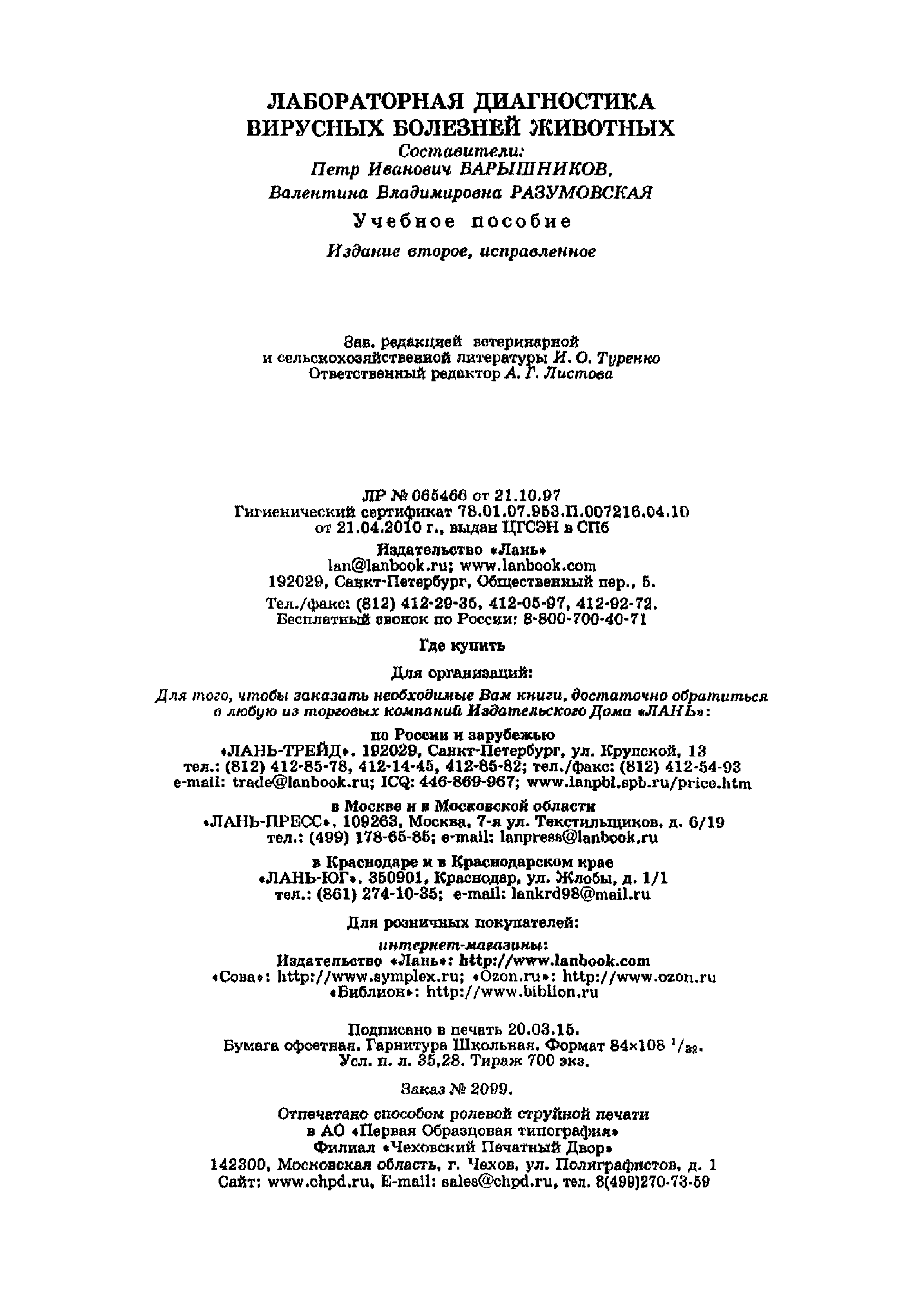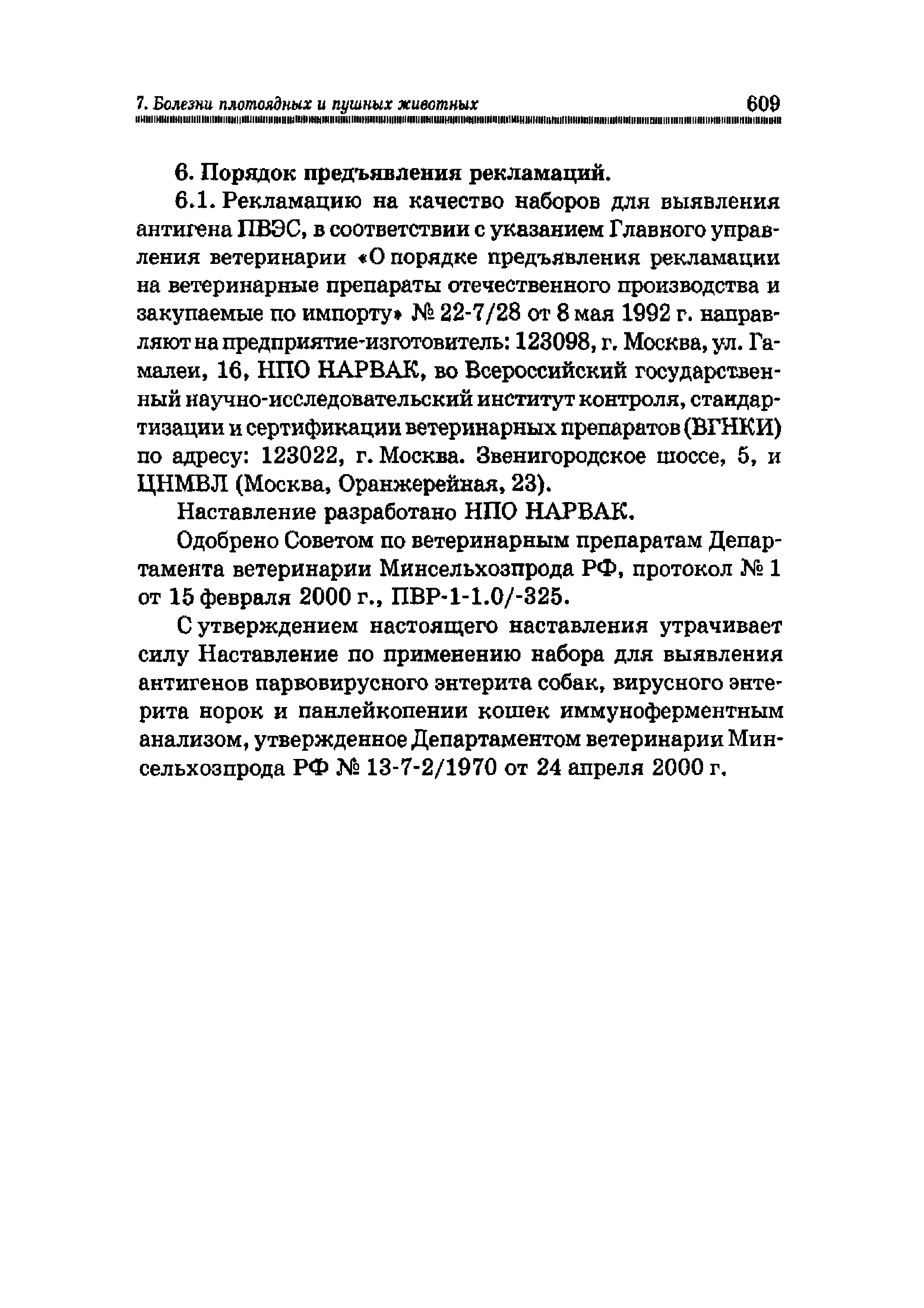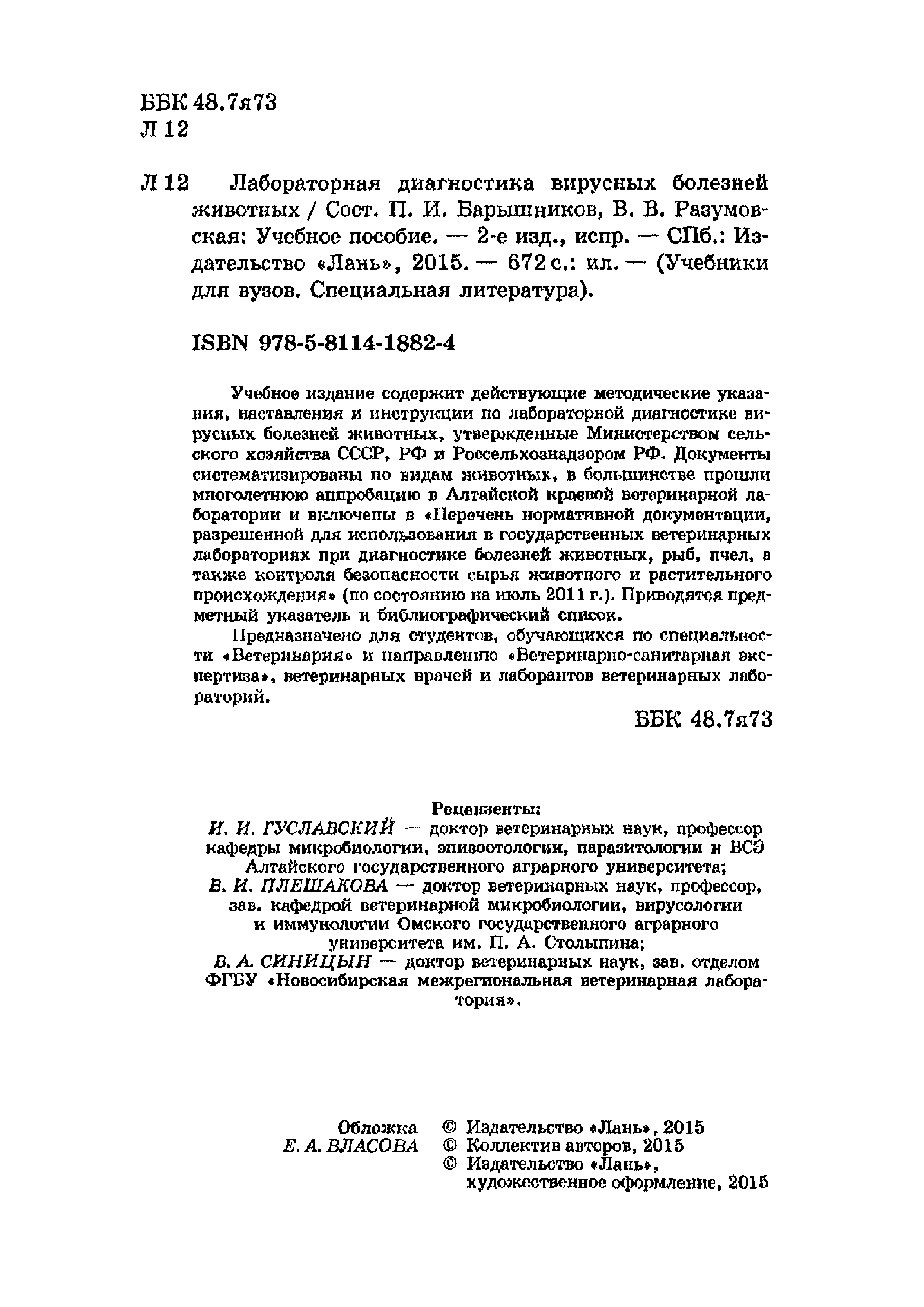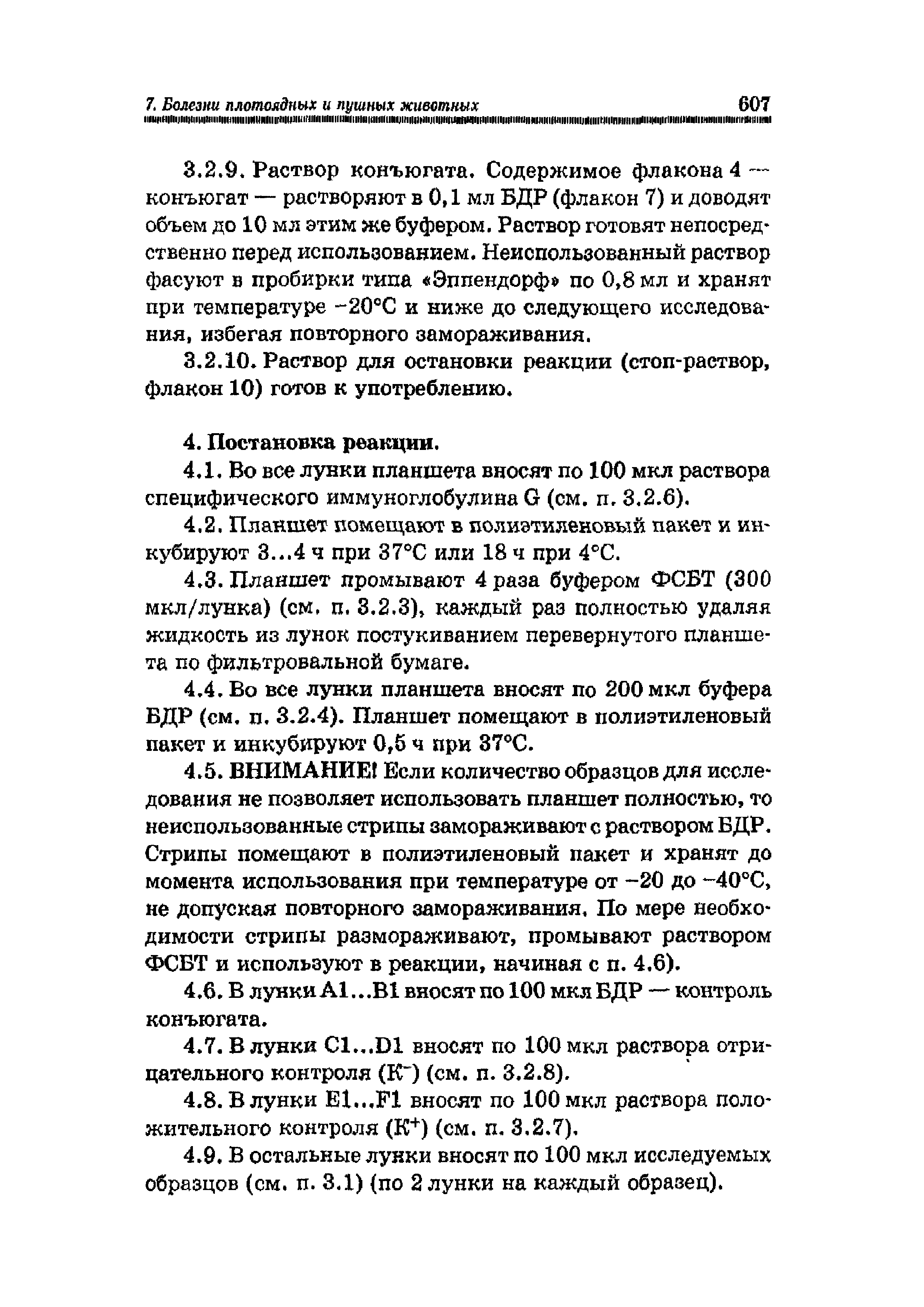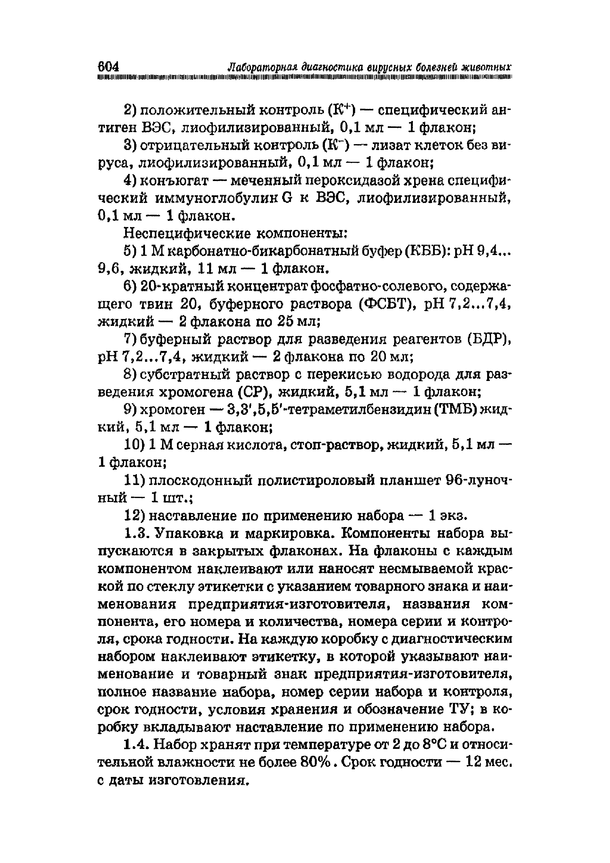 Наставление по применению набора для выявления антигенов парвовирусного энтерита собак, вирусного энтерита норок и панлейкопении кошек иммуноферментным анализом (ИФА)| Статус: | действует | | Название рус.: | Наставление по применению набора для выявления антигенов парвовирусного энтерита собак, вирусного энтерита норок и панлейкопении кошек иммуноферментным анализом (ИФА) | | Дата добавления в базу: | 01.01.2019 | | Дата актуализации: | 01.01.2021 | | Область применения: | Предназначено для студентов, обучающихся по специальности "Ветеринария" и направлению "Ветеринарно-санитарная экспертиза", ветеринарных врачей и лаборантов ветеринарных лабораторий | | Оглавление: | 1. Общие положения 2. Принцип метода 3. Подготовка материала для анализа и рабочих растворов 3.1. Подготовка биологического материала 3.2. Подготовка рабочих растворов 4. Постановка реакции 5. Учет и интерпретация результатов 6. Порядок предъявления рекламаций Краткий словарь использованных ветеринарных терминов Библиографический список Предметный указатель | | Издан: | Лань (2015 г. )