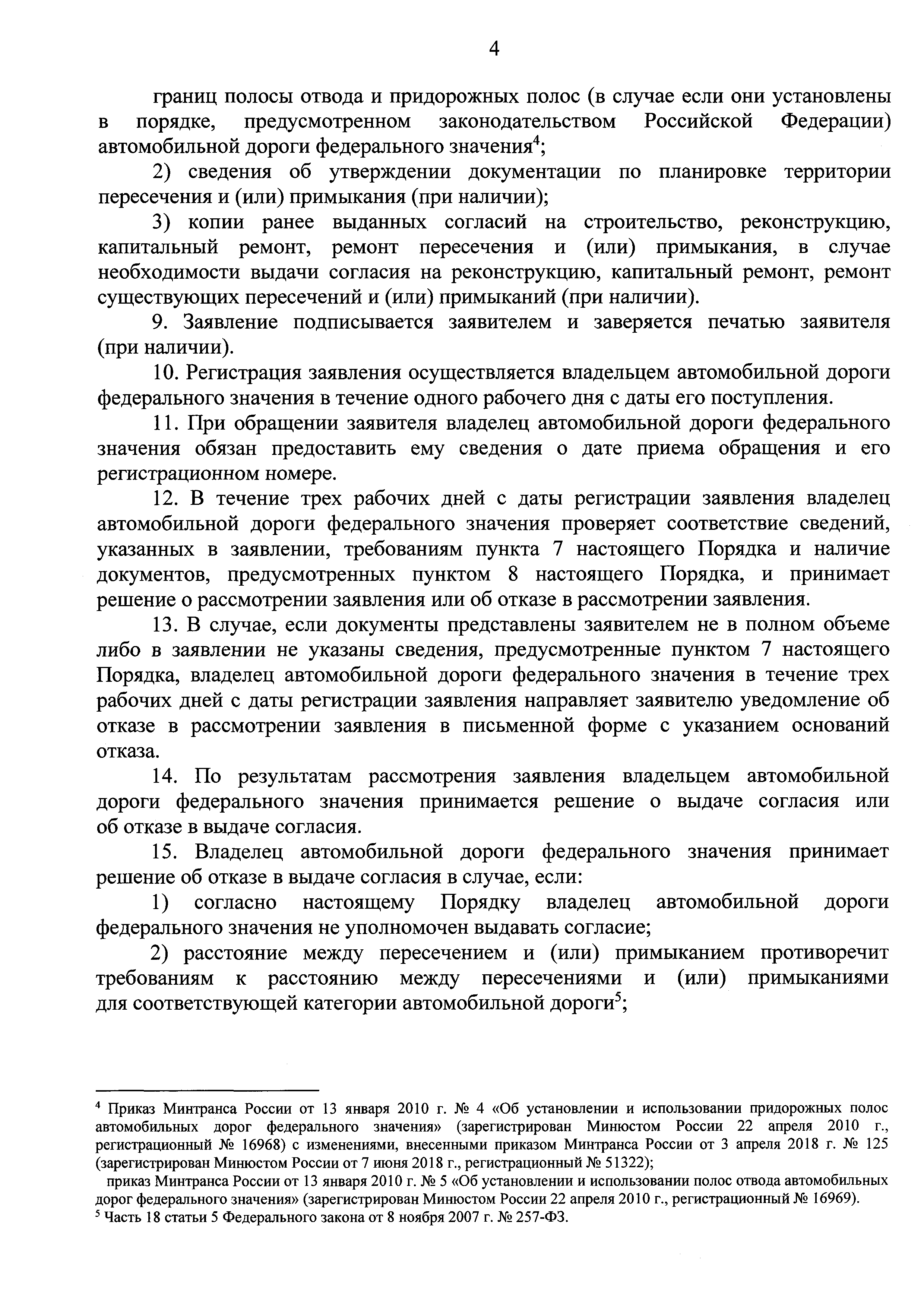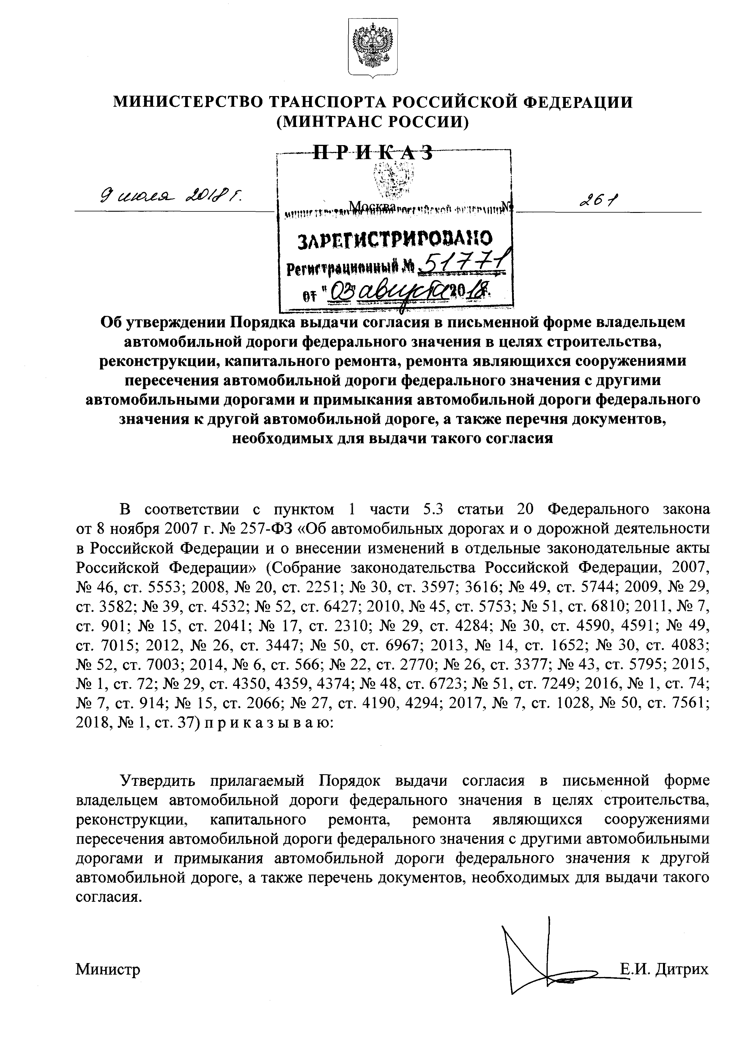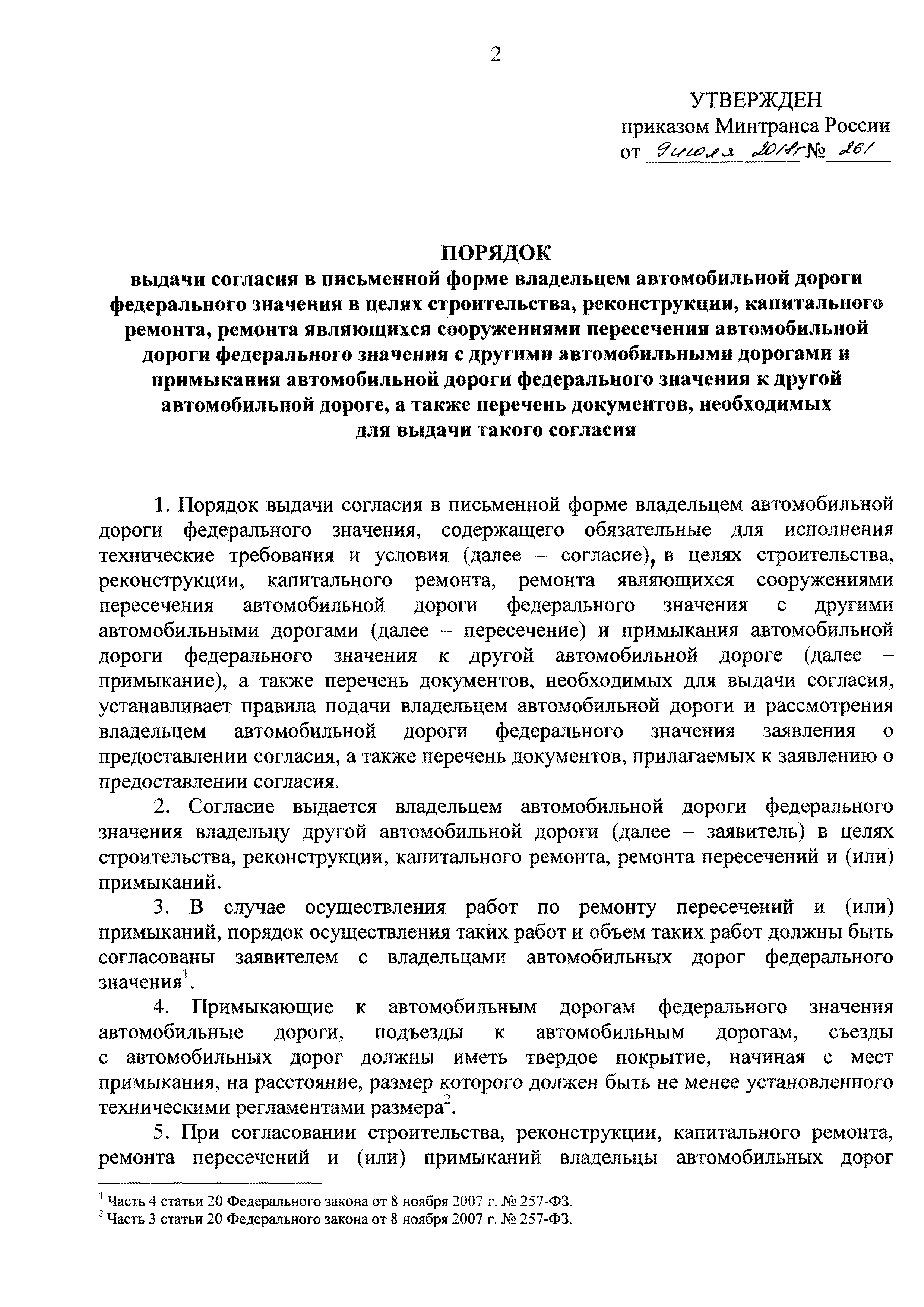 Порядок выдачи согласия в письменной форме владельцем автомобильной дороги федерального значения в целях строительства, реконструкции, капитального ремонта, ремонта являющихся сооружениями пересечения автомобильной дороги федерального значения с другими автомобильными дорогами и примыкания автомобильной дороги федерального значения к другой автомобильной дороге, а также перечень документов, необходимых для выдачи такого согласия| Статус: | действует | | Название рус.: | Порядок выдачи согласия в письменной форме владельцем автомобильной дороги федерального значения в целях строительства, реконструкции, капитального ремонта, ремонта являющихся сооружениями пересечения автомобильной дороги федерального значения с другими автомобильными дорогами и примыкания автомобильной дороги федерального значения к другой автомобильной дороге, а также перечень документов, необходимых для выдачи такого согласия | | Дата добавления в базу: | 01.01.2019 | | Дата актуализации: | 01.01.2021 | | Дата введения: | 14.08.2018 | | Утверждён: | 09.07.2018 Министерство транспорта Российской Федерации (Russian Federation Ministry of Transportation 261)