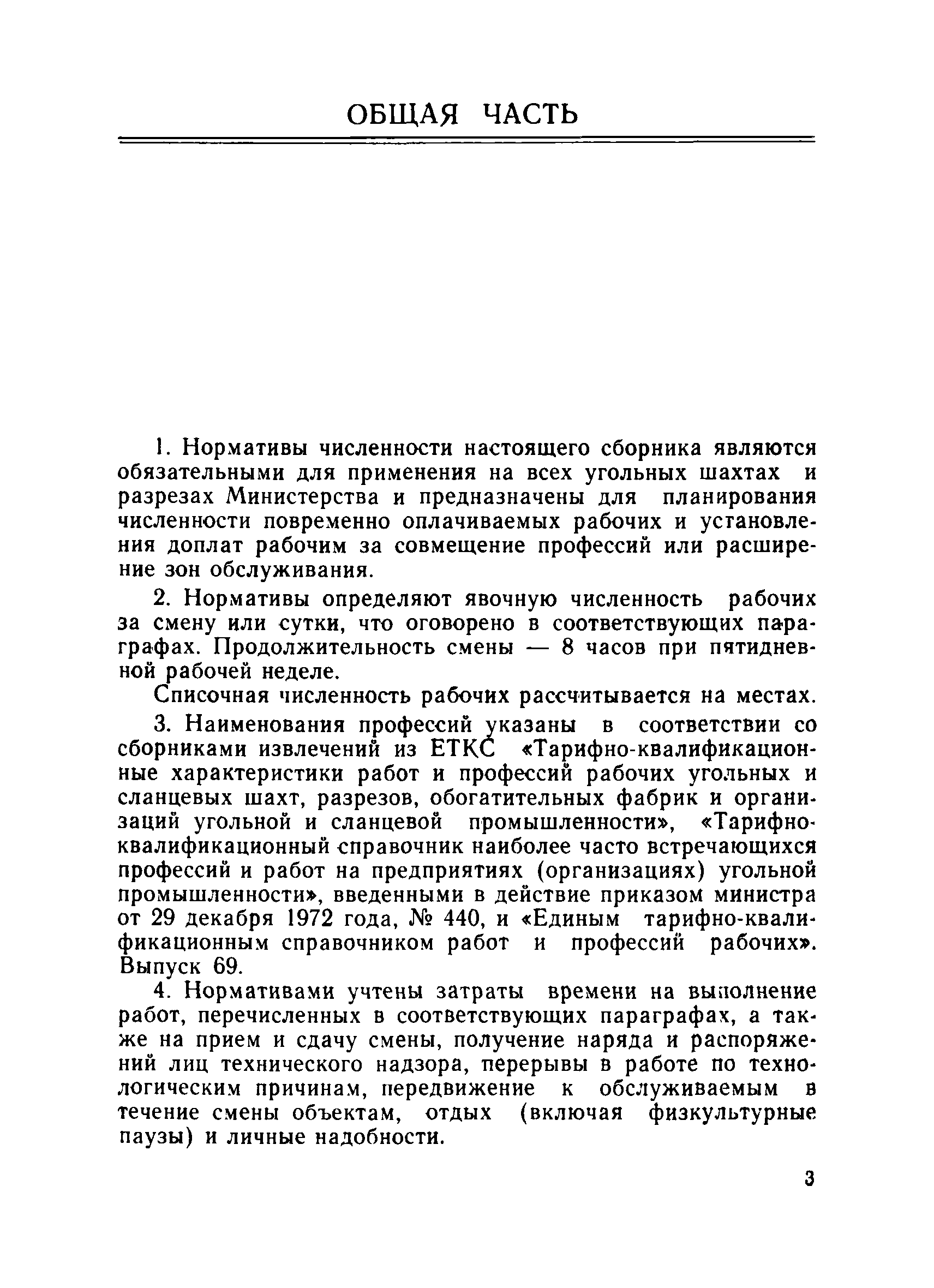 | Область применения: | Нормативы численности настоящего сборника являются обязательными для применения на всех угольных шахтах и разрезах Министерства и предназначены для планирования численности повременно оплачиваемых рабочих и установления доплат рабочим за совмещение профессий или расширение зон обслуживания. Нормативы определяют явочную численность рабочих за смену или сутки, что оговорено в соответствующих параграфах. Продолжительность смены - 8 часов при пятидневной рабочей неделе |