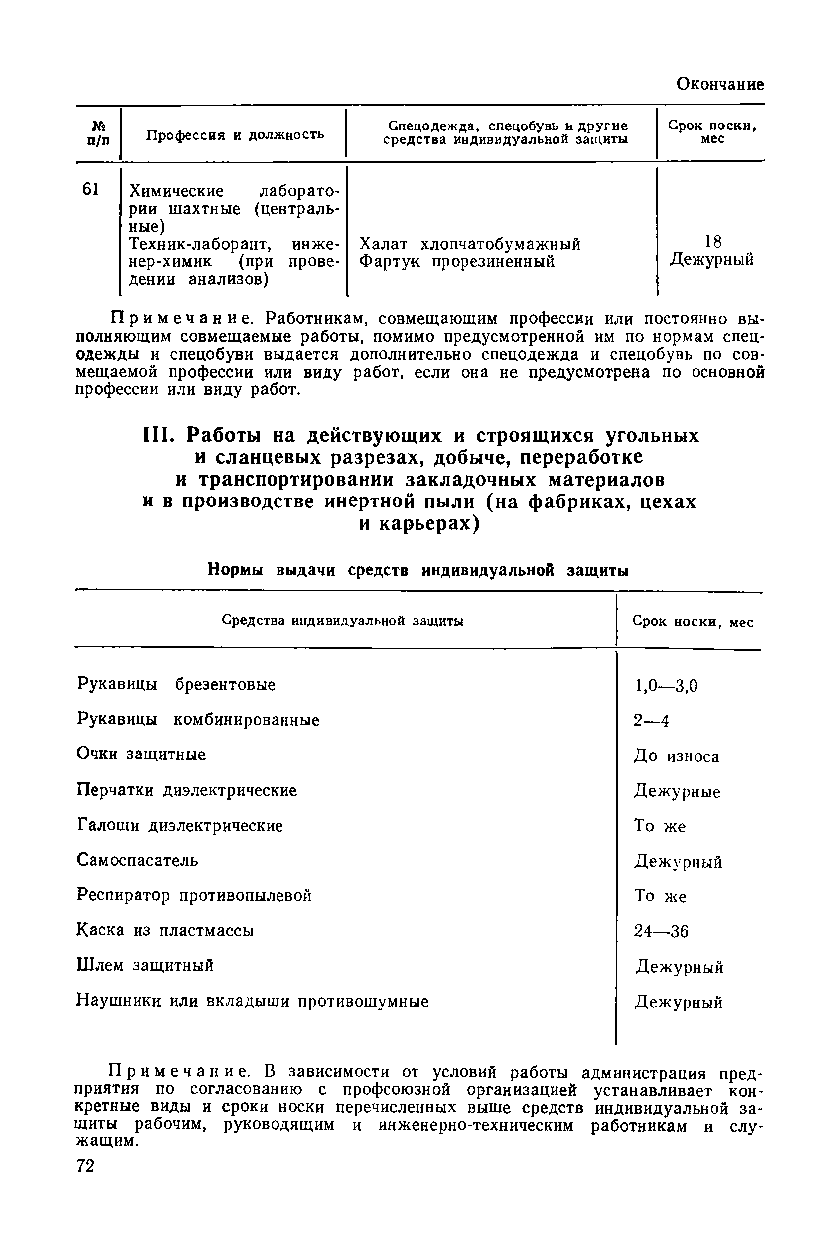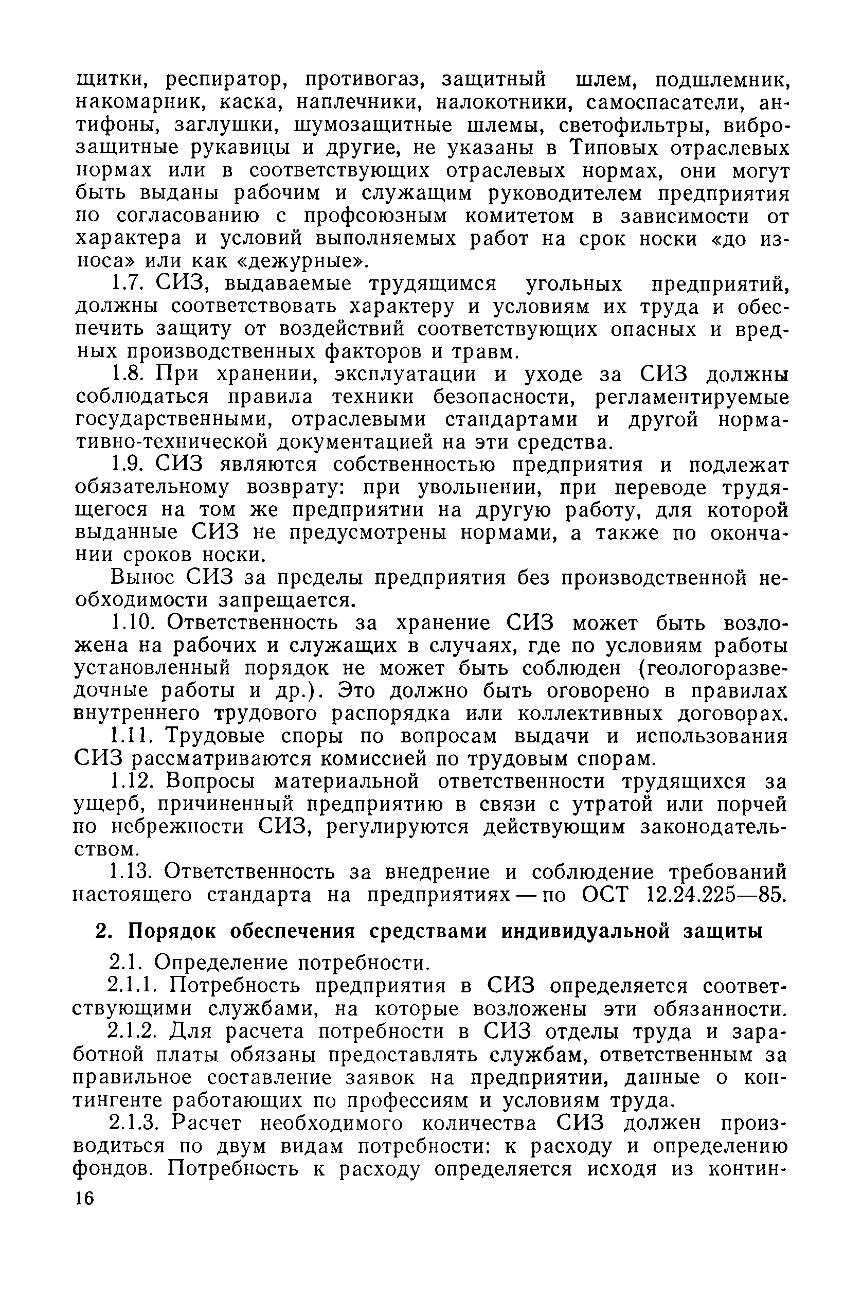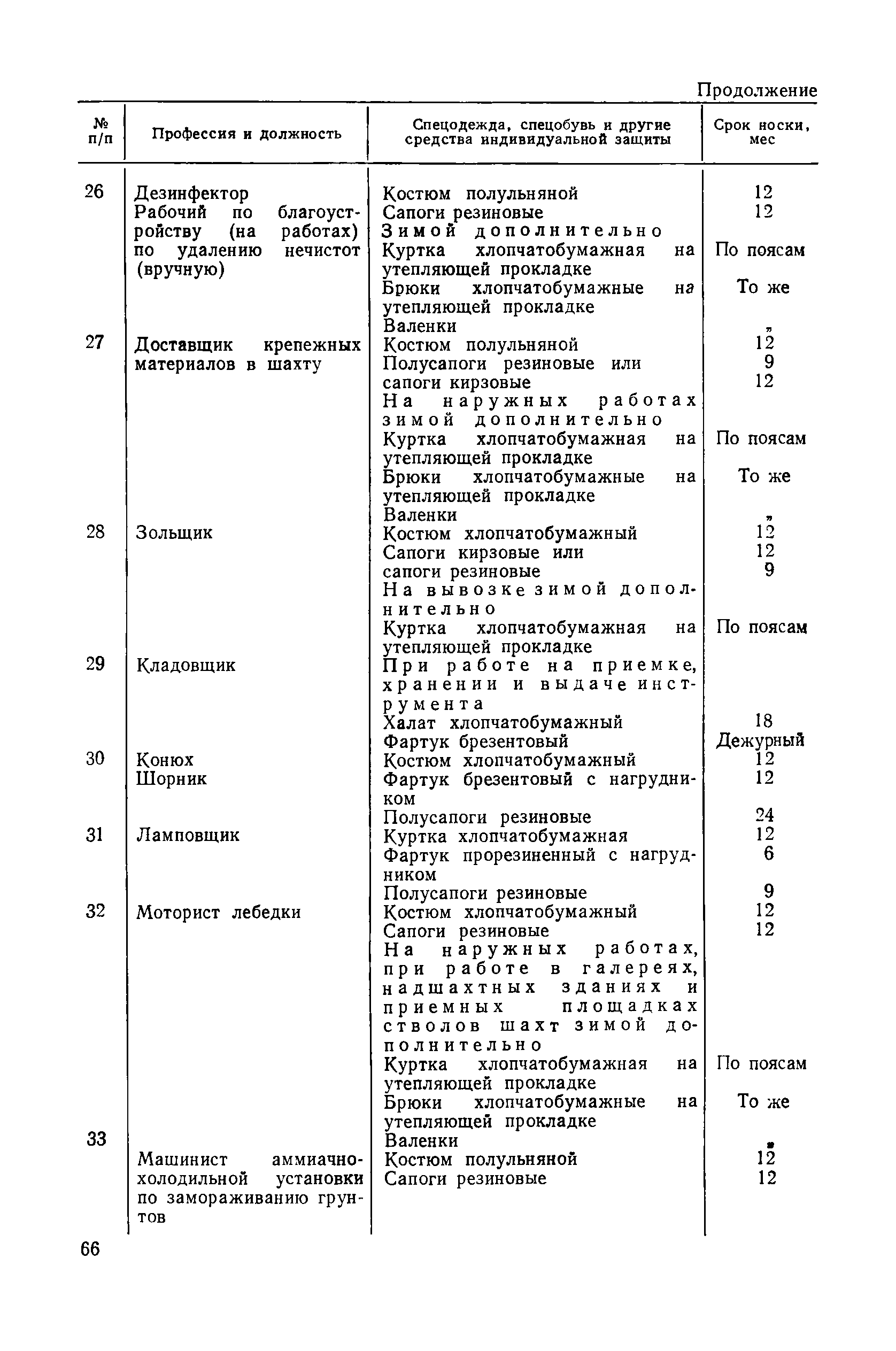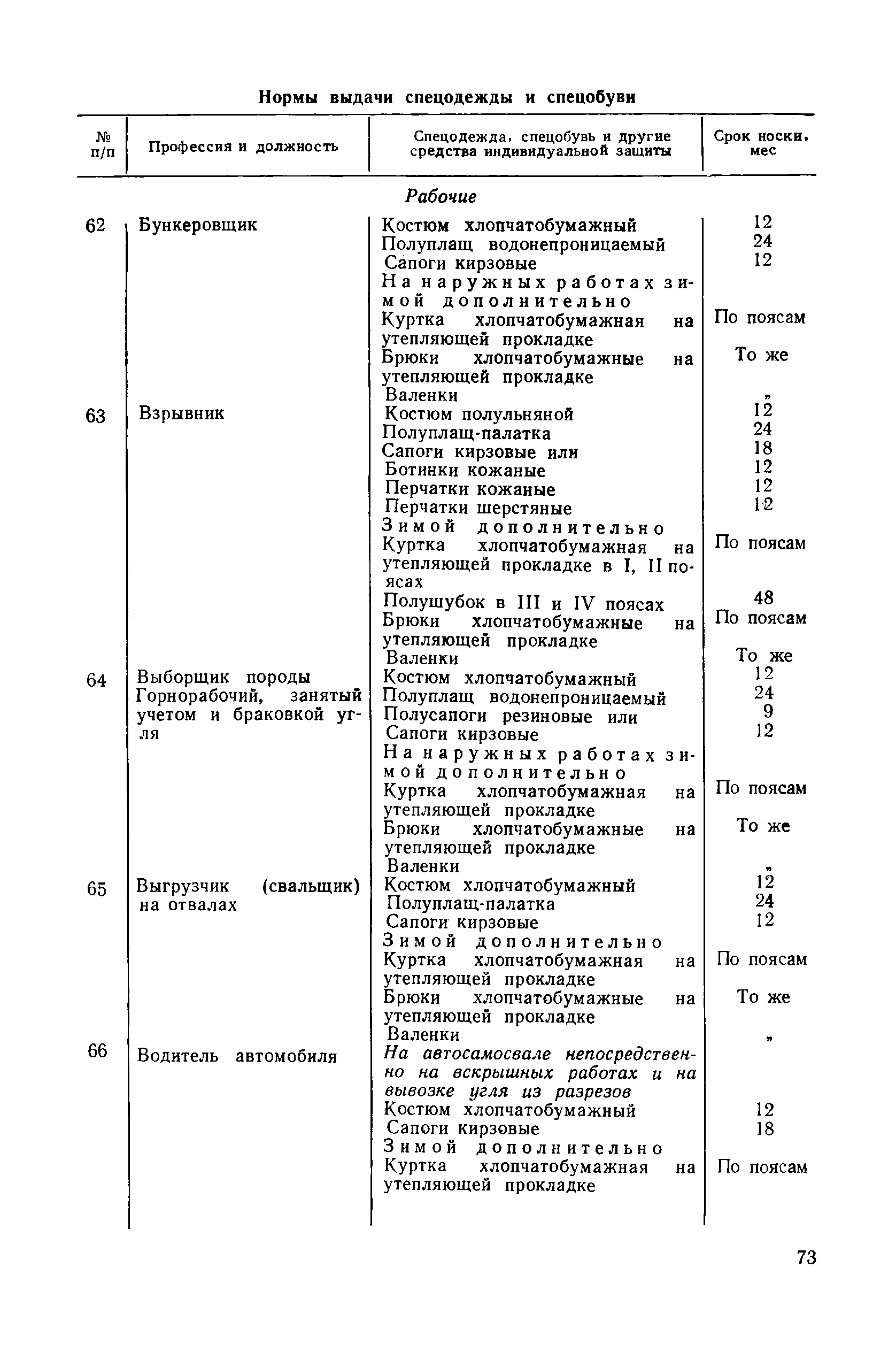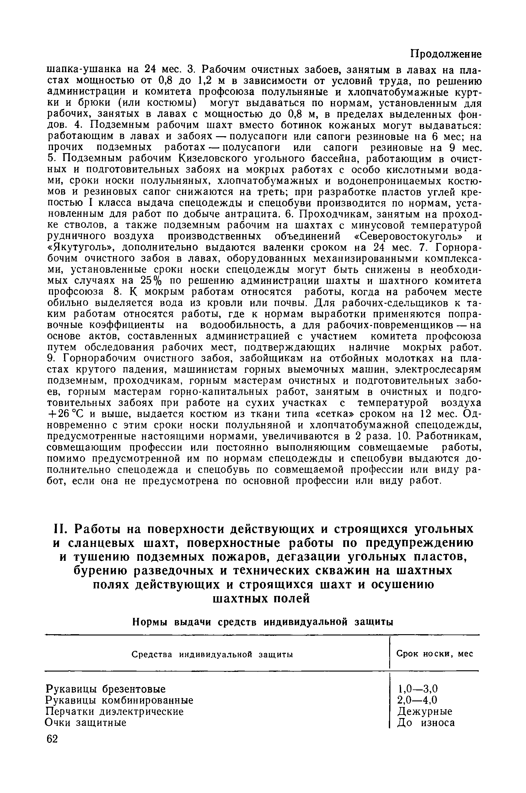 Нормы бесплатной выдачи средств индивидуальной защиты для работников угольной промышленности| Статус: | справочные материалы, мп, тпр | | Название рус.: | Нормы бесплатной выдачи средств индивидуальной защиты для работников угольной промышленности | | Дата добавления в базу: | 01.02.2020 | | Дата актуализации: | 01.01.2021 | | Область применения: | В документе приведены типовые отраслевые (угольной промышленности) нормы бесплатной выдачи спецодежды, спецобуви и необходимые извлечения из типовых норм других отраслей для работающих в шахтах, карьерах, на шахтной поверхности и обогатительных фабриках | | Оглавление: | Инструкция о порядке обеспечения рабочих и служащих специальной одеждой, специальной обувью и другими средствами индивидуальной защиты Система стандартов безопасности труда. Средства индивидуальной защиты. Порядок обеспечения. Правила хранения, эксплуатации и ухода. ОСТ 12.24.255-85 Временная инструкция о порядке испытаний, приемки, хранения и транспортировки спецодежды, спецобуви и защитных шахтерских касок Инструкция о порядке выдачи, хранения, пользования и учета санитарной одежды, санитарной обуви и санпринадлежностей на предприятиях системы Министерства торговли СССР Типовые отраслевые нормы бесплатной выдачи специальной одежды, специальной обуви и других средств индивидуальной защиты работникам действующих и строящихся шахт, разрезов и предприятий угольной и сланцевой промышленности Нормы бесплатной выдачи рабочим и служащим теплой специальной одежды и специальной обуви по климатическим поясам, единым для всех отраслей народного хозяйства (кроме климатических районов, предусмотренных особо в Типовых отраслевых нормах бесплатной выдачи специальной одежды, специальной обуви и других средств ндивидуальной защиты; рабочим и служащим морского транспорта; рабочим и служащим гражданской авиации; рабочим и служащим, осуществляющим наблюдения и работы по гидрометеорологическому режиму окружающей среды; постоянному и переменному составу учебных и спортивных организаций ДОСААФ СССР) Типовые отраслевые нормы бесплатной выдачи специальной одежды, специальной обуви и других средств индивидуальной защиты рабочим и служащим сквозных профессий и должностей всех отраслей народного хозяйства и отдельных производств Типовые отраслевые нормы бесплатной выдачи специальной одежды, специальной обуви и других средств индивидуальной защиты рабочим и служащим, занятым на геологических, топографо-геодезических, изыскательских, землеустроительных работах и в картографическом производстве Типовые отраслевые нормы бесплатной выдачи специальной одежды, специальной обуви и других средств индивидуальной защиты рабочим и служащим паросилового и энергетического хозяйства (кроме производства электрической энергии) Типовые отраслевые нормы бесплатной выдачи специальной одежды, специальной обуви и других средств индивидуальной защиты рабочим и служащим автомобильного транспорта и шоссейных дорог Типовые отраслевые нормы бесплатной выдачи специальной одежды, специальной обуви и других средств индивидуальной защиты рабочим и служащим железнодорожного транспорта (железнодорожный внутризаводской транспорт) Типовые отраслевые нормы бесплатной выдачи специальной одежды, специальной обуви я других средств индивидуа