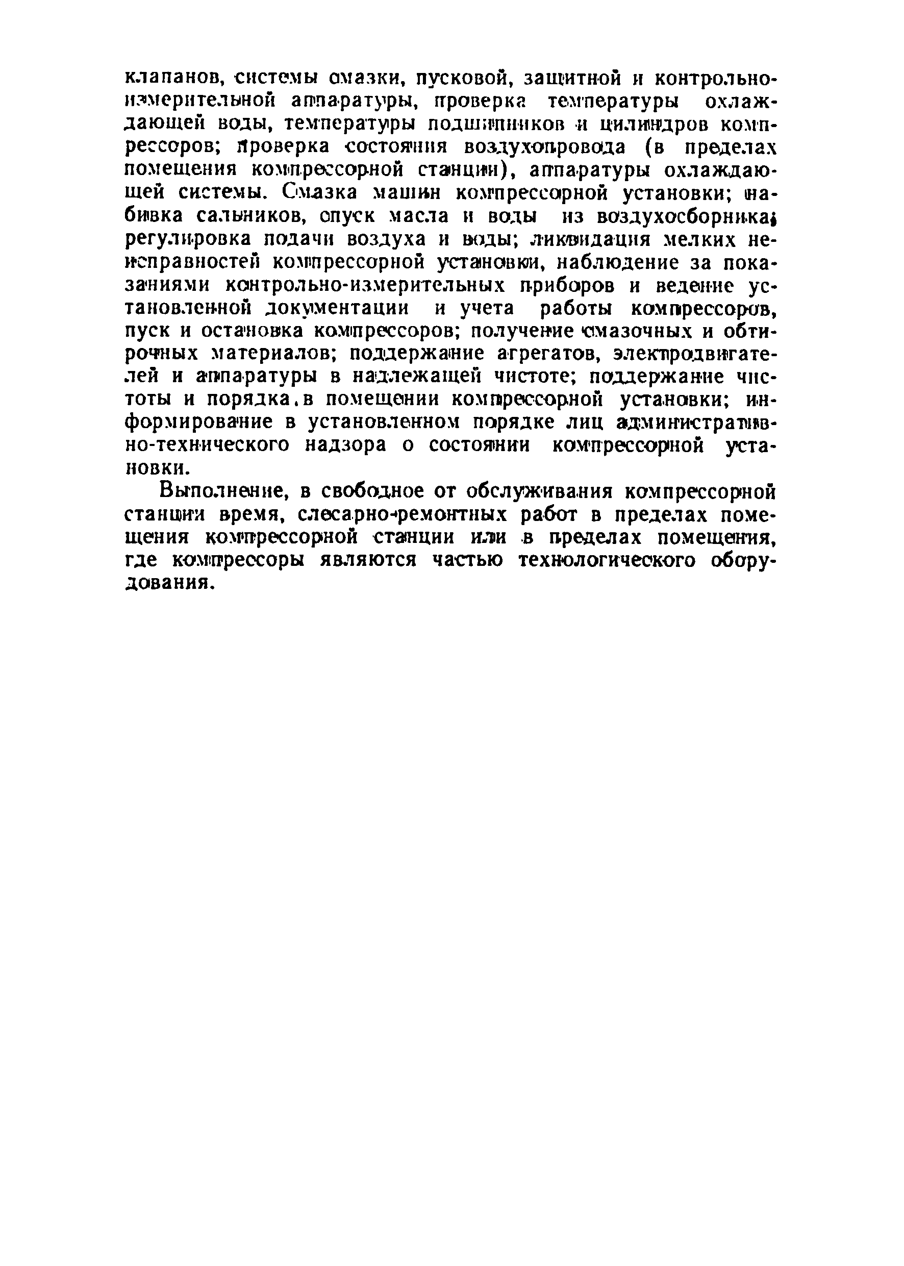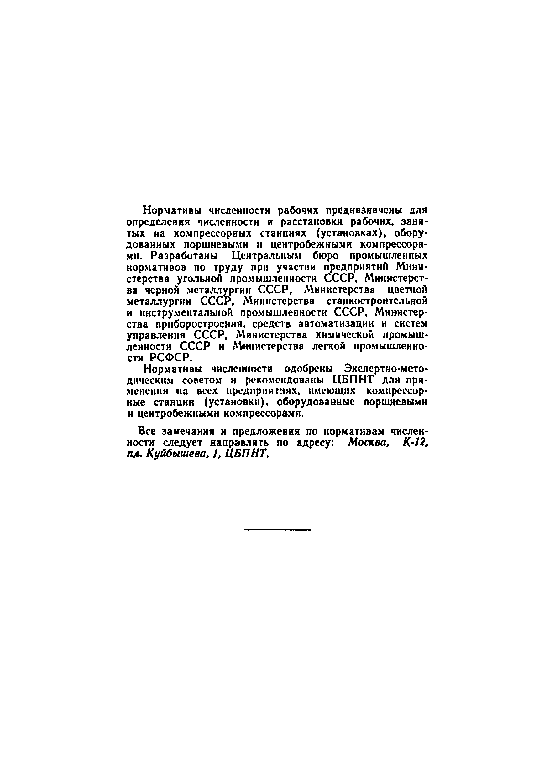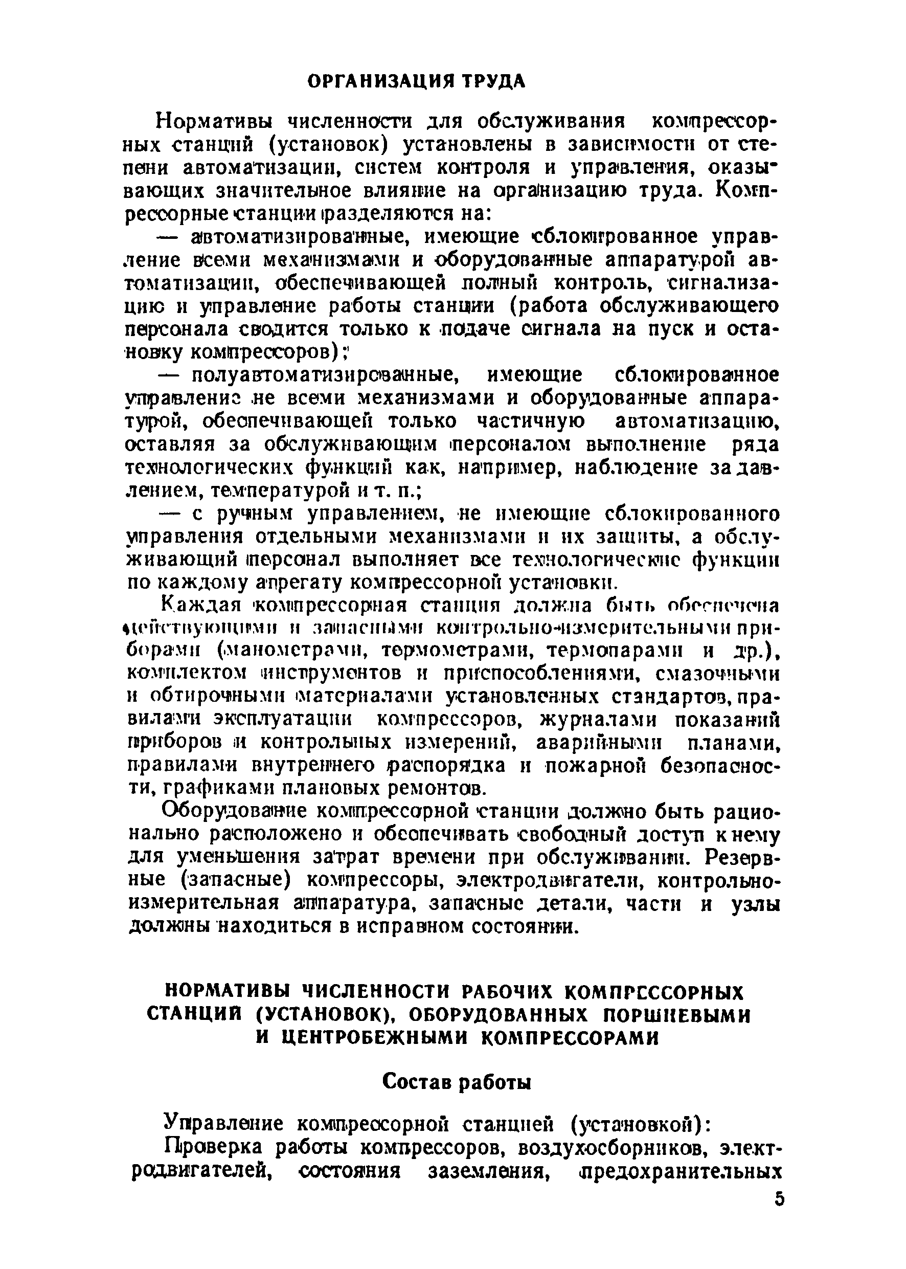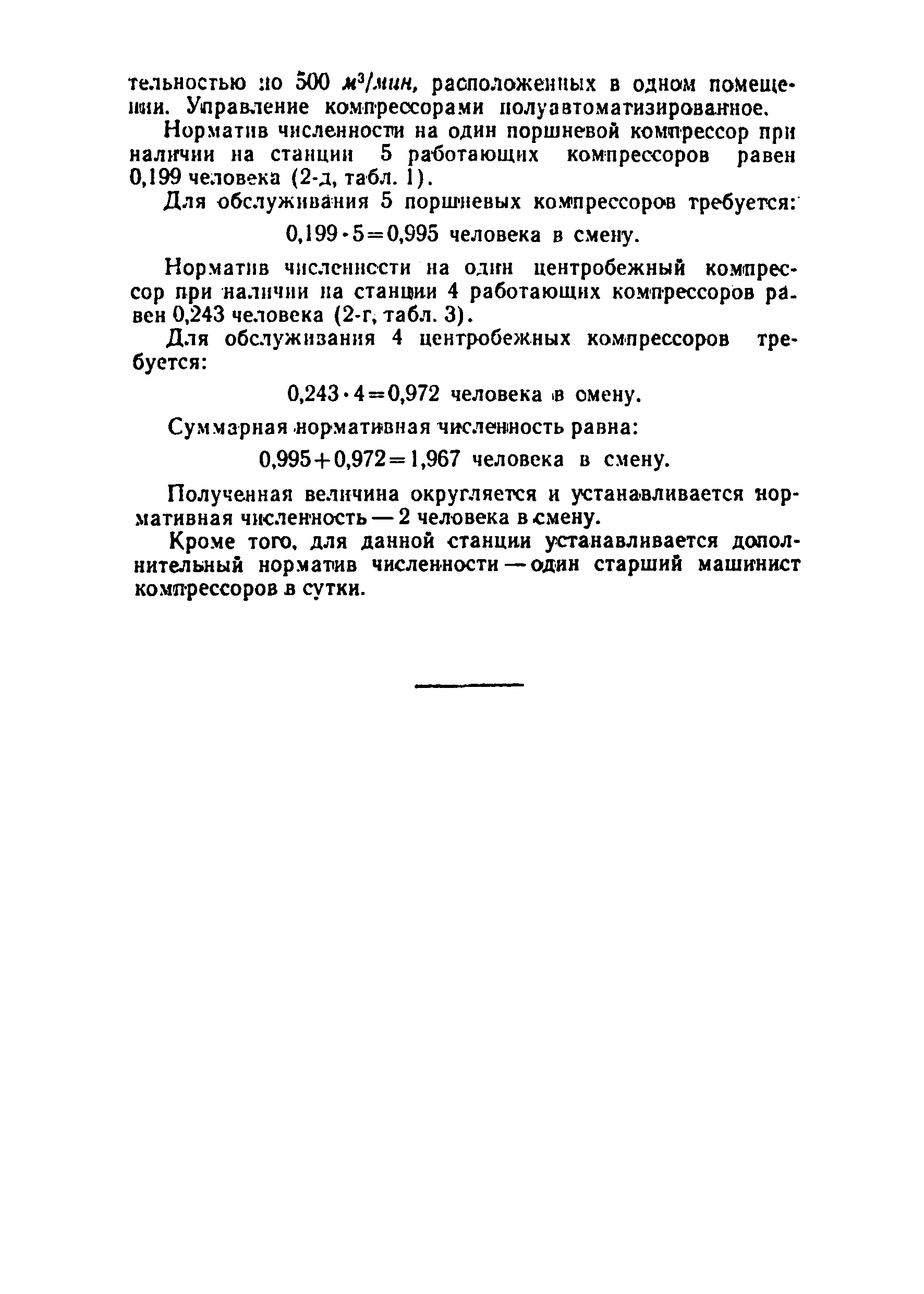 Нормативы численности рабочих компрессорных станций (установок)| Статус: | справочные материалы, мп, тпр | | Название рус.: | Нормативы численности рабочих компрессорных станций (установок) | | Дата добавления в базу: | 01.01.2019 | | Дата актуализации: | 01.01.2021 | | Область применения: | Нормативы численности рабочих предназначены для определения численности и расстановки рабочих, занятых на компрессорных станциях (установках), оборудованных поршневыми и центробежными компрессорами. Нормативы численности рекомендованы ЦБПНТ для применении на всех предприятиях, имеющих компрессорные станции (установки), оборудованные поршневыми и центробежными компрессорами | | Оглавление: | Общая часть Организация труда Нормативы численности рабочих компрессорных станций (установок), оборудованных поршневыми и центробежными компрессорами Состав работы Нормативы численности рабочих компрессорных станций (установок), оборудованных поршневыми компрессорами, с полуавтоматизированным управлением Нормативы численности рабочих компрессорных станций (установок), оборудованных поршневыми компрессорами с ручным управлением Нормативы численности рабочих компрессорных станций (установок), оборудованных центробежными компрессорами с полуавтоматизированным управлением Поправочные коэффициенты Приложение. Примеры расчета численности рабочих, обслуживающих компрессорные станции (установки) | | Разработан: | ЦБПНТ