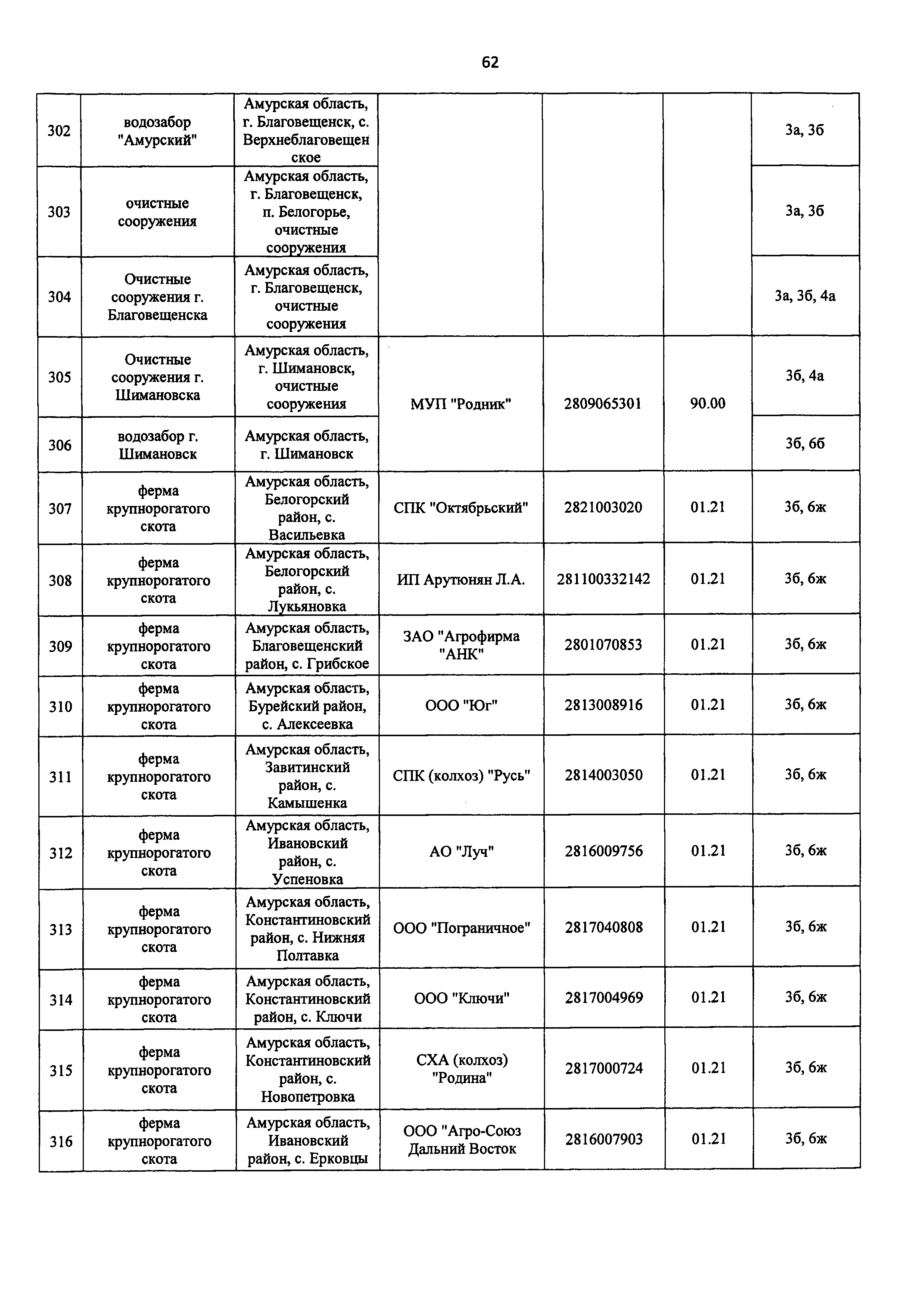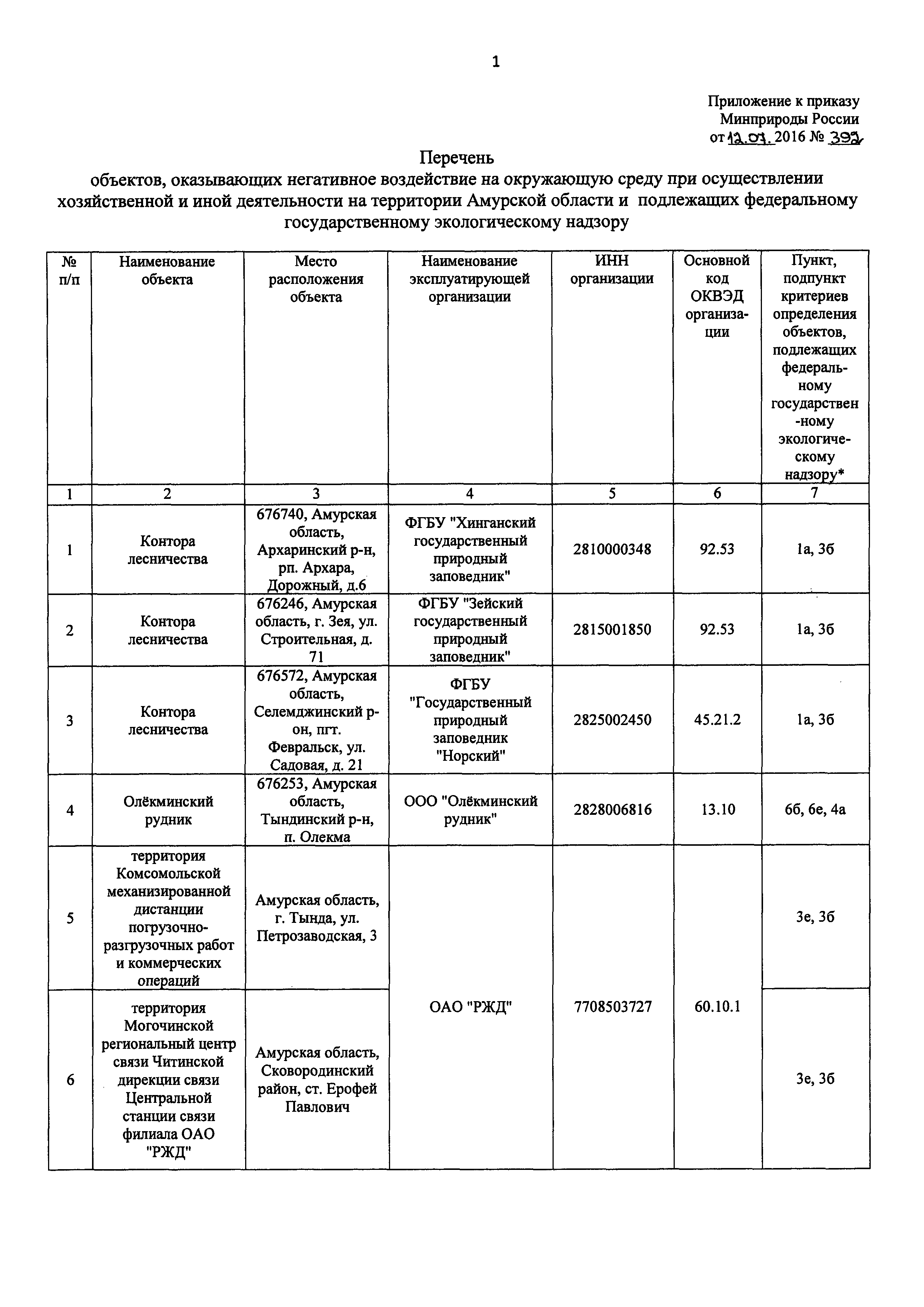 Перечень объектов, оказывающих негативное воздействие на окружающую среду при осуществлении хозяйственной и иной деятельности на территории Амурской области и подлежащих федеральному государственному экологическому надзору| Статус: | действует | | Название рус.: | Перечень объектов, оказывающих негативное воздействие на окружающую среду при осуществлении хозяйственной и иной деятельности на территории Амурской области и подлежащих федеральному государственному экологическому надзору | | Дата добавления в базу: | 01.01.2019 | | Дата актуализации: | 01.01.2021 | | Дата введения: | 21.08.2016 | | Утверждён: | 12.07.2016 Министерство природных ресурсов и экологии Российской Федерации (392)