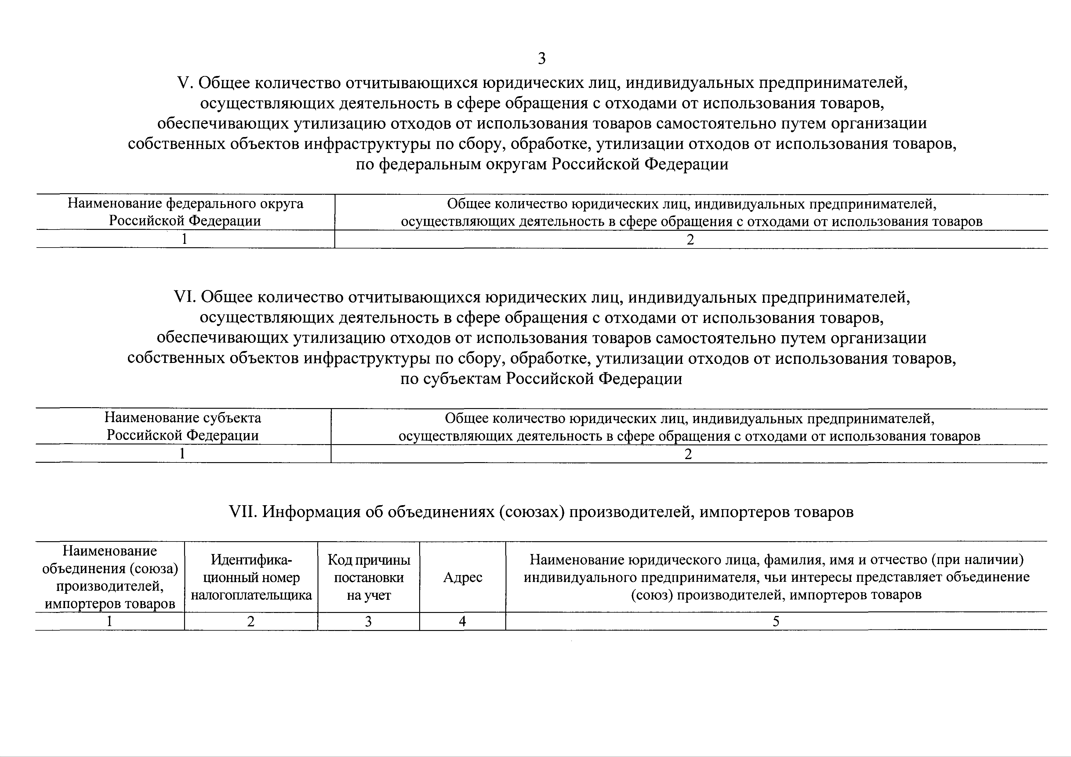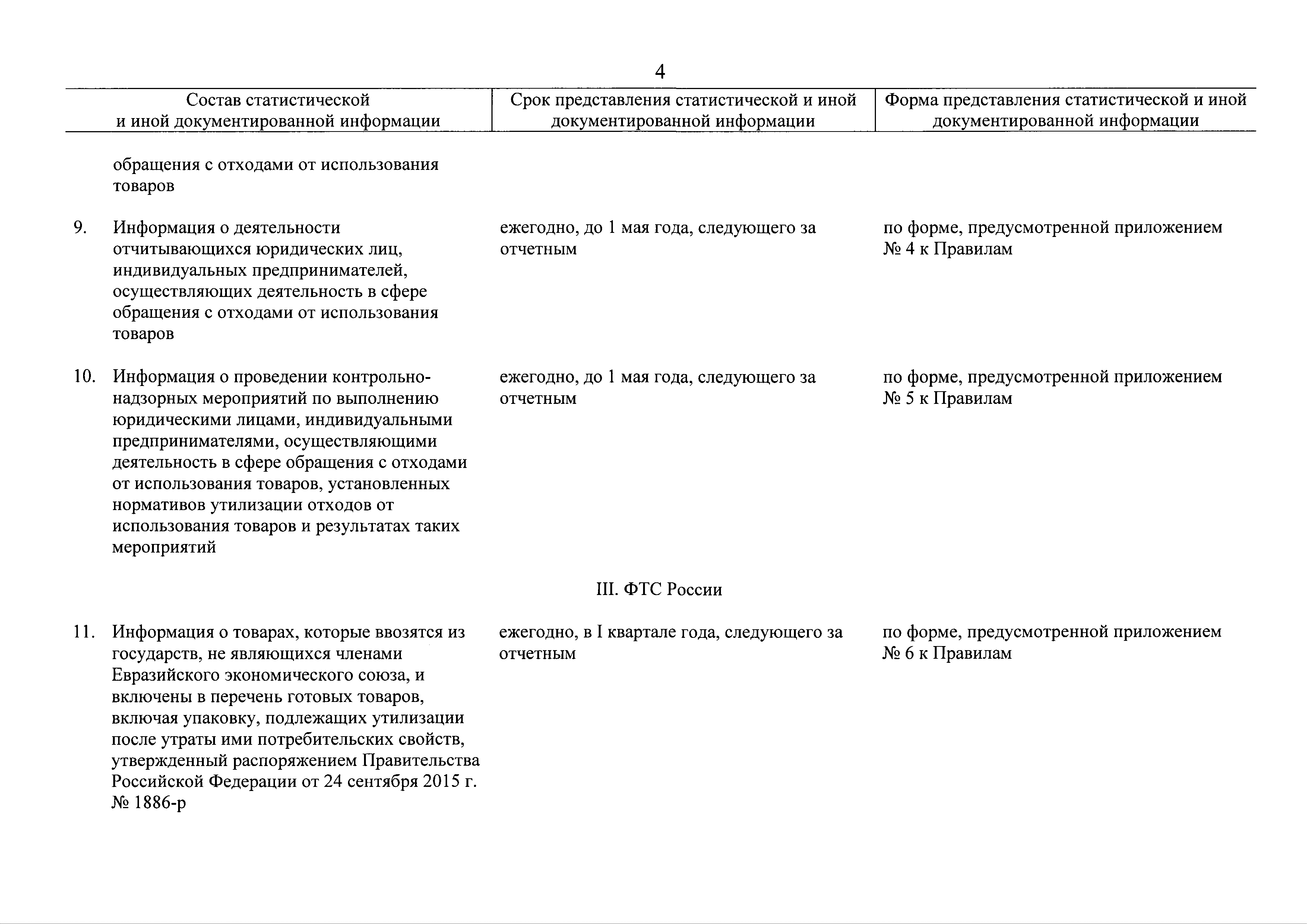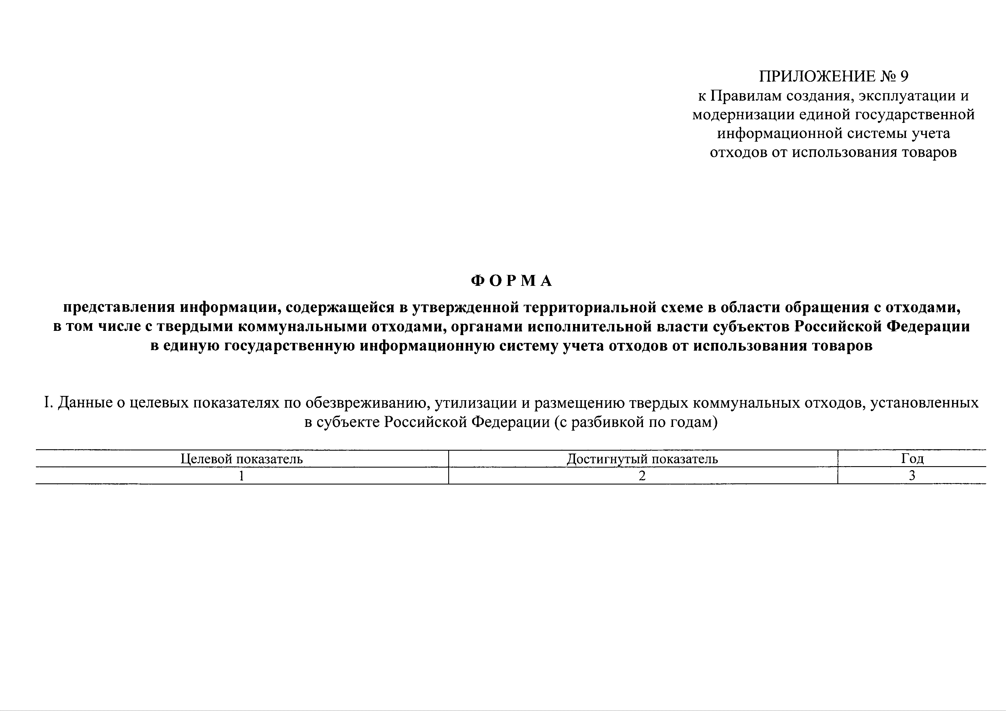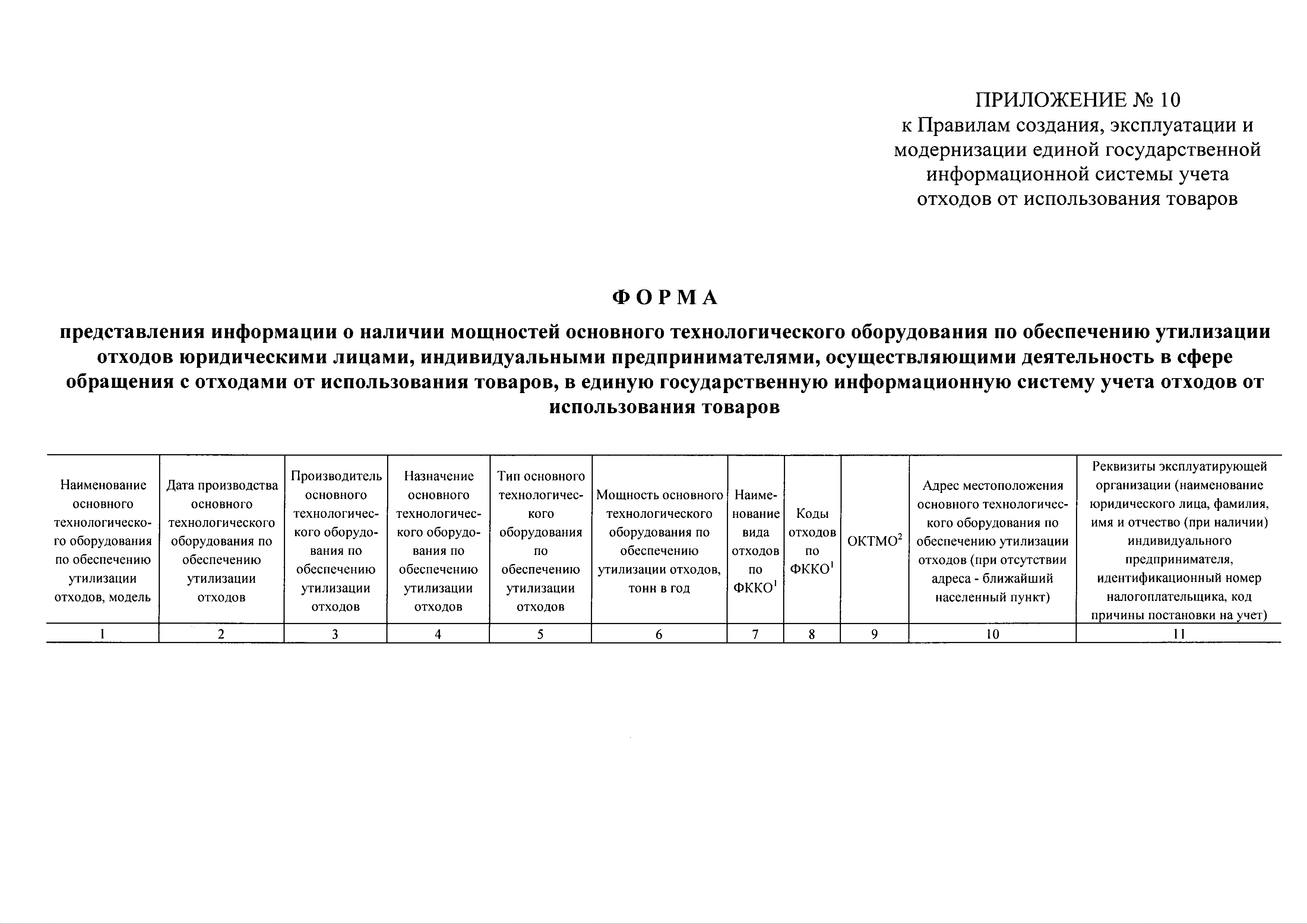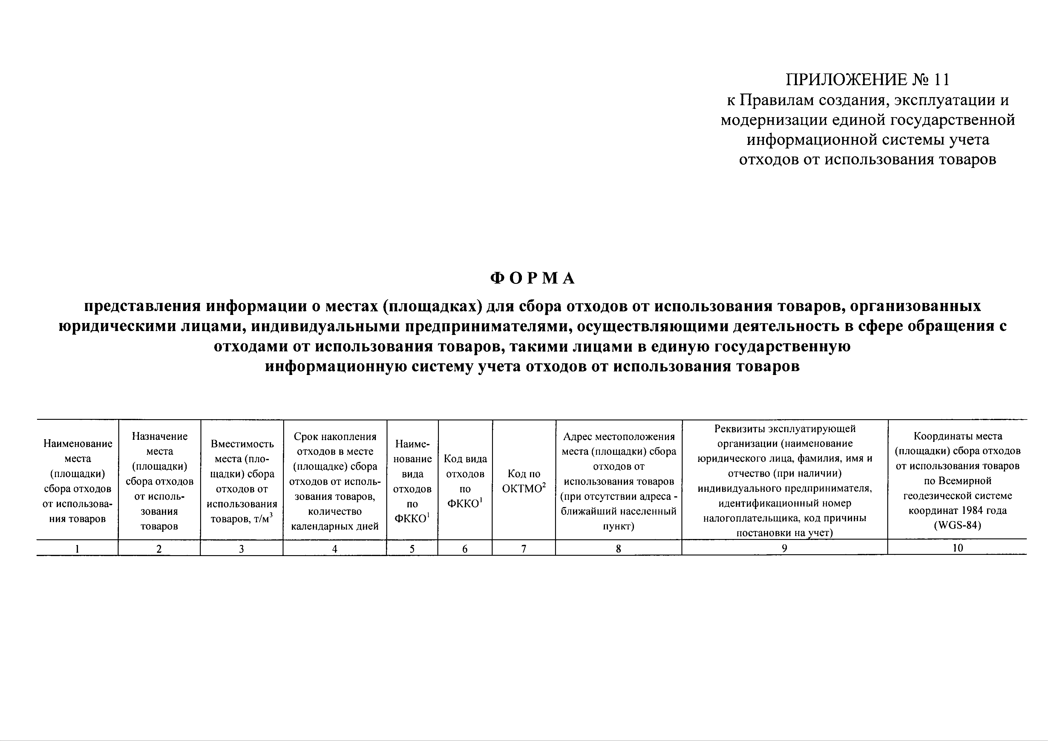 | Оглавление: | Приложение № 1. Перечень статистической и иной документированной информации, представляемой поставщиками информации в единую государственную информационную систему учета отходов от использования товаров Приложение № 2. Форма представления информации о наличии мощностей основного технологического оборудования по обеспечению утилизации отходов Росприроднадзором в единую государственную информационную систему учета отходов от использования товаров Приложение № 3. Форма представления информации о местах (площадках) сбора отходов от использования товаров, организованных юридическими лицами, индивидуальными предпринимателями, осуществляющими деятельность в сфере обращения с отходами от использования товаров, Росприроднадзором в единую государственную информационную систему учета отходов от использования товаров Приложение № 4. Форма представления информации о деятельности отчитывающихся юридических лиц, индивидуальных предпринимателей, осуществляющих деятельность в сфере обращения с отходами от использования товаров, Росприроднадзором в единую государственную информационную систему учета отходов от использования товаров Приложение № 5. Форма представления информации о проведении контрольно-надзорных мероприятий по выполнению юридическими лицами, индивидуальными предпринимателями, осуществляющими деятельность в сфере обращения с отходами от использования товаров, установленных нормативов утилизации отходов от использования товаров и результатах таких мероприятий Росприроднадзором в единую государственную информационную систему учета отходов от использования товаров Приложение № 6. Форма представления информации о товарах, которые ввозятся из государств, не являющихся членами Евразийского экономического союза, и включенных в перечень готовых товаров, включая упаковку, подлежащих утилизации после утраты ими потребительских свойств, ФТС России в единую государственную информационную систему учета отходов от использования товаров Приложение № 7. Форма представления информации о товарах, ввозимых в Российскую Федерацию с территорий государств - членов Евразийского экономического союза в соответствии с Правилами ведения статистики взаимной торговли Российской Федерации с государствами - членами Таможенного союза ЕврАзЭС и включенных в перечень готовых товаров, включая упаковку, подлежащих утилизации после утраты ими потребительских свойств, представляемая ФТС России в единую государственную информационную систему учета отходов от использования товаров Приложение № 8. Форма представления информации об экспортно-импортных операциях с отдельными видами товаров Минпромторгом России в единую государственную информационную систему учета отходов от использования товаров Приложение № 9. Форма представления информации, содержащейся в утвержденной территориальной схеме в области обращения с отходами, в том числе с твердыми коммунальными отходами, органами исполнительной власти субъектов Российской Федерации в единую государственную информационную систему учета отходов от использования товаров Приложение № 10. Форма представления информации о наличии мощностей основного технологического оборудования по обеспечению утилизации отходов юридическими лицами, и